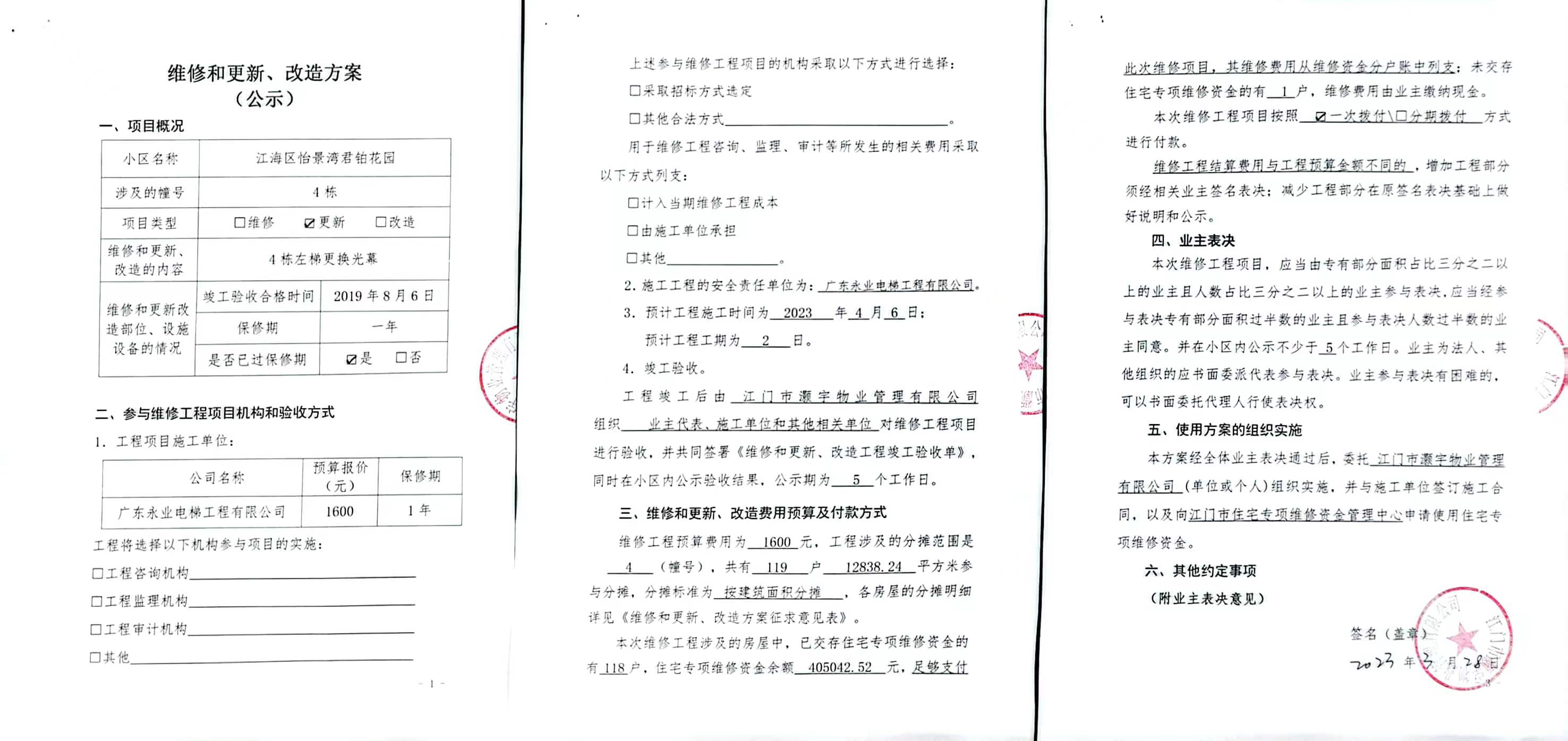 <td valign="top" values="" style="border-width:0" bindtype="0" rowspan="17" colspan="7" datasource="投票结果"><font style=" font-family:方正小标宋简体;font-size:14pt;"><p style="line-height: 1.75em;"><span style="font-family: 宋体, SimSun;">各位尊敬的业主:</span><br></p><p style="text-indent: 2em; line-height: 1.75em;"><span style="font-family: 宋体, SimSun;">根据法律法规的规定,本小区业主利用“物业公共事务决策系统”已对本小区公共事务决策事项进行了表决,在经过7日的询异公示期后,未收到业主有效的异议。现将投票结果公告,并就产生的法律效力说明如下:</span></p><p style="line-height: 1.75em; text-indent: 0em;"><strong style="text-indent: 2em;"><span style="font-family: 宋体, SimSun;">一、投票范围</span></strong></p><p style="text-indent: 2em; line-height: 1.75em;"><span style="font-family: 宋体, SimSun;">江门市江海区怡景湾君铂花园江门市江海区怡景湾君铂花园4栋</span></p><p style="text-indent: 2em; line-height: 1.75em;"><span style="font-family: 宋体, SimSun;">总人数(专有部分人数之和):110</span></p><p style="text-indent: 2em; line-height: 1.75em;"><span style="font-family: 宋体, SimSun;"><span style="font-family: 宋体, SimSun; text-indent: 32px;">总户数:119</span></span></p><p style="text-indent: 2em; line-height: 1.75em;"><span style="font-family: 宋体, SimSun;">建筑物总面积(专有部分面积之和):12838.24㎡</span></p><p style="line-height: 1.75em;"><strong><span style="font-family: 宋体, SimSun;">二、投票起止时间</span></strong></p><p style="text-indent: 2em; line-height: 1.75em;"><span style="font-family: 宋体, SimSun;">投票表决时间:从2023年03月30日到2023年04月06日止</span></p><p style="text-indent: 2em; line-height: 1.75em;"><span style="font-family: 宋体, SimSun;">投票询异公示时间:从2023年04月07日开始</span></p><p style="text-indent: 2em; line-height: 1.75em;"><span style="font-family: 宋体, SimSun;">投票结果通知公告时间:从2023年04月14日开始</span></p><p style="line-height: 1.75em;"><strong><span style="font-family: 宋体, SimSun;">三、计票规则</span></strong></p><p style="text-indent: 2em; line-height: 1.75em;"><span style="font-family: 宋体, SimSun;">表决事项:使用建筑物及其附属设施的维修资金<br></span></p><p style="font-family: 宋体, SimSun;line-height: 1.75em; text-indent: 2em;">计票规则:弃权票不并入其它项 未表决票不并入其它项</p><p></p><p style="line-height: 1.75em;"><strong><span style="font-family: 宋体, SimSun;">四、通过规则</span></strong></p><p style="text-indent: 2em; line-height: 1.75em;"><span style="font-family: 宋体, SimSun;"><span style="font-family: 宋体, SimSun; text-indent: 32px;">表决事项:使用建筑物及其附属设施的维修资金<br></span></span></p><p style="font-family: 宋体, SimSun;line-height: 1.75em; text-indent: 2em;">通过规则:参与表决专有部分面积过半数的业主且参与表决人数过半数的业主同意</p><p></p><p style="line-height: 1.75em;"><strong><span style="font-family: 宋体, SimSun;">五、投票结果</span></strong></p><p style="line-height: 1.75em; text-indent: 2em;"><span style="font-family: 宋体, SimSun; text-indent: 2em;"></span></p><div id="resultTable"><table style="table-layout: fixed; font-size:12px; margin-top:10px" width="100%" border="0" cellspacing="0" cellpadding="0"><tbody><tr><td height="28" colspan="10" align="center" style="border: 1px solid #666"><strong style="font-size: 14px;"> 使用建筑物及其附属设施的维修资金</strong></td> </tr><tr id="trfirst"><td height="28" colspan="4" style="border-left: 1px solid #666; border-bottom: 1px solid #666"><strong> 申报单位:</strong> 江门市灏宇物业管理有限公司</td><td colspan="3" style="border-left: 1px solid #666; border-bottom: 1px solid #666"><strong> 联系方式:</strong> </td><td colspan="3" style="border-left: 1px solid #666; border-bottom: 1px solid #666; border-right: 1px solid #666"><strong> 申报日期:</strong> 2023年3月29日 </td></tr><tr> <td height="28" colspan="5" style="border-left: 1px solid #666; border-bottom: 1px solid #666"><strong> 总人数(专有部分人数之和):</strong>110人 </td><td colspan="5" style="border-left: 1px solid #666; border-bottom: 1px solid #666; border-right: 1px solid #666"><strong> 建筑物总面积(专有部分面积之和):</strong>12838.24㎡ </td> </tr><tr><td height="28" colspan="10" bgcolor="#F3F3F3" style="border-left: 1px solid #666;border-bottom: 1px solid #666;border-right: 1px solid #666"><strong> 参与人数及面积统计</strong></td></tr><tr><td height="28" colspan="5" style="border-left: 1px solid #666; border-bottom: 1px solid #666"><strong> 参与表决专有部分人数之和:</strong>83人</td><td colspan="5" style="border-left: 1px solid #666; border-bottom: 1px solid #666; border-right: 1px solid #666"><strong> 参与表决占有表决权总人数比例:</strong>75.45%</td></tr><tr><td height="28" colspan="5" style="border-left: 1px solid #666; border-bottom: 1px solid #666"><strong> 参与表决专有部分面积之和:</strong>8919.40㎡</td><td colspan="5" style="border-left: 1px solid #666; border-bottom: 1px solid #666; border-right: 1px solid #666"><strong> 参与表决占有表决权总面积比例:</strong>69.48%</td></tr><tr><td height="28" colspan="10" bgcolor="#F3F3F3" style="border-left: 1px solid #666; border-bottom: 1px solid #666;border-right: 1px solid #666"> <strong> 未参与人数及面积统计</strong></td> </tr><tr><td height="28" colspan="5" style="border-left: 1px solid #666; border-bottom: 1px solid #666"><strong> 未参与表决专有部分人数之和:</strong>27人 </td><td colspan="5" style="border-left: 1px solid #666; border-bottom: 1px solid #666; border-right: 1px solid #666"><strong> 未参与表决占有表决权总人数比例: