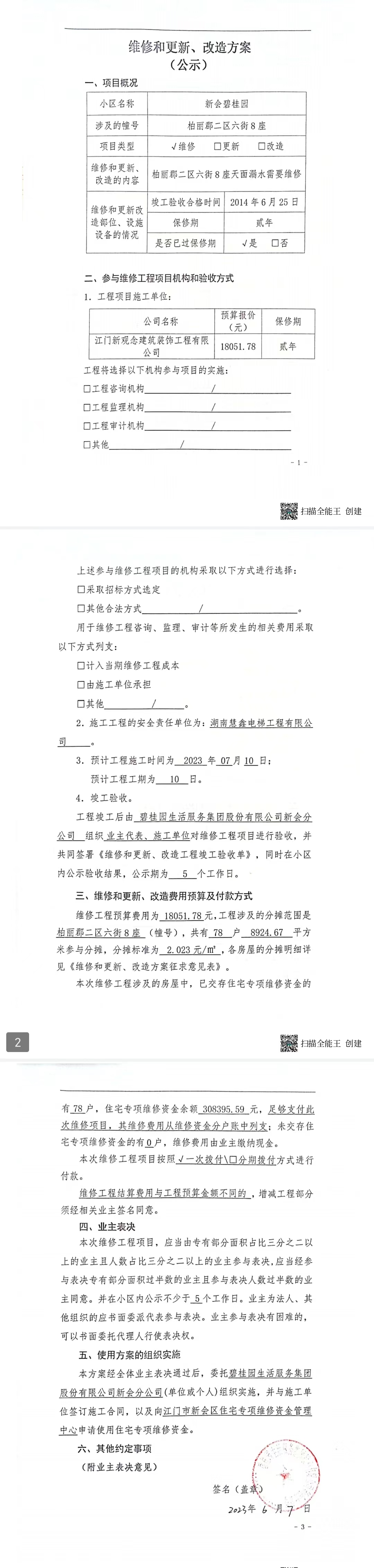 <td valign="top" values="" style="border-width:0" bindtype="0" rowspan="17" colspan="7" datasource="投票结果"><font style=" font-family:方正小标宋简体;font-size:14pt;"><p style="line-height: 1.75em;"><span style="font-family: 宋体, SimSun;">各位尊敬的业主:</span><br></p><p style="text-indent: 2em; line-height: 1.75em;"><span style="font-family: 宋体, SimSun;">根据法律法规的规定,本小区业主利用“物业公共事务决策系统”已对本小区公共事务决策事项进行了表决,在经过7日的询异公示期后,未收到业主有效的异议。现将投票结果公告,并就产生的法律效力说明如下:</span></p><p style="line-height: 1.75em; text-indent: 0em;"><strong style="text-indent: 2em;"><span style="font-family: 宋体, SimSun;">一、投票范围</span></strong></p><p style="text-indent: 2em; line-height: 1.75em;"><span style="font-family: 宋体, SimSun;">新会碧桂园柏丽郡二区六街8座</span></p><p style="text-indent: 2em; line-height: 1.75em;"><span style="font-family: 宋体, SimSun;">总人数(专有部分人数之和):78</span></p><p style="text-indent: 2em; line-height: 1.75em;"><span style="font-family: 宋体, SimSun;"><span style="font-family: 宋体, SimSun; text-indent: 32px;">总户数:78</span></span></p><p style="text-indent: 2em; line-height: 1.75em;"><span style="font-family: 宋体, SimSun;">建筑物总面积(专有部分面积之和):8924.67㎡</span></p><p style="line-height: 1.75em;"><strong><span style="font-family: 宋体, SimSun;">二、投票起止时间</span></strong></p><p style="text-indent: 2em; line-height: 1.75em;"><span style="font-family: 宋体, SimSun;">投票表决时间:从2023年06月08日到2023年06月25日止</span></p><p style="text-indent: 2em; line-height: 1.75em;"><span style="font-family: 宋体, SimSun;">投票询异公示时间:从2023年06月26日开始</span></p><p style="text-indent: 2em; line-height: 1.75em;"><span style="font-family: 宋体, SimSun;">投票结果通知公告时间:从2023年07月03日开始</span></p><p style="line-height: 1.75em;"><strong><span style="font-family: 宋体, SimSun;">三、计票规则</span></strong></p><p style="text-indent: 2em; line-height: 1.75em;"><span style="font-family: 宋体, SimSun;">表决事项:使用建筑物及其附属设施的维修资金<br></span></p><p style="font-family: 宋体, SimSun;line-height: 1.75em; text-indent: 2em;">计票规则:弃权票不并入其它项 未表决票不并入其它项</p><p></p><p style="line-height: 1.75em;"><strong><span style="font-family: 宋体, SimSun;">四、通过规则</span></strong></p><p style="text-indent: 2em; line-height: 1.75em;"><span style="font-family: 宋体, SimSun;"><span style="font-family: 宋体, SimSun; text-indent: 32px;">表决事项:使用建筑物及其附属设施的维修资金<br></span></span></p><p style="font-family: 宋体, SimSun;line-height: 1.75em; text-indent: 2em;">通过规则:参与表决专有部分面积过半数的业主且参与表决人数过半数的业主同意</p><p></p><p style="line-height: 1.75em;"><strong><span style="font-family: 宋体, SimSun;">五、投票结果</span></strong></p><p style="line-height: 1.75em; text-indent: 2em;"><span style="font-family: 宋体, SimSun; text-indent: 2em;"></span></p><div id="resultTable"><table style="table-layout: fixed; font-size:12px; margin-top:10px" width="100%" border="0" cellspacing="0" cellpadding="0"><tbody><tr><td height="28" colspan="10" align="center" style="border: 1px solid #666"><strong style="font-size: 14px;"> 使用建筑物及其附属设施的维修资金</strong></td> </tr><tr id="trfirst"><td height="28" colspan="4" style="border-left: 1px solid #666; border-bottom: 1px solid #666"><strong> 申报单位:</strong> 碧桂园生活服务集团股份有限公司新会分公司</td><td colspan="3" style="border-left: 1px solid #666; border-bottom: 1px solid #666"><strong> 联系方式:</strong> </td><td colspan="3" style="border-left: 1px solid #666; border-bottom: 1px solid #666; border-right: 1px solid #666"><strong> 申报日期:</strong> 2023年6月8日 </td></tr><tr> <td height="28" colspan="5" style="border-left: 1px solid #666; border-bottom: 1px solid #666"><strong> 总人数(专有部分人数之和):</strong>78人 </td><td colspan="5" style="border-left: 1px solid #666; border-bottom: 1px solid #666; border-right: 1px solid #666"><strong> 建筑物总面积(专有部分面积之和):</strong>8924.67㎡ </td> </tr><tr><td height="28" colspan="10" bgcolor="#F3F3F3" style="border-left: 1px solid #666;border-bottom: 1px solid #666;border-right: 1px solid #666"><strong> 参与人数及面积统计</strong></td></tr><tr><td height="28" colspan="5" style="border-left: 1px solid #666; border-bottom: 1px solid #666"><strong> 参与表决专有部分人数之和:</strong>57人</td><td colspan="5" style="border-left: 1px solid #666; border-bottom: 1px solid #666; border-right: 1px solid #666"><strong> 参与表决占有表决权总人数比例:</strong>73.08%</td></tr><tr><td height="28" colspan="5" style="border-left: 1px solid #666; border-bottom: 1px solid #666"><strong> 参与表决专有部分面积之和:</strong>6540.46㎡</td><td colspan="5" style="border-left: 1px solid #666; border-bottom: 1px solid #666; border-right: 1px solid #666"><strong> 参与表决占有表决权总面积比例:</strong>73.29%</td></tr><tr><td height="28" colspan="10" bgcolor="#F3F3F3" style="border-left: 1px solid #666; border-bottom: 1px solid #666;border-right: 1px solid #666"> <strong> 未参与人数及面积统计</strong></td> </tr><tr><td height="28" colspan="5" style="border-left: 1px solid #666; border-bottom: 1px solid #666"><strong> 未参与表决专有部分人数之和:</strong>21人 </td><td colspan="5" style="border-left: 1px solid #666; border-bottom: 1px solid #666; border-right: 1px solid #666"><strong> 未参与表决占有表决权总人数比例:</strong>26.92%</td></tr><t