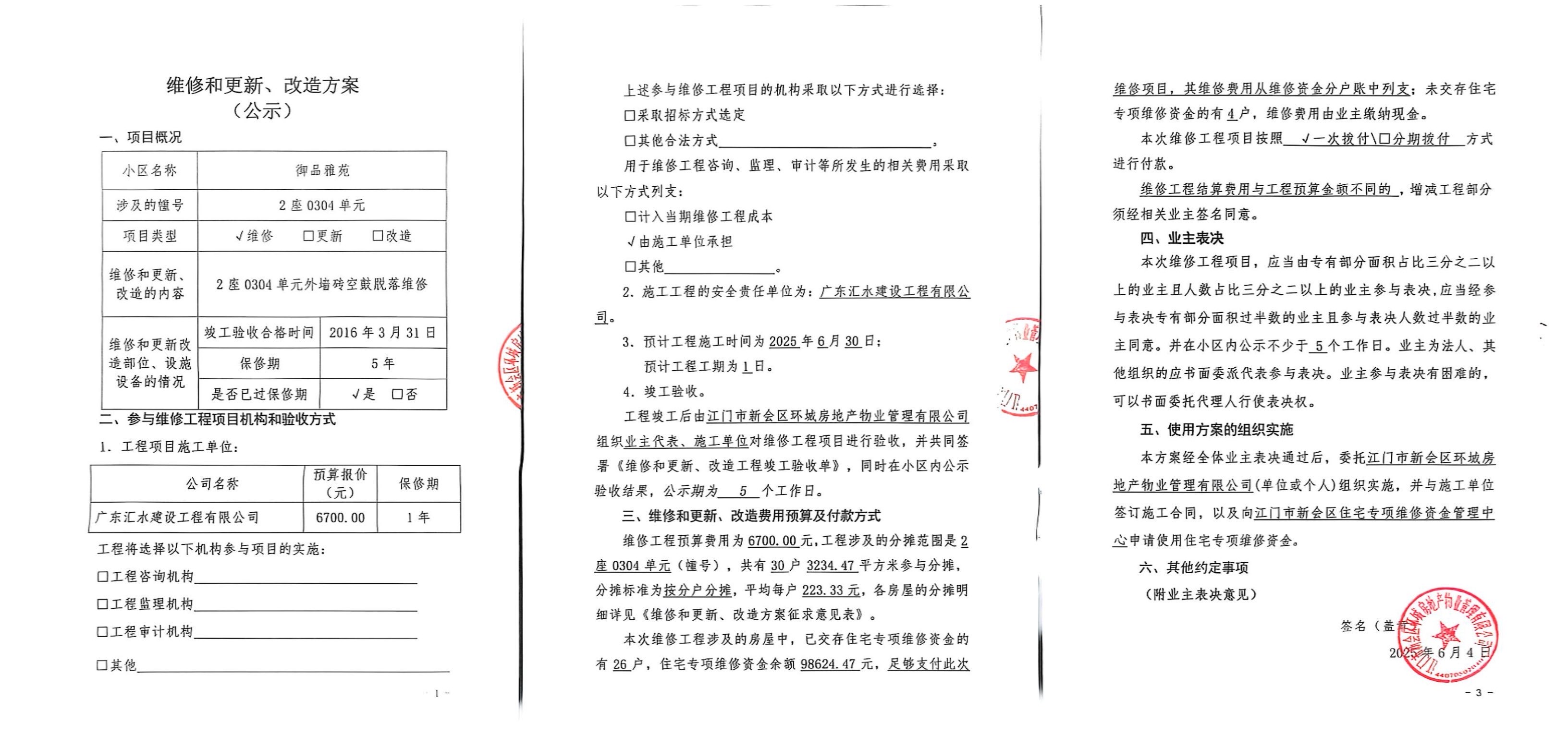 <td VALIGN="top" VALUES="" STYLE="border-width:0" BINDTYPE="0" ROWSPAN="19" COLSPAN="7" DATASOURCE="投票结果" ><font style="font-size:14pt;"><p style="white-space: normal; font-family: 宋体; line-height: 1.75em;">御品雅苑御品雅苑2座全体业主:</p><p style="white-space: normal; font-family: 宋体; line-height: 1.75em; text-indent: 2em;">本小区关于御品雅苑2座03-04单元外墙砖空鼓脱落维修使用维修资金的投票的投票已表决结束,询异时间从2025年07月28日开始,投票询异公示期间,业主可通过微信查询自己的表决情况或可凭身份证件申请查询自己的表决情况;如公示的业主表决情况与查询的本人表决意见不一致的,可以以书面形式向投票组织机构申诉,投票组织机构予以纠正并重新公示表决结果。异议提出人对投票组织机构的处理仍有异议的,可以向街道办事处(镇人民政府)反映处理,涉及住宅专项维修资金的,可向属地住宅专项维修资金管理中心反映处理。</p><p style="white-space: normal;"><br/></p><p style="white-space: normal; font-family: 宋体; line-height: 1.75em;"><strong>附件:</strong></p><p style="white-space: normal; font-family: 宋体; line-height: 1.75em;"><strong>一、投票范围</strong></p><p style="white-space: normal; font-family: 宋体; line-height: 1.75em; text-indent: 2em;">御品雅苑御品雅苑2座</p><p style="white-space: normal; font-family: 宋体; line-height: 1.75em; text-indent: 2em;">总人数(专有部分人数之和):30</p><p style="white-space: normal; font-family: 宋体; line-height: 1.75em; text-indent: 2em;"><span style="font-family: 宋体, SimSun;"><span style="font-family: 宋体; text-indent: 32px;"><span style="font-family: 宋体; text-indent: 32px;">总户数:30</span></span></span></p><p style="white-space: normal; font-family: 宋体; line-height: 1.75em; text-indent: 2em;">建筑物总面积(专有部分面积之和):3234.47㎡</p><p style="white-space: normal; font-family: 宋体; line-height: 1.75em;"><strong>二、询异公示起止时间</strong></p><p dir="ltr" style="white-space: normal; font-family: 宋体; line-height: 1.75em; text-indent: 2em;"><span style="text-indent: 36px;">2025年07月28日至2025年08月07日</span></p><p style="white-space: normal; font-family: 宋体; line-height: 1.75em;"><strong>三、投票详细描述</strong></p><p style="white-space: normal; font-family: 宋体; line-height: 1.75em; text-indent: 2em;"><p><span style="font-family: arial, helvetica, sans-serif;"><span style="font-size: 15px; color: black; background: white;">本小区</span><span style="font-size: 15px; color: black; background: white;">2</span><span style="font-size: 15px; color: black; background: white;">座</span><span style="font-size: 15px; color: black; background: white;">03-04</span><span style="font-size: 15px; color: black; background: white;">单元外墙砖出现脱落,经检查,是由于外墙砖空鼓造成。现需申请使用维修资金对</span><span style="font-size: 15px; color: black; background: white;">2</span><span style="font-size: 15px; color: black; background: white;">座</span><span style="font-size: 15px; color: black; background: white;">03-04</span><span style="font-size: 15px; color: black; background: white;">单元外墙砖空鼓进行维修,工程维修预算金额为</span><span style="font-size: 15px; color: black; background: white;">6700.00</span><span style="font-size: 15px; color: black; background: white;">元,项目最终费用以施工合同签订金额为准。因已过保修期,维修费用由相关业主按分户分摊,共涉及</span><span style="font-size: 15px; color: black; background: white;">30</span><span style="font-size: 15px; color: black; background: white;">户,每户</span><span style="font-size: 15px; color: black; background: white;">223.33</span><span style="font-size: 15px; color: black; background: white;">元,详见公示附件。如业主手机不能正常通过微信投票,请联系物业公司进行线下纸质投票,物业公司联系电话:</span><span style="font-size: 15px; color: black; background: white;">0750-6178033</span><span style="font-size: 15px; color: black; background: white;">。</span></span></p><p><br/></p></p><p style="white-space: normal; font-family: 宋体; line-height: 1.75em;"><strong>四、计票规则</strong></p><p style="white-space: normal; font-family: 宋体; line-height: 1.75em; text-indent: 2em;">表决事项:使用建筑物及其附属设施的维修资金<br /><p style='text-align: left; font-family: 宋体; font-size: 16px; line-height: 1.75em; text-indent: 2em;'>计票规则:弃权票不并入其它项 未表决票不并入其它项</p></p><p style="white-space: normal; font-family: 宋体; line-height: 1.75em;"><strong>五、通过规则</strong></p><p style="white-space: normal; font-family: 宋体; line-height: 1.75em;"><strong><strong style="white-space: normal;"><span style="font-family: 宋体, SimSun;"> 根据《中华人民共和国民法典》第二百七十八条规定:业主共同决定事项,应当由专有部分面积占比三分之二以上的业主且人数占比三分之二以上的业主参与表决。</span></strong></strong></p><p style="white-space: normal; font-family: 宋体; line-height: 1.75em; text-indent: 2em;">表决事项:使用建筑物及其附属设施的维修资金<br /><p style='text-align: left; font-family: 宋体; font-size: 16px; line-height: 1.75em; text-indent: 2em;'>通过规则:双2/3以上参与表决,参与表决双过半同意</p></p><p style="white-space: normal; font-family: 宋体; line-height: 1.75em;"><strong>六、投票结果</strong></p><p style="white-space: normal; font-family: 宋体; line-height: 1.75em; text-indent: 2em;"><div id='resultTable'><table style='table-layout: fixed; font-size:12px; margin-top:10px' width='100%' border='0' cellspacing='0' cellpadding='0'><tr><td height='28' colspan='10' a