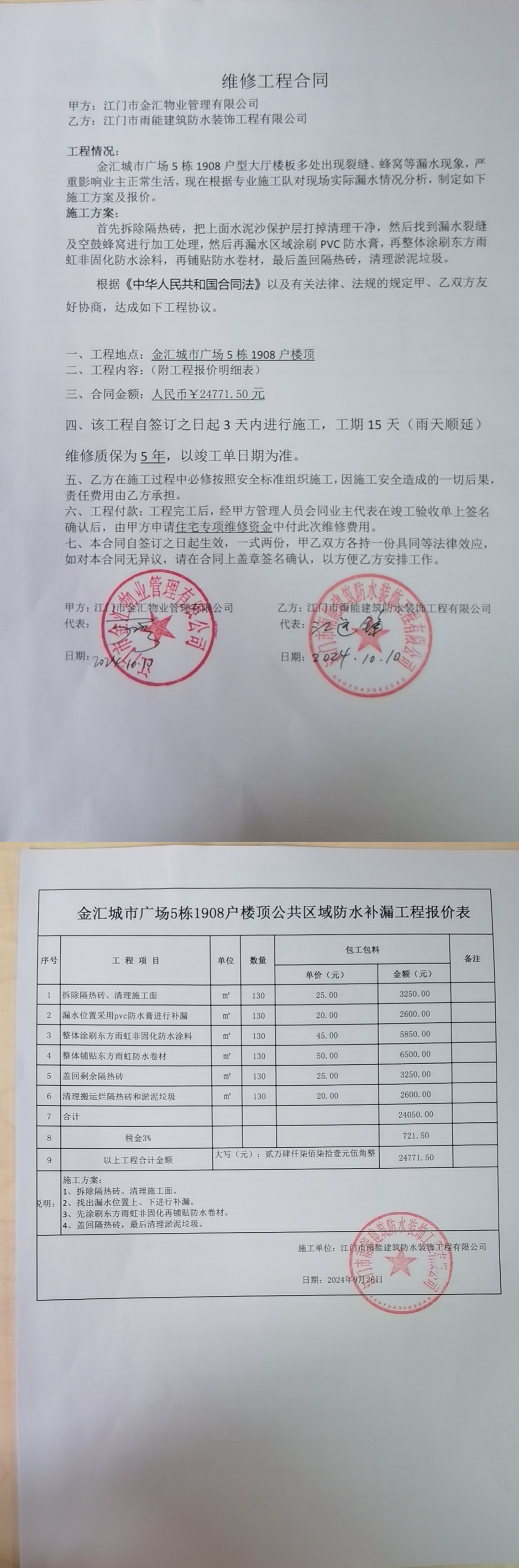 <td VALIGN="top" VALUES="" STYLE="border-width:0" BINDTYPE="0" ROWSPAN="19" COLSPAN="7" DATASOURCE="投票结果" ><font style="font-size:14pt;"><p style="white-space: normal; font-family: 宋体; line-height: 1.75em;">金汇城市广场金汇城市广场5栋全体业主:</p><p style="white-space: normal; font-family: 宋体; line-height: 1.75em; text-indent: 2em;">本小区关于金汇城市广场关于5幢08户型楼顶公共区域补漏工程申请维修资金的投票的投票已表决结束,询异时间从2025年04月03日开始,投票询异公示期间,业主可通过微信查询自己的表决情况或可凭身份证件申请查询自己的表决情况;如公示的业主表决情况与查询的本人表决意见不一致的,可以以书面形式向投票组织机构申诉,投票组织机构予以纠正并重新公示表决结果。异议提出人对投票组织机构的处理仍有异议的,可以向街道办事处(镇人民政府)反映处理,涉及住宅专项维修资金的,可向属地住宅专项维修资金管理中心反映处理。</p><p style="white-space: normal;"><br/></p><p style="white-space: normal; font-family: 宋体; line-height: 1.75em;"><strong>附件:</strong></p><p style="white-space: normal; font-family: 宋体; line-height: 1.75em;"><strong>一、投票范围</strong></p><p style="white-space: normal; font-family: 宋体; line-height: 1.75em; text-indent: 2em;">金汇城市广场金汇城市广场5栋</p><p style="white-space: normal; font-family: 宋体; line-height: 1.75em; text-indent: 2em;">总人数(专有部分人数之和):17</p><p style="white-space: normal; font-family: 宋体; line-height: 1.75em; text-indent: 2em;"><span style="font-family: 宋体, SimSun;"><span style="font-family: 宋体; text-indent: 32px;"><span style="font-family: 宋体; text-indent: 32px;">总户数:17</span></span></span></p><p style="white-space: normal; font-family: 宋体; line-height: 1.75em; text-indent: 2em;">建筑物总面积(专有部分面积之和):2249.51㎡</p><p style="white-space: normal; font-family: 宋体; line-height: 1.75em;"><strong>二、询异公示起止时间</strong></p><p dir="ltr" style="white-space: normal; font-family: 宋体; line-height: 1.75em; text-indent: 2em;"><span style="text-indent: 36px;">2025年04月03日至2025年04月13日</span></p><p style="white-space: normal; font-family: 宋体; line-height: 1.75em;"><strong>三、投票详细描述</strong></p><p style="white-space: normal; font-family: 宋体; line-height: 1.75em; text-indent: 2em;"><p><span style="font-size: 14px; font-family: 宋体, SimSun; background-color: rgb(255, 255, 255);">5幢</span><span style="font-size: 14px; font-family: 宋体, SimSun; background-color: rgb(255, 255, 255);">08户型楼顶建筑长期日晒雨淋导致楼顶平台渗水漏水以致08户楼层墙壁腐烂,排水不通等等问题,严重影响08户型业主正常生活。现需把5幢楼顶阳台公共区域的墙壁、地面、管道等全部重新做防水修复清理等相关处理。</span><span style="font-size: 14px; font-family: 宋体, SimSun; background-color: rgb(255, 255, 255);">工程维修预算金额为24771.50元,项目最终费用以施工合同签订金额为准。维修费用的分摊标准为按分户分摊,详见公示附件。物业公司联系电话:3929003。</span></p></p><p style="white-space: normal; font-family: 宋体; line-height: 1.75em;"><strong>四、计票规则</strong></p><p style="white-space: normal; font-family: 宋体; line-height: 1.75em; text-indent: 2em;">表决事项:使用建筑物及其附属设施的维修资金<br /><p style='text-align: left; font-family: 宋体; font-size: 16px; line-height: 1.75em; text-indent: 2em;'>计票规则:弃权票不并入其它项 未表决票不并入其它项</p></p><p style="white-space: normal; font-family: 宋体; line-height: 1.75em;"><strong>五、通过规则</strong></p><p style="white-space: normal; font-family: 宋体; line-height: 1.75em;"><strong><strong style="white-space: normal;"><span style="font-family: 宋体, SimSun;"> 根据《中华人民共和国民法典》第二百七十八条规定:业主共同决定事项,应当由专有部分面积占比三分之二以上的业主且人数占比三分之二以上的业主参与表决。</span></strong></strong></p><p style="white-space: normal; font-family: 宋体; line-height: 1.75em; text-indent: 2em;">表决事项:使用建筑物及其附属设施的维修资金<br /><p style='text-align: left; font-family: 宋体; font-size: 16px; line-height: 1.75em; text-indent: 2em;'>通过规则:双2/3以上参与表决,参与表决双过半同意</p></p><p style="white-space: normal; font-family: 宋体; line-height: 1.75em;"><strong>六、投票结果</strong></p><p style="white-space: normal; font-family: 宋体; line-height: 1.75em; text-indent: 2em;"><div id='resultTable'><table style='table-layout: fixed; font-size:12px; margin-top:10px' width='100%' border='0' cellspacing='0' cellpadding='0'><tr><td height='28' colspan='10' align='center' style='border: 1px solid #666'><strong style='font-size: 14px;'> 使用建筑物及其附属设施的维修资金</strong></td> </tr><tr id='trfirst'><td height='28' colspan='4' style='border-left: 1px solid #666; border-bottom: 1px solid #666'><strong> 申报单位:</strong> 江门市金汇物业管理有限公司</td><td colspan='3' style='border-left: 1px solid #666; border-bottom: 1px solid #666'><strong> 联系方式:</strong> 3929003 </td><td colspan='3' style='border-left: 1px solid #666; border-bottom: 1px solid #666; border-right: 1px solid #666'><strong> 申报日期:</strong> 2024年10月12日 </td></tr><tr> <td height='28' colspan='5' style='border-left: 1px solid #666; border-bottom: 1px solid #666'><strong> 总人数(专有部分人数之和):</strong>17人 </td><td colspan='5' style='border-left: 1px solid #666; border-bottom: 1px solid #666; border-right: 1px solid #666'><strong> 建筑物总面积(专有部分