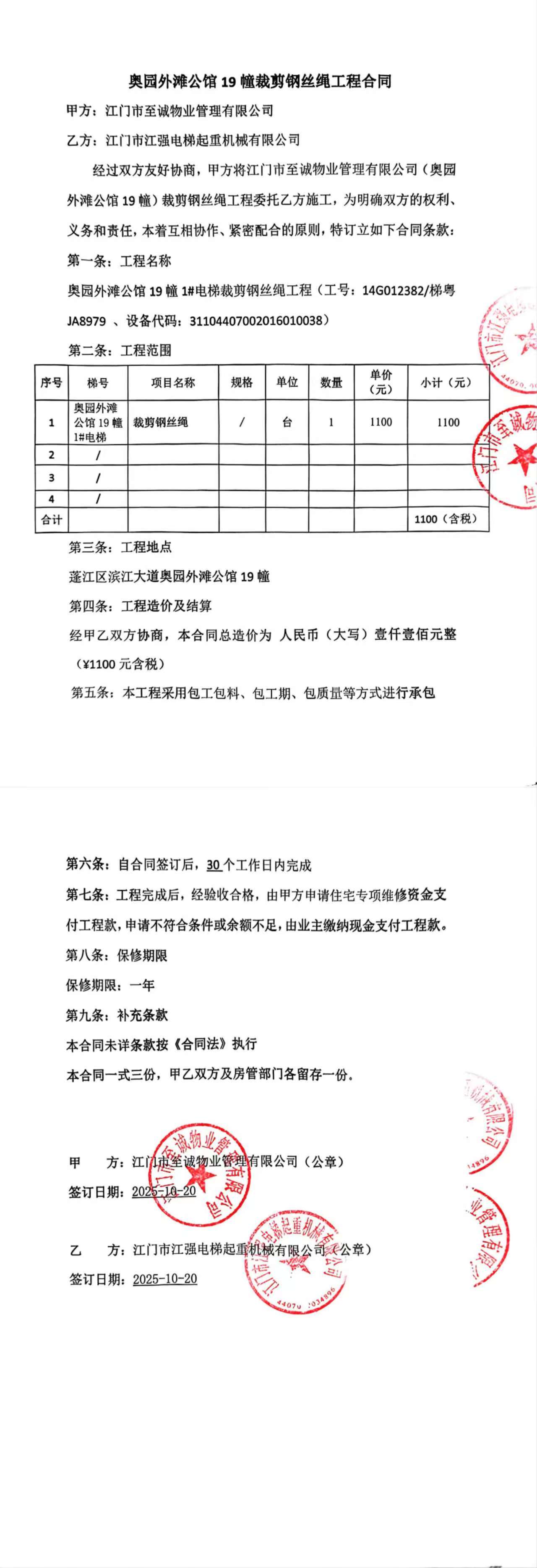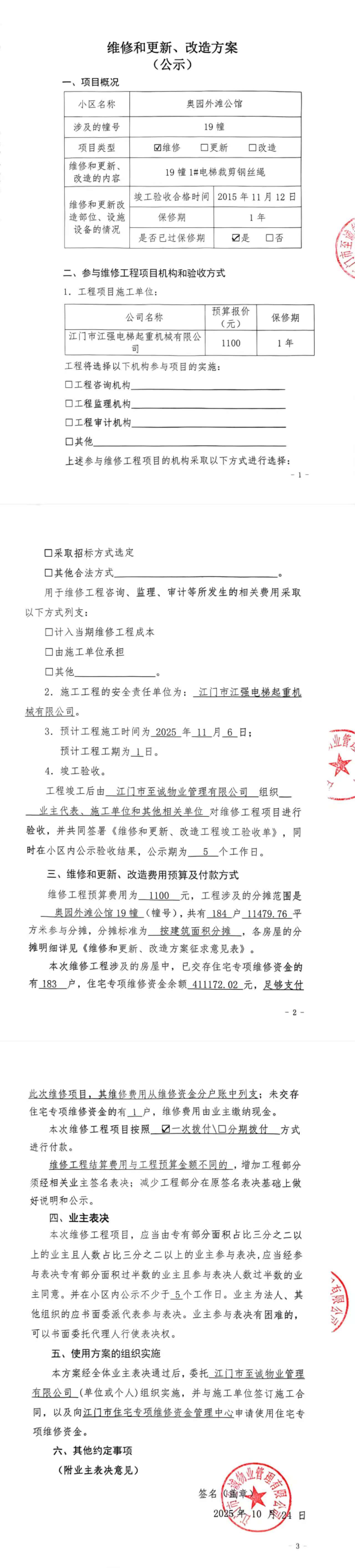 <td VALIGN="top" VALUES="" STYLE="border-width:0" BINDTYPE="0" ROWSPAN="19" COLSPAN="7" DATASOURCE="投票结果" ><font style="font-size:14pt;"><p style="white-space: normal; font-family: 宋体; line-height: 1.75em;">奥园外滩公馆蓬江区棠下镇奥园外滩公馆19幢全体业主:</p><p style="white-space: normal; font-family: 宋体; line-height: 1.75em; text-indent: 2em;">本小区关于奥园外滩公馆19幢1#电梯裁剪钢丝绳使用维修资金的投票的投票已表决结束,询异时间从2025年12月10日开始,投票询异公示期间,业主可通过微信查询自己的表决情况或可凭身份证件申请查询自己的表决情况;如公示的业主表决情况与查询的本人表决意见不一致的,可以以书面形式向投票组织机构申诉,投票组织机构予以纠正并重新公示表决结果。异议提出人对投票组织机构的处理仍有异议的,可以向街道办事处(镇人民政府)反映处理,涉及住宅专项维修资金的,可向属地住宅专项维修资金管理中心反映处理。</p><p style="white-space: normal;"><br/></p><p style="white-space: normal; font-family: 宋体; line-height: 1.75em;"><strong>附件:</strong></p><p style="white-space: normal; font-family: 宋体; line-height: 1.75em;"><strong>一、投票范围</strong></p><p style="white-space: normal; font-family: 宋体; line-height: 1.75em; text-indent: 2em;">奥园外滩公馆蓬江区棠下镇奥园外滩公馆19幢</p><p style="white-space: normal; font-family: 宋体; line-height: 1.75em; text-indent: 2em;">总人数(专有部分人数之和):159</p><p style="white-space: normal; font-family: 宋体; line-height: 1.75em; text-indent: 2em;"><span style="font-family: 宋体, SimSun;"><span style="font-family: 宋体; text-indent: 32px;"><span style="font-family: 宋体; text-indent: 32px;">总户数:184</span></span></span></p><p style="white-space: normal; font-family: 宋体; line-height: 1.75em; text-indent: 2em;">建筑物总面积(专有部分面积之和):11479.76㎡</p><p style="white-space: normal; font-family: 宋体; line-height: 1.75em;"><strong>二、询异公示起止时间</strong></p><p dir="ltr" style="white-space: normal; font-family: 宋体; line-height: 1.75em; text-indent: 2em;"><span style="text-indent: 36px;">2025年12月10日至2025年12月20日</span></p><p style="white-space: normal; font-family: 宋体; line-height: 1.75em;"><strong>三、投票详细描述</strong></p><p style="white-space: normal; font-family: 宋体; line-height: 1.75em; text-indent: 2em;"><p>小区19幢的电梯日常维保期间,维保发现1#电梯限速器钢丝绳老化,钢丝绳拉长严重,因使用时间较长,不能正常运行。</p><p> 现对19幢1#电梯进行维修,工程维修预算金额为1100元,项目最终费用以施工合同签订金额为准。因已过保修期,维修费用由相关业主按建筑面积分摊,每平方约0.1元,详见公示附件。如业主手机不能正常通过微信投票,请联系物业公司进行线下纸质投票,物业电话:0750-3851968。</p></p><p style="white-space: normal; font-family: 宋体; line-height: 1.75em;"><strong>四、计票规则</strong></p><p style="white-space: normal; font-family: 宋体; line-height: 1.75em; text-indent: 2em;">表决事项:使用建筑物及其附属设施的维修资金<br /><p style='text-align: left; font-family: 宋体; font-size: 16px; line-height: 1.75em; text-indent: 2em;'>计票规则:弃权票不并入其它项 未表决票不并入其它项</p></p><p style="white-space: normal; font-family: 宋体; line-height: 1.75em;"><strong>五、通过规则</strong></p><p style="white-space: normal; font-family: 宋体; line-height: 1.75em;"><strong><strong style="white-space: normal;"><span style="font-family: 宋体, SimSun;"> 根据《中华人民共和国民法典》第二百七十八条规定:业主共同决定事项,应当由专有部分面积占比三分之二以上的业主且人数占比三分之二以上的业主参与表决。</span></strong></strong></p><p style="white-space: normal; font-family: 宋体; line-height: 1.75em; text-indent: 2em;">表决事项:使用建筑物及其附属设施的维修资金<br /><p style='text-align: left; font-family: 宋体; font-size: 16px; line-height: 1.75em; text-indent: 2em;'>通过规则:双2/3以上参与表决,参与表决双过半同意</p></p><p style="white-space: normal; font-family: 宋体; line-height: 1.75em;"><strong>六、投票结果</strong></p><p style="white-space: normal; font-family: 宋体; line-height: 1.75em; text-indent: 2em;"><div id='resultTable'><table style='table-layout: fixed; font-size:12px; margin-top:10px' width='100%' border='0' cellspacing='0' cellpadding='0'><tr><td height='28' colspan='10' align='center' style='border: 1px solid #666'><strong style='font-size: 14px;'> 使用建筑物及其附属设施的维修资金</strong></td> </tr><tr id='trfirst'><td height='28' colspan='4' style='border-left: 1px solid #666; border-bottom: 1px solid #666'><strong> 申报单位:</strong> 江门市至诚物业管理有限公司</td><td colspan='3' style='border-left: 1px solid #666; border-bottom: 1px solid #666'><strong> 联系方式:</strong> 3851968 </td><td colspan='3' style='border-left: 1px solid #666; border-bottom: 1px solid #666; border-right: 1px solid #666'><strong> 申报日期:</strong> 2025年10月24日 </td></tr><tr> <td height='28' colspan='5' style='border-left: 1px solid #666; border-bottom: 1px solid #666'><strong> 总人数(专有部分人数之和):</strong>159人 </td><td colspan='5' style='border-left: 1px solid #666; border-bottom: 1px solid #666; border-right: 1px solid #666'><strong> 建筑物总面积(专有部分面积之和):</strong>11479.76㎡ </td> </tr><tr><td height='28' colspan='10' bgcolor='#F3F3F3' style='border-left: 1px solid #666;border-bottom: 1px solid #666;border-right: 1px solid #666'><strong> 参与人数及面积统计</strong></td></tr><tr><td height='28' c