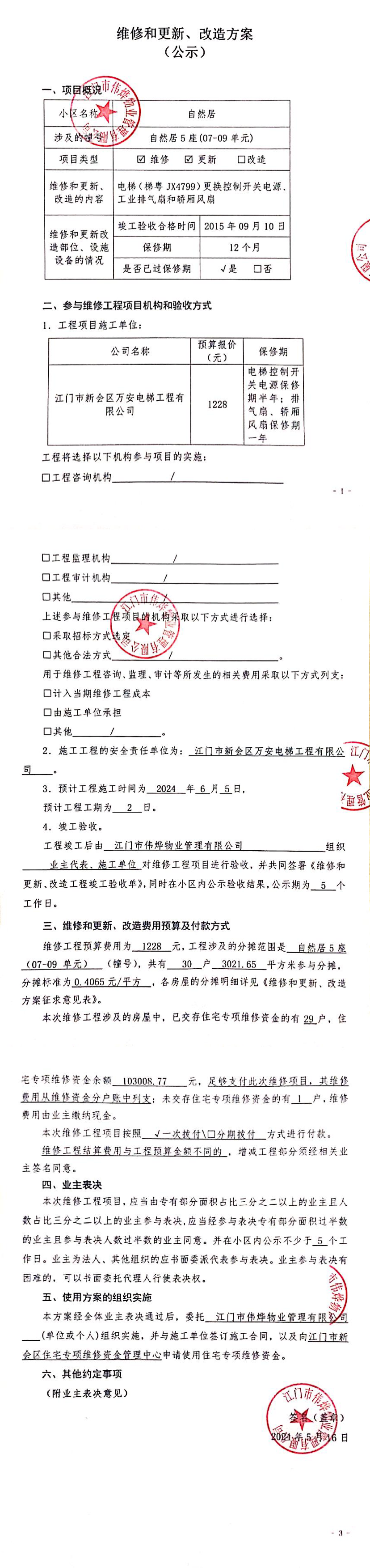 <td VALIGN="top" VALUES="" STYLE="border-width:0" BINDTYPE="0" ROWSPAN="19" COLSPAN="7" DATASOURCE="投票结果" ><font style="font-size:14pt;"><p style="white-space: normal; font-family: 宋体; line-height: 1.75em;">自然居自然居5座全体业主:</p><p style="white-space: normal; font-family: 宋体; line-height: 1.75em; text-indent: 2em;">本小区关于自然居5座07-09单元(梯粤JX4799)更换控制开关电源、工业排气扇和轿厢风扇使用维修资金的投票的投票已表决结束,询异时间从2024年05月28日开始,投票询异公示期间,业主可通过微信查询自己的表决情况或可凭身份证件申请查询自己的表决情况;如公示的业主表决情况与查询的本人表决意见不一致的,可以以书面形式向投票组织机构申诉,投票组织机构予以纠正并重新公示表决结果。异议提出人对投票组织机构的处理仍有异议的,可以向街道办事处(镇人民政府)反映处理,涉及住宅专项维修资金的,可向属地住宅专项维修资金管理中心反映处理。</p><p style="white-space: normal;"><br/></p><p style="white-space: normal; font-family: 宋体; line-height: 1.75em;"><strong>附件:</strong></p><p style="white-space: normal; font-family: 宋体; line-height: 1.75em;"><strong>一、投票范围</strong></p><p style="white-space: normal; font-family: 宋体; line-height: 1.75em; text-indent: 2em;">自然居自然居5座</p><p style="white-space: normal; font-family: 宋体; line-height: 1.75em; text-indent: 2em;">总人数(专有部分人数之和):30</p><p style="white-space: normal; font-family: 宋体; line-height: 1.75em; text-indent: 2em;"><span style="font-family: 宋体, SimSun;"><span style="font-family: 宋体; text-indent: 32px;"><span style="font-family: 宋体; text-indent: 32px;">总户数:30</span></span></span></p><p style="white-space: normal; font-family: 宋体; line-height: 1.75em; text-indent: 2em;">建筑物总面积(专有部分面积之和):3021.65㎡</p><p style="white-space: normal; font-family: 宋体; line-height: 1.75em;"><strong>二、询异公示起止时间</strong></p><p dir="ltr" style="white-space: normal; font-family: 宋体; line-height: 1.75em; text-indent: 2em;"><span style="text-indent: 36px;">2024年05月28日至2024年06月03日</span></p><p style="white-space: normal; font-family: 宋体; line-height: 1.75em;"><strong>三、投票详细描述</strong></p><p style="white-space: normal; font-family: 宋体; line-height: 1.75em; text-indent: 2em;"><p>小区5座07-09单元电梯(梯粤JX4799)日常运行时出现故障,会出现突然断电困人的情况,经检查,是由于电梯控制开关电源故障、机房排气扇和轿厢风扇故障导致不能正常运行。现对5座07-09单元电梯(梯粤JX4799)的控制开关电源进行更换维修,更换电梯机房14寸工业排气扇和轿厢顶风扇,工程维修预算金额为1228元,项目最终费用以施工合同签订金额为准。因已过保修期,维修费用由相关业主按建筑面积分摊,每平方约0.4065元,详见公示附件。如业主手机不能正常通过微信投票,请联系物业公司进行线下纸质投票,物业电话:0750-6183338。</p></p><p style="white-space: normal; font-family: 宋体; line-height: 1.75em;"><strong>四、计票规则</strong></p><p style="white-space: normal; font-family: 宋体; line-height: 1.75em; text-indent: 2em;">表决事项:使用建筑物及其附属设施的维修资金<br /><p style='text-align: left; font-family: 宋体; font-size: 16px; line-height: 1.75em; text-indent: 2em;'>计票规则:弃权票不并入其它项 未表决票不并入其它项</p></p><p style="white-space: normal; font-family: 宋体; line-height: 1.75em;"><strong>五、通过规则</strong></p><p style="white-space: normal; font-family: 宋体; line-height: 1.75em;"><strong><strong style="white-space: normal;"><span style="font-family: 宋体, SimSun;"> 根据《中华人民共和国民法典》第二百七十八条规定:业主共同决定事项,应当由专有部分面积占比三分之二以上的业主且人数占比三分之二以上的业主参与表决。</span></strong></strong></p><p style="white-space: normal; font-family: 宋体; line-height: 1.75em; text-indent: 2em;">表决事项:使用建筑物及其附属设施的维修资金<br /><p style='text-align: left; font-family: 宋体; font-size: 16px; line-height: 1.75em; text-indent: 2em;'>通过规则:双2/3以上参与表决,参与表决双过半同意</p></p><p style="white-space: normal; font-family: 宋体; line-height: 1.75em;"><strong>六、投票结果</strong></p><p style="white-space: normal; font-family: 宋体; line-height: 1.75em; text-indent: 2em;"><div id='resultTable'><table style='table-layout: fixed; font-size:12px; margin-top:10px' width='100%' border='0' cellspacing='0' cellpadding='0'><tr><td height='28' colspan='10' align='center' style='border: 1px solid #666'><strong style='font-size: 14px;'> 使用建筑物及其附属设施的维修资金</strong></td> </tr><tr id='trfirst'><td height='28' colspan='4' style='border-left: 1px solid #666; border-bottom: 1px solid #666'><strong> 申报单位:</strong> 江门市伟烨物业管理有限公司</td><td colspan='3' style='border-left: 1px solid #666; border-bottom: 1px solid #666'><strong> 联系方式:</strong> 0750-6123828 </td><td colspan='3' style='border-left: 1px solid #666; border-bottom: 1px solid #666; border-right: 1px solid #666'><strong> 申报日期:</strong> 2024年5月16日 </td></tr><tr> <td height='28' colspan='5' style='border-left: 1px solid #666; border-bottom: 1px solid #666'><strong> 总人数(专有部分人数之和):</strong>30人 </td><td colspan='5' style='border-left: 1px solid #666; border-bottom: 1px solid #666; border-right: 1px solid #666'><strong> 建筑物总面积(专有部分面积之和):</strong>3021.65㎡ </td> </tr><tr><td height='28' colspan='10' bgcolor='#F3F3F3' style='border-left: 1px 