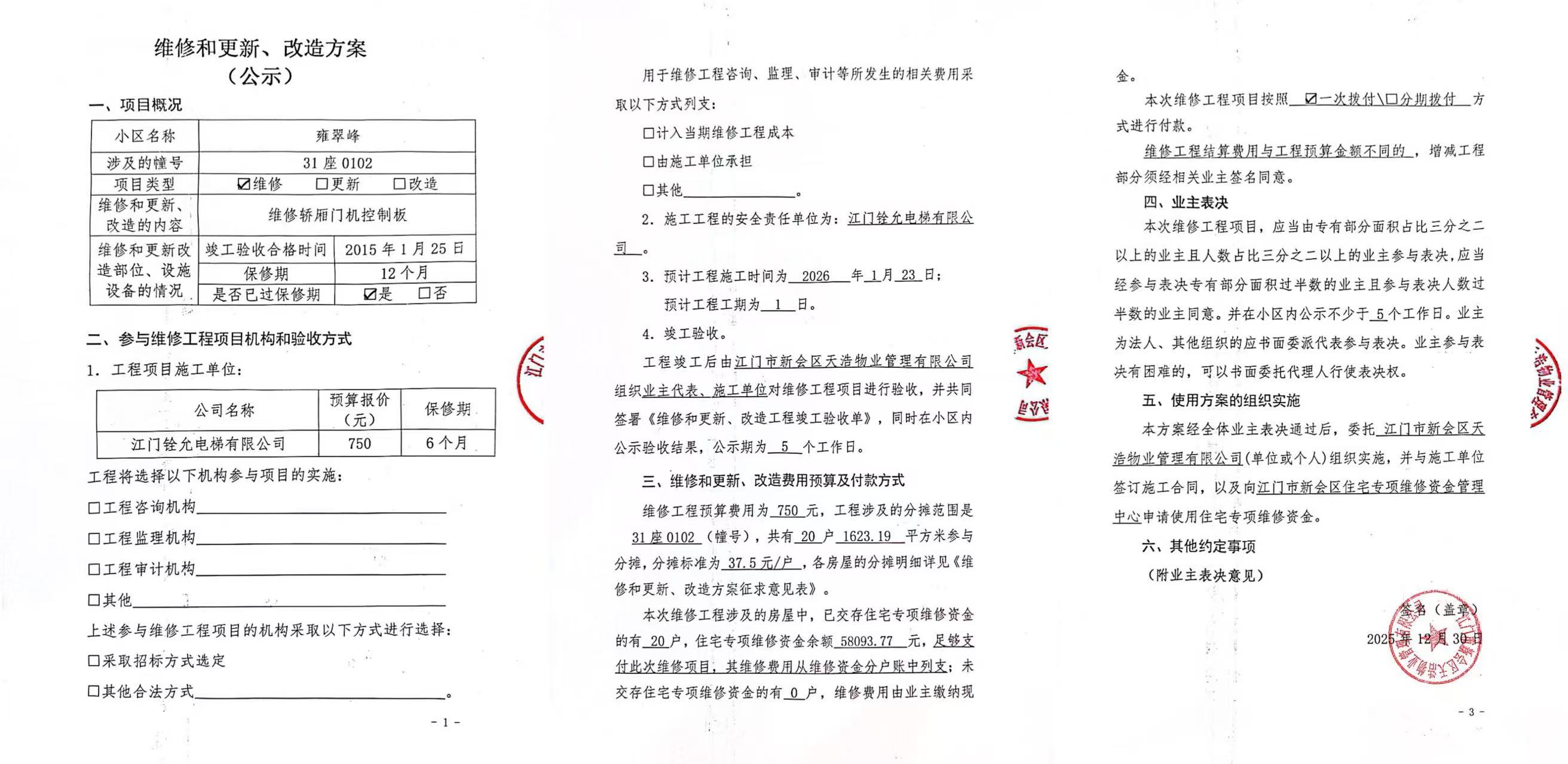 <td VALIGN="top" VALUES="" STYLE="border-width:0" BINDTYPE="0" ROWSPAN="17" COLSPAN="7" DATASOURCE="投票结果" ><font style=" font-family:方正小标宋简体;font-size:14pt;"><p style="line-height: 1.75em;"><span style="font-family: 宋体, SimSun;">各位尊敬的业主:</span><br/></p><p style="text-indent: 2em; line-height: 1.75em;"><span style="font-family: 宋体, SimSun;">根据法律法规的规定,本小区业主利用“江门市物业事项表决管理系统”已对本小区公共事务决策事项(<span style="font-family: 宋体; text-indent: 32px;">雍翠峰31座01-02单元电梯【梯粤JX5534】维修轿厢门机控制板使用维修资金的投票</span>)进行了表决,在经过7日的询异公示期后,未收到业主有效的异议。现将投票结果公告,并就产生的法律效力说明如下:</span></p><p style="line-height: 1.75em; text-indent: 0em;"><strong style="text-indent: 2em;"><span style="font-family: 宋体, SimSun;">一、投票范围</span></strong></p><p style="text-indent: 2em; line-height: 1.75em;"><span style="font-family: 宋体, SimSun;">雍翠峰雍翠峰31座</span></p><p style="text-indent: 2em; line-height: 1.75em;"><span style="font-family: 宋体, SimSun;">总人数(专有部分人数之和):19</span></p><p style="text-indent: 2em; line-height: 1.75em;"><span style="font-family: 宋体, SimSun;"><span style="font-family: 宋体, SimSun; text-indent: 32px;"><span style="font-family: 宋体; text-indent: 32px;"><span style="font-family: 宋体; text-indent: 32px;">总户数:20</span></span></span></span></p><p style="text-indent: 2em; line-height: 1.75em;"><span style="font-family: 宋体, SimSun;">建筑物总面积(专有部分面积之和):1623.19㎡</span></p><p style="line-height: 1.75em;"><strong><span style="font-family: 宋体, SimSun;">二、投票结果公告时间</span></strong></p><p style="text-indent: 2em; line-height: 1.75em;"><span style="font-family: 宋体, SimSun;"><span style="font-family: 宋体, SimSun; text-indent: 32px;">从2026年01月24日开始</span></span></p><p style="line-height: 1.75em;"><strong><span style="font-family: 宋体, SimSun;">三、计票规则</span></strong></p><p style="text-indent: 2em; line-height: 1.75em;"><span style="font-family: 宋体, SimSun;">表决事项:使用建筑物及其附属设施的维修资金<br /><p style='font-family: 宋体, SimSun;line-height: 1.75em; text-indent: 2em;'>计票规则:弃权票不并入其它项&nbsp;&nbsp;&nbsp;&nbsp;未表决票不并入其它项</p></span></p><p style="line-height: 1.75em;"><strong><span style="font-family: 宋体, SimSun;">四、通过规则</span></strong></p><p style="line-height: 1.75em;"><strong><span style="font-family: 宋体, SimSun;">&nbsp; 根据《中华人民共和国民法典》第二百七十八条规定:业主共同决定事项,应当由专有部分面积占比三分之二以上的业主且人数占比三分之二以上的业主参与表决。</span></strong></p><p style="text-indent: 2em; line-height: 1.75em;"><span style="font-family: 宋体, SimSun;"><span style="font-family: 宋体, SimSun; text-indent: 32px;">表决事项:使用建筑物及其附属设施的维修资金<br /><p style='font-family: 宋体, SimSun;line-height: 1.75em; text-indent: 2em;'>通过规则:双2/3以上参与表决,参与表决双过半同意</p></span></span></p><p style="line-height: 1.75em;"><strong><span style="font-family: 宋体, SimSun;">五、投票结果</span></strong></p><p style="line-height: 1.75em; text-indent: 2em;"><span style="font-family: 宋体, SimSun; text-indent: 2em;"><div id='resultTable'><table style='table-layout: fixed; font-size:12px; margin-top:10px' width='100%' border='0' cellspacing='0' cellpadding='0'><tr><td height='28' colspan='10' align='center' style='border: 1px solid #666'><strong style='font-size: 14px;'> 使用建筑物及其附属设施的维修资金</strong></td> </tr><tr id='trfirst'><td height='28' colspan='4' style='border-left: 1px solid #666; border-bottom: 1px solid #666'><strong>&nbsp;申报单位:</strong> 江门市新会区天浩物业管理有限公司</td><td colspan='3' style='border-left: 1px solid #666; border-bottom: 1px solid #666'><strong>&nbsp;联系方式:</strong> </td><td colspan='3' style='border-left: 1px solid #666; border-bottom: 1px solid #666; border-right: 1px solid #666'><strong>&nbsp;申报日期:</strong> 2025年12月30日 </td></tr><tr> <td height='28' colspan='5' style='border-left: 1px solid #666; border-bottom: 1px solid #666'><strong>&nbsp;列支总人数(专有部分人数之和):</strong>19人 </td><td colspan='5' style='border-left: 1px solid #666; border-bottom: 1px solid #666; border-right: 1px solid #666'><strong>&nbsp;列支建筑物总面积(专有部分面积之和):</strong>1623.19㎡ </td> </tr><tr><td height='28' colspan='10' bgcolor='#F3F3F3' style='border-left: 1px solid #666;border-bottom: 1px solid #666;border-right: 1px solid #666'><strong>&nbsp;参与表决人数及面积统计</strong></td></tr><tr><td height='28' colspan='5' style='border-left: 1px solid #666; border-bottom: 1px solid #666'><strong>&nbsp;参与表决人数:</strong>15人</td><td colspan='5' style='border-left: 1px solid #666; border-bottom: 1px solid #666; border-right: 1px solid #666'><strong>&nbsp;参与表决人数占总人数比例:</strong>78.95%</td></tr><tr><td height='28' colspan='5' style='border-left: 1px solid #666; border-bottom: 1px solid #666'><strong>&nbsp;参与表决面积:</strong>1225.41㎡</td><td colspan='5' style='border-left: 1px solid #666; border-bottom: 1px solid #666; border-right: 1px solid #666'><strong>&nbsp;参与表决面积占总面积比例:</strong>75.49%</td></tr><tr><td height='28' colspan='10' bgcolor='#F3F3F3' style='border-left: 1px solid #666; border-bottom: 1px solid #666;border-right: 1px solid #666'> <strong>&nbsp;参与表决同意人数及面积统计</strong></td> </tr><tr><td height='28' colspan='5' style='border-left: 1px so
