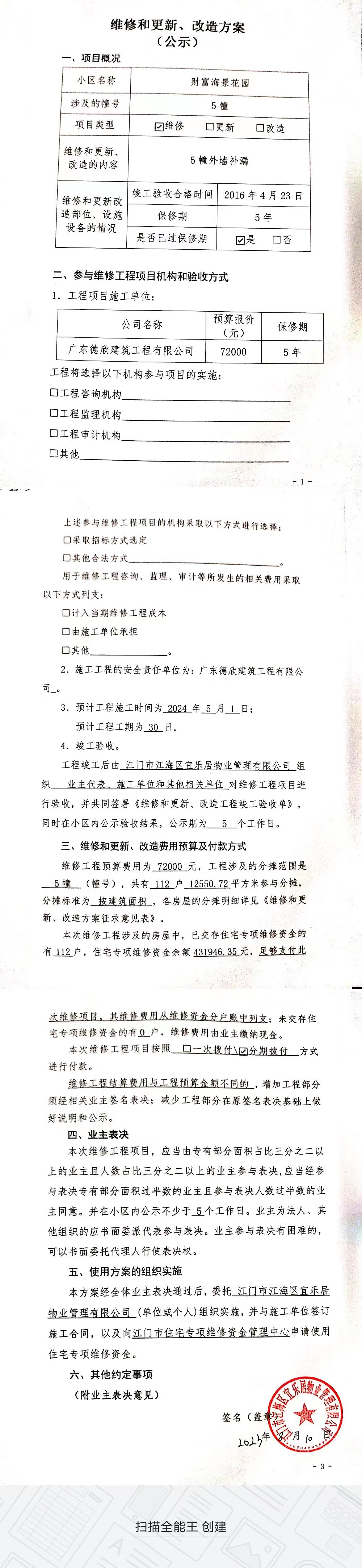 <td VALIGN="top" VALUES="" STYLE="border-width:0" BINDTYPE="0" ROWSPAN="19" COLSPAN="7" DATASOURCE="投票结果" ><font style="font-size:14pt;"><p style="white-space: normal; font-family: 宋体; line-height: 1.75em;">江海区外海财富海景花园江海区外海财富海景花园5幢全体业主:</p><p style="white-space: normal; font-family: 宋体; line-height: 1.75em; text-indent: 2em;">本小区关于江门财富海景花园5幢外墙补漏使用维修资金的投票的投票已表决结束,询异时间从2023年10月22日开始,投票询异公示期间,业主可通过微信查询自己的表决情况或可凭身份证件申请查询自己的表决情况;如公示的业主表决情况与查询的本人表决意见不一致的,可以以书面形式向投票组织机构申诉,投票组织机构予以纠正并重新公示表决结果。异议提出人对投票组织机构的处理仍有异议的,可以向街道办事处(镇人民政府)反映处理,涉及住宅专项维修资金的,可向属地住宅专项维修资金管理中心反映处理。</p><p style="white-space: normal;"><br/></p><p style="white-space: normal; font-family: 宋体; line-height: 1.75em;"><strong>附件:</strong></p><p style="white-space: normal; font-family: 宋体; line-height: 1.75em;"><strong>一、投票范围</strong></p><p style="white-space: normal; font-family: 宋体; line-height: 1.75em; text-indent: 2em;">江海区外海财富海景花园江海区外海财富海景花园5幢</p><p style="white-space: normal; font-family: 宋体; line-height: 1.75em; text-indent: 2em;">总人数(专有部分人数之和):110</p><p style="white-space: normal; font-family: 宋体; line-height: 1.75em; text-indent: 2em;"><span style="font-family: 宋体, SimSun;">总户数:112</span></p><p style="white-space: normal; font-family: 宋体; line-height: 1.75em; text-indent: 2em;">建筑物总面积(专有部分面积之和):12550.72㎡</p><p style="white-space: normal; font-family: 宋体; line-height: 1.75em;"><strong>二、询异公示起止时间</strong></p><p dir="ltr" style="white-space: normal; font-family: 宋体; line-height: 1.75em; text-indent: 2em;"><span style="text-indent: 36px;">2023年10月22日至2023年10月28日</span></p><p style="white-space: normal; font-family: 宋体; line-height: 1.75em;"><strong>三、投票详细描述</strong></p><p style="white-space: normal; font-family: 宋体; line-height: 1.75em; text-indent: 2em;"><p>本小区5幢多户屋内墙体渗水,经检查,是由于外墙渗水,已过保修期。</p><p>现需申请使用维修资金对5幢部分外墙补漏,工程维修预算金额为72000元,项目最终费用以施工合同签订金额为准。维修费用的分摊标准为按建筑面积分摊,每平方约5.74元,详见公示附件。如业主手机不能正常通过微信投票,请联系物业服务中心,物业服务中心电话:0750-3813899。</p><p><br/></p></p><p style="white-space: normal; font-family: 宋体; line-height: 1.75em;"><strong>四、计票规则</strong></p><p style="white-space: normal; font-family: 宋体; line-height: 1.75em; text-indent: 2em;">表决事项:使用建筑物及其附属设施的维修资金<br /><p style='text-align: left; font-family: 宋体; font-size: 16px; line-height: 1.75em; text-indent: 2em;'>计票规则:弃权票不并入其它项 未表决票不并入其它项</p></p><p style="white-space: normal; font-family: 宋体; line-height: 1.75em;"><strong>五、通过规则</strong></p><p style="white-space: normal; font-family: 宋体; line-height: 1.75em;"><strong><strong style="white-space: normal;"><span style="font-family: 宋体, SimSun;">&nbsp; 根据《中华人民共和国民法典》第二百七十八条规定:业主共同决定事项,应当由专有部分面积占比三分之二以上的业主且人数占比三分之二以上的业主参与表决。</span></strong></strong></p><p style="white-space: normal; font-family: 宋体; line-height: 1.75em; text-indent: 2em;">表决事项:使用建筑物及其附属设施的维修资金<br /><p style='text-align: left; font-family: 宋体; font-size: 16px; line-height: 1.75em; text-indent: 2em;'>通过规则:参与表决专有部分面积过半数的业主且参与表决人数过半数的业主同意</p></p><p style="white-space: normal; font-family: 宋体; line-height: 1.75em;"><strong>六、投票结果</strong></p><p style="white-space: normal; font-family: 宋体; line-height: 1.75em; text-indent: 2em;"><div id='resultTable'><table style='table-layout: fixed; font-size:12px; margin-top:10px' width='100%' border='0' cellspacing='0' cellpadding='0'><tr><td height='28' colspan='10' align='center' style='border: 1px solid #666'><strong style='font-size: 14px;'> 使用建筑物及其附属设施的维修资金</strong></td> </tr><tr id='trfirst'><td height='28' colspan='4' style='border-left: 1px solid #666; border-bottom: 1px solid #666'><strong> 申报单位:</strong> 江门市江海区宜乐居物业管理有限公司</td><td colspan='3' style='border-left: 1px solid #666; border-bottom: 1px solid #666'><strong> 联系方式:</strong> </td><td colspan='3' style='border-left: 1px solid #666; border-bottom: 1px solid #666; border-right: 1px solid #666'><strong> 申报日期:</strong> 2023年9月18日 </td></tr><tr> <td height='28' colspan='5' style='border-left: 1px solid #666; border-bottom: 1px solid #666'><strong> 总人数(专有部分人数之和):</strong>110人 </td><td colspan='5' style='border-left: 1px solid #666; border-bottom: 1px solid #666; border-right: 1px solid #666'><strong> 建筑物总面积(专有部分面积之和):</strong>12550.72㎡ </td> </tr><tr><td height='28' colspan='10' bgcolor='#F3F3F3' style='border-left: 1px solid #666;border-bottom: 1px solid #666;border-right: 1px solid #666'><strong> 参与人数及面积统计</strong></td></tr><tr><td height='28' colspan='5' style='border-left: 1px solid #666; border-bottom: 1px solid #666'><strong> 参与表决专