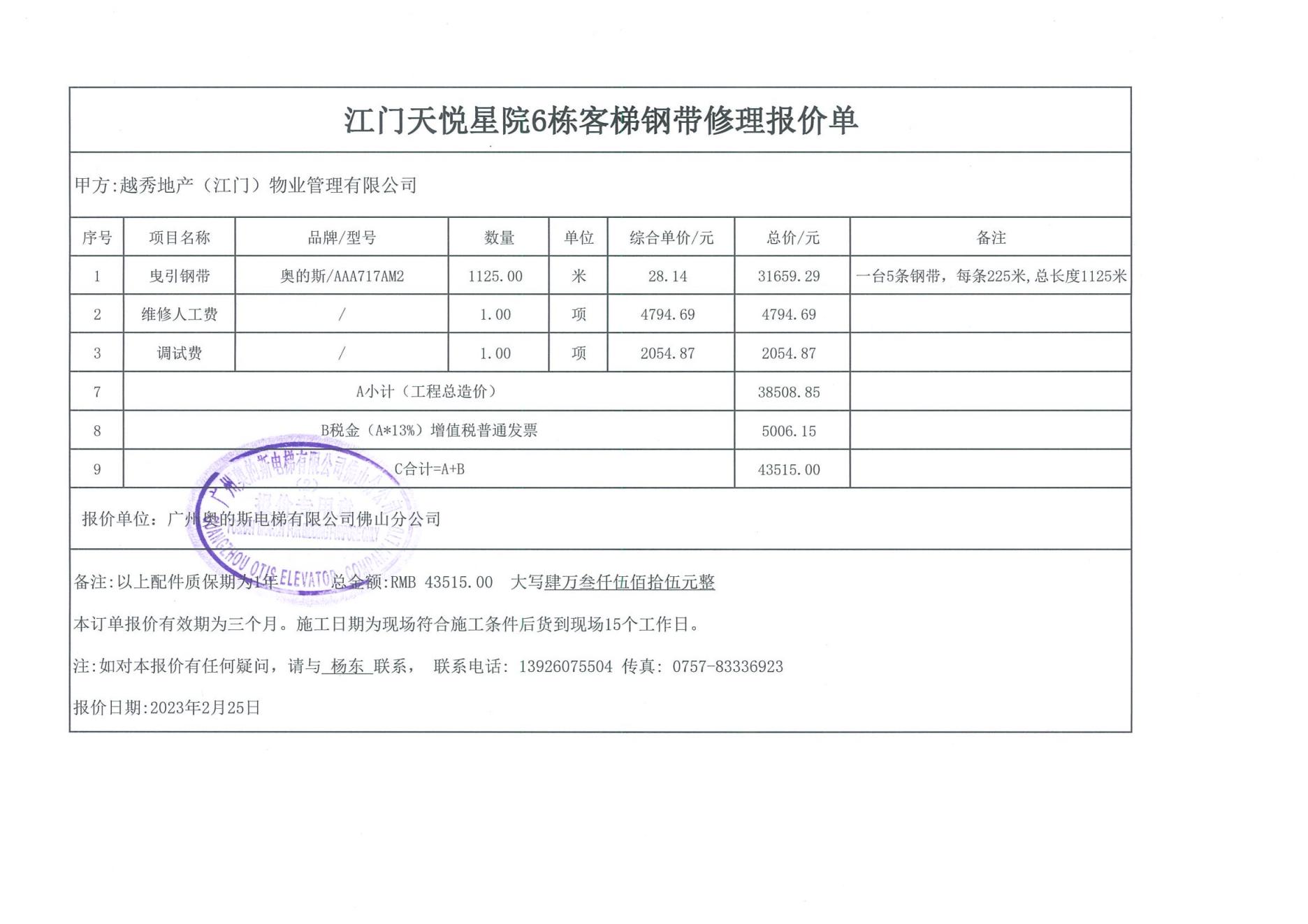 <td VALIGN="top" VALUES="" STYLE="border-width:0" BINDTYPE="0" ROWSPAN="19" COLSPAN="7" DATASOURCE="投票结果" ><font style="font-size:14pt;"><p style="white-space: normal; font-family: 宋体; line-height: 1.75em;">天悦星院蓬江区天悦星院6幢全体业主:</p><p style="white-space: normal; font-family: 宋体; line-height: 1.75em; text-indent: 2em;">本小区关于江门天悦星院6幢客梯更换曳引钢丝带表决事项的投票已表决结束,询异时间从2023年03月13日开始,投票询异公示期间,业主可通过微信查询自己的表决情况或可凭身份证件申请查询自己的表决情况;如公示的业主表决情况与查询的本人表决意见不一致的,可以以书面形式向投票组织机构申诉,投票组织机构予以纠正并重新公示表决结果。异议提出人对投票组织机构的处理仍有异议的,可以向街道办事处(镇人民政府)反映处理,涉及住宅专项维修资金的,可向属地住宅专项维修资金管理中心反映处理。</p><p style="white-space: normal;"><br/></p><p style="white-space: normal; font-family: 宋体; line-height: 1.75em;"><strong>附件:</strong></p><p style="white-space: normal; font-family: 宋体; line-height: 1.75em;"><strong>一、投票范围</strong></p><p style="white-space: normal; font-family: 宋体; line-height: 1.75em; text-indent: 2em;">天悦星院蓬江区天悦星院6幢</p><p style="white-space: normal; font-family: 宋体; line-height: 1.75em; text-indent: 2em;">总人数(专有部分人数之和):92</p><p style="white-space: normal; font-family: 宋体; line-height: 1.75em; text-indent: 2em;"><span style="font-family: 宋体, SimSun;">总户数:92</span></p><p style="white-space: normal; font-family: 宋体; line-height: 1.75em; text-indent: 2em;">建筑物总面积(专有部分面积之和):12699.16㎡</p><p style="white-space: normal; font-family: 宋体; line-height: 1.75em;"><strong>二、询异公示起止时间</strong></p><p dir="ltr" style="white-space: normal; font-family: 宋体; line-height: 1.75em; text-indent: 2em;"><span style="text-indent: 36px;">2023年03月13日至2023年03月19日</span></p><p style="white-space: normal; font-family: 宋体; line-height: 1.75em;"><strong>三、投票详细描述</strong></p><p style="white-space: normal; font-family: 宋体; line-height: 1.75em; text-indent: 2em;"><p>本小区6幢客梯出现运行异响,经检查,是由于曳引钢丝带出现破损、断丝,上述问题将影响电梯安全运行。</p><p>因已过保修期,现需申请使用维修资金对天悦星院6幢客梯更换曳引钢丝带,工程维修预算金额为43515元,项目最终费用以施工合同签订金额为准。维修费用的分摊标准为按每户建筑面积分摊,详见公示附件。 </p><p>如业主手机不能正常通过微信投票,请联系物业公司进行线下纸质投票,物业电话:0750-3689138。</p></p><p style="white-space: normal; font-family: 宋体; line-height: 1.75em;"><strong>四、计票规则</strong></p><p style="white-space: normal; font-family: 宋体; line-height: 1.75em; text-indent: 2em;">表决事项:使用建筑物及其附属设施的维修资金<br /><p style='text-align: left; font-family: 宋体; font-size: 16px; line-height: 1.75em; text-indent: 2em;'>计票规则:弃权票不并入其它项 未表决票不并入其它项</p></p><p style="white-space: normal; font-family: 宋体; line-height: 1.75em;"><strong>五、通过规则</strong></p><p style="white-space: normal; font-family: 宋体; line-height: 1.75em; text-indent: 2em;">表决事项:使用建筑物及其附属设施的维修资金<br /><p style='text-align: left; font-family: 宋体; font-size: 16px; line-height: 1.75em; text-indent: 2em;'>通过规则:参与表决专有部分面积过半数的业主且参与表决人数过半数的业主同意</p></p><p style="white-space: normal; font-family: 宋体; line-height: 1.75em;"><strong>六、投票结果</strong></p><p style="white-space: normal; font-family: 宋体; line-height: 1.75em; text-indent: 2em;"><div id='resultTable'><table style='table-layout: fixed; font-size:12px; margin-top:10px' width='100%' border='0' cellspacing='0' cellpadding='0'><tr><td height='28' colspan='10' align='center' style='border: 1px solid #666'><strong style='font-size: 14px;'> 使用建筑物及其附属设施的维修资金</strong></td> </tr><tr id='trfirst'><td height='28' colspan='4' style='border-left: 1px solid #666; border-bottom: 1px solid #666'><strong> 申报单位:</strong> 越秀地产(江门)物业管理有限公司</td><td colspan='3' style='border-left: 1px solid #666; border-bottom: 1px solid #666'><strong> 联系方式:</strong> </td><td colspan='3' style='border-left: 1px solid #666; border-bottom: 1px solid #666; border-right: 1px solid #666'><strong> 申报日期:</strong> 2023年2月28日 </td></tr><tr> <td height='28' colspan='5' style='border-left: 1px solid #666; border-bottom: 1px solid #666'><strong> 总人数(专有部分人数之和):</strong>92人 </td><td colspan='5' style='border-left: 1px solid #666; border-bottom: 1px solid #666; border-right: 1px solid #666'><strong> 建筑物总面积(专有部分面积之和):</strong>12699.16㎡ </td> </tr><tr><td height='28' colspan='10' bgcolor='#F3F3F3' style='border-left: 1px solid #666;border-bottom: 1px solid #666;border-right: 1px solid #666'><strong> 参与人数及面积统计</strong></td></tr><tr><td height='28' colspan='5' style='border-left: 1px solid #666; border-bottom: 1px solid #666'><strong> 参与表决专有部分人数之和:</strong>63人</td><td colspan='5' style='border-left: 1px solid #666; border-bottom: 1px solid #666; border-right: 1px solid #666'><strong> 参与表决占有表决权总人数比例:</strong>68.48%</td></tr><tr><td height='28' colspan='5' style='border-left: 1px solid #666; border-bottom: 1px solid #666'><strong> 参与表决专有部分面积之和:</strong>8539.19㎡</td><td colspan='5' 