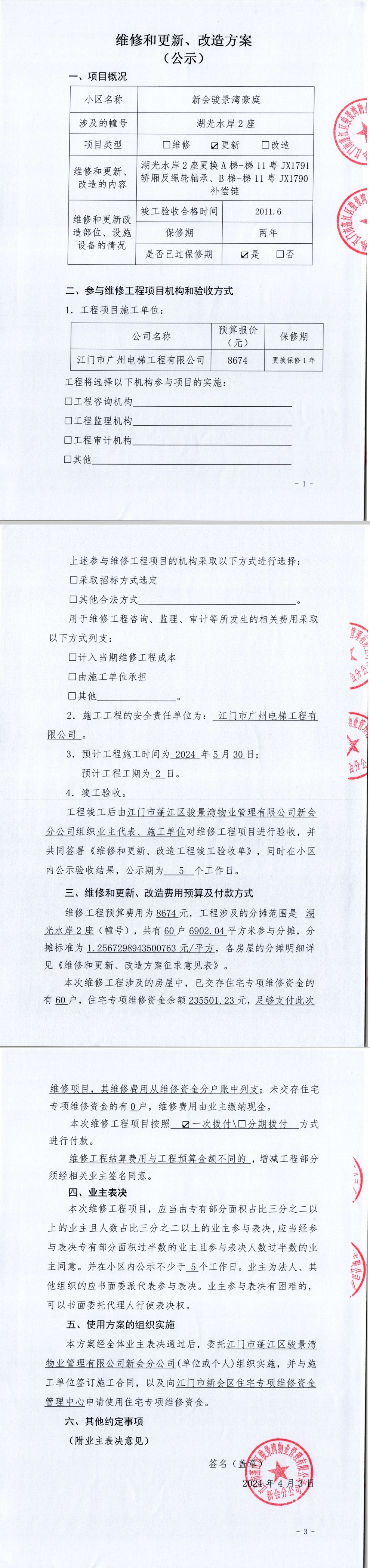 <td VALIGN="top" VALUES="" STYLE="border-width:0" BINDTYPE="0" ROWSPAN="17" COLSPAN="7" DATASOURCE="投票结果" ><font style=" font-family:方正小标宋简体;font-size:14pt;"><p style="line-height: 1.75em;"><span style="font-family: 宋体, SimSun;">各位尊敬的业主:</span><br/></p><p style="text-indent: 2em; line-height: 1.75em;"><span style="font-family: 宋体, SimSun;">根据法律法规的规定,本小区业主利用“江门市物业事项表决管理系统”已对本小区公共事务决策事项进行了表决,在经过7日的询异公示期后,未收到业主有效的异议。现将投票结果公告,并就产生的法律效力说明如下:</span></p><p style="line-height: 1.75em; text-indent: 0em;"><strong style="text-indent: 2em;"><span style="font-family: 宋体, SimSun;">一、投票范围</span></strong></p><p style="text-indent: 2em; line-height: 1.75em;"><span style="font-family: 宋体, SimSun;">新会骏景湾豪庭湖光水岸2座</span></p><p style="text-indent: 2em; line-height: 1.75em;"><span style="font-family: 宋体, SimSun;">总人数(专有部分人数之和):60</span></p><p style="text-indent: 2em; line-height: 1.75em;"><span style="font-family: 宋体, SimSun;"><span style="font-family: 宋体, SimSun; text-indent: 32px;"><span style="font-family: 宋体; text-indent: 32px;"><span style="font-family: 宋体; text-indent: 32px;">总户数:60</span></span></span></span></p><p style="text-indent: 2em; line-height: 1.75em;"><span style="font-family: 宋体, SimSun;">建筑物总面积(专有部分面积之和):6902.04㎡</span></p><p style="line-height: 1.75em;"><strong><span style="font-family: 宋体, SimSun;">二、投票结果公告时间</span></strong></p><p style="text-indent: 2em; line-height: 1.75em;"><span style="font-family: 宋体, SimSun;">从2024年05月19日开始</span></p><p style="line-height: 1.75em;"><strong><span style="font-family: 宋体, SimSun;">三、计票规则</span></strong></p><p style="text-indent: 2em; line-height: 1.75em;"><span style="font-family: 宋体, SimSun;">表决事项:使用建筑物及其附属设施的维修资金<br /><p style='font-family: 宋体, SimSun;line-height: 1.75em; text-indent: 2em;'>计票规则:弃权票不并入其它项&nbsp;&nbsp;&nbsp;&nbsp;未表决票不并入其它项</p></span></p><p style="line-height: 1.75em;"><strong><span style="font-family: 宋体, SimSun;">四、通过规则</span></strong></p><p style="line-height: 1.75em;"><strong><span style="font-family: 宋体, SimSun;">&nbsp; 根据《中华人民共和国民法典》第二百七十八条规定:业主共同决定事项,应当由专有部分面积占比三分之二以上的业主且人数占比三分之二以上的业主参与表决。</span></strong></p><p style="text-indent: 2em; line-height: 1.75em;"><span style="font-family: 宋体, SimSun;"><span style="font-family: 宋体, SimSun; text-indent: 32px;">表决事项:使用建筑物及其附属设施的维修资金<br /><p style='font-family: 宋体, SimSun;line-height: 1.75em; text-indent: 2em;'>通过规则:双2/3以上参与表决,参与表决双过半同意</p></span></span></p><p style="line-height: 1.75em;"><strong><span style="font-family: 宋体, SimSun;">五、投票结果</span></strong></p><p style="line-height: 1.75em; text-indent: 2em;"><span style="font-family: 宋体, SimSun; text-indent: 2em;"><div id='resultTable'><table style='table-layout: fixed; font-size:12px; margin-top:10px' width='100%' border='0' cellspacing='0' cellpadding='0'><tr><td height='28' colspan='10' align='center' style='border: 1px solid #666'><strong style='font-size: 14px;'> 使用建筑物及其附属设施的维修资金</strong></td> </tr><tr id='trfirst'><td height='28' colspan='4' style='border-left: 1px solid #666; border-bottom: 1px solid #666'><strong>&nbsp;申报单位:</strong> 江门市蓬江区骏景湾物业管理有限公司新会分公司</td><td colspan='3' style='border-left: 1px solid #666; border-bottom: 1px solid #666'><strong>&nbsp;联系方式:</strong> </td><td colspan='3' style='border-left: 1px solid #666; border-bottom: 1px solid #666; border-right: 1px solid #666'><strong>&nbsp;申报日期:</strong> 2024年4月9日 </td></tr><tr> <td height='28' colspan='5' style='border-left: 1px solid #666; border-bottom: 1px solid #666'><strong>&nbsp;列支总人数(专有部分人数之和):</strong>60人 </td><td colspan='5' style='border-left: 1px solid #666; border-bottom: 1px solid #666; border-right: 1px solid #666'><strong>&nbsp;列支建筑物总面积(专有部分面积之和):</strong>6902.04㎡ </td> </tr><tr><td height='28' colspan='10' bgcolor='#F3F3F3' style='border-left: 1px solid #666;border-bottom: 1px solid #666;border-right: 1px solid #666'><strong>&nbsp;参与表决人数及面积统计</strong></td></tr><tr><td height='28' colspan='5' style='border-left: 1px solid #666; border-bottom: 1px solid #666'><strong>&nbsp;参与表决人数:</strong>43人</td><td colspan='5' style='border-left: 1px solid #666; border-bottom: 1px solid #666; border-right: 1px solid #666'><strong>&nbsp;参与表决人数占总人数比例:</strong>71.67%</td></tr><tr><td height='28' colspan='5' style='border-left: 1px solid #666; border-bottom: 1px solid #666'><strong>&nbsp;参与表决面积:</strong>4915.18㎡</td><td colspan='5' style='border-left: 1px solid #666; border-bottom: 1px solid #666; border-right: 1px solid #666'><strong>&nbsp;参与表决面积占总面积比例:</strong>71.21%</td></tr><tr><td height='28' colspan='10' bgcolor='#F3F3F3' style='border-left: 1px solid #666; border-bottom: 1px solid #666;border-right: 1px solid #666'> <strong>&nbsp;参与表决同意人数及面积统计</strong></td> </tr><tr><td height='28' colspan='5' style='border-left: 1px solid #666; border-bottom: 1px solid #666'><strong>&nbsp;参与表决同意人数:</strong>43人 </td><td colspan='5' style='border-left: 1px solid #666; border-bottom: 1px solid #666; border-right: 1px soli