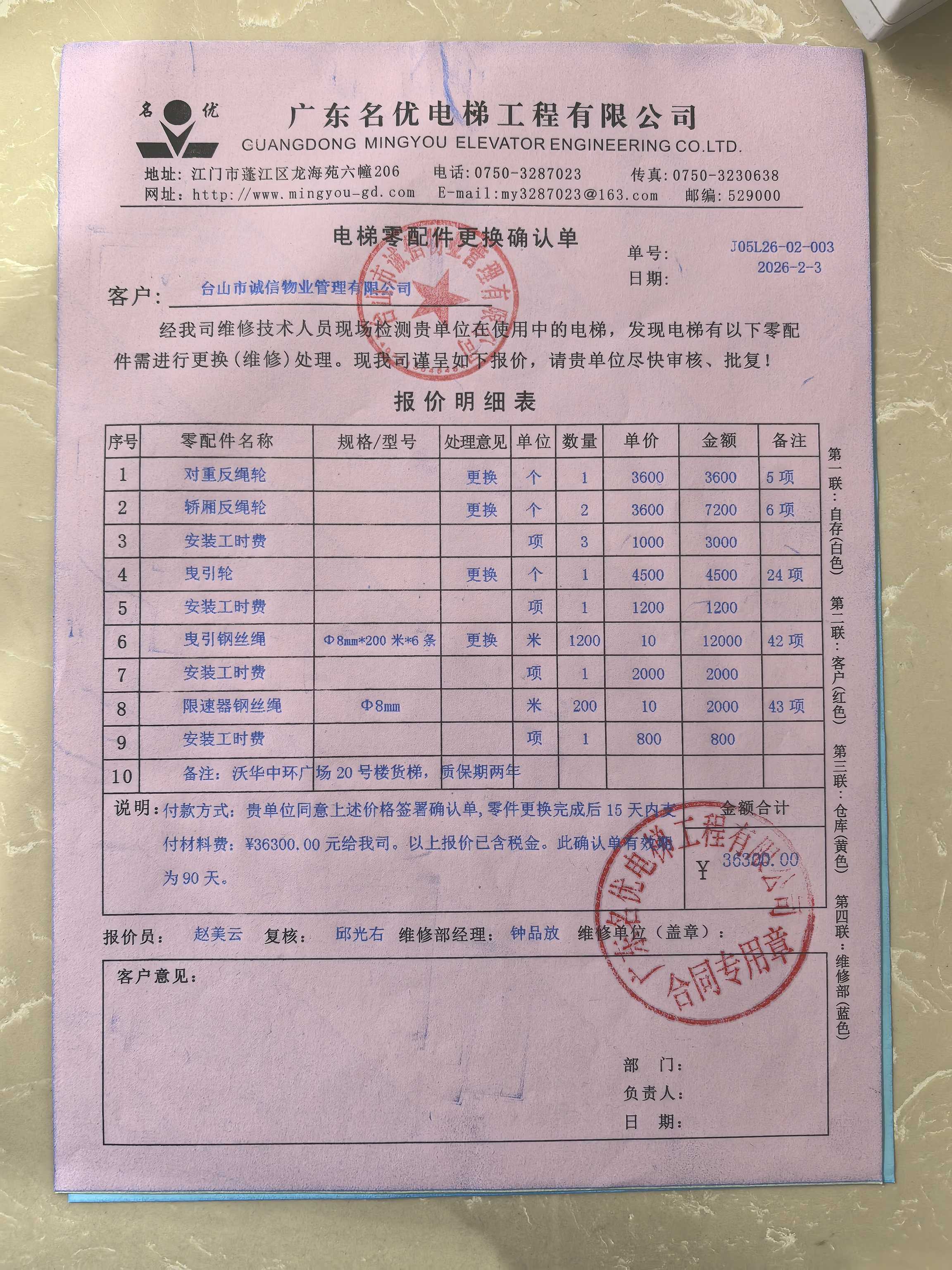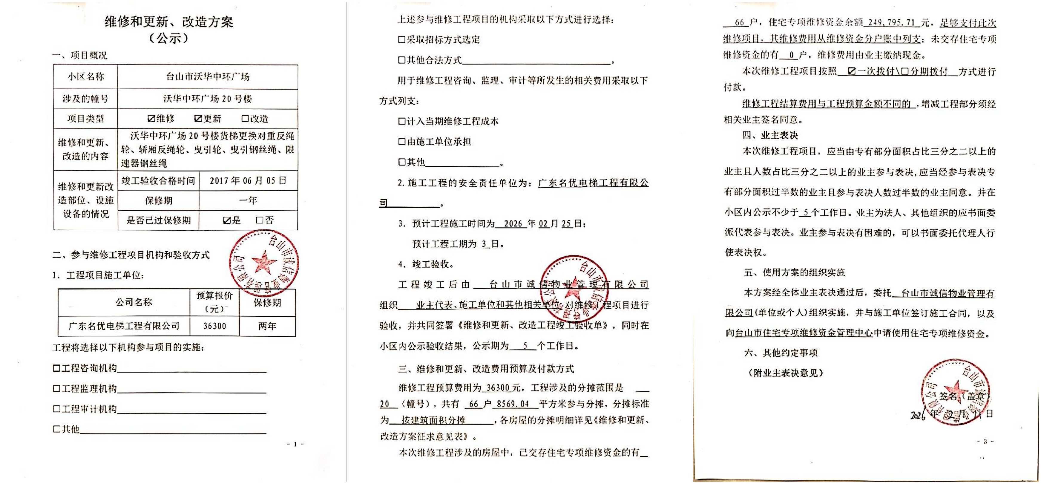 <td VALIGN="top" VALUES="" STYLE="border-width:0" BINDTYPE="0" ROWSPAN="18" COLSPAN="7" DATASOURCE="投票内容" ><font style="font-size:12pt;"><p style="text-align: left; font-family: 宋体; font-size: 16px; line-height: 1.75em;"><strong style="text-align: left; line-height: 1.75em;">一、投票范围</strong><br/></p><p style="white-space: normal; font-family: 宋体; font-size: 16px; line-height: 1.75em; text-indent: 2em;">台山沃华中环广场台山沃华中环广场20号楼</p><p style="white-space: normal; font-family: 宋体; font-size: 16px; line-height: 1.75em; text-indent: 2em;">总人数(专有部分人数之和):66</p><p style="white-space: normal; font-family: 宋体; font-size: 16px; line-height: 1.75em; text-indent: 2em;"><span style="font-family: 宋体; text-indent: 32px;">总户数:66</span></p><p style="white-space: normal; font-family: 宋体; font-size: 16px; line-height: 1.75em; text-indent: 2em;">建筑物总面积(专有部分面积之和):8569.04㎡</p><p style="white-space: normal; font-family: 宋体;font-size: 16px; line-height: 1.75em;"><strong>二、投票起止时间</strong></p><p style="white-space: normal; font-family: 宋体; line-height: 1.75em; text-indent: 2em;">投票表决时间:从2026年03月27日到2026年04月30日止</p><p style="white-space: normal; font-family: 宋体; line-height: 1.75em; text-indent: 2em;">投票补录时间:从2026年05月01日到2026年05月09日止</p><p style="white-space: normal; font-family: 宋体;font-size: 16px; line-height: 1.75em;"><strong>三、投票详细描述</strong></p><p style="white-space: normal; font-family: 宋体; font-size: 16px; line-height: 1.75em; text-indent: 2em;"><p>小区20号楼货梯进行本年度的定期检验,检验不合格,经检查,是由于货梯检查到曳引钢丝绳和限速器钢丝绳磨损老化,钢丝绳表面有明显外部磨损现象,受使用频繁程度、荷载状态等因素影响,曳引钢丝绳磨损由原8mm钢丝绳实测为7.0mm,磨损量超过10%,限速器钢丝绳磨损由原8mm钢丝绳实测为7.0mm,磨损量超过10%,已达到国家安全报废标准,存在较大的安全隐患。曳引轮、轿厢反绳轮和对重反绳轮磨损严重,部分绳槽磨损下沉超过2mm,各绳槽深浅不均匀,且每转动一圈其周长误差相应增加,存在安全隐患,已达到国家安全标准报废标准。</p><p>现对20号楼货梯进行维修,工程维修预算金额为36300元,项目最终费用以施工合同签订金额为准。因已过保修期,维修费用由相关业主按建筑面积分摊,每平方约4.24元,详见公示附件。如业主手机不能正常通过微信投票,请联系物业公司进行线下纸质投票,物业电话:0750-5555839、5555819</p></p><p style="white-space: normal; font-family: 宋体;font-size: 16px; line-height: 1.75em;"><strong>四、计票规则</strong></p><p style="white-space: normal; font-family: 宋体; font-size: 16px; line-height: 1.75em; text-indent: 2em;"><span style="font-family: 宋体; text-indent: 32px;">表决事项:使用建筑物及其附属设施的维修资金<br /><p style='text-align: left; font-family: 宋体; font-size: 16px; line-height: 1.75em; text-indent: 2em;'>计票规则:弃权票不并入其它项&nbsp;&nbsp;&nbsp;&nbsp;未表决票不并入其它项</p></span></p><p style="white-space: normal; font-family: 宋体;font-size: 16px; line-height: 1.75em;"><strong>五、通过规则</strong></p><p style="white-space: normal; font-family: 宋体;font-size: 16px; line-height: 1.75em;"><strong>&nbsp; 根据《中华人民共和国民法典》第二百七十八条规定:业主共同决定事项,应当由专有部分面积占比三分之二以上的业主且人数占比三分之二以上的业主参与表决。</strong></p><p style="white-space: normal; font-family: 宋体; font-size: 16px; line-height: 1.75em; text-indent: 2em;"><span style="font-family: 宋体; text-indent: 32px;">表决事项:使用建筑物及其附属设施的维修资金<br /><p style='text-align: left; font-family: 宋体; font-size: 16px; line-height: 1.75em; text-indent: 2em;'>通过规则:双2/3以上参与表决,参与表决双过半同意</p></span><span style="font-family: 宋体; text-indent: 32px;"></span></p><p style="text-align: left; font-family: 宋体; font-size: 16px; line-height: 1.75em;"><strong>六、投票方式</strong></p><p style="text-align: left; font-family: 宋体; font-size: 16px; line-height: 1.75em; text-indent: 2em;"><span style="font-size: 16px; font-family: 宋体">在投票事项通知公告日起,请业主扫描二维码或者关注微信公众号(<strong>江门住建</strong>)查看详细情况并进行投票。</span></p><p style="text-align: center; font-family: 宋体; font-size: 16px; line-height: 1.75em; text-indent: 2em;"><span style="font-size: 16px; font-family: 宋体"><strong style="font-family: 宋体; text-align: center; white-space: normal; line-height: 1.75em;"><img src="http://jmzjj.jiangmen.cn:8071/Areas/Custom/Content/images/jmzjybs.jpg"/></strong></span></p><p style="text-align: right; font-family: 宋体; font-size: 16px; line-height: 1.75em; text-indent: 2em;"><span style="text-align: right;">申报单位(盖章):台山市诚信物业管理有限公司</span></p><p style="text-align: right; font-family: 宋体; font-size: 16px; line-height: 1.75em;">2026年03月27日</p></font></td>