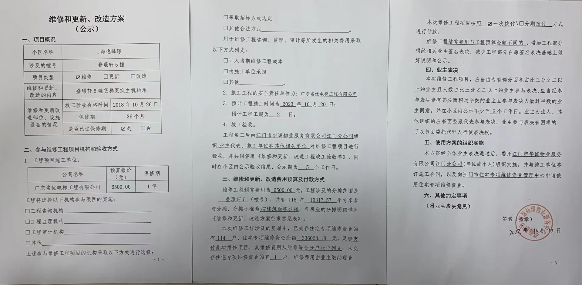 <td VALIGN="top" VALUES="" STYLE="border-width:0" BINDTYPE="0" ROWSPAN="19" COLSPAN="7" DATASOURCE="投票结果" ><font style="font-size:14pt;"><p style="white-space: normal; font-family: 宋体; line-height: 1.75em;">江门市蓬江区海逸峰璟花园蓬江区海逸峰璟花园叠璟轩5栋全体业主:</p><p style="white-space: normal; font-family: 宋体; line-height: 1.75em; text-indent: 2em;">本小区关于江门市蓬江区海逸峰璟花园关于叠璟轩5栋货梯更换主机轴承使用维修资金的投票的投票已表决结束,询异时间从2023年10月21日开始,投票询异公示期间,业主可通过微信查询自己的表决情况或可凭身份证件申请查询自己的表决情况;如公示的业主表决情况与查询的本人表决意见不一致的,可以以书面形式向投票组织机构申诉,投票组织机构予以纠正并重新公示表决结果。异议提出人对投票组织机构的处理仍有异议的,可以向街道办事处(镇人民政府)反映处理,涉及住宅专项维修资金的,可向属地住宅专项维修资金管理中心反映处理。</p><p style="white-space: normal;"><br/></p><p style="white-space: normal; font-family: 宋体; line-height: 1.75em;"><strong>附件:</strong></p><p style="white-space: normal; font-family: 宋体; line-height: 1.75em;"><strong>一、投票范围</strong></p><p style="white-space: normal; font-family: 宋体; line-height: 1.75em; text-indent: 2em;">江门市蓬江区海逸峰璟花园蓬江区海逸峰璟花园叠璟轩5栋</p><p style="white-space: normal; font-family: 宋体; line-height: 1.75em; text-indent: 2em;">总人数(专有部分人数之和):115</p><p style="white-space: normal; font-family: 宋体; line-height: 1.75em; text-indent: 2em;"><span style="font-family: 宋体, SimSun;">总户数:115</span></p><p style="white-space: normal; font-family: 宋体; line-height: 1.75em; text-indent: 2em;">建筑物总面积(专有部分面积之和):10317.57㎡</p><p style="white-space: normal; font-family: 宋体; line-height: 1.75em;"><strong>二、询异公示起止时间</strong></p><p dir="ltr" style="white-space: normal; font-family: 宋体; line-height: 1.75em; text-indent: 2em;"><span style="text-indent: 36px;">2023年10月21日至2023年10月27日</span></p><p style="white-space: normal; font-family: 宋体; line-height: 1.75em;"><strong>三、投票详细描述</strong></p><p style="white-space: normal; font-family: 宋体; line-height: 1.75em; text-indent: 2em;"><p><span style="font-family: 宋体;letter-spacing: 0;font-size: 19px"><span style="font-family:宋体">本小区叠璟轩</span><span style="font-family:宋体">5栋货梯运行时噪音大,经排查确定是主机轴承损坏导致噪音,现电梯无法正常使用,需要尽快更换主机轴承。由于5栋货梯已过保修期。现需申请使用维修资金对5栋货梯主机轴承进行更换,更换金额为:6500.00元,项目最终费用以报价合同签订金额为准。5栋货梯更换主机轴承的费用分摊标准为按建筑面积分摊,每平方约:0.6299元,详见公示附件。如业主手机不能正常通过微信投票,请联系物业公司进行线下纸质投票,物业电话:0750-3985778。</span></span></p><p><br/></p></p><p style="white-space: normal; font-family: 宋体; line-height: 1.75em;"><strong>四、计票规则</strong></p><p style="white-space: normal; font-family: 宋体; line-height: 1.75em; text-indent: 2em;">表决事项:使用建筑物及其附属设施的维修资金<br /><p style='text-align: left; font-family: 宋体; font-size: 16px; line-height: 1.75em; text-indent: 2em;'>计票规则:弃权票不并入其它项 未表决票不并入其它项</p></p><p style="white-space: normal; font-family: 宋体; line-height: 1.75em;"><strong>五、通过规则</strong></p><p style="white-space: normal; font-family: 宋体; line-height: 1.75em;"><strong><strong style="white-space: normal;"><span style="font-family: 宋体, SimSun;">&nbsp; 根据《中华人民共和国民法典》第二百七十八条规定:业主共同决定事项,应当由专有部分面积占比三分之二以上的业主且人数占比三分之二以上的业主参与表决。</span></strong></strong></p><p style="white-space: normal; font-family: 宋体; line-height: 1.75em; text-indent: 2em;">表决事项:使用建筑物及其附属设施的维修资金<br /><p style='text-align: left; font-family: 宋体; font-size: 16px; line-height: 1.75em; text-indent: 2em;'>通过规则:参与表决专有部分面积过半数的业主且参与表决人数过半数的业主同意</p></p><p style="white-space: normal; font-family: 宋体; line-height: 1.75em;"><strong>六、投票结果</strong></p><p style="white-space: normal; font-family: 宋体; line-height: 1.75em; text-indent: 2em;"><div id='resultTable'><table style='table-layout: fixed; font-size:12px; margin-top:10px' width='100%' border='0' cellspacing='0' cellpadding='0'><tr><td height='28' colspan='10' align='center' style='border: 1px solid #666'><strong style='font-size: 14px;'> 使用建筑物及其附属设施的维修资金</strong></td> </tr><tr id='trfirst'><td height='28' colspan='4' style='border-left: 1px solid #666; border-bottom: 1px solid #666'><strong> 申报单位:</strong> 江门市华诚物业服务有限公司江门分公司</td><td colspan='3' style='border-left: 1px solid #666; border-bottom: 1px solid #666'><strong> 联系方式:</strong> 0750-3553888 </td><td colspan='3' style='border-left: 1px solid #666; border-bottom: 1px solid #666; border-right: 1px solid #666'><strong> 申报日期:</strong> 2023年10月10日 </td></tr><tr> <td height='28' colspan='5' style='border-left: 1px solid #666; border-bottom: 1px solid #666'><strong> 总人数(专有部分人数之和):</strong>115人 </td><td colspan='5' style='border-left: 1px solid #666; border-bottom: 1px solid #666; border-right: 1px solid #666'><strong> 建筑物总面积(专有部分面积之和):</s