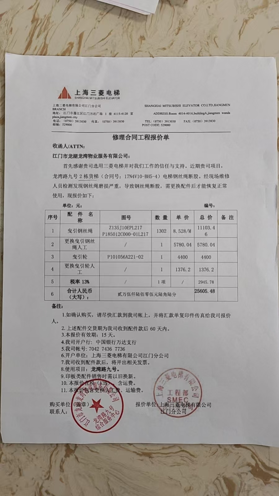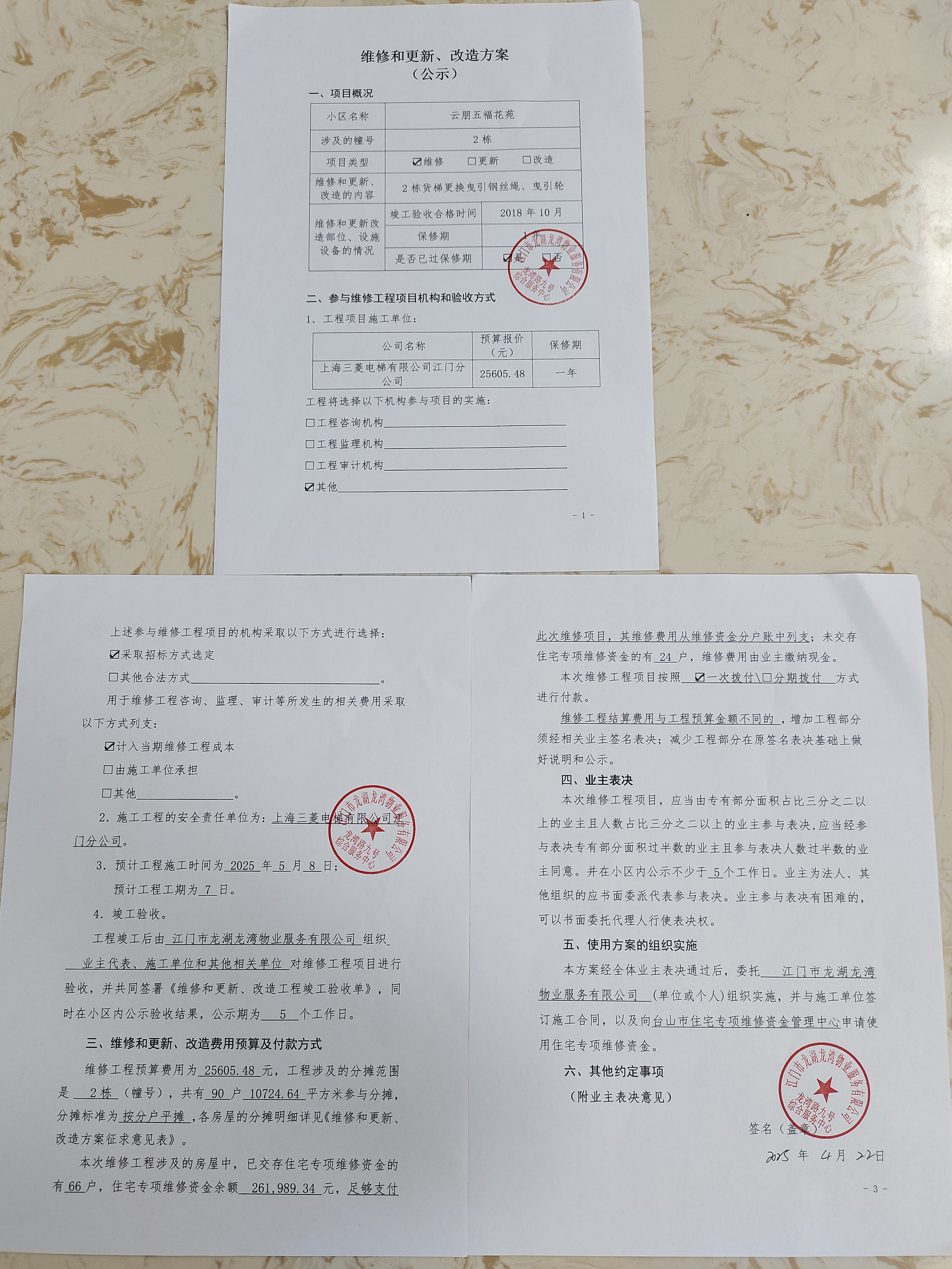 <td VALIGN="top" VALUES="" STYLE="border-width:0" BINDTYPE="0" ROWSPAN="19" COLSPAN="7" DATASOURCE="投票结果" ><font style="font-size:14pt;"><p style="white-space: normal; font-family: 宋体; line-height: 1.75em;">云朋五福花苑2幢全体业主:</p><p style="white-space: normal; font-family: 宋体; line-height: 1.75em; text-indent: 2em;">本小区关于云朋五福花苑2栋货梯更换曳引钢丝绳、曳引轮的使用维修资金投票的投票已表决结束,询异时间从2025年05月23日开始,投票询异公示期间,业主可通过微信查询自己的表决情况或可凭身份证件申请查询自己的表决情况;如公示的业主表决情况与查询的本人表决意见不一致的,可以以书面形式向投票组织机构申诉,投票组织机构予以纠正并重新公示表决结果。异议提出人对投票组织机构的处理仍有异议的,可以向街道办事处(镇人民政府)反映处理,涉及住宅专项维修资金的,可向属地住宅专项维修资金管理中心反映处理。</p><p style="white-space: normal;"><br/></p><p style="white-space: normal; font-family: 宋体; line-height: 1.75em;"><strong>附件:</strong></p><p style="white-space: normal; font-family: 宋体; line-height: 1.75em;"><strong>一、投票范围</strong></p><p style="white-space: normal; font-family: 宋体; line-height: 1.75em; text-indent: 2em;">云朋五福花苑2幢</p><p style="white-space: normal; font-family: 宋体; line-height: 1.75em; text-indent: 2em;">总人数(专有部分人数之和):89</p><p style="white-space: normal; font-family: 宋体; line-height: 1.75em; text-indent: 2em;"><span style="font-family: 宋体, SimSun;"><span style="font-family: 宋体; text-indent: 32px;"><span style="font-family: 宋体; text-indent: 32px;">总户数:90</span></span></span></p><p style="white-space: normal; font-family: 宋体; line-height: 1.75em; text-indent: 2em;">建筑物总面积(专有部分面积之和):10724.64㎡</p><p style="white-space: normal; font-family: 宋体; line-height: 1.75em;"><strong>二、询异公示起止时间</strong></p><p dir="ltr" style="white-space: normal; font-family: 宋体; line-height: 1.75em; text-indent: 2em;"><span style="text-indent: 36px;">2025年05月23日至2025年06月02日</span></p><p style="white-space: normal; font-family: 宋体; line-height: 1.75em;"><strong>三、投票详细描述</strong></p><p style="white-space: normal; font-family: 宋体; line-height: 1.75em; text-indent: 2em;"><p>经维修人员轿顶检修检查, 发现下行至1层~负1层之间,左侧第一根钢丝绳存在断股,经核实现场电梯于2018年投入使用,钢丝绳及曳引轮出现不规则磨损,存在使用安全隐患,需更换后才能恢复正常使用。<br/></p></p><p style="white-space: normal; font-family: 宋体; line-height: 1.75em;"><strong>四、计票规则</strong></p><p style="white-space: normal; font-family: 宋体; line-height: 1.75em; text-indent: 2em;">表决事项:使用建筑物及其附属设施的维修资金<br /><p style='text-align: left; font-family: 宋体; font-size: 16px; line-height: 1.75em; text-indent: 2em;'>计票规则:弃权票不并入其它项 未表决票不并入其它项</p></p><p style="white-space: normal; font-family: 宋体; line-height: 1.75em;"><strong>五、通过规则</strong></p><p style="white-space: normal; font-family: 宋体; line-height: 1.75em;"><strong><strong style="white-space: normal;"><span style="font-family: 宋体, SimSun;"> 根据《中华人民共和国民法典》第二百七十八条规定:业主共同决定事项,应当由专有部分面积占比三分之二以上的业主且人数占比三分之二以上的业主参与表决。</span></strong></strong></p><p style="white-space: normal; font-family: 宋体; line-height: 1.75em; text-indent: 2em;">表决事项:使用建筑物及其附属设施的维修资金<br /><p style='text-align: left; font-family: 宋体; font-size: 16px; line-height: 1.75em; text-indent: 2em;'>通过规则:双2/3以上参与表决,参与表决双过半同意</p></p><p style="white-space: normal; font-family: 宋体; line-height: 1.75em;"><strong>六、投票结果</strong></p><p style="white-space: normal; font-family: 宋体; line-height: 1.75em; text-indent: 2em;"><div id='resultTable'><table style='table-layout: fixed; font-size:12px; margin-top:10px' width='100%' border='0' cellspacing='0' cellpadding='0'><tr><td height='28' colspan='10' align='center' style='border: 1px solid #666'><strong style='font-size: 14px;'> 使用建筑物及其附属设施的维修资金</strong></td> </tr><tr id='trfirst'><td height='28' colspan='4' style='border-left: 1px solid #666; border-bottom: 1px solid #666'><strong> 申报单位:</strong> 台山市云朋物业管理有限公司</td><td colspan='3' style='border-left: 1px solid #666; border-bottom: 1px solid #666'><strong> 联系方式:</strong> 13928849532 </td><td colspan='3' style='border-left: 1px solid #666; border-bottom: 1px solid #666; border-right: 1px solid #666'><strong> 申报日期:</strong> 2025年4月21日 </td></tr><tr> <td height='28' colspan='5' style='border-left: 1px solid #666; border-bottom: 1px solid #666'><strong> 总人数(专有部分人数之和):</strong>89人 </td><td colspan='5' style='border-left: 1px solid #666; border-bottom: 1px solid #666; border-right: 1px solid #666'><strong> 建筑物总面积(专有部分面积之和):</strong>10724.64㎡ </td> </tr><tr><td height='28' colspan='10' bgcolor='#F3F3F3' style='border-left: 1px solid #666;border-bottom: 1px solid #666;border-right: 1px solid #666'><strong> 参与人数及面积统计</strong></td></tr><tr><td height='28' colspan='5' style='border-left: 1px solid #666; border-bottom: 1px solid #666'><strong> 参与表决专有部分人数之和:</strong>66人</td><td colspan='5' style='border-left: 1px solid #666; border-bottom: 1px solid #666; border-right: 1px solid #666'><strong> 参与表决占有表决权总人数