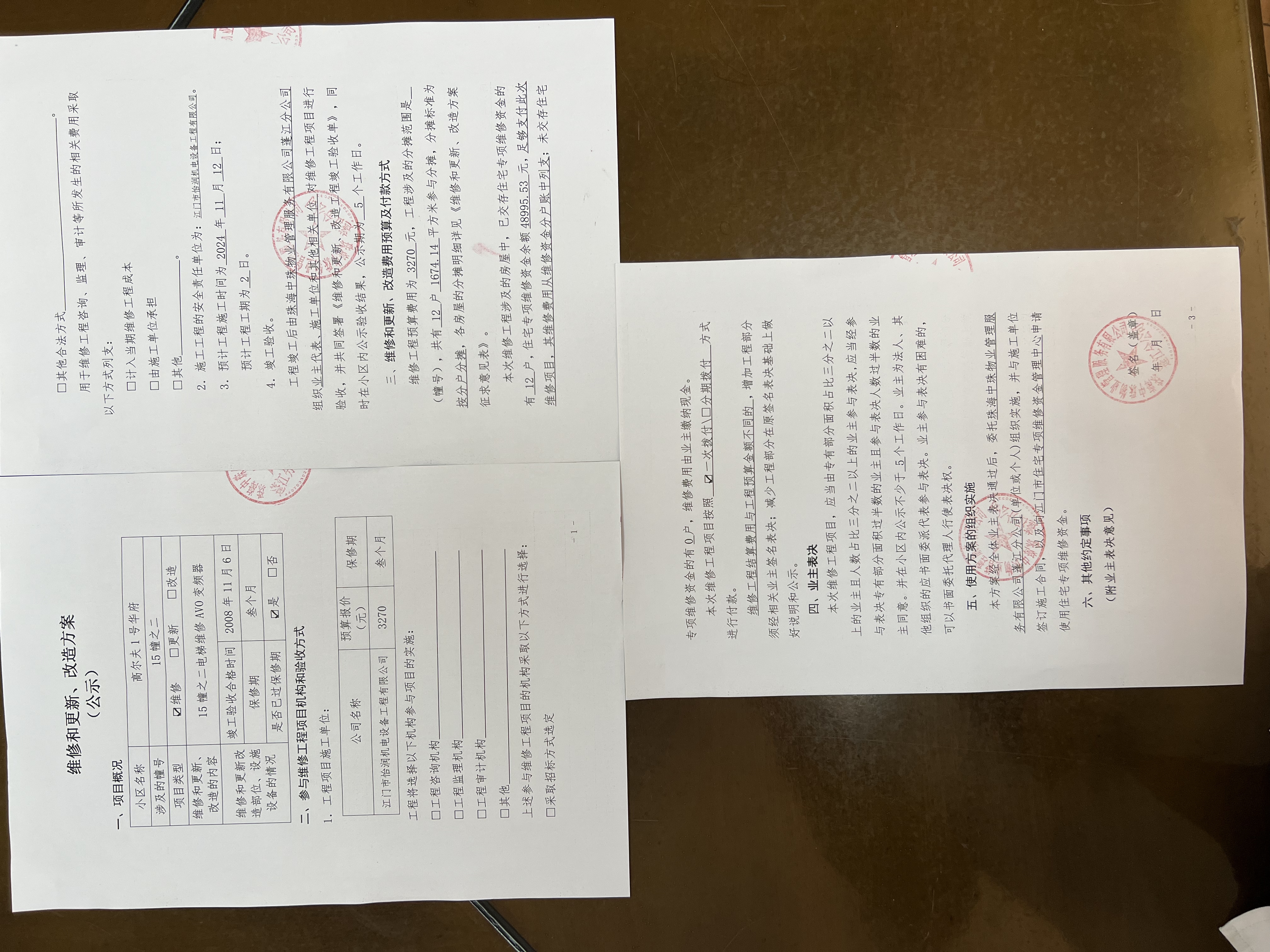 <td VALIGN="top" VALUES="" STYLE="border-width:0" BINDTYPE="0" ROWSPAN="19" COLSPAN="7" DATASOURCE="投票结果" ><font style="font-size:14pt;"><p style="white-space: normal; font-family: 宋体; line-height: 1.75em;">高尔夫1号华府蓬江区绿茵豪苑高尔夫1号华府15幢之二全体业主:</p><p style="white-space: normal; font-family: 宋体; line-height: 1.75em; text-indent: 2em;">本小区关于高尔夫1号华府15幢之二电梯维修AVO变频器的投票的投票已表决结束,询异时间从2024年11月13日开始,投票询异公示期间,业主可通过微信查询自己的表决情况或可凭身份证件申请查询自己的表决情况;如公示的业主表决情况与查询的本人表决意见不一致的,可以以书面形式向投票组织机构申诉,投票组织机构予以纠正并重新公示表决结果。异议提出人对投票组织机构的处理仍有异议的,可以向街道办事处(镇人民政府)反映处理,涉及住宅专项维修资金的,可向属地住宅专项维修资金管理中心反映处理。</p><p style="white-space: normal;"><br/></p><p style="white-space: normal; font-family: 宋体; line-height: 1.75em;"><strong>附件:</strong></p><p style="white-space: normal; font-family: 宋体; line-height: 1.75em;"><strong>一、投票范围</strong></p><p style="white-space: normal; font-family: 宋体; line-height: 1.75em; text-indent: 2em;">高尔夫1号华府蓬江区绿茵豪苑高尔夫1号华府15幢之二</p><p style="white-space: normal; font-family: 宋体; line-height: 1.75em; text-indent: 2em;">总人数(专有部分人数之和):12</p><p style="white-space: normal; font-family: 宋体; line-height: 1.75em; text-indent: 2em;"><span style="font-family: 宋体, SimSun;"><span style="font-family: 宋体; text-indent: 32px;"><span style="font-family: 宋体; text-indent: 32px;">总户数:12</span></span></span></p><p style="white-space: normal; font-family: 宋体; line-height: 1.75em; text-indent: 2em;">建筑物总面积(专有部分面积之和):1674.14㎡</p><p style="white-space: normal; font-family: 宋体; line-height: 1.75em;"><strong>二、询异公示起止时间</strong></p><p dir="ltr" style="white-space: normal; font-family: 宋体; line-height: 1.75em; text-indent: 2em;"><span style="text-indent: 36px;">2024年11月13日至2024年11月23日</span></p><p style="white-space: normal; font-family: 宋体; line-height: 1.75em;"><strong>三、投票详细描述</strong></p><p style="white-space: normal; font-family: 宋体; line-height: 1.75em; text-indent: 2em;"><p><span style="font-family: "Helvetica Neue", Helvetica, Arial, sans-serif; font-size: 14px; text-wrap: wrap; background-color: rgb(255, 255, 255);">高尔夫1号华府小区15幢之二的电梯日常运行时出现异常,导致停止运行,经检查,是由于电梯AVO变频器故障不能运行,因使用时间较长,电路板电子原件出现老化而不能正常运行。</span><br style="font-family: "Helvetica Neue", Helvetica, Arial, sans-serif; font-size: 14px; text-wrap: wrap; background-color: rgb(255, 255, 255);"/><span style="font-family: "Helvetica Neue", Helvetica, Arial, sans-serif; font-size: 14px; text-wrap: wrap; background-color: rgb(255, 255, 255);"> 现对15幢之二的电梯进行维修,工程维修预算金额为3270元,项目最终费用以施工合同签订金额为准。因已过保修期,维修费用由相关业主按分户分摊,每户为272.5元,详见公示附件。如业主手机不能正常通过微信投票,请联系物业公司进行线下纸质投票,物业电话:0750-3068388。</span></p></p><p style="white-space: normal; font-family: 宋体; line-height: 1.75em;"><strong>四、计票规则</strong></p><p style="white-space: normal; font-family: 宋体; line-height: 1.75em; text-indent: 2em;">表决事项:使用建筑物及其附属设施的维修资金<br /><p style='text-align: left; font-family: 宋体; font-size: 16px; line-height: 1.75em; text-indent: 2em;'>计票规则:弃权票不并入其它项 未表决票不并入其它项</p></p><p style="white-space: normal; font-family: 宋体; line-height: 1.75em;"><strong>五、通过规则</strong></p><p style="white-space: normal; font-family: 宋体; line-height: 1.75em;"><strong><strong style="white-space: normal;"><span style="font-family: 宋体, SimSun;"> 根据《中华人民共和国民法典》第二百七十八条规定:业主共同决定事项,应当由专有部分面积占比三分之二以上的业主且人数占比三分之二以上的业主参与表决。</span></strong></strong></p><p style="white-space: normal; font-family: 宋体; line-height: 1.75em; text-indent: 2em;">表决事项:使用建筑物及其附属设施的维修资金<br /><p style='text-align: left; font-family: 宋体; font-size: 16px; line-height: 1.75em; text-indent: 2em;'>通过规则:双2/3以上参与表决,参与表决双过半同意</p></p><p style="white-space: normal; font-family: 宋体; line-height: 1.75em;"><strong>六、投票结果</strong></p><p style="white-space: normal; font-family: 宋体; line-height: 1.75em; text-indent: 2em;"><div id='resultTable'><table style='table-layout: fixed; font-size:12px; margin-top:10px' width='100%' border='0' cellspacing='0' cellpadding='0'><tr><td height='28' colspan='10' align='center' style='border: 1px solid #666'><strong style='font-size: 14px;'> 使用建筑物及其附属设施的维修资金</strong></td> </tr><tr id='trfirst'><td height='28' colspan='4' style='border-left: 1px solid #666; border-bottom: 1px solid #666'><strong> 申报单位:</strong> 珠海中珠物业管理服务有限公司蓬江分公司</td><td colspan='3' style='border-left: 1px solid #666; border-bottom: 1px solid #666'><strong> 联系方式:</strong> </td><td colspan='3' style='border-left: 1px solid #666; border-bottom: 1px solid #666; border-right: 1px solid #666'><strong> 申报日期:</strong> 2024年11月7日 </td></tr><tr> <td height='28' colspan='5' style='bord