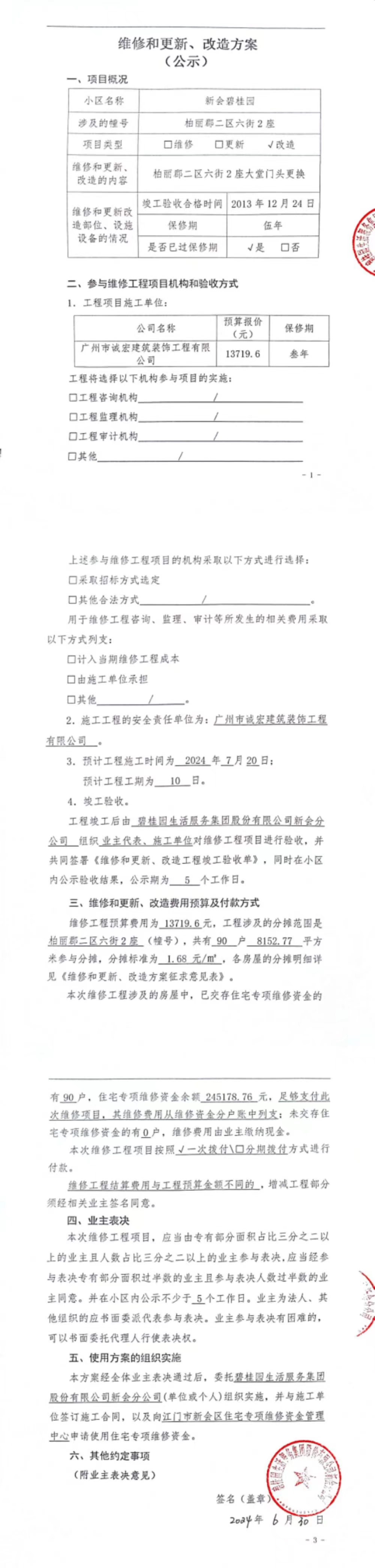 <td VALIGN="top" VALUES="" STYLE="border-width:0" BINDTYPE="0" ROWSPAN="17" COLSPAN="7" DATASOURCE="投票结果" ><font style=" font-family:方正小标宋简体;font-size:14pt;"><p style="line-height: 1.75em;"><span style="font-family: 宋体, SimSun;">各位尊敬的业主:</span><br/></p><p style="text-indent: 2em; line-height: 1.75em;"><span style="font-family: 宋体, SimSun;">根据法律法规的规定,本小区业主利用“江门市物业事项表决管理系统”已对本小区公共事务决策事项进行了表决,在经过7日的询异公示期后,未收到业主有效的异议。现将投票结果公告,并就产生的法律效力说明如下:</span></p><p style="line-height: 1.75em; text-indent: 0em;"><strong style="text-indent: 2em;"><span style="font-family: 宋体, SimSun;">一、投票范围</span></strong></p><p style="text-indent: 2em; line-height: 1.75em;"><span style="font-family: 宋体, SimSun;">新会碧桂园柏丽郡二区六街2座</span></p><p style="text-indent: 2em; line-height: 1.75em;"><span style="font-family: 宋体, SimSun;">总人数(专有部分人数之和):87</span></p><p style="text-indent: 2em; line-height: 1.75em;"><span style="font-family: 宋体, SimSun;"><span style="font-family: 宋体, SimSun; text-indent: 32px;"><span style="font-family: 宋体; text-indent: 32px;"><span style="font-family: 宋体; text-indent: 32px;">总户数:90</span></span></span></span></p><p style="text-indent: 2em; line-height: 1.75em;"><span style="font-family: 宋体, SimSun;">建筑物总面积(专有部分面积之和):8152.77㎡</span></p><p style="line-height: 1.75em;"><strong><span style="font-family: 宋体, SimSun;">二、投票结果公告时间</span></strong></p><p style="text-indent: 2em; line-height: 1.75em;"><span style="font-family: 宋体, SimSun;"><span style="font-family: 宋体, SimSun; text-indent: 32px;">从2024年08月03日开始</span></span></p><p style="line-height: 1.75em;"><strong><span style="font-family: 宋体, SimSun;">三、计票规则</span></strong></p><p style="text-indent: 2em; line-height: 1.75em;"><span style="font-family: 宋体, SimSun;">表决事项:使用建筑物及其附属设施的维修资金<br /><p style='font-family: 宋体, SimSun;line-height: 1.75em; text-indent: 2em;'>计票规则:弃权票不并入其它项&nbsp;&nbsp;&nbsp;&nbsp;未表决票不并入其它项</p></span></p><p style="line-height: 1.75em;"><strong><span style="font-family: 宋体, SimSun;">四、通过规则</span></strong></p><p style="line-height: 1.75em;"><strong><span style="font-family: 宋体, SimSun;">&nbsp; 根据《中华人民共和国民法典》第二百七十八条规定:业主共同决定事项,应当由专有部分面积占比三分之二以上的业主且人数占比三分之二以上的业主参与表决。</span></strong></p><p style="text-indent: 2em; line-height: 1.75em;"><span style="font-family: 宋体, SimSun;"><span style="font-family: 宋体, SimSun; text-indent: 32px;">表决事项:使用建筑物及其附属设施的维修资金<br /><p style='font-family: 宋体, SimSun;line-height: 1.75em; text-indent: 2em;'>通过规则:双2/3以上参与表决,参与表决双过半同意</p></span></span></p><p style="line-height: 1.75em;"><strong><span style="font-family: 宋体, SimSun;">五、投票结果</span></strong></p><p style="line-height: 1.75em; text-indent: 2em;"><span style="font-family: 宋体, SimSun; text-indent: 2em;"><div id='resultTable'><table style='table-layout: fixed; font-size:12px; margin-top:10px' width='100%' border='0' cellspacing='0' cellpadding='0'><tr><td height='28' colspan='10' align='center' style='border: 1px solid #666'><strong style='font-size: 14px;'> 使用建筑物及其附属设施的维修资金</strong></td> </tr><tr id='trfirst'><td height='28' colspan='4' style='border-left: 1px solid #666; border-bottom: 1px solid #666'><strong>&nbsp;申报单位:</strong> 碧桂园生活服务集团股份有限公司新会分公司</td><td colspan='3' style='border-left: 1px solid #666; border-bottom: 1px solid #666'><strong>&nbsp;联系方式:</strong> </td><td colspan='3' style='border-left: 1px solid #666; border-bottom: 1px solid #666; border-right: 1px solid #666'><strong>&nbsp;申报日期:</strong> 2024年7月1日 </td></tr><tr> <td height='28' colspan='5' style='border-left: 1px solid #666; border-bottom: 1px solid #666'><strong>&nbsp;总人数(专有部分人数之和):</strong>87人 </td><td colspan='5' style='border-left: 1px solid #666; border-bottom: 1px solid #666; border-right: 1px solid #666'><strong>&nbsp;建筑物总面积(专有部分面积之和):</strong>8152.77㎡ </td> </tr><tr><td height='28' colspan='10' bgcolor='#F3F3F3' style='border-left: 1px solid #666;border-bottom: 1px solid #666;border-right: 1px solid #666'><strong>&nbsp;参与表决人数及面积统计</strong></td></tr><tr><td height='28' colspan='5' style='border-left: 1px solid #666; border-bottom: 1px solid #666'><strong>&nbsp;参与表决人数:</strong>61人</td><td colspan='5' style='border-left: 1px solid #666; border-bottom: 1px solid #666; border-right: 1px solid #666'><strong>&nbsp;参与表决人数占总人数比例:</strong>70.11%</td></tr><tr><td height='28' colspan='5' style='border-left: 1px solid #666; border-bottom: 1px solid #666'><strong>&nbsp;参与表决面积:</strong>5794.85㎡</td><td colspan='5' style='border-left: 1px solid #666; border-bottom: 1px solid #666; border-right: 1px solid #666'><strong>&nbsp;参与表决面积占总面积比例:</strong>71.08%</td></tr><tr><td height='28' colspan='10' bgcolor='#F3F3F3' style='border-left: 1px solid #666; border-bottom: 1px solid #666;border-right: 1px solid #666'> <strong>&nbsp;参与表决同意人数及面积统计</strong></td> </tr><tr><td height='28' colspan='5' style='border-left: 1px solid #666; border-bottom: 1px solid #666'><strong>&nbsp;参与表决同意人数:</strong>59人 </td><td colspan='5' style='border-left: 1px solid #666;