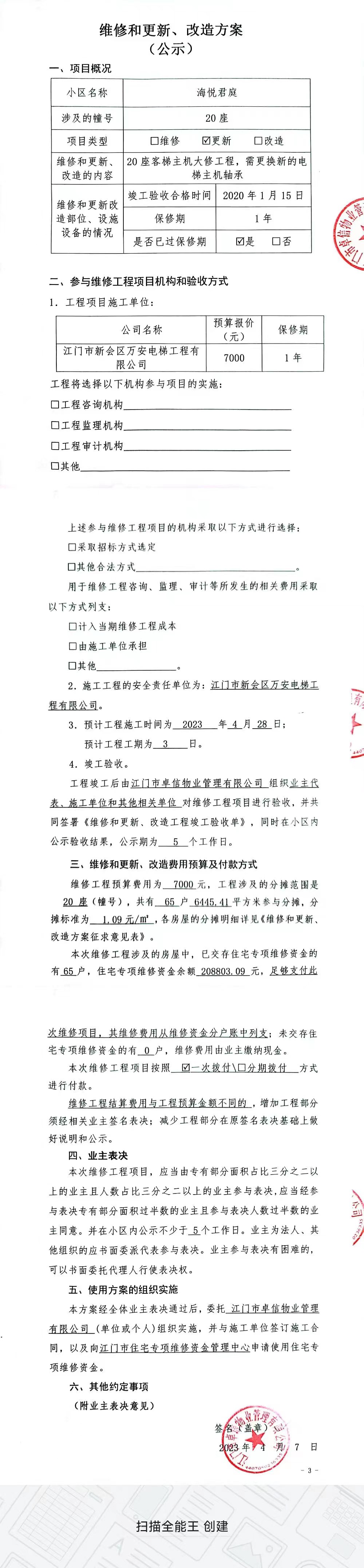 <td valign="top" values="" style="border-width:0" bindtype="0" rowspan="17" colspan="7" datasource="投票结果"><font style=" font-family:方正小标宋简体;font-size:14pt;"><p style="line-height: 1.75em;"><span style="font-family: 宋体, SimSun;">各位尊敬的业主:</span><br></p><p style="text-indent: 2em; line-height: 1.75em;"><span style="font-family: 宋体, SimSun;">根据法律法规的规定,本小区业主利用“物业公共事务决策系统”已对本小区公共事务决策事项进行了表决,在经过7日的询异公示期后,未收到业主有效的异议。现将投票结果公告,并就产生的法律效力说明如下:</span></p><p style="line-height: 1.75em; text-indent: 0em;"><strong style="text-indent: 2em;"><span style="font-family: 宋体, SimSun;">一、投票范围</span></strong></p><p style="text-indent: 2em; line-height: 1.75em;"><span style="font-family: 宋体, SimSun;">海悦君庭20座</span></p><p style="text-indent: 2em; line-height: 1.75em;"><span style="font-family: 宋体, SimSun;">总人数(专有部分人数之和):65</span></p><p style="text-indent: 2em; line-height: 1.75em;"><span style="font-family: 宋体, SimSun;"><span style="font-family: 宋体, SimSun; text-indent: 32px;">总户数:65</span></span></p><p style="text-indent: 2em; line-height: 1.75em;"><span style="font-family: 宋体, SimSun;">建筑物总面积(专有部分面积之和):6445.41㎡</span></p><p style="line-height: 1.75em;"><strong><span style="font-family: 宋体, SimSun;">二、投票起止时间</span></strong></p><p style="text-indent: 2em; line-height: 1.75em;"><span style="font-family: 宋体, SimSun;">投票表决时间:从2023年04月07日到2023年04月10日止</span></p><p style="text-indent: 2em; line-height: 1.75em;"><span style="font-family: 宋体, SimSun;">投票询异公示时间:从2023年04月11日开始</span></p><p style="text-indent: 2em; line-height: 1.75em;"><span style="font-family: 宋体, SimSun;">投票结果通知公告时间:从2023年04月18日开始</span></p><p style="line-height: 1.75em;"><strong><span style="font-family: 宋体, SimSun;">三、计票规则</span></strong></p><p style="text-indent: 2em; line-height: 1.75em;"><span style="font-family: 宋体, SimSun;">表决事项:使用建筑物及其附属设施的维修资金<br></span></p><p style="font-family: 宋体, SimSun;line-height: 1.75em; text-indent: 2em;">计票规则:弃权票不并入其它项 未表决票不并入其它项</p><p></p><p style="line-height: 1.75em;"><strong><span style="font-family: 宋体, SimSun;">四、通过规则</span></strong></p><p style="text-indent: 2em; line-height: 1.75em;"><span style="font-family: 宋体, SimSun;"><span style="font-family: 宋体, SimSun; text-indent: 32px;">表决事项:使用建筑物及其附属设施的维修资金<br></span></span></p><p style="font-family: 宋体, SimSun;line-height: 1.75em; text-indent: 2em;">通过规则:参与表决专有部分面积过半数的业主且参与表决人数过半数的业主同意</p><p></p><p style="line-height: 1.75em;"><strong><span style="font-family: 宋体, SimSun;">五、投票结果</span></strong></p><p style="line-height: 1.75em; text-indent: 2em;"><span style="font-family: 宋体, SimSun; text-indent: 2em;"></span></p><div id="resultTable"><table style="table-layout: fixed; font-size:12px; margin-top:10px" width="100%" border="0" cellspacing="0" cellpadding="0"><tbody><tr><td height="28" colspan="10" align="center" style="border: 1px solid #666"><strong style="font-size: 14px;"> 使用建筑物及其附属设施的维修资金</strong></td> </tr><tr id="trfirst"><td height="28" colspan="4" style="border-left: 1px solid #666; border-bottom: 1px solid #666"><strong> 申报单位:</strong> 江门市卓信物业管理有限公司</td><td colspan="3" style="border-left: 1px solid #666; border-bottom: 1px solid #666"><strong> 联系方式:</strong> 7506170181 </td><td colspan="3" style="border-left: 1px solid #666; border-bottom: 1px solid #666; border-right: 1px solid #666"><strong> 申报日期:</strong> 2023年4月6日 </td></tr><tr> <td height="28" colspan="5" style="border-left: 1px solid #666; border-bottom: 1px solid #666"><strong> 总人数(专有部分人数之和):</strong>65人 </td><td colspan="5" style="border-left: 1px solid #666; border-bottom: 1px solid #666; border-right: 1px solid #666"><strong> 建筑物总面积(专有部分面积之和):</strong>6445.41㎡ </td> </tr><tr><td height="28" colspan="10" bgcolor="#F3F3F3" style="border-left: 1px solid #666;border-bottom: 1px solid #666;border-right: 1px solid #666"><strong> 参与人数及面积统计</strong></td></tr><tr><td height="28" colspan="5" style="border-left: 1px solid #666; border-bottom: 1px solid #666"><strong> 参与表决专有部分人数之和:</strong>49人</td><td colspan="5" style="border-left: 1px solid #666; border-bottom: 1px solid #666; border-right: 1px solid #666"><strong> 参与表决占有表决权总人数比例:</strong>75.38%</td></tr><tr><td height="28" colspan="5" style="border-left: 1px solid #666; border-bottom: 1px solid #666"><strong> 参与表决专有部分面积之和:</strong>4894.98㎡</td><td colspan="5" style="border-left: 1px solid #666; border-bottom: 1px solid #666; border-right: 1px solid #666"><strong> 参与表决占有表决权总面积比例:</strong>75.95%</td></tr><tr><td height="28" colspan="10" bgcolor="#F3F3F3" style="border-left: 1px solid #666; border-bottom: 1px solid #666;border-right: 1px solid #666"> <strong> 未参与人数及面积统计</strong></td> </tr><tr><td height="28" colspan="5" style="border-left: 1px solid #666; border-bottom: 1px solid #666"><strong> 未参与表决专有部分人数之和:</strong>16人 </td><td colspan="5" style="border-left: 1px solid #666; border-bottom: 1px solid #666; border-right: 1px solid #666"><strong> 未参与表决占有表决权总人数比例:</strong>24.62%</td></tr><tr><td height="28" colspan="5" sty