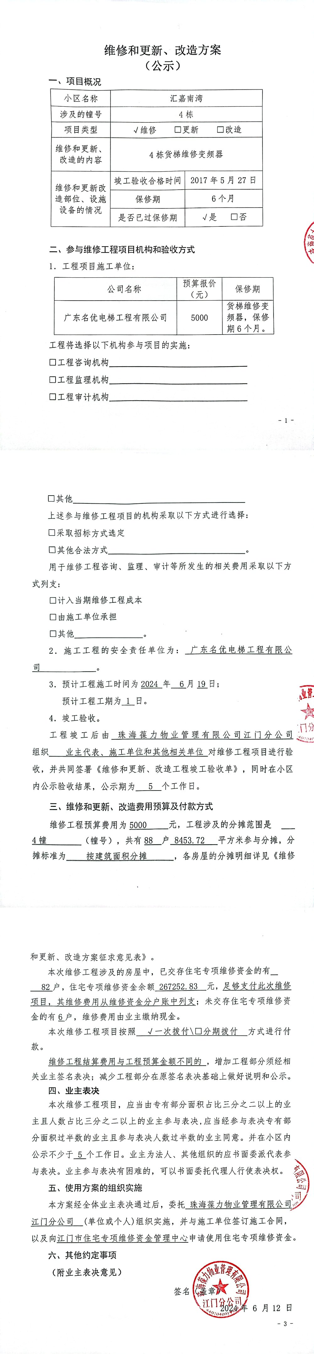 <td VALIGN="top" VALUES="" STYLE="border-width:0" BINDTYPE="0" ROWSPAN="17" COLSPAN="7" DATASOURCE="投票结果" ><font style=" font-family:方正小标宋简体;font-size:14pt;"><p style="line-height: 1.75em;"><span style="font-family: 宋体, SimSun;">各位尊敬的业主:</span><br/></p><p style="text-indent: 2em; line-height: 1.75em;"><span style="font-family: 宋体, SimSun;">根据法律法规的规定,本小区业主利用“江门市物业事项表决管理系统”已对本小区公共事务决策事项进行了表决,在经过7日的询异公示期后,未收到业主有效的异议。现将投票结果公告,并就产生的法律效力说明如下:</span></p><p style="line-height: 1.75em; text-indent: 0em;"><strong style="text-indent: 2em;"><span style="font-family: 宋体, SimSun;">一、投票范围</span></strong></p><p style="text-indent: 2em; line-height: 1.75em;"><span style="font-family: 宋体, SimSun;">汇嘉南湾江海区汇嘉南湾4幢</span></p><p style="text-indent: 2em; line-height: 1.75em;"><span style="font-family: 宋体, SimSun;">总人数(专有部分人数之和):87</span></p><p style="text-indent: 2em; line-height: 1.75em;"><span style="font-family: 宋体, SimSun;"><span style="font-family: 宋体, SimSun; text-indent: 32px;"><span style="font-family: 宋体; text-indent: 32px;"><span style="font-family: 宋体; text-indent: 32px;">总户数:88</span></span></span></span></p><p style="text-indent: 2em; line-height: 1.75em;"><span style="font-family: 宋体, SimSun;">建筑物总面积(专有部分面积之和):8453.72㎡</span></p><p style="line-height: 1.75em;"><strong><span style="font-family: 宋体, SimSun;">二、投票结果公告时间</span></strong></p><p style="text-indent: 2em; line-height: 1.75em;"><span style="font-family: 宋体, SimSun;"><span style="font-family: 宋体, SimSun; text-indent: 32px;">从2024年07月13日开始</span></span></p><p style="line-height: 1.75em;"><strong><span style="font-family: 宋体, SimSun;">三、计票规则</span></strong></p><p style="text-indent: 2em; line-height: 1.75em;"><span style="font-family: 宋体, SimSun;">表决事项:使用建筑物及其附属设施的维修资金<br /><p style='font-family: 宋体, SimSun;line-height: 1.75em; text-indent: 2em;'>计票规则:弃权票不并入其它项&nbsp;&nbsp;&nbsp;&nbsp;未表决票不并入其它项</p></span></p><p style="line-height: 1.75em;"><strong><span style="font-family: 宋体, SimSun;">四、通过规则</span></strong></p><p style="line-height: 1.75em;"><strong><span style="font-family: 宋体, SimSun;">&nbsp; 根据《中华人民共和国民法典》第二百七十八条规定:业主共同决定事项,应当由专有部分面积占比三分之二以上的业主且人数占比三分之二以上的业主参与表决。</span></strong></p><p style="text-indent: 2em; line-height: 1.75em;"><span style="font-family: 宋体, SimSun;"><span style="font-family: 宋体, SimSun; text-indent: 32px;">表决事项:使用建筑物及其附属设施的维修资金<br /><p style='font-family: 宋体, SimSun;line-height: 1.75em; text-indent: 2em;'>通过规则:双2/3以上参与表决,参与表决双过半同意</p></span></span></p><p style="line-height: 1.75em;"><strong><span style="font-family: 宋体, SimSun;">五、投票结果</span></strong></p><p style="line-height: 1.75em; text-indent: 2em;"><span style="font-family: 宋体, SimSun; text-indent: 2em;"><div id='resultTable'><table style='table-layout: fixed; font-size:12px; margin-top:10px' width='100%' border='0' cellspacing='0' cellpadding='0'><tr><td height='28' colspan='10' align='center' style='border: 1px solid #666'><strong style='font-size: 14px;'> 使用建筑物及其附属设施的维修资金</strong></td> </tr><tr id='trfirst'><td height='28' colspan='4' style='border-left: 1px solid #666; border-bottom: 1px solid #666'><strong>&nbsp;申报单位:</strong> 珠海葆力物业管理有限公司江门分公司</td><td colspan='3' style='border-left: 1px solid #666; border-bottom: 1px solid #666'><strong>&nbsp;联系方式:</strong> 07503435286 </td><td colspan='3' style='border-left: 1px solid #666; border-bottom: 1px solid #666; border-right: 1px solid #666'><strong>&nbsp;申报日期:</strong> 2024年6月21日 </td></tr><tr> <td height='28' colspan='5' style='border-left: 1px solid #666; border-bottom: 1px solid #666'><strong>&nbsp;总人数(专有部分人数之和):</strong>87人 </td><td colspan='5' style='border-left: 1px solid #666; border-bottom: 1px solid #666; border-right: 1px solid #666'><strong>&nbsp;建筑物总面积(专有部分面积之和):</strong>8453.72㎡ </td> </tr><tr><td height='28' colspan='10' bgcolor='#F3F3F3' style='border-left: 1px solid #666;border-bottom: 1px solid #666;border-right: 1px solid #666'><strong>&nbsp;参与表决人数及面积统计</strong></td></tr><tr><td height='28' colspan='5' style='border-left: 1px solid #666; border-bottom: 1px solid #666'><strong>&nbsp;参与表决人数:</strong>59人</td><td colspan='5' style='border-left: 1px solid #666; border-bottom: 1px solid #666; border-right: 1px solid #666'><strong>&nbsp;参与表决人数占总人数比例:</strong>67.82%</td></tr><tr><td height='28' colspan='5' style='border-left: 1px solid #666; border-bottom: 1px solid #666'><strong>&nbsp;参与表决面积:</strong>5638.28㎡</td><td colspan='5' style='border-left: 1px solid #666; border-bottom: 1px solid #666; border-right: 1px solid #666'><strong>&nbsp;参与表决面积占总面积比例:</strong>66.70%</td></tr><tr><td height='28' colspan='10' bgcolor='#F3F3F3' style='border-left: 1px solid #666; border-bottom: 1px solid #666;border-right: 1px solid #666'> <strong>&nbsp;参与表决同意人数及面积统计</strong></td> </tr><tr><td height='28' colspan='5' style='border-left: 1px solid #666; border-bottom: 1px solid #666'><strong>&nbsp;参与表决同意人数:</strong>59人 </td><td colspan='5' style='border-left: 1px solid #666