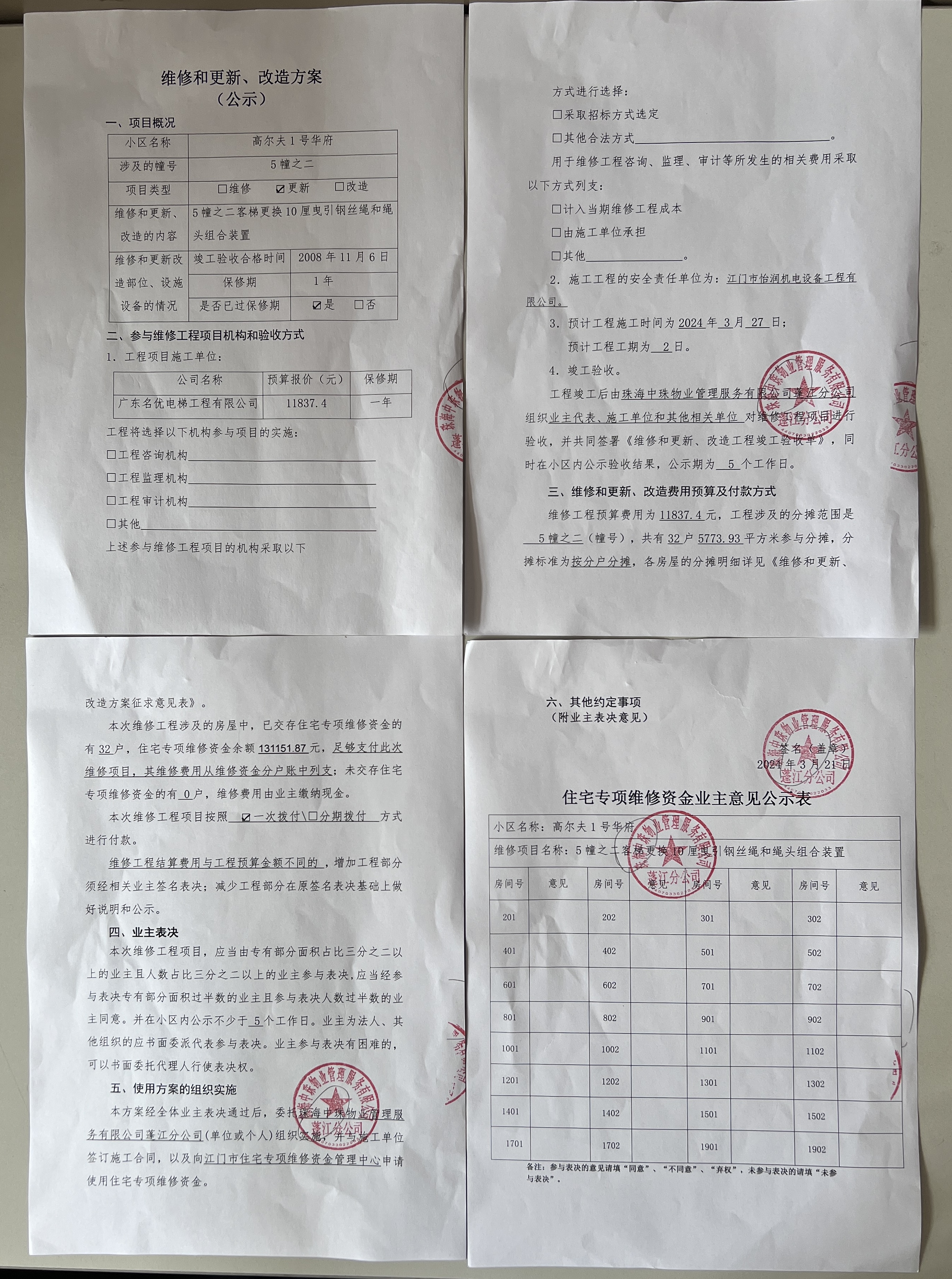 <td VALIGN="top" VALUES="" STYLE="border-width:0" BINDTYPE="0" ROWSPAN="19" COLSPAN="7" DATASOURCE="投票结果" ><font style="font-size:14pt;"><p style="white-space: normal; font-family: 宋体; line-height: 1.75em;">高尔夫1号华府蓬江区绿茵豪苑高尔夫1号华府5幢之二全体业主:</p><p style="white-space: normal; font-family: 宋体; line-height: 1.75em; text-indent: 2em;">本小区关于高尔夫1号华府5幢之二客梯更换10厘钢丝绳和绳头组件的投票的投票已表决结束,询异时间从2025年02月14日开始,投票询异公示期间,业主可通过微信查询自己的表决情况或可凭身份证件申请查询自己的表决情况;如公示的业主表决情况与查询的本人表决意见不一致的,可以以书面形式向投票组织机构申诉,投票组织机构予以纠正并重新公示表决结果。异议提出人对投票组织机构的处理仍有异议的,可以向街道办事处(镇人民政府)反映处理,涉及住宅专项维修资金的,可向属地住宅专项维修资金管理中心反映处理。</p><p style="white-space: normal;"><br/></p><p style="white-space: normal; font-family: 宋体; line-height: 1.75em;"><strong>附件:</strong></p><p style="white-space: normal; font-family: 宋体; line-height: 1.75em;"><strong>一、投票范围</strong></p><p style="white-space: normal; font-family: 宋体; line-height: 1.75em; text-indent: 2em;">高尔夫1号华府蓬江区绿茵豪苑高尔夫1号华府5幢之二</p><p style="white-space: normal; font-family: 宋体; line-height: 1.75em; text-indent: 2em;">总人数(专有部分人数之和):32</p><p style="white-space: normal; font-family: 宋体; line-height: 1.75em; text-indent: 2em;"><span style="font-family: 宋体, SimSun;"><span style="font-family: 宋体; text-indent: 32px;"><span style="font-family: 宋体; text-indent: 32px;">总户数:32</span></span></span></p><p style="white-space: normal; font-family: 宋体; line-height: 1.75em; text-indent: 2em;">建筑物总面积(专有部分面积之和):5773.93㎡</p><p style="white-space: normal; font-family: 宋体; line-height: 1.75em;"><strong>二、询异公示起止时间</strong></p><p dir="ltr" style="white-space: normal; font-family: 宋体; line-height: 1.75em; text-indent: 2em;"><span style="text-indent: 36px;">2025年02月14日至2025年02月24日</span></p><p style="white-space: normal; font-family: 宋体; line-height: 1.75em;"><strong>三、投票详细描述</strong></p><p style="white-space: normal; font-family: 宋体; line-height: 1.75em; text-indent: 2em;"><p>高尔夫1号华府小区5幢之二的客梯定期年审检验中,检测出“上行制动工况曳引检查试验失效”的反馈,经检查,是由于客梯曳引钢丝绳磨损存在扭结变形、曳引轮绳槽缺损和不正常磨损,且钢丝绳下沉与曳引轮绳槽中导致,因使用时间较长,零件原件已老化并达到报废条件而不能继续正常运行。<br/> 现对5幢之二的客梯进行更换,工程维修预算金额为11837.4元,项目最终费用以施工合同签订金额为准。因已过保修期,维修费用由相关业主按分户分摊,每户为369.92元,详见公示附件。如业主手机不能正常通过微信投票,请联系物业公司进行线下纸质投票,物业电话:0750-3068388。</p></p><p style="white-space: normal; font-family: 宋体; line-height: 1.75em;"><strong>四、计票规则</strong></p><p style="white-space: normal; font-family: 宋体; line-height: 1.75em; text-indent: 2em;">表决事项:使用建筑物及其附属设施的维修资金<br /><p style='text-align: left; font-family: 宋体; font-size: 16px; line-height: 1.75em; text-indent: 2em;'>计票规则:弃权票不并入其它项 未表决票不并入其它项</p></p><p style="white-space: normal; font-family: 宋体; line-height: 1.75em;"><strong>五、通过规则</strong></p><p style="white-space: normal; font-family: 宋体; line-height: 1.75em;"><strong><strong style="white-space: normal;"><span style="font-family: 宋体, SimSun;"> 根据《中华人民共和国民法典》第二百七十八条规定:业主共同决定事项,应当由专有部分面积占比三分之二以上的业主且人数占比三分之二以上的业主参与表决。</span></strong></strong></p><p style="white-space: normal; font-family: 宋体; line-height: 1.75em; text-indent: 2em;">表决事项:使用建筑物及其附属设施的维修资金<br /><p style='text-align: left; font-family: 宋体; font-size: 16px; line-height: 1.75em; text-indent: 2em;'>通过规则:双2/3以上参与表决,参与表决双过半同意</p></p><p style="white-space: normal; font-family: 宋体; line-height: 1.75em;"><strong>六、投票结果</strong></p><p style="white-space: normal; font-family: 宋体; line-height: 1.75em; text-indent: 2em;"><div id='resultTable'><table style='table-layout: fixed; font-size:12px; margin-top:10px' width='100%' border='0' cellspacing='0' cellpadding='0'><tr><td height='28' colspan='10' align='center' style='border: 1px solid #666'><strong style='font-size: 14px;'> 使用建筑物及其附属设施的维修资金</strong></td> </tr><tr id='trfirst'><td height='28' colspan='4' style='border-left: 1px solid #666; border-bottom: 1px solid #666'><strong> 申报单位:</strong> 珠海中珠物业管理服务有限公司蓬江分公司</td><td colspan='3' style='border-left: 1px solid #666; border-bottom: 1px solid #666'><strong> 联系方式:</strong> </td><td colspan='3' style='border-left: 1px solid #666; border-bottom: 1px solid #666; border-right: 1px solid #666'><strong> 申报日期:</strong> 2024年5月28日 </td></tr><tr> <td height='28' colspan='5' style='border-left: 1px solid #666; border-bottom: 1px solid #666'><strong> 总人数(专有部分人数之和):</strong>32人 </td><td colspan='5' style='border-left: 1px solid #666; border-bottom: 1px solid #666; border-right: 1px solid #666'><strong> 建筑物总面积(专有部分面