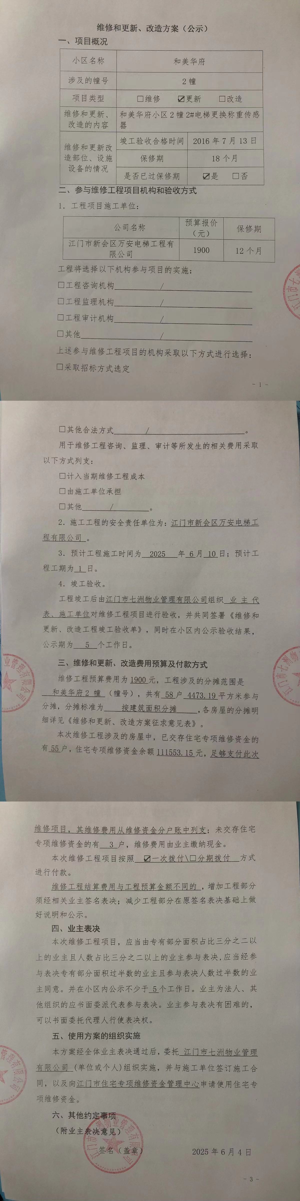 <td VALIGN="top" VALUES="" STYLE="border-width:0" BINDTYPE="0" ROWSPAN="19" COLSPAN="7" DATASOURCE="投票结果" ><font style="font-size:14pt;"><p style="white-space: normal; font-family: 宋体; line-height: 1.75em;">和美华府蓬江区和美华府2幢全体业主:</p><p style="white-space: normal; font-family: 宋体; line-height: 1.75em; text-indent: 2em;">本小区关于和美华府小区2幢2#电梯更换称重传感器的投票的投票已表决结束,询异时间从2025年06月11日开始,投票询异公示期间,业主可通过微信查询自己的表决情况或可凭身份证件申请查询自己的表决情况;如公示的业主表决情况与查询的本人表决意见不一致的,可以以书面形式向投票组织机构申诉,投票组织机构予以纠正并重新公示表决结果。异议提出人对投票组织机构的处理仍有异议的,可以向街道办事处(镇人民政府)反映处理,涉及住宅专项维修资金的,可向属地住宅专项维修资金管理中心反映处理。</p><p style="white-space: normal;"><br/></p><p style="white-space: normal; font-family: 宋体; line-height: 1.75em;"><strong>附件:</strong></p><p style="white-space: normal; font-family: 宋体; line-height: 1.75em;"><strong>一、投票范围</strong></p><p style="white-space: normal; font-family: 宋体; line-height: 1.75em; text-indent: 2em;">和美华府蓬江区和美华府2幢</p><p style="white-space: normal; font-family: 宋体; line-height: 1.75em; text-indent: 2em;">总人数(专有部分人数之和):57</p><p style="white-space: normal; font-family: 宋体; line-height: 1.75em; text-indent: 2em;"><span style="font-family: 宋体, SimSun;"><span style="font-family: 宋体; text-indent: 32px;"><span style="font-family: 宋体; text-indent: 32px;">总户数:58</span></span></span></p><p style="white-space: normal; font-family: 宋体; line-height: 1.75em; text-indent: 2em;">建筑物总面积(专有部分面积之和):4473.19㎡</p><p style="white-space: normal; font-family: 宋体; line-height: 1.75em;"><strong>二、询异公示起止时间</strong></p><p dir="ltr" style="white-space: normal; font-family: 宋体; line-height: 1.75em; text-indent: 2em;"><span style="text-indent: 36px;">2025年06月11日至2025年06月21日</span></p><p style="white-space: normal; font-family: 宋体; line-height: 1.75em;"><strong>三、投票详细描述</strong></p><p style="white-space: normal; font-family: 宋体; line-height: 1.75em; text-indent: 2em;"><p>小区2幢2#电梯运行出现故障,电梯门无法闭合,经检查,是称重传感器损坏导致。现对2幢2#电梯进行更换称重传感器,工程维修预算金额为1900元,项目最终费用以施工合同签订金额为准。因项目已过保修期,维修费用由相关业主按建筑面积分摊。每平方约0.42元,详见公示附件。如业主手机不能正常通过微信投票,请联系物业公司进行线下纸质投票,物业电话:0750-3692920。</p></p><p style="white-space: normal; font-family: 宋体; line-height: 1.75em;"><strong>四、计票规则</strong></p><p style="white-space: normal; font-family: 宋体; line-height: 1.75em; text-indent: 2em;">表决事项:使用建筑物及其附属设施的维修资金<br /><p style='text-align: left; font-family: 宋体; font-size: 16px; line-height: 1.75em; text-indent: 2em;'>计票规则:弃权票不并入其它项 未表决票不并入其它项</p></p><p style="white-space: normal; font-family: 宋体; line-height: 1.75em;"><strong>五、通过规则</strong></p><p style="white-space: normal; font-family: 宋体; line-height: 1.75em;"><strong><strong style="white-space: normal;"><span style="font-family: 宋体, SimSun;"> 根据《中华人民共和国民法典》第二百七十八条规定:业主共同决定事项,应当由专有部分面积占比三分之二以上的业主且人数占比三分之二以上的业主参与表决。</span></strong></strong></p><p style="white-space: normal; font-family: 宋体; line-height: 1.75em; text-indent: 2em;">表决事项:使用建筑物及其附属设施的维修资金<br /><p style='text-align: left; font-family: 宋体; font-size: 16px; line-height: 1.75em; text-indent: 2em;'>通过规则:双2/3以上参与表决,参与表决双过半同意</p></p><p style="white-space: normal; font-family: 宋体; line-height: 1.75em;"><strong>六、投票结果</strong></p><p style="white-space: normal; font-family: 宋体; line-height: 1.75em; text-indent: 2em;"><div id='resultTable'><table style='table-layout: fixed; font-size:12px; margin-top:10px' width='100%' border='0' cellspacing='0' cellpadding='0'><tr><td height='28' colspan='10' align='center' style='border: 1px solid #666'><strong style='font-size: 14px;'> 使用建筑物及其附属设施的维修资金</strong></td> </tr><tr id='trfirst'><td height='28' colspan='4' style='border-left: 1px solid #666; border-bottom: 1px solid #666'><strong> 申报单位:</strong> 江门市七洲物业管理有限公司</td><td colspan='3' style='border-left: 1px solid #666; border-bottom: 1px solid #666'><strong> 联系方式:</strong> 0750-3338969 </td><td colspan='3' style='border-left: 1px solid #666; border-bottom: 1px solid #666; border-right: 1px solid #666'><strong> 申报日期:</strong> 2025年6月5日 </td></tr><tr> <td height='28' colspan='5' style='border-left: 1px solid #666; border-bottom: 1px solid #666'><strong> 总人数(专有部分人数之和):</strong>57人 </td><td colspan='5' style='border-left: 1px solid #666; border-bottom: 1px solid #666; border-right: 1px solid #666'><strong> 建筑物总面积(专有部分面积之和):</strong>4473.19㎡ </td> </tr><tr><td height='28' colspan='10' bgcolor='#F3F3F3' style='border-left: 1px solid #666;border-bottom: 1px solid #666;border-right: 1px solid #666'><strong> 参与人数及面积统计</strong></td></tr><tr><td height='28' colspan='5' style='border-left: 1px solid #666; border-bottom: 1px solid #666'><strong> 参