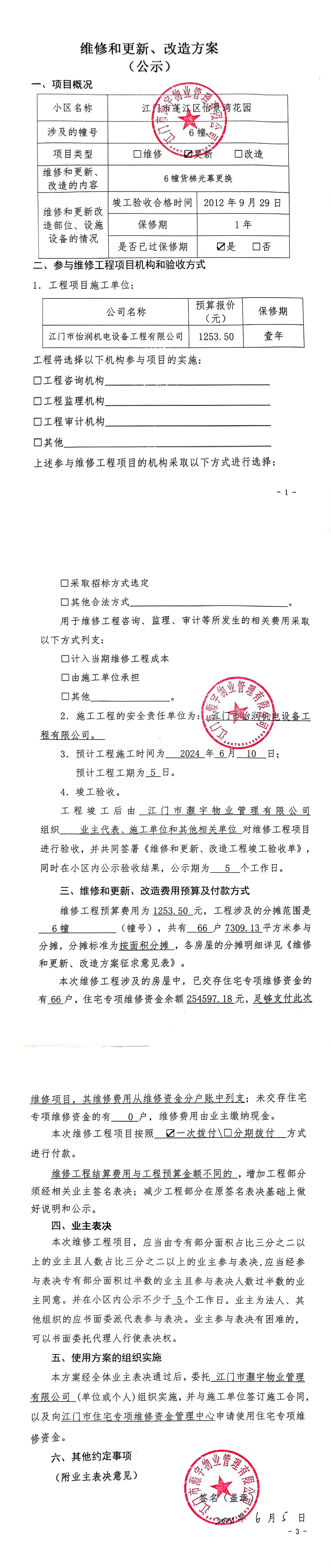 <td VALIGN="top" VALUES="" STYLE="border-width:0" BINDTYPE="0" ROWSPAN="17" COLSPAN="7" DATASOURCE="投票结果" ><font style=" font-family:方正小标宋简体;font-size:14pt;"><p style="line-height: 1.75em;"><span style="font-family: 宋体, SimSun;">各位尊敬的业主:</span><br/></p><p style="text-indent: 2em; line-height: 1.75em;"><span style="font-family: 宋体, SimSun;">根据法律法规的规定,本小区业主利用“江门市物业事项表决管理系统”已对本小区公共事务决策事项进行了表决,在经过7日的询异公示期后,未收到业主有效的异议。现将投票结果公告,并就产生的法律效力说明如下:</span></p><p style="line-height: 1.75em; text-indent: 0em;"><strong style="text-indent: 2em;"><span style="font-family: 宋体, SimSun;">一、投票范围</span></strong></p><p style="text-indent: 2em; line-height: 1.75em;"><span style="font-family: 宋体, SimSun;">蓬江区怡景湾蓬江区怡景湾花园6幢</span></p><p style="text-indent: 2em; line-height: 1.75em;"><span style="font-family: 宋体, SimSun;">总人数(专有部分人数之和):63</span></p><p style="text-indent: 2em; line-height: 1.75em;"><span style="font-family: 宋体, SimSun;"><span style="font-family: 宋体, SimSun; text-indent: 32px;"><span style="font-family: 宋体; text-indent: 32px;"><span style="font-family: 宋体; text-indent: 32px;">总户数:66</span></span></span></span></p><p style="text-indent: 2em; line-height: 1.75em;"><span style="font-family: 宋体, SimSun;">建筑物总面积(专有部分面积之和):7309.13㎡</span></p><p style="line-height: 1.75em;"><strong><span style="font-family: 宋体, SimSun;">二、投票结果公告时间</span></strong></p><p style="text-indent: 2em; line-height: 1.75em;"><span style="font-family: 宋体, SimSun;"><span style="font-family: 宋体, SimSun; text-indent: 32px;">从2025年01月01日开始</span></span></p><p style="line-height: 1.75em;"><strong><span style="font-family: 宋体, SimSun;">三、计票规则</span></strong></p><p style="text-indent: 2em; line-height: 1.75em;"><span style="font-family: 宋体, SimSun;">表决事项:使用建筑物及其附属设施的维修资金<br /><p style='font-family: 宋体, SimSun;line-height: 1.75em; text-indent: 2em;'>计票规则:弃权票不并入其它项&nbsp;&nbsp;&nbsp;&nbsp;未表决票不并入其它项</p></span></p><p style="line-height: 1.75em;"><strong><span style="font-family: 宋体, SimSun;">四、通过规则</span></strong></p><p style="line-height: 1.75em;"><strong><span style="font-family: 宋体, SimSun;">&nbsp; 根据《中华人民共和国民法典》第二百七十八条规定:业主共同决定事项,应当由专有部分面积占比三分之二以上的业主且人数占比三分之二以上的业主参与表决。</span></strong></p><p style="text-indent: 2em; line-height: 1.75em;"><span style="font-family: 宋体, SimSun;"><span style="font-family: 宋体, SimSun; text-indent: 32px;">表决事项:使用建筑物及其附属设施的维修资金<br /><p style='font-family: 宋体, SimSun;line-height: 1.75em; text-indent: 2em;'>通过规则:双2/3以上参与表决,参与表决双过半同意</p></span></span></p><p style="line-height: 1.75em;"><strong><span style="font-family: 宋体, SimSun;">五、投票结果</span></strong></p><p style="line-height: 1.75em; text-indent: 2em;"><span style="font-family: 宋体, SimSun; text-indent: 2em;"><div id='resultTable'><table style='table-layout: fixed; font-size:12px; margin-top:10px' width='100%' border='0' cellspacing='0' cellpadding='0'><tr><td height='28' colspan='10' align='center' style='border: 1px solid #666'><strong style='font-size: 14px;'> 使用建筑物及其附属设施的维修资金</strong></td> </tr><tr id='trfirst'><td height='28' colspan='4' style='border-left: 1px solid #666; border-bottom: 1px solid #666'><strong>&nbsp;申报单位:</strong> 江门市灏宇物业管理有限公司</td><td colspan='3' style='border-left: 1px solid #666; border-bottom: 1px solid #666'><strong>&nbsp;联系方式:</strong> </td><td colspan='3' style='border-left: 1px solid #666; border-bottom: 1px solid #666; border-right: 1px solid #666'><strong>&nbsp;申报日期:</strong> 2024年12月12日 </td></tr><tr> <td height='28' colspan='5' style='border-left: 1px solid #666; border-bottom: 1px solid #666'><strong>&nbsp;列支总人数(专有部分人数之和):</strong>63人 </td><td colspan='5' style='border-left: 1px solid #666; border-bottom: 1px solid #666; border-right: 1px solid #666'><strong>&nbsp;列支建筑物总面积(专有部分面积之和):</strong>7309.13㎡ </td> </tr><tr><td height='28' colspan='10' bgcolor='#F3F3F3' style='border-left: 1px solid #666;border-bottom: 1px solid #666;border-right: 1px solid #666'><strong>&nbsp;参与表决人数及面积统计</strong></td></tr><tr><td height='28' colspan='5' style='border-left: 1px solid #666; border-bottom: 1px solid #666'><strong>&nbsp;参与表决人数:</strong>49人</td><td colspan='5' style='border-left: 1px solid #666; border-bottom: 1px solid #666; border-right: 1px solid #666'><strong>&nbsp;参与表决人数占总人数比例:</strong>77.78%</td></tr><tr><td height='28' colspan='5' style='border-left: 1px solid #666; border-bottom: 1px solid #666'><strong>&nbsp;参与表决面积:</strong>5748.32㎡</td><td colspan='5' style='border-left: 1px solid #666; border-bottom: 1px solid #666; border-right: 1px solid #666'><strong>&nbsp;参与表决面积占总面积比例:</strong>78.65%</td></tr><tr><td height='28' colspan='10' bgcolor='#F3F3F3' style='border-left: 1px solid #666; border-bottom: 1px solid #666;border-right: 1px solid #666'> <strong>&nbsp;参与表决同意人数及面积统计</strong></td> </tr><tr><td height='28' colspan='5' style='border-left: 1px solid #666; border-bottom: 1px solid #666'><strong>&nbsp;参与表决同意人数:</strong>49人 </td><td colspan='5' style='border-left: 1px solid #666; 