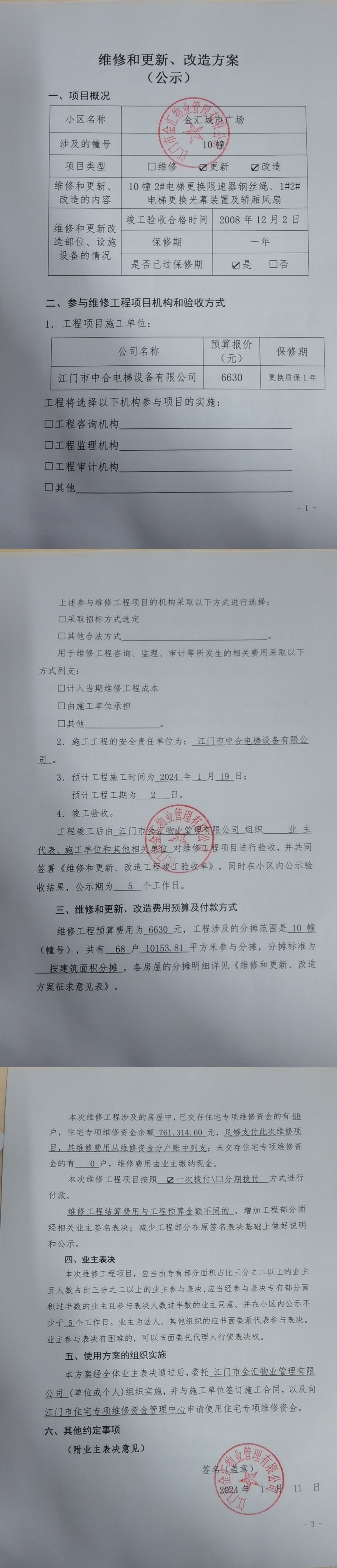 <td VALIGN="top" VALUES="" STYLE="border-width:0" BINDTYPE="0" ROWSPAN="17" COLSPAN="7" DATASOURCE="投票结果" ><font style=" font-family:方正小标宋简体;font-size:14pt;"><p style="line-height: 1.75em;"><span style="font-family: 宋体, SimSun;">各位尊敬的业主:</span><br/></p><p style="text-indent: 2em; line-height: 1.75em;"><span style="font-family: 宋体, SimSun;">根据法律法规的规定,本小区业主利用“江门市物业事项表决管理系统”已对本小区公共事务决策事项进行了表决,在经过7日的询异公示期后,未收到业主有效的异议。现将投票结果公告,并就产生的法律效力说明如下:</span></p><p style="line-height: 1.75em; text-indent: 0em;"><strong style="text-indent: 2em;"><span style="font-family: 宋体, SimSun;">一、投票范围</span></strong></p><p style="text-indent: 2em; line-height: 1.75em;"><span style="font-family: 宋体, SimSun;">金汇城市广场金汇城市广场10栋</span></p><p style="text-indent: 2em; line-height: 1.75em;"><span style="font-family: 宋体, SimSun;">总人数(专有部分人数之和):67</span></p><p style="text-indent: 2em; line-height: 1.75em;"><span style="font-family: 宋体, SimSun;"><span style="font-family: 宋体, SimSun; text-indent: 32px;"><span style="font-family: 宋体; text-indent: 32px;"><span style="font-family: 宋体; text-indent: 32px;">总户数:68</span></span></span></span></p><p style="text-indent: 2em; line-height: 1.75em;"><span style="font-family: 宋体, SimSun;">建筑物总面积(专有部分面积之和):10153.81㎡</span></p><p style="line-height: 1.75em;"><strong><span style="font-family: 宋体, SimSun;">二、投票结果公告时间</span></strong></p><p style="text-indent: 2em; line-height: 1.75em;"><span style="font-family: 宋体, SimSun;">从2024年05月08日开始</span></p><p style="line-height: 1.75em;"><strong><span style="font-family: 宋体, SimSun;">三、计票规则</span></strong></p><p style="text-indent: 2em; line-height: 1.75em;"><span style="font-family: 宋体, SimSun;">表决事项:使用建筑物及其附属设施的维修资金<br /><p style='font-family: 宋体, SimSun;line-height: 1.75em; text-indent: 2em;'>计票规则:弃权票不并入其它项&nbsp;&nbsp;&nbsp;&nbsp;未表决票不并入其它项</p></span></p><p style="line-height: 1.75em;"><strong><span style="font-family: 宋体, SimSun;">四、通过规则</span></strong></p><p style="line-height: 1.75em;"><strong><span style="font-family: 宋体, SimSun;">&nbsp; 根据《中华人民共和国民法典》第二百七十八条规定:业主共同决定事项,应当由专有部分面积占比三分之二以上的业主且人数占比三分之二以上的业主参与表决。</span></strong></p><p style="text-indent: 2em; line-height: 1.75em;"><span style="font-family: 宋体, SimSun;"><span style="font-family: 宋体, SimSun; text-indent: 32px;">表决事项:使用建筑物及其附属设施的维修资金<br /><p style='font-family: 宋体, SimSun;line-height: 1.75em; text-indent: 2em;'>通过规则:双2/3以上参与表决,参与表决双过半同意</p></span></span></p><p style="line-height: 1.75em;"><strong><span style="font-family: 宋体, SimSun;">五、投票结果</span></strong></p><p style="line-height: 1.75em; text-indent: 2em;"><span style="font-family: 宋体, SimSun; text-indent: 2em;"><div id='resultTable'><table style='table-layout: fixed; font-size:12px; margin-top:10px' width='100%' border='0' cellspacing='0' cellpadding='0'><tr><td height='28' colspan='10' align='center' style='border: 1px solid #666'><strong style='font-size: 14px;'> 使用建筑物及其附属设施的维修资金</strong></td> </tr><tr id='trfirst'><td height='28' colspan='4' style='border-left: 1px solid #666; border-bottom: 1px solid #666'><strong>&nbsp;申报单位:</strong> 江门市金汇物业管理有限公司</td><td colspan='3' style='border-left: 1px solid #666; border-bottom: 1px solid #666'><strong>&nbsp;联系方式:</strong> 3929003 </td><td colspan='3' style='border-left: 1px solid #666; border-bottom: 1px solid #666; border-right: 1px solid #666'><strong>&nbsp;申报日期:</strong> 2024年1月22日 </td></tr><tr> <td height='28' colspan='5' style='border-left: 1px solid #666; border-bottom: 1px solid #666'><strong>&nbsp;列支总人数(专有部分人数之和):</strong>67人 </td><td colspan='5' style='border-left: 1px solid #666; border-bottom: 1px solid #666; border-right: 1px solid #666'><strong>&nbsp;列支建筑物总面积(专有部分面积之和):</strong>10153.81㎡ </td> </tr><tr><td height='28' colspan='10' bgcolor='#F3F3F3' style='border-left: 1px solid #666;border-bottom: 1px solid #666;border-right: 1px solid #666'><strong>&nbsp;参与表决人数及面积统计</strong></td></tr><tr><td height='28' colspan='5' style='border-left: 1px solid #666; border-bottom: 1px solid #666'><strong>&nbsp;参与表决人数:</strong>53人</td><td colspan='5' style='border-left: 1px solid #666; border-bottom: 1px solid #666; border-right: 1px solid #666'><strong>&nbsp;参与表决人数占总人数比例:</strong>79.10%</td></tr><tr><td height='28' colspan='5' style='border-left: 1px solid #666; border-bottom: 1px solid #666'><strong>&nbsp;参与表决面积:</strong>7858.93㎡</td><td colspan='5' style='border-left: 1px solid #666; border-bottom: 1px solid #666; border-right: 1px solid #666'><strong>&nbsp;参与表决面积占总面积比例:</strong>77.40%</td></tr><tr><td height='28' colspan='10' bgcolor='#F3F3F3' style='border-left: 1px solid #666; border-bottom: 1px solid #666;border-right: 1px solid #666'> <strong>&nbsp;参与表决同意人数及面积统计</strong></td> </tr><tr><td height='28' colspan='5' style='border-left: 1px solid #666; border-bottom: 1px solid #666'><strong>&nbsp;参与表决同意人数:</strong>53人 </td><td colspan='5' style='border-left: 1px solid #666; border-bottom: 1px solid #666; border-right: 1px solid #666'><str
