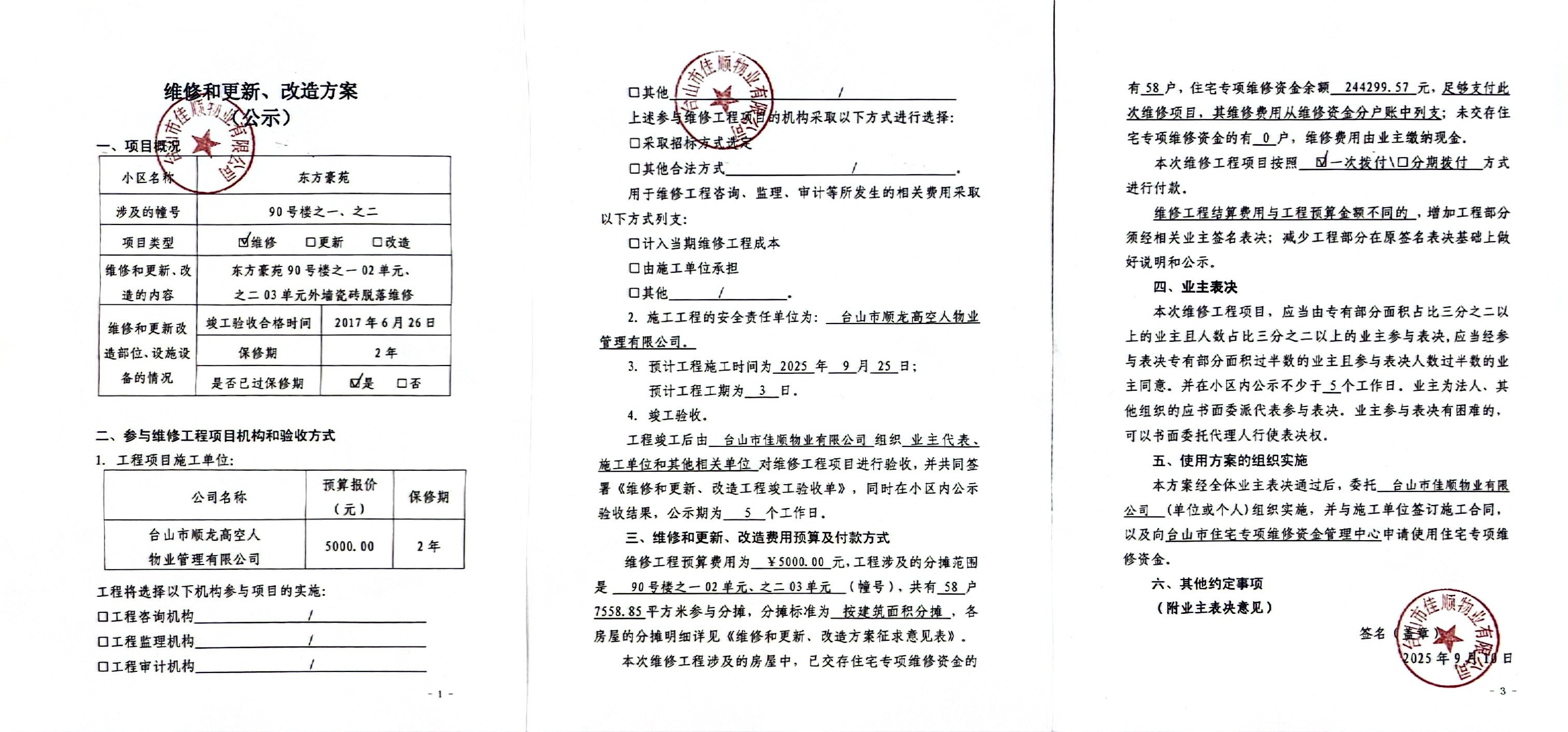 <td VALIGN="top" VALUES="" STYLE="border-width:0" BINDTYPE="0" ROWSPAN="19" COLSPAN="7" DATASOURCE="投票结果" ><font style="font-size:14pt;"><p style="white-space: normal; font-family: 宋体; line-height: 1.75em;">东方豪苑90号全体业主:</p><p style="white-space: normal; font-family: 宋体; line-height: 1.75em; text-indent: 2em;">本小区关于东方豪苑90号楼之一02单元、90号楼之二03单元外墙瓷砖脱落维修的使用维修资金投票的投票已表决结束,询异时间从2025年10月20日开始,投票询异公示期间,业主可通过微信查询自己的表决情况或可凭身份证件申请查询自己的表决情况;如公示的业主表决情况与查询的本人表决意见不一致的,可以以书面形式向投票组织机构申诉,投票组织机构予以纠正并重新公示表决结果。异议提出人对投票组织机构的处理仍有异议的,可以向街道办事处(镇人民政府)反映处理,涉及住宅专项维修资金的,可向属地住宅专项维修资金管理中心反映处理。</p><p style="white-space: normal;"><br/></p><p style="white-space: normal; font-family: 宋体; line-height: 1.75em;"><strong>附件:</strong></p><p style="white-space: normal; font-family: 宋体; line-height: 1.75em;"><strong>一、投票范围</strong></p><p style="white-space: normal; font-family: 宋体; line-height: 1.75em; text-indent: 2em;">东方豪苑90号</p><p style="white-space: normal; font-family: 宋体; line-height: 1.75em; text-indent: 2em;">总人数(专有部分人数之和):58</p><p style="white-space: normal; font-family: 宋体; line-height: 1.75em; text-indent: 2em;"><span style="font-family: 宋体, SimSun;"><span style="font-family: 宋体; text-indent: 32px;"><span style="font-family: 宋体; text-indent: 32px;">总户数:58</span></span></span></p><p style="white-space: normal; font-family: 宋体; line-height: 1.75em; text-indent: 2em;">建筑物总面积(专有部分面积之和):7558.85㎡</p><p style="white-space: normal; font-family: 宋体; line-height: 1.75em;"><strong>二、询异公示起止时间</strong></p><p dir="ltr" style="white-space: normal; font-family: 宋体; line-height: 1.75em; text-indent: 2em;"><span style="text-indent: 36px;">2025年10月20日至2025年10月30日</span></p><p style="white-space: normal; font-family: 宋体; line-height: 1.75em;"><strong>三、投票详细描述</strong></p><p style="white-space: normal; font-family: 宋体; line-height: 1.75em; text-indent: 2em;"><p>东方豪苑90号楼之一02单元、90号楼之二03单元外墙瓷砖脱落,存在安全隐患,现需高空吊绳对外墙瓷砖进行维修,工程维修预算金额为5000元,因已过保修期,维修费用由相关业主按建筑面积分摊,详见公示附件。如业主手机不能正常通过微信投票,请联系物业公司进行线下纸质投票,物业电话:0750-5579397。</p></p><p style="white-space: normal; font-family: 宋体; line-height: 1.75em;"><strong>四、计票规则</strong></p><p style="white-space: normal; font-family: 宋体; line-height: 1.75em; text-indent: 2em;">表决事项:使用建筑物及其附属设施的维修资金<br /><p style='text-align: left; font-family: 宋体; font-size: 16px; line-height: 1.75em; text-indent: 2em;'>计票规则:弃权票不并入其它项 未表决票不并入其它项</p></p><p style="white-space: normal; font-family: 宋体; line-height: 1.75em;"><strong>五、通过规则</strong></p><p style="white-space: normal; font-family: 宋体; line-height: 1.75em;"><strong><strong style="white-space: normal;"><span style="font-family: 宋体, SimSun;"> 根据《中华人民共和国民法典》第二百七十八条规定:业主共同决定事项,应当由专有部分面积占比三分之二以上的业主且人数占比三分之二以上的业主参与表决。</span></strong></strong></p><p style="white-space: normal; font-family: 宋体; line-height: 1.75em; text-indent: 2em;">表决事项:使用建筑物及其附属设施的维修资金<br /><p style='text-align: left; font-family: 宋体; font-size: 16px; line-height: 1.75em; text-indent: 2em;'>通过规则:双2/3以上参与表决,参与表决双过半同意</p></p><p style="white-space: normal; font-family: 宋体; line-height: 1.75em;"><strong>六、投票结果</strong></p><p style="white-space: normal; font-family: 宋体; line-height: 1.75em; text-indent: 2em;"><div id='resultTable'><table style='table-layout: fixed; font-size:12px; margin-top:10px' width='100%' border='0' cellspacing='0' cellpadding='0'><tr><td height='28' colspan='10' align='center' style='border: 1px solid #666'><strong style='font-size: 14px;'> 使用建筑物及其附属设施的维修资金</strong></td> </tr><tr id='trfirst'><td height='28' colspan='4' style='border-left: 1px solid #666; border-bottom: 1px solid #666'><strong> 申报单位:</strong> 台山市佳顺物业有限公司</td><td colspan='3' style='border-left: 1px solid #666; border-bottom: 1px solid #666'><strong> 联系方式:</strong> </td><td colspan='3' style='border-left: 1px solid #666; border-bottom: 1px solid #666; border-right: 1px solid #666'><strong> 申报日期:</strong> 2025年9月11日 </td></tr><tr> <td height='28' colspan='5' style='border-left: 1px solid #666; border-bottom: 1px solid #666'><strong> 总人数(专有部分人数之和):</strong>58人 </td><td colspan='5' style='border-left: 1px solid #666; border-bottom: 1px solid #666; border-right: 1px solid #666'><strong> 建筑物总面积(专有部分面积之和):</strong>7558.85㎡ </td> </tr><tr><td height='28' colspan='10' bgcolor='#F3F3F3' style='border-left: 1px solid #666;border-bottom: 1px solid #666;border-right: 1px solid #666'><strong> 参与人数及面积统计</strong></td></tr><tr><td height='28' colspan='5' style='border-left: 1px solid #666; border-bottom: 1px solid #666'><strong> 参与表决专有部分人数之和:</strong>42人</td><td colspan='5' style='border-left: 1px sol