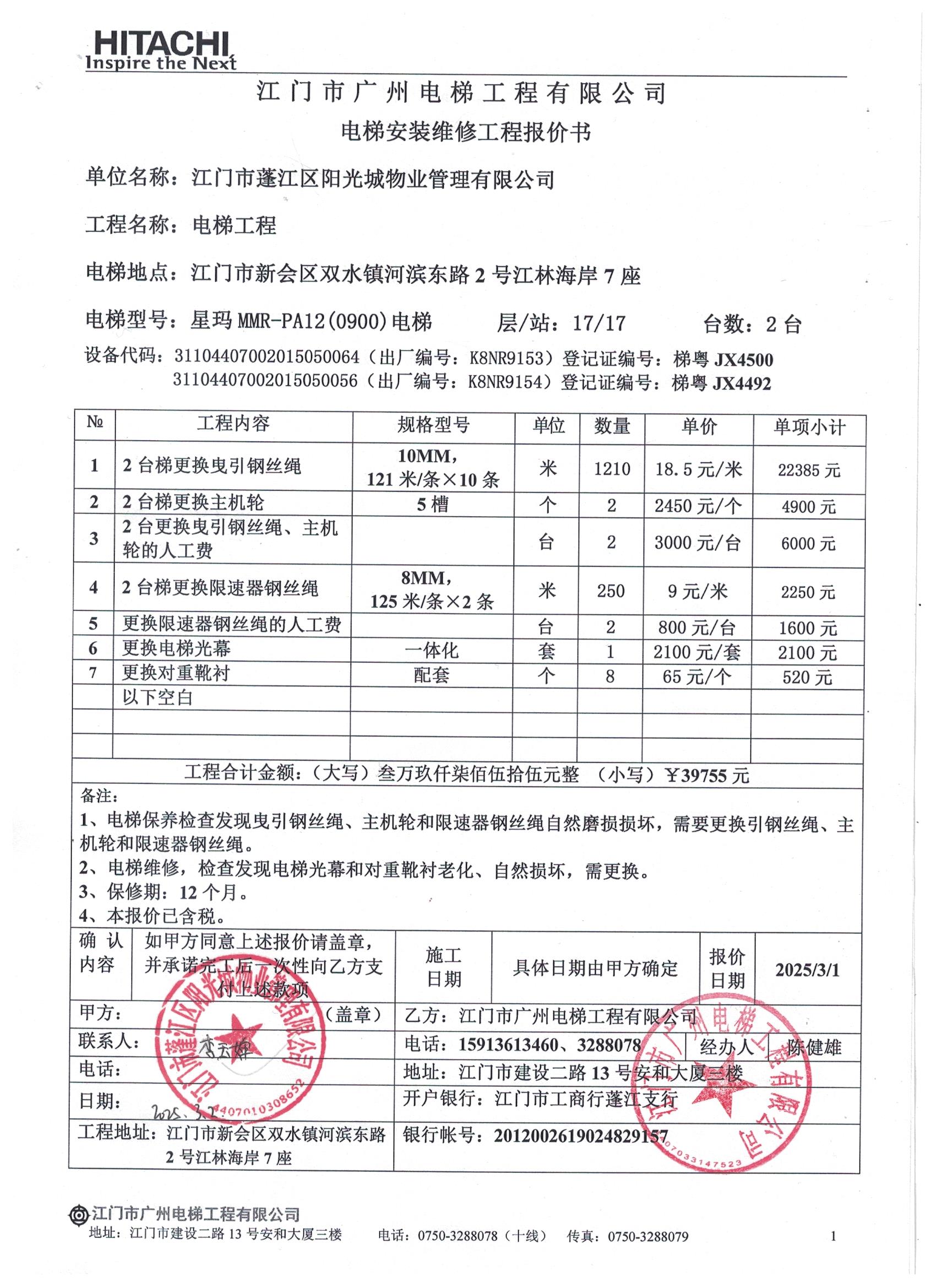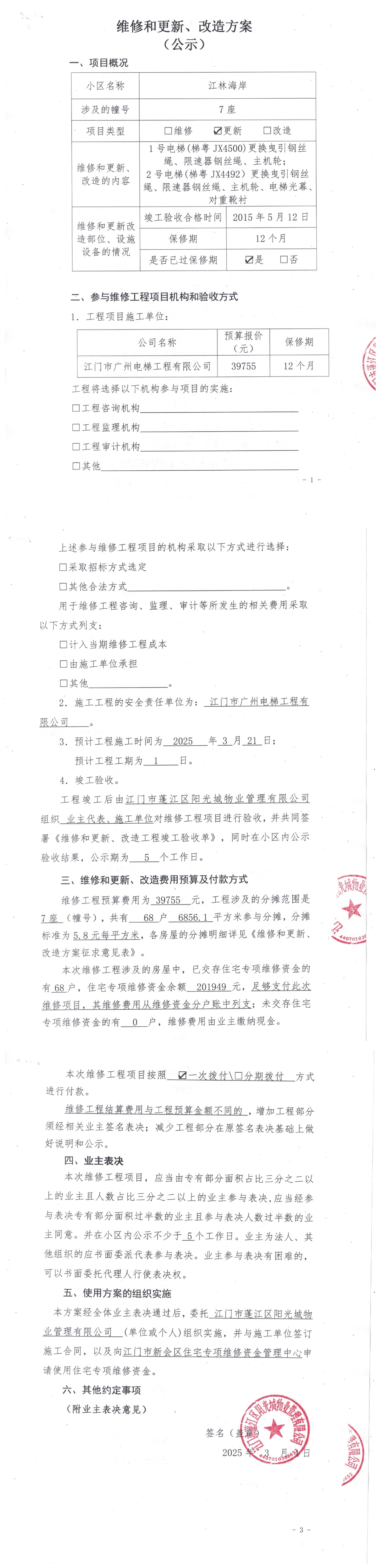 <td VALIGN="top" VALUES="" STYLE="border-width:0" BINDTYPE="0" ROWSPAN="19" COLSPAN="7" DATASOURCE="投票结果" ><font style="font-size:14pt;"><p style="white-space: normal; font-family: 宋体; line-height: 1.75em;">江林海岸江林海岸7座全体业主:</p><p style="white-space: normal; font-family: 宋体; line-height: 1.75em; text-indent: 2em;">本小区关于江林海岸7座1号电梯(梯粤JX4500)更换曳引钢丝绳、主机轮、限速器钢丝绳;2号电梯(梯粤JX4492)更换曳引钢丝绳、主机轮、限速器钢丝绳、电梯光幕、对重靴衬使用维修资金投票的投票已表决结束,询异时间从2025年04月03日开始,投票询异公示期间,业主可通过微信查询自己的表决情况或可凭身份证件申请查询自己的表决情况;如公示的业主表决情况与查询的本人表决意见不一致的,可以以书面形式向投票组织机构申诉,投票组织机构予以纠正并重新公示表决结果。异议提出人对投票组织机构的处理仍有异议的,可以向街道办事处(镇人民政府)反映处理,涉及住宅专项维修资金的,可向属地住宅专项维修资金管理中心反映处理。</p><p style="white-space: normal;"><br/></p><p style="white-space: normal; font-family: 宋体; line-height: 1.75em;"><strong>附件:</strong></p><p style="white-space: normal; font-family: 宋体; line-height: 1.75em;"><strong>一、投票范围</strong></p><p style="white-space: normal; font-family: 宋体; line-height: 1.75em; text-indent: 2em;">江林海岸江林海岸7座</p><p style="white-space: normal; font-family: 宋体; line-height: 1.75em; text-indent: 2em;">总人数(专有部分人数之和):60</p><p style="white-space: normal; font-family: 宋体; line-height: 1.75em; text-indent: 2em;"><span style="font-family: 宋体, SimSun;"><span style="font-family: 宋体; text-indent: 32px;"><span style="font-family: 宋体; text-indent: 32px;">总户数:68</span></span></span></p><p style="white-space: normal; font-family: 宋体; line-height: 1.75em; text-indent: 2em;">建筑物总面积(专有部分面积之和):6856.10㎡</p><p style="white-space: normal; font-family: 宋体; line-height: 1.75em;"><strong>二、询异公示起止时间</strong></p><p dir="ltr" style="white-space: normal; font-family: 宋体; line-height: 1.75em; text-indent: 2em;"><span style="text-indent: 36px;">2025年04月03日至2025年04月13日</span></p><p style="white-space: normal; font-family: 宋体; line-height: 1.75em;"><strong>三、投票详细描述</strong></p><p style="white-space: normal; font-family: 宋体; line-height: 1.75em; text-indent: 2em;"><p> 小区7座1号电梯(梯粤JX4500)和2号电梯(梯粤JX4492)在保养检查发现曳引钢丝绳、限速器钢丝绳和主机轮在日常使用中出现自然磨损损坏,钢丝绳拉伸过长、变细,钢丝绳直径比原来直径减少10%,已达到国家报废标准,钢丝绳直径减少会使电梯摩檫力减少其承载能力大幅下降存在安全隐患,钢丝绳拉伸过长会使电梯在运行时对重缓冲距离越来越小,压住液压缓冲器,造成开关失效引起电梯故障;检查同时发现2号电梯的光幕感应故障电梯门经常要重复开合多次才能关上及电梯对重靴衬磨损损坏。</p><p> 现对7座1号电梯更换曳引钢丝绳、限速器钢丝绳和主机轮,2号电梯进行更换曳引钢丝绳、限速器钢丝绳、主机轮、电梯光幕、对重靴衬,工程维修预算金额为39755元,项目最终费用以施工合同签订金额为准。因已过保修期,维修费用由相关业主按建筑面积分摊,每平方约5.8元,详见公示附件。如业主手机不能正常通过微信投票,请联系物业公司进行线下纸质投票,物业电话:0750-6412233。</p><p><br/></p></p><p style="white-space: normal; font-family: 宋体; line-height: 1.75em;"><strong>四、计票规则</strong></p><p style="white-space: normal; font-family: 宋体; line-height: 1.75em; text-indent: 2em;">表决事项:使用建筑物及其附属设施的维修资金<br /><p style='text-align: left; font-family: 宋体; font-size: 16px; line-height: 1.75em; text-indent: 2em;'>计票规则:弃权票不并入其它项 未表决票不并入其它项</p></p><p style="white-space: normal; font-family: 宋体; line-height: 1.75em;"><strong>五、通过规则</strong></p><p style="white-space: normal; font-family: 宋体; line-height: 1.75em;"><strong><strong style="white-space: normal;"><span style="font-family: 宋体, SimSun;"> 根据《中华人民共和国民法典》第二百七十八条规定:业主共同决定事项,应当由专有部分面积占比三分之二以上的业主且人数占比三分之二以上的业主参与表决。</span></strong></strong></p><p style="white-space: normal; font-family: 宋体; line-height: 1.75em; text-indent: 2em;">表决事项:使用建筑物及其附属设施的维修资金<br /><p style='text-align: left; font-family: 宋体; font-size: 16px; line-height: 1.75em; text-indent: 2em;'>通过规则:双2/3以上参与表决,参与表决双过半同意</p></p><p style="white-space: normal; font-family: 宋体; line-height: 1.75em;"><strong>六、投票结果</strong></p><p style="white-space: normal; font-family: 宋体; line-height: 1.75em; text-indent: 2em;"><div id='resultTable'><table style='table-layout: fixed; font-size:12px; margin-top:10px' width='100%' border='0' cellspacing='0' cellpadding='0'><tr><td height='28' colspan='10' align='center' style='border: 1px solid #666'><strong style='font-size: 14px;'> 使用建筑物及其附属设施的维修资金</strong></td> </tr><tr id='trfirst'><td height='28' colspan='4' style='border-left: 1px solid #666; border-bottom: 1px solid #666'><strong> 申报单位:</strong> 江门市蓬江区阳光城物业管理有限公司</td><td colspan='3' style='border-left: 1px solid #666; border-bottom: 1px solid #666'><strong> 联系方式:</strong> 3332898 </td><td colspan='3' 