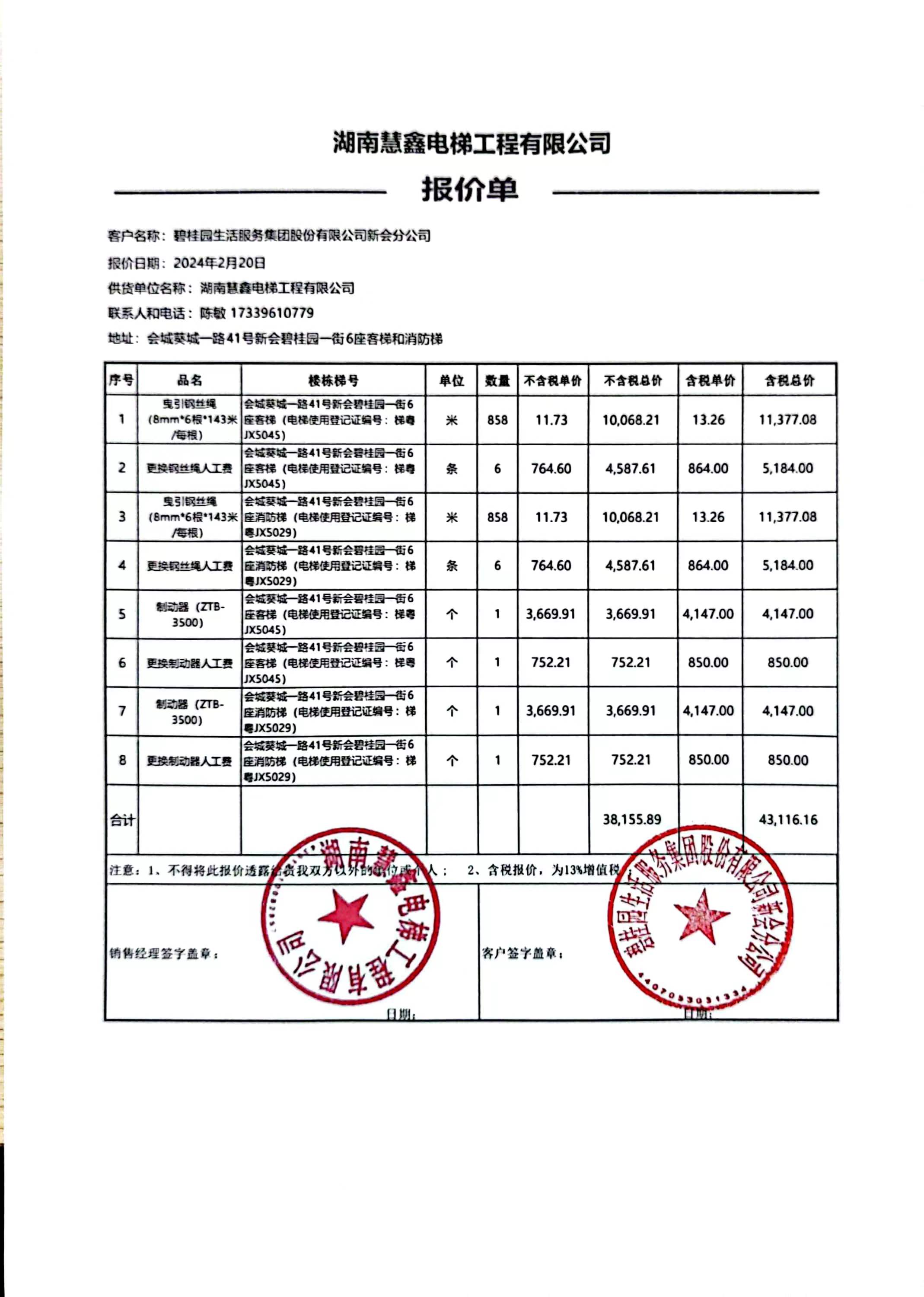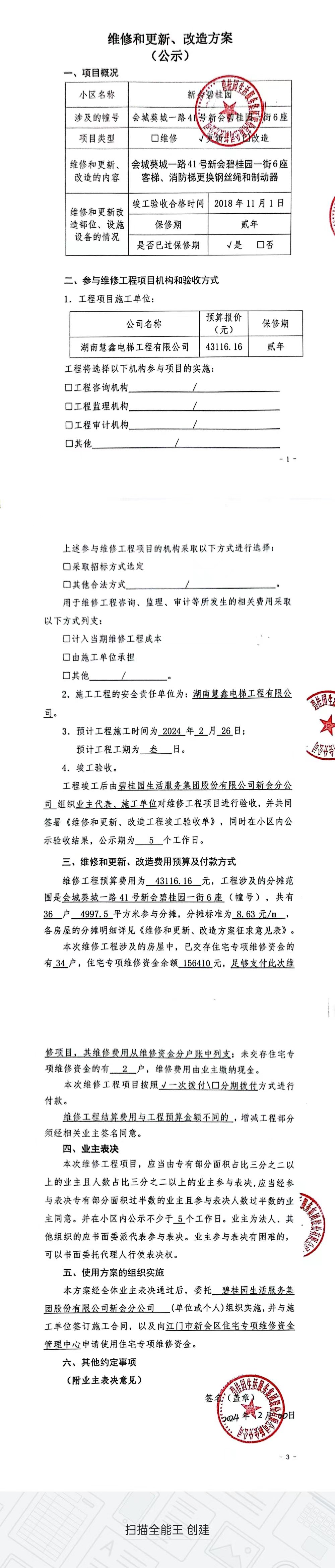 <td VALIGN="top" VALUES="" STYLE="border-width:0" BINDTYPE="0" ROWSPAN="19" COLSPAN="7" DATASOURCE="投票结果" ><font style="font-size:14pt;"><p style="white-space: normal; font-family: 宋体; line-height: 1.75em;">新会碧桂园葵城一路41号01街06座全体业主:</p><p style="white-space: normal; font-family: 宋体; line-height: 1.75em; text-indent: 2em;">本小区关于新会碧桂园会城葵城一路41号新会碧桂园一街6座消防梯、客梯更换钢丝绳和制动器使用维修资金的投票的投票已表决结束,询异时间从2024年03月08日开始,投票询异公示期间,业主可通过微信查询自己的表决情况或可凭身份证件申请查询自己的表决情况;如公示的业主表决情况与查询的本人表决意见不一致的,可以以书面形式向投票组织机构申诉,投票组织机构予以纠正并重新公示表决结果。异议提出人对投票组织机构的处理仍有异议的,可以向街道办事处(镇人民政府)反映处理,涉及住宅专项维修资金的,可向属地住宅专项维修资金管理中心反映处理。</p><p style="white-space: normal;"><br/></p><p style="white-space: normal; font-family: 宋体; line-height: 1.75em;"><strong>附件:</strong></p><p style="white-space: normal; font-family: 宋体; line-height: 1.75em;"><strong>一、投票范围</strong></p><p style="white-space: normal; font-family: 宋体; line-height: 1.75em; text-indent: 2em;">新会碧桂园葵城一路41号01街06座</p><p style="white-space: normal; font-family: 宋体; line-height: 1.75em; text-indent: 2em;">总人数(专有部分人数之和):36</p><p style="white-space: normal; font-family: 宋体; line-height: 1.75em; text-indent: 2em;"><span style="font-family: 宋体, SimSun;"><span style="font-family: 宋体; text-indent: 32px;"><span style="font-family: 宋体; text-indent: 32px;">总户数:36</span></span></span></p><p style="white-space: normal; font-family: 宋体; line-height: 1.75em; text-indent: 2em;">建筑物总面积(专有部分面积之和):4997.50㎡</p><p style="white-space: normal; font-family: 宋体; line-height: 1.75em;"><strong>二、询异公示起止时间</strong></p><p dir="ltr" style="white-space: normal; font-family: 宋体; line-height: 1.75em; text-indent: 2em;"><span style="text-indent: 36px;">2024年03月08日至2024年03月14日</span></p><p style="white-space: normal; font-family: 宋体; line-height: 1.75em;"><strong>三、投票详细描述</strong></p><p style="white-space: normal; font-family: 宋体; line-height: 1.75em; text-indent: 2em;"><p>新会碧桂园会城葵城一路41号新会碧桂园一街6座消防梯、客梯因钢丝绳和制动器存在安全隐患,现需更换客梯、消防梯钢丝绳和制动器。现申请使用维修资金对新会碧桂园会城葵城一路41号新会碧桂园一街6座消防梯、客梯更换钢丝绳和制动器,工程维修预算约43116.16元,项目最终费用以施工合同签订为准,维修费用的分摊标准按建筑面积分摊,每平方约8.63元,详见公示,如果有业主手机不能正常通过微信投票的,请联系物业公司进行线下纸质投票,物业电话17308202884. </p></p><p style="white-space: normal; font-family: 宋体; line-height: 1.75em;"><strong>四、计票规则</strong></p><p style="white-space: normal; font-family: 宋体; line-height: 1.75em; text-indent: 2em;">表决事项:使用建筑物及其附属设施的维修资金<br /><p style='text-align: left; font-family: 宋体; font-size: 16px; line-height: 1.75em; text-indent: 2em;'>计票规则:弃权票不并入其它项 未表决票不并入其它项</p></p><p style="white-space: normal; font-family: 宋体; line-height: 1.75em;"><strong>五、通过规则</strong></p><p style="white-space: normal; font-family: 宋体; line-height: 1.75em;"><strong><strong style="white-space: normal;"><span style="font-family: 宋体, SimSun;"> 根据《中华人民共和国民法典》第二百七十八条规定:业主共同决定事项,应当由专有部分面积占比三分之二以上的业主且人数占比三分之二以上的业主参与表决。</span></strong></strong></p><p style="white-space: normal; font-family: 宋体; line-height: 1.75em; text-indent: 2em;">表决事项:使用建筑物及其附属设施的维修资金<br /><p style='text-align: left; font-family: 宋体; font-size: 16px; line-height: 1.75em; text-indent: 2em;'>通过规则:双2/3以上参与表决,参与表决双过半同意</p></p><p style="white-space: normal; font-family: 宋体; line-height: 1.75em;"><strong>六、投票结果</strong></p><p style="white-space: normal; font-family: 宋体; line-height: 1.75em; text-indent: 2em;"><div id='resultTable'><table style='table-layout: fixed; font-size:12px; margin-top:10px' width='100%' border='0' cellspacing='0' cellpadding='0'><tr><td height='28' colspan='10' align='center' style='border: 1px solid #666'><strong style='font-size: 14px;'> 使用建筑物及其附属设施的维修资金</strong></td> </tr><tr id='trfirst'><td height='28' colspan='4' style='border-left: 1px solid #666; border-bottom: 1px solid #666'><strong> 申报单位:</strong> 碧桂园生活服务集团股份有限公司新会分公司</td><td colspan='3' style='border-left: 1px solid #666; border-bottom: 1px solid #666'><strong> 联系方式:</strong> </td><td colspan='3' style='border-left: 1px solid #666; border-bottom: 1px solid #666; border-right: 1px solid #666'><strong> 申报日期:</strong> 2024年2月6日 </td></tr><tr> <td height='28' colspan='5' style='border-left: 1px solid #666; border-bottom: 1px solid #666'><strong> 总人数(专有部分人数之和):</strong>36人 </td><td colspan='5' style='border-left: 1px solid #666; border-bottom: 1px solid #666; border-right: 1px solid #666'><strong> 建筑物总面积(专有部分面积之和):</strong>4997.50㎡ </td> </tr><tr><td height='28' colspan='10' bgcolor='#F3F3F3' style='border-left: 1px solid #666;bord
