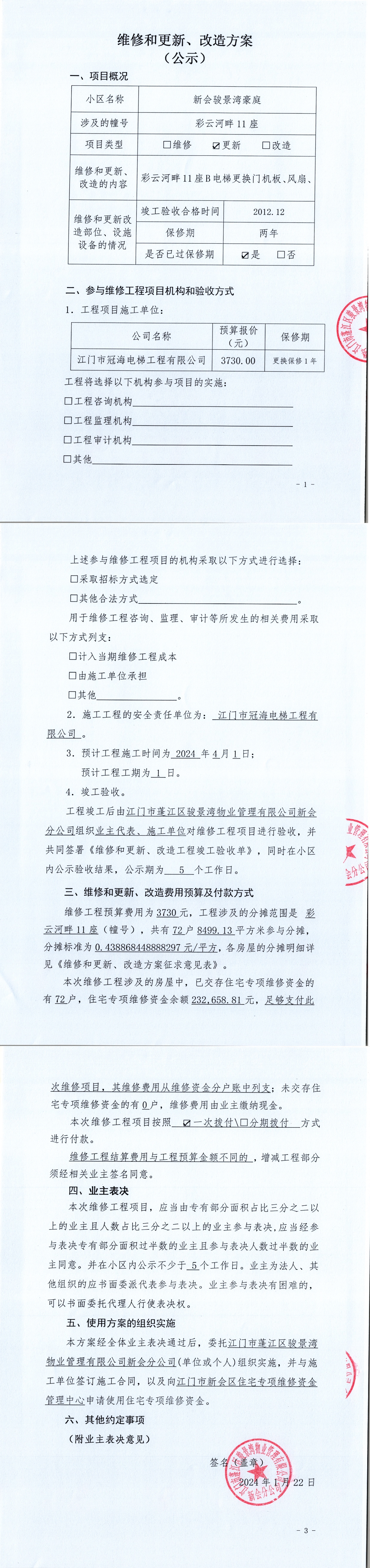 <td VALIGN="top" VALUES="" STYLE="border-width:0" BINDTYPE="0" ROWSPAN="19" COLSPAN="7" DATASOURCE="投票结果" ><font style="font-size:14pt;"><p style="white-space: normal; font-family: 宋体; line-height: 1.75em;">新会骏景湾豪庭彩云河畔11座全体业主:</p><p style="white-space: normal; font-family: 宋体; line-height: 1.75em; text-indent: 2em;">本小区关于新会骏景湾豪庭彩云河畔11座B梯更换门机板、风扇使用维修资金的投票的投票已表决结束,询异时间从2024年04月10日开始,投票询异公示期间,业主可通过微信查询自己的表决情况或可凭身份证件申请查询自己的表决情况;如公示的业主表决情况与查询的本人表决意见不一致的,可以以书面形式向投票组织机构申诉,投票组织机构予以纠正并重新公示表决结果。异议提出人对投票组织机构的处理仍有异议的,可以向街道办事处(镇人民政府)反映处理,涉及住宅专项维修资金的,可向属地住宅专项维修资金管理中心反映处理。</p><p style="white-space: normal;"><br/></p><p style="white-space: normal; font-family: 宋体; line-height: 1.75em;"><strong>附件:</strong></p><p style="white-space: normal; font-family: 宋体; line-height: 1.75em;"><strong>一、投票范围</strong></p><p style="white-space: normal; font-family: 宋体; line-height: 1.75em; text-indent: 2em;">新会骏景湾豪庭彩云河畔11座</p><p style="white-space: normal; font-family: 宋体; line-height: 1.75em; text-indent: 2em;">总人数(专有部分人数之和):69</p><p style="white-space: normal; font-family: 宋体; line-height: 1.75em; text-indent: 2em;"><span style="font-family: 宋体, SimSun;"><span style="font-family: 宋体; text-indent: 32px;"><span style="font-family: 宋体; text-indent: 32px;">总户数:72</span></span></span></p><p style="white-space: normal; font-family: 宋体; line-height: 1.75em; text-indent: 2em;">建筑物总面积(专有部分面积之和):8499.13㎡</p><p style="white-space: normal; font-family: 宋体; line-height: 1.75em;"><strong>二、询异公示起止时间</strong></p><p dir="ltr" style="white-space: normal; font-family: 宋体; line-height: 1.75em; text-indent: 2em;"><span style="text-indent: 36px;">2024年04月10日至2024年04月16日</span></p><p style="white-space: normal; font-family: 宋体; line-height: 1.75em;"><strong>三、投票详细描述</strong></p><p style="white-space: normal; font-family: 宋体; line-height: 1.75em; text-indent: 2em;"><p>本小区彩云河畔11座B电梯,梯粤JX4664更换门机板、风扇,已过保修期。现需申请使用维修资金对彩云河畔11座B电梯进行维修,工程维修预算金额为3730元,项目最终费用以施工合同签订金额为准。维修费用的分摊标准为建筑面积分摊,每平方约:0.438868448888297元,详见公示附件。如业主手机不能通过微信投票,请联系物业公司进行线下纸质投票,物业电话:0750-6179992</p></p><p style="white-space: normal; font-family: 宋体; line-height: 1.75em;"><strong>四、计票规则</strong></p><p style="white-space: normal; font-family: 宋体; line-height: 1.75em; text-indent: 2em;">表决事项:使用建筑物及其附属设施的维修资金<br /><p style='text-align: left; font-family: 宋体; font-size: 16px; line-height: 1.75em; text-indent: 2em;'>计票规则:弃权票不并入其它项 未表决票不并入其它项</p></p><p style="white-space: normal; font-family: 宋体; line-height: 1.75em;"><strong>五、通过规则</strong></p><p style="white-space: normal; font-family: 宋体; line-height: 1.75em;"><strong><strong style="white-space: normal;"><span style="font-family: 宋体, SimSun;"> 根据《中华人民共和国民法典》第二百七十八条规定:业主共同决定事项,应当由专有部分面积占比三分之二以上的业主且人数占比三分之二以上的业主参与表决。</span></strong></strong></p><p style="white-space: normal; font-family: 宋体; line-height: 1.75em; text-indent: 2em;">表决事项:使用建筑物及其附属设施的维修资金<br /><p style='text-align: left; font-family: 宋体; font-size: 16px; line-height: 1.75em; text-indent: 2em;'>通过规则:双2/3以上参与表决,参与表决双过半同意</p></p><p style="white-space: normal; font-family: 宋体; line-height: 1.75em;"><strong>六、投票结果</strong></p><p style="white-space: normal; font-family: 宋体; line-height: 1.75em; text-indent: 2em;"><div id='resultTable'><table style='table-layout: fixed; font-size:12px; margin-top:10px' width='100%' border='0' cellspacing='0' cellpadding='0'><tr><td height='28' colspan='10' align='center' style='border: 1px solid #666'><strong style='font-size: 14px;'> 使用建筑物及其附属设施的维修资金</strong></td> </tr><tr id='trfirst'><td height='28' colspan='4' style='border-left: 1px solid #666; border-bottom: 1px solid #666'><strong> 申报单位:</strong> 江门市蓬江区骏景湾物业管理有限公司新会分公司</td><td colspan='3' style='border-left: 1px solid #666; border-bottom: 1px solid #666'><strong> 联系方式:</strong> </td><td colspan='3' style='border-left: 1px solid #666; border-bottom: 1px solid #666; border-right: 1px solid #666'><strong> 申报日期:</strong> 2024年1月23日 </td></tr><tr> <td height='28' colspan='5' style='border-left: 1px solid #666; border-bottom: 1px solid #666'><strong> 总人数(专有部分人数之和):</strong>69人 </td><td colspan='5' style='border-left: 1px solid #666; border-bottom: 1px solid #666; border-right: 1px solid #666'><strong> 建筑物总面积(专有部分面积之和):</strong>8499.13㎡ </td> </tr><tr><td height='28' colspan='10' bgcolor='#F3F3F3' style='border-left: 1px solid #666;border-bottom: 1px solid #666;border-right: 1px solid #666'><strong> 参与人数及面积统计</strong></td></tr><tr><td height='28' colspan='5' style='border-left: 1px solid #666; borde
