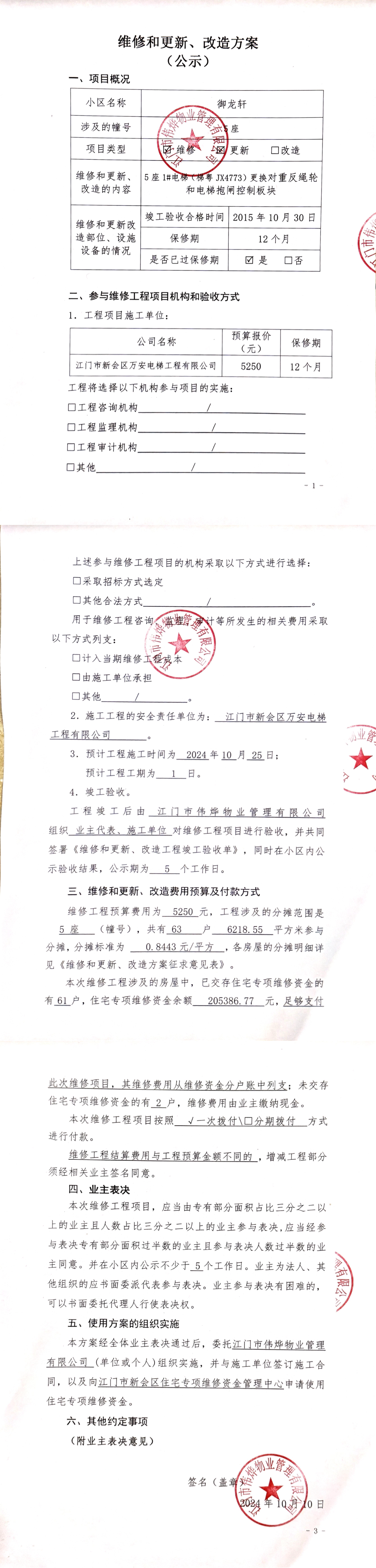 <td VALIGN="top" VALUES="" STYLE="border-width:0" BINDTYPE="0" ROWSPAN="17" COLSPAN="7" DATASOURCE="投票结果" ><font style=" font-family:方正小标宋简体;font-size:14pt;"><p style="line-height: 1.75em;"><span style="font-family: 宋体, SimSun;">各位尊敬的业主:</span><br/></p><p style="text-indent: 2em; line-height: 1.75em;"><span style="font-family: 宋体, SimSun;">根据法律法规的规定,本小区业主利用“江门市物业事项表决管理系统”已对本小区公共事务决策事项进行了表决,在经过7日的询异公示期后,未收到业主有效的异议。现将投票结果公告,并就产生的法律效力说明如下:</span></p><p style="line-height: 1.75em; text-indent: 0em;"><strong style="text-indent: 2em;"><span style="font-family: 宋体, SimSun;">一、投票范围</span></strong></p><p style="text-indent: 2em; line-height: 1.75em;"><span style="font-family: 宋体, SimSun;">御龙轩御龙轩5座</span></p><p style="text-indent: 2em; line-height: 1.75em;"><span style="font-family: 宋体, SimSun;">总人数(专有部分人数之和):63</span></p><p style="text-indent: 2em; line-height: 1.75em;"><span style="font-family: 宋体, SimSun;"><span style="font-family: 宋体, SimSun; text-indent: 32px;"><span style="font-family: 宋体; text-indent: 32px;"><span style="font-family: 宋体; text-indent: 32px;">总户数:63</span></span></span></span></p><p style="text-indent: 2em; line-height: 1.75em;"><span style="font-family: 宋体, SimSun;">建筑物总面积(专有部分面积之和):6218.55㎡</span></p><p style="line-height: 1.75em;"><strong><span style="font-family: 宋体, SimSun;">二、投票结果公告时间</span></strong></p><p style="text-indent: 2em; line-height: 1.75em;"><span style="font-family: 宋体, SimSun;"><span style="font-family: 宋体, SimSun; text-indent: 32px;">从2024年10月29日开始</span></span></p><p style="line-height: 1.75em;"><strong><span style="font-family: 宋体, SimSun;">三、计票规则</span></strong></p><p style="text-indent: 2em; line-height: 1.75em;"><span style="font-family: 宋体, SimSun;">表决事项:使用建筑物及其附属设施的维修资金<br /><p style='font-family: 宋体, SimSun;line-height: 1.75em; text-indent: 2em;'>计票规则:弃权票不并入其它项&nbsp;&nbsp;&nbsp;&nbsp;未表决票不并入其它项</p></span></p><p style="line-height: 1.75em;"><strong><span style="font-family: 宋体, SimSun;">四、通过规则</span></strong></p><p style="line-height: 1.75em;"><strong><span style="font-family: 宋体, SimSun;">&nbsp; 根据《中华人民共和国民法典》第二百七十八条规定:业主共同决定事项,应当由专有部分面积占比三分之二以上的业主且人数占比三分之二以上的业主参与表决。</span></strong></p><p style="text-indent: 2em; line-height: 1.75em;"><span style="font-family: 宋体, SimSun;"><span style="font-family: 宋体, SimSun; text-indent: 32px;">表决事项:使用建筑物及其附属设施的维修资金<br /><p style='font-family: 宋体, SimSun;line-height: 1.75em; text-indent: 2em;'>通过规则:双2/3以上参与表决,参与表决双过半同意</p></span></span></p><p style="line-height: 1.75em;"><strong><span style="font-family: 宋体, SimSun;">五、投票结果</span></strong></p><p style="line-height: 1.75em; text-indent: 2em;"><span style="font-family: 宋体, SimSun; text-indent: 2em;"><div id='resultTable'><table style='table-layout: fixed; font-size:12px; margin-top:10px' width='100%' border='0' cellspacing='0' cellpadding='0'><tr><td height='28' colspan='10' align='center' style='border: 1px solid #666'><strong style='font-size: 14px;'> 使用建筑物及其附属设施的维修资金</strong></td> </tr><tr id='trfirst'><td height='28' colspan='4' style='border-left: 1px solid #666; border-bottom: 1px solid #666'><strong>&nbsp;申报单位:</strong> 江门市伟烨物业管理有限公司</td><td colspan='3' style='border-left: 1px solid #666; border-bottom: 1px solid #666'><strong>&nbsp;联系方式:</strong> 0750-6123828 </td><td colspan='3' style='border-left: 1px solid #666; border-bottom: 1px solid #666; border-right: 1px solid #666'><strong>&nbsp;申报日期:</strong> 2024年10月10日 </td></tr><tr> <td height='28' colspan='5' style='border-left: 1px solid #666; border-bottom: 1px solid #666'><strong>&nbsp;列支总人数(专有部分人数之和):</strong>63人 </td><td colspan='5' style='border-left: 1px solid #666; border-bottom: 1px solid #666; border-right: 1px solid #666'><strong>&nbsp;列支建筑物总面积(专有部分面积之和):</strong>6218.55㎡ </td> </tr><tr><td height='28' colspan='10' bgcolor='#F3F3F3' style='border-left: 1px solid #666;border-bottom: 1px solid #666;border-right: 1px solid #666'><strong>&nbsp;参与表决人数及面积统计</strong></td></tr><tr><td height='28' colspan='5' style='border-left: 1px solid #666; border-bottom: 1px solid #666'><strong>&nbsp;参与表决人数:</strong>46人</td><td colspan='5' style='border-left: 1px solid #666; border-bottom: 1px solid #666; border-right: 1px solid #666'><strong>&nbsp;参与表决人数占总人数比例:</strong>73.02%</td></tr><tr><td height='28' colspan='5' style='border-left: 1px solid #666; border-bottom: 1px solid #666'><strong>&nbsp;参与表决面积:</strong>4578.86㎡</td><td colspan='5' style='border-left: 1px solid #666; border-bottom: 1px solid #666; border-right: 1px solid #666'><strong>&nbsp;参与表决面积占总面积比例:</strong>73.63%</td></tr><tr><td height='28' colspan='10' bgcolor='#F3F3F3' style='border-left: 1px solid #666; border-bottom: 1px solid #666;border-right: 1px solid #666'> <strong>&nbsp;参与表决同意人数及面积统计</strong></td> </tr><tr><td height='28' colspan='5' style='border-left: 1px solid #666; border-bottom: 1px solid #666'><strong>&nbsp;参与表决同意人数:</strong>44人 </td><td colspan='5' style='border-left: 1px solid #666; border-bott
