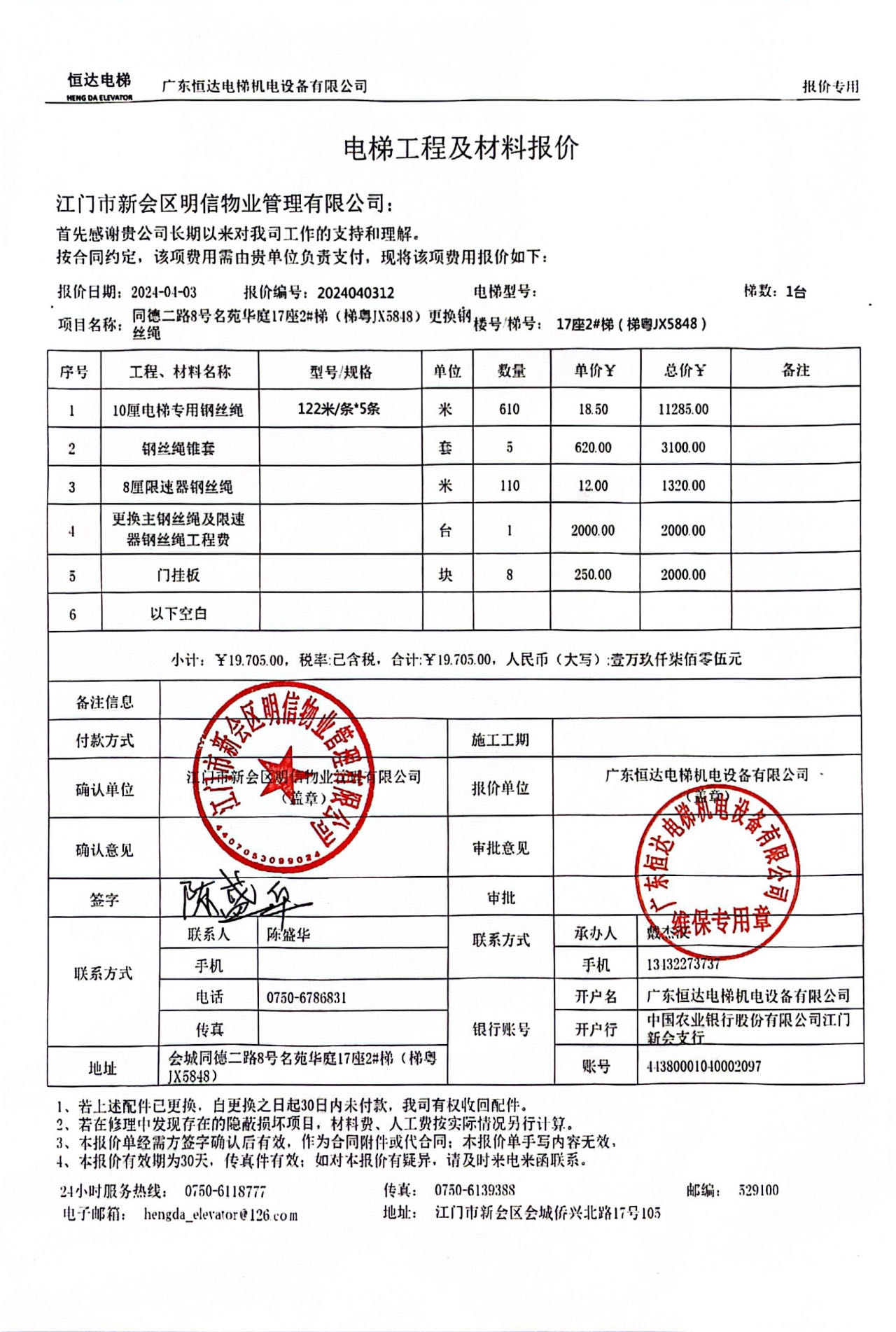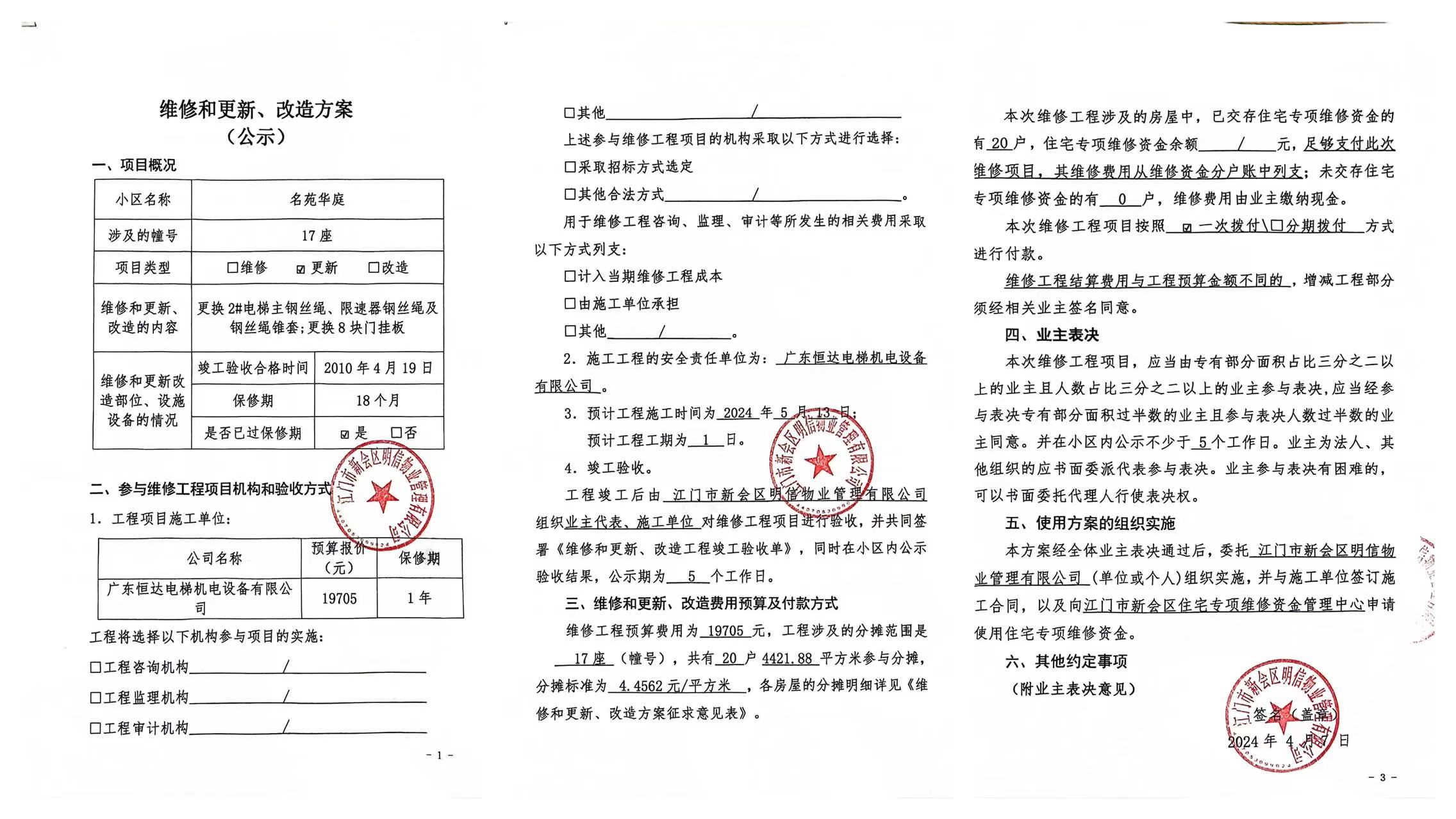 <td VALIGN="top" VALUES="" STYLE="border-width:0" BINDTYPE="0" ROWSPAN="19" COLSPAN="7" DATASOURCE="投票结果" ><font style="font-size:14pt;"><p style="white-space: normal; font-family: 宋体; line-height: 1.75em;">名苑华庭名苑华庭17座全体业主:</p><p style="white-space: normal; font-family: 宋体; line-height: 1.75em; text-indent: 2em;">本小区关于名苑华庭17座2#电梯更换钢丝绳和门挂板使用维修资金的投票的投票已表决结束,询异时间从2024年05月15日开始,投票询异公示期间,业主可通过微信查询自己的表决情况或可凭身份证件申请查询自己的表决情况;如公示的业主表决情况与查询的本人表决意见不一致的,可以以书面形式向投票组织机构申诉,投票组织机构予以纠正并重新公示表决结果。异议提出人对投票组织机构的处理仍有异议的,可以向街道办事处(镇人民政府)反映处理,涉及住宅专项维修资金的,可向属地住宅专项维修资金管理中心反映处理。</p><p style="white-space: normal;"><br/></p><p style="white-space: normal; font-family: 宋体; line-height: 1.75em;"><strong>附件:</strong></p><p style="white-space: normal; font-family: 宋体; line-height: 1.75em;"><strong>一、投票范围</strong></p><p style="white-space: normal; font-family: 宋体; line-height: 1.75em; text-indent: 2em;">名苑华庭名苑华庭17座</p><p style="white-space: normal; font-family: 宋体; line-height: 1.75em; text-indent: 2em;">总人数(专有部分人数之和):20</p><p style="white-space: normal; font-family: 宋体; line-height: 1.75em; text-indent: 2em;"><span style="font-family: 宋体, SimSun;"><span style="font-family: 宋体; text-indent: 32px;"><span style="font-family: 宋体; text-indent: 32px;">总户数:20</span></span></span></p><p style="white-space: normal; font-family: 宋体; line-height: 1.75em; text-indent: 2em;">建筑物总面积(专有部分面积之和):4421.88㎡</p><p style="white-space: normal; font-family: 宋体; line-height: 1.75em;"><strong>二、询异公示起止时间</strong></p><p dir="ltr" style="white-space: normal; font-family: 宋体; line-height: 1.75em; text-indent: 2em;"><span style="text-indent: 36px;">2024年05月15日至2024年05月21日</span></p><p style="white-space: normal; font-family: 宋体; line-height: 1.75em;"><strong>三、投票详细描述</strong></p><p style="white-space: normal; font-family: 宋体; line-height: 1.75em; text-indent: 2em;"><p><span style="text-wrap: wrap; background-color: rgb(255, 255, 255);"></span></p><p><span style="font-size: 14px;"> 名苑华庭小区17座2#电梯(梯粤JX5848)经电梯保养公司检查,电梯的钢丝绳已经生锈起粉,氧化锈蚀严重,部分门挂板也出现磨损情况,存在安全隐患。 </span></p><p><span style="font-size: 14px;"> 现对17座2#电梯进行更换钢丝绳和8块门挂板工程,工程维修预算金额为19705元,项目最终费用以施工合同签订金额为准。因已过保修期,维修费用由相关业主按建筑面积分摊,每平方约4.4562元,详见公示附件。</span><span style="font-size: 14px;">如业主手机不能正常通过微信投票,请联系物业公司进行线下纸质投票</span><span style="font-size: 14px;">,联系电话:0750-6786831。</span></p><p><span style="font-size: 14px; text-wrap: wrap; background-color: rgb(255, 255, 255); font-family: 宋体;"></span><span style="font-family: "Helvetica Neue", Helvetica, Arial, sans-serif; font-size: 14px; text-wrap: wrap; background-color: rgb(255, 255, 255);"></span><br/></p></p><p style="white-space: normal; font-family: 宋体; line-height: 1.75em;"><strong>四、计票规则</strong></p><p style="white-space: normal; font-family: 宋体; line-height: 1.75em; text-indent: 2em;">表决事项:使用建筑物及其附属设施的维修资金<br /><p style='text-align: left; font-family: 宋体; font-size: 16px; line-height: 1.75em; text-indent: 2em;'>计票规则:弃权票不并入其它项 未表决票不并入其它项</p></p><p style="white-space: normal; font-family: 宋体; line-height: 1.75em;"><strong>五、通过规则</strong></p><p style="white-space: normal; font-family: 宋体; line-height: 1.75em;"><strong><strong style="white-space: normal;"><span style="font-family: 宋体, SimSun;"> 根据《中华人民共和国民法典》第二百七十八条规定:业主共同决定事项,应当由专有部分面积占比三分之二以上的业主且人数占比三分之二以上的业主参与表决。</span></strong></strong></p><p style="white-space: normal; font-family: 宋体; line-height: 1.75em; text-indent: 2em;">表决事项:使用建筑物及其附属设施的维修资金<br /><p style='text-align: left; font-family: 宋体; font-size: 16px; line-height: 1.75em; text-indent: 2em;'>通过规则:双2/3以上参与表决,参与表决双过半同意</p></p><p style="white-space: normal; font-family: 宋体; line-height: 1.75em;"><strong>六、投票结果</strong></p><p style="white-space: normal; font-family: 宋体; line-height: 1.75em; text-indent: 2em;"><div id='resultTable'><table style='table-layout: fixed; font-size:12px; margin-top:10px' width='100%' border='0' cellspacing='0' cellpadding='0'><tr><td height='28' colspan='10' align='center' style='border: 1px solid #666'><strong style='font-size: 14px;'> 使用建筑物及其附属设施的维修资金</strong></td> </tr><tr id='trfirst'><td height='28' colspan='4' style='border-left: 1px solid #666; border-bottom: 1px solid #666'><strong> 申报单位:</strong> 江门市新会区明信物业管理有限公司</td><td colspan='3' style='border-left: 1px solid #666; border-bottom: 1px solid #666'><strong> 联系方式:</strong> </td><td colspan='3' style='border-left: 1px solid #666; border-bottom: 1px solid #666; border-right: 1px solid #666'><strong> 申报日期:</strong> 2024年4月17日 </td></tr><tr> <td height='28' colspan='5' style='border-left: 1
