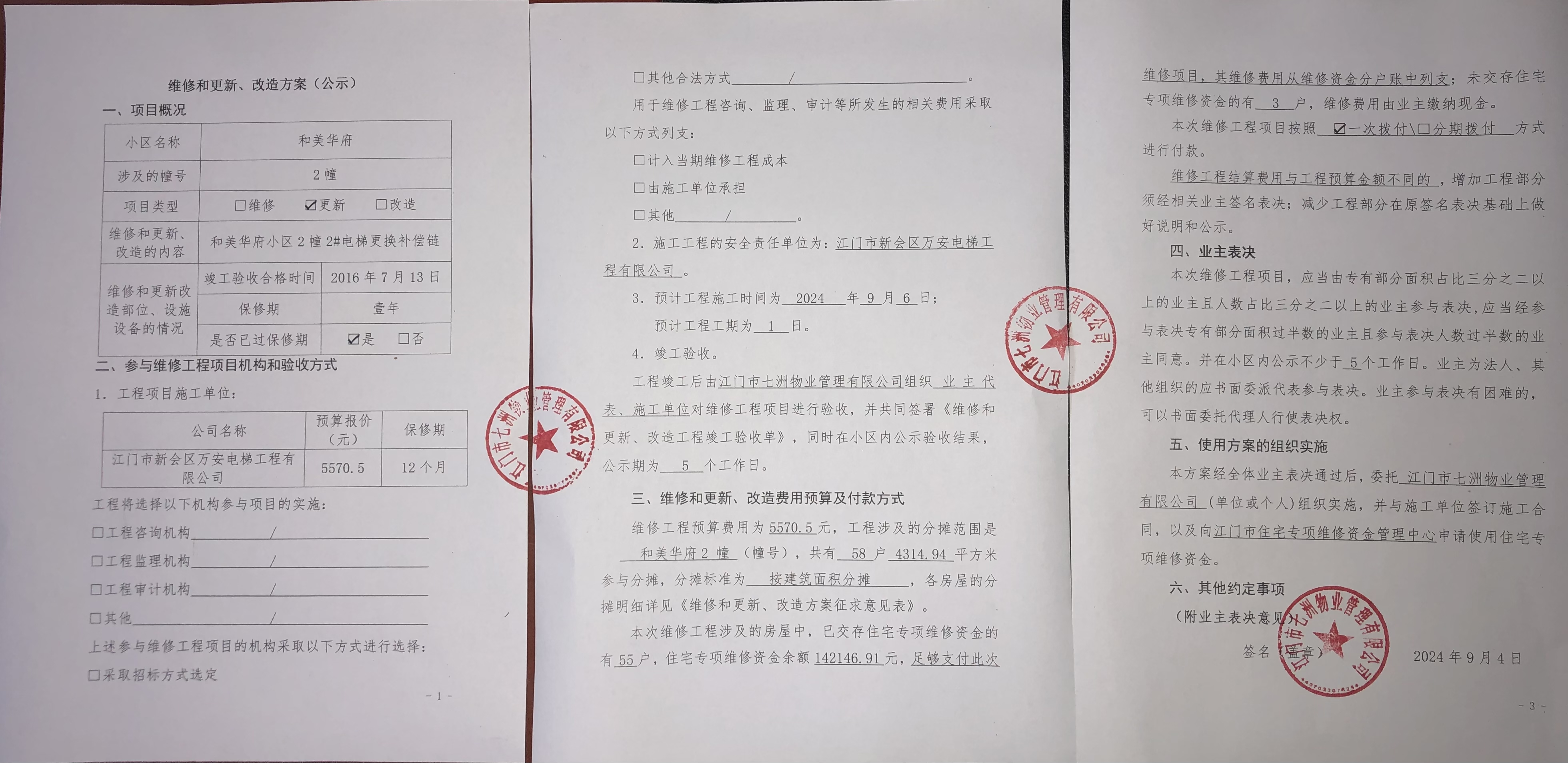 <td valign="top" values="" style="border-width:0" bindtype="0" rowspan="17" colspan="7" datasource="投票结果"><font style=" font-family:方正小标宋简体;font-size:14pt;"><p style="line-height: 1.75em;"><span style="font-family: 宋体, SimSun;">各位尊敬的业主:</span><br></p><p style="text-indent: 2em; line-height: 1.75em;"><span style="font-family: 宋体, SimSun;">根据法律法规的规定,本小区业主利用“江门市物业事项表决管理系统”已对本小区公共事务决策事项进行了表决,在经过7日的询异公示期后,未收到业主有效的异议。现将投票结果公告,并就产生的法律效力说明如下:</span></p><p style="line-height: 1.75em; text-indent: 0em;"><strong style="text-indent: 2em;"><span style="font-family: 宋体, SimSun;">一、投票范围</span></strong></p><p style="text-indent: 2em; line-height: 1.75em;"><span style="font-family: 宋体, SimSun;">和美华府蓬江区和美华府2幢</span></p><p style="text-indent: 2em; line-height: 1.75em;"><span style="font-family: 宋体, SimSun;">总人数(专有部分人数之和):57</span></p><p style="text-indent: 2em; line-height: 1.75em;"><span style="font-family: 宋体, SimSun;"><span style="font-family: 宋体, SimSun; text-indent: 32px;"><span style="font-family: 宋体; text-indent: 32px;"><span style="font-family: 宋体; text-indent: 32px;">总户数:58</span></span></span></span></p><p style="text-indent: 2em; line-height: 1.75em;"><span style="font-family: 宋体, SimSun;">建筑物总面积(专有部分面积之和):4473.19㎡</span></p><p style="line-height: 1.75em;"><strong><span style="font-family: 宋体, SimSun;">二、投票结果公告时间</span></strong></p><p style="text-indent: 2em; line-height: 1.75em;"><span style="font-family: 宋体, SimSun;"><span style="font-family: 宋体, SimSun; text-indent: 32px;">从2024年10月08日开始</span></span></p><p style="line-height: 1.75em;"><strong><span style="font-family: 宋体, SimSun;">三、计票规则</span></strong></p><p style="text-indent: 2em; line-height: 1.75em;"><span style="font-family: 宋体, SimSun;">表决事项:使用建筑物及其附属设施的维修资金<br></span></p><p style="font-family: 宋体, SimSun;line-height: 1.75em; text-indent: 2em;">计票规则:弃权票不并入其它项 未表决票不并入其它项</p><p></p><p style="line-height: 1.75em;"><strong><span style="font-family: 宋体, SimSun;">四、通过规则</span></strong></p><p style="line-height: 1.75em;"><strong><span style="font-family: 宋体, SimSun;"> 根据《中华人民共和国民法典》第二百七十八条规定:业主共同决定事项,应当由专有部分面积占比三分之二以上的业主且人数占比三分之二以上的业主参与表决。</span></strong></p><p style="text-indent: 2em; line-height: 1.75em;"><span style="font-family: 宋体, SimSun;"><span style="font-family: 宋体, SimSun; text-indent: 32px;">表决事项:使用建筑物及其附属设施的维修资金<br></span></span></p><p style="font-family: 宋体, SimSun;line-height: 1.75em; text-indent: 2em;">通过规则:双2/3以上参与表决,参与表决双过半同意</p><p></p><p style="line-height: 1.75em;"><strong><span style="font-family: 宋体, SimSun;">五、投票结果</span></strong></p><p style="line-height: 1.75em; text-indent: 2em;"><span style="font-family: 宋体, SimSun; text-indent: 2em;"></span></p><div id="resultTable"><table style="table-layout: fixed; font-size:12px; margin-top:10px" width="100%" border="0" cellspacing="0" cellpadding="0"><tbody><tr><td height="28" colspan="10" align="center" style="border: 1px solid #666"><strong style="font-size: 14px;"> 使用建筑物及其附属设施的维修资金</strong></td> </tr><tr id="trfirst"><td height="28" colspan="4" style="border-left: 1px solid #666; border-bottom: 1px solid #666"><strong> 申报单位:</strong> 江门市七洲物业管理有限公司</td><td colspan="3" style="border-left: 1px solid #666; border-bottom: 1px solid #666"><strong> 联系方式:</strong> 0750-3338969 </td><td colspan="3" style="border-left: 1px solid #666; border-bottom: 1px solid #666; border-right: 1px solid #666"><strong> 申报日期:</strong> 2024年9月4日 </td></tr><tr> <td height="28" colspan="5" style="border-left: 1px solid #666; border-bottom: 1px solid #666"><strong> 总人数(专有部分人数之和):</strong>57人 </td><td colspan="5" style="border-left: 1px solid #666; border-bottom: 1px solid #666; border-right: 1px solid #666"><strong> 建筑物总面积(专有部分面积之和):</strong>4473.19㎡ </td> </tr><tr><td height="28" colspan="10" bgcolor="#F3F3F3" style="border-left: 1px solid #666;border-bottom: 1px solid #666;border-right: 1px solid #666"><strong> 参与表决人数及面积统计</strong></td></tr><tr><td height="28" colspan="5" style="border-left: 1px solid #666; border-bottom: 1px solid #666"><strong> 参与表决人数:</strong>41人</td><td colspan="5" style="border-left: 1px solid #666; border-bottom: 1px solid #666; border-right: 1px solid #666"><strong> 参与表决人数占总人数比例:</strong>71.93%</td></tr><tr><td height="28" colspan="5" style="border-left: 1px solid #666; border-bottom: 1px solid #666"><strong> 参与表决面积:</strong>3168.13㎡</td><td colspan="5" style="border-left: 1px solid #666; border-bottom: 1px solid #666; border-right: 1px solid #666"><strong> 参与表决面积占总面积比例:</strong>70.82%</td></tr><tr><td height="28" colspan="10" bgcolor="#F3F3F3" style="border-left: 1px solid #666; border-bottom: 1px solid #666;border-right: 1px solid #666"> <strong> 参与表决同意人数及面积统计</strong></td> </tr><tr><td height="28" colspan="5" style="border-left: 1px solid #666; border-bottom: 1px solid #666"><strong> 参与表决同意人数:</strong>41人 </td><td colspan="5" style="border-left: 1px solid #666; border-bottom: 1px solid #666; border-right: 1px solid #666"><strong> 参