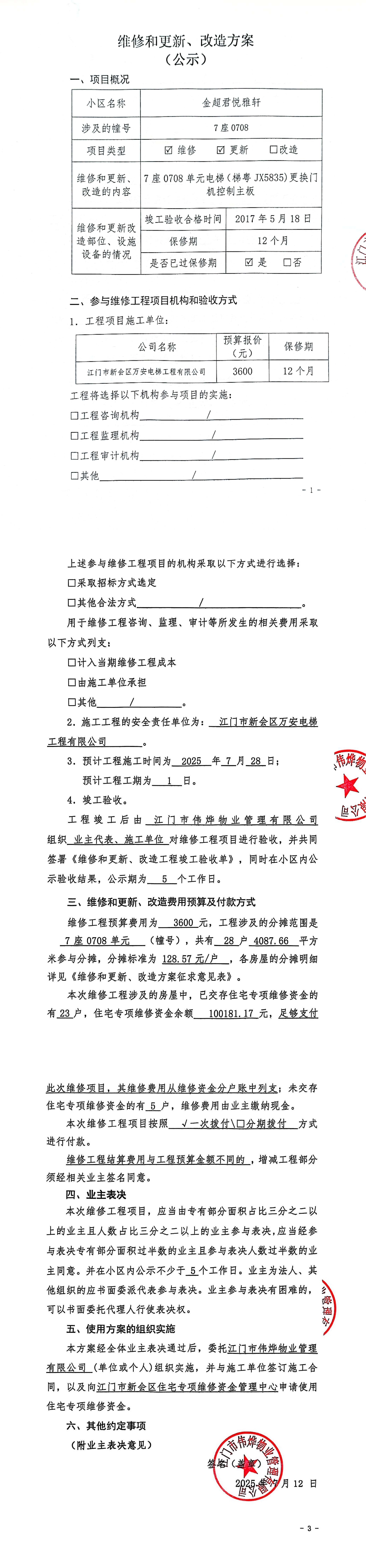 <td VALIGN="top" VALUES="" STYLE="border-width:0" BINDTYPE="0" ROWSPAN="17" COLSPAN="7" DATASOURCE="投票结果" ><font style=" font-family:方正小标宋简体;font-size:14pt;"><p style="line-height: 1.75em;"><span style="font-family: 宋体, SimSun;">各位尊敬的业主:</span><br/></p><p style="text-indent: 2em; line-height: 1.75em;"><span style="font-family: 宋体, SimSun;">根据法律法规的规定,本小区业主利用“江门市物业事项表决管理系统”已对本小区公共事务决策事项(<span style="font-family: 宋体; text-indent: 32px;">金超君悦雅轩7座0708电梯(梯粤JX5835)更换门机控制主板使用维修资金的投票</span>)进行了表决,在经过7日的询异公示期后,未收到业主有效的异议。现将投票结果公告,并就产生的法律效力说明如下:</span></p><p style="line-height: 1.75em; text-indent: 0em;"><strong style="text-indent: 2em;"><span style="font-family: 宋体, SimSun;">一、投票范围</span></strong></p><p style="text-indent: 2em; line-height: 1.75em;"><span style="font-family: 宋体, SimSun;">金超君悦雅轩7座</span></p><p style="text-indent: 2em; line-height: 1.75em;"><span style="font-family: 宋体, SimSun;">总人数(专有部分人数之和):28</span></p><p style="text-indent: 2em; line-height: 1.75em;"><span style="font-family: 宋体, SimSun;"><span style="font-family: 宋体, SimSun; text-indent: 32px;"><span style="font-family: 宋体; text-indent: 32px;"><span style="font-family: 宋体; text-indent: 32px;">总户数:28</span></span></span></span></p><p style="text-indent: 2em; line-height: 1.75em;"><span style="font-family: 宋体, SimSun;">建筑物总面积(专有部分面积之和):4087.66㎡</span></p><p style="line-height: 1.75em;"><strong><span style="font-family: 宋体, SimSun;">二、投票结果公告时间</span></strong></p><p style="text-indent: 2em; line-height: 1.75em;"><span style="font-family: 宋体, SimSun;"><span style="font-family: 宋体, SimSun; text-indent: 32px;">从2025年08月10日开始</span></span></p><p style="line-height: 1.75em;"><strong><span style="font-family: 宋体, SimSun;">三、计票规则</span></strong></p><p style="text-indent: 2em; line-height: 1.75em;"><span style="font-family: 宋体, SimSun;">表决事项:使用建筑物及其附属设施的维修资金<br /><p style='font-family: 宋体, SimSun;line-height: 1.75em; text-indent: 2em;'>计票规则:弃权票不并入其它项&nbsp;&nbsp;&nbsp;&nbsp;未表决票不并入其它项</p></span></p><p style="line-height: 1.75em;"><strong><span style="font-family: 宋体, SimSun;">四、通过规则</span></strong></p><p style="line-height: 1.75em;"><strong><span style="font-family: 宋体, SimSun;">&nbsp; 根据《中华人民共和国民法典》第二百七十八条规定:业主共同决定事项,应当由专有部分面积占比三分之二以上的业主且人数占比三分之二以上的业主参与表决。</span></strong></p><p style="text-indent: 2em; line-height: 1.75em;"><span style="font-family: 宋体, SimSun;"><span style="font-family: 宋体, SimSun; text-indent: 32px;">表决事项:使用建筑物及其附属设施的维修资金<br /><p style='font-family: 宋体, SimSun;line-height: 1.75em; text-indent: 2em;'>通过规则:双2/3以上参与表决,参与表决双过半同意</p></span></span></p><p style="line-height: 1.75em;"><strong><span style="font-family: 宋体, SimSun;">五、投票结果</span></strong></p><p style="line-height: 1.75em; text-indent: 2em;"><span style="font-family: 宋体, SimSun; text-indent: 2em;"><div id='resultTable'><table style='table-layout: fixed; font-size:12px; margin-top:10px' width='100%' border='0' cellspacing='0' cellpadding='0'><tr><td height='28' colspan='10' align='center' style='border: 1px solid #666'><strong style='font-size: 14px;'> 使用建筑物及其附属设施的维修资金</strong></td> </tr><tr id='trfirst'><td height='28' colspan='4' style='border-left: 1px solid #666; border-bottom: 1px solid #666'><strong>&nbsp;申报单位:</strong> 江门市伟烨物业管理有限公司</td><td colspan='3' style='border-left: 1px solid #666; border-bottom: 1px solid #666'><strong>&nbsp;联系方式:</strong> 0750-6123828 </td><td colspan='3' style='border-left: 1px solid #666; border-bottom: 1px solid #666; border-right: 1px solid #666'><strong>&nbsp;申报日期:</strong> 2025年7月12日 </td></tr><tr> <td height='28' colspan='5' style='border-left: 1px solid #666; border-bottom: 1px solid #666'><strong>&nbsp;列支总人数(专有部分人数之和):</strong>28人 </td><td colspan='5' style='border-left: 1px solid #666; border-bottom: 1px solid #666; border-right: 1px solid #666'><strong>&nbsp;列支建筑物总面积(专有部分面积之和):</strong>4087.66㎡ </td> </tr><tr><td height='28' colspan='10' bgcolor='#F3F3F3' style='border-left: 1px solid #666;border-bottom: 1px solid #666;border-right: 1px solid #666'><strong>&nbsp;参与表决人数及面积统计</strong></td></tr><tr><td height='28' colspan='5' style='border-left: 1px solid #666; border-bottom: 1px solid #666'><strong>&nbsp;参与表决人数:</strong>24人</td><td colspan='5' style='border-left: 1px solid #666; border-bottom: 1px solid #666; border-right: 1px solid #666'><strong>&nbsp;参与表决人数占总人数比例:</strong>85.71%</td></tr><tr><td height='28' colspan='5' style='border-left: 1px solid #666; border-bottom: 1px solid #666'><strong>&nbsp;参与表决面积:</strong>3517.46㎡</td><td colspan='5' style='border-left: 1px solid #666; border-bottom: 1px solid #666; border-right: 1px solid #666'><strong>&nbsp;参与表决面积占总面积比例:</strong>86.05%</td></tr><tr><td height='28' colspan='10' bgcolor='#F3F3F3' style='border-left: 1px solid #666; border-bottom: 1px solid #666;border-right: 1px solid #666'> <strong>&nbsp;参与表决同意人数及面积统计</strong></td> </tr><tr><td height='28' colspan='5' style='border-left: 1px solid 