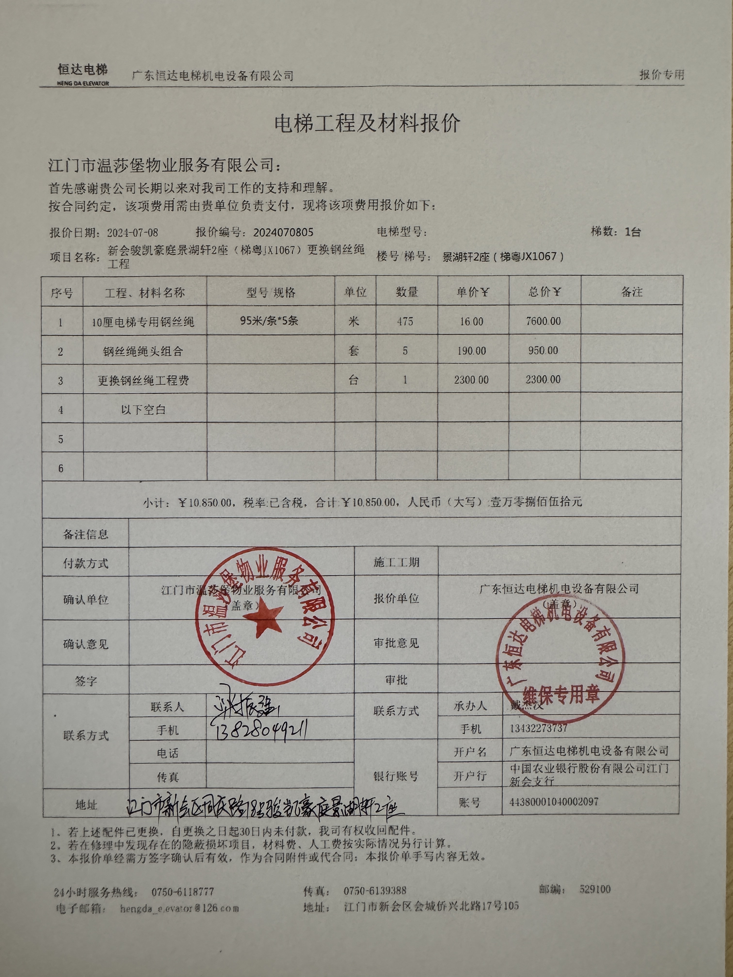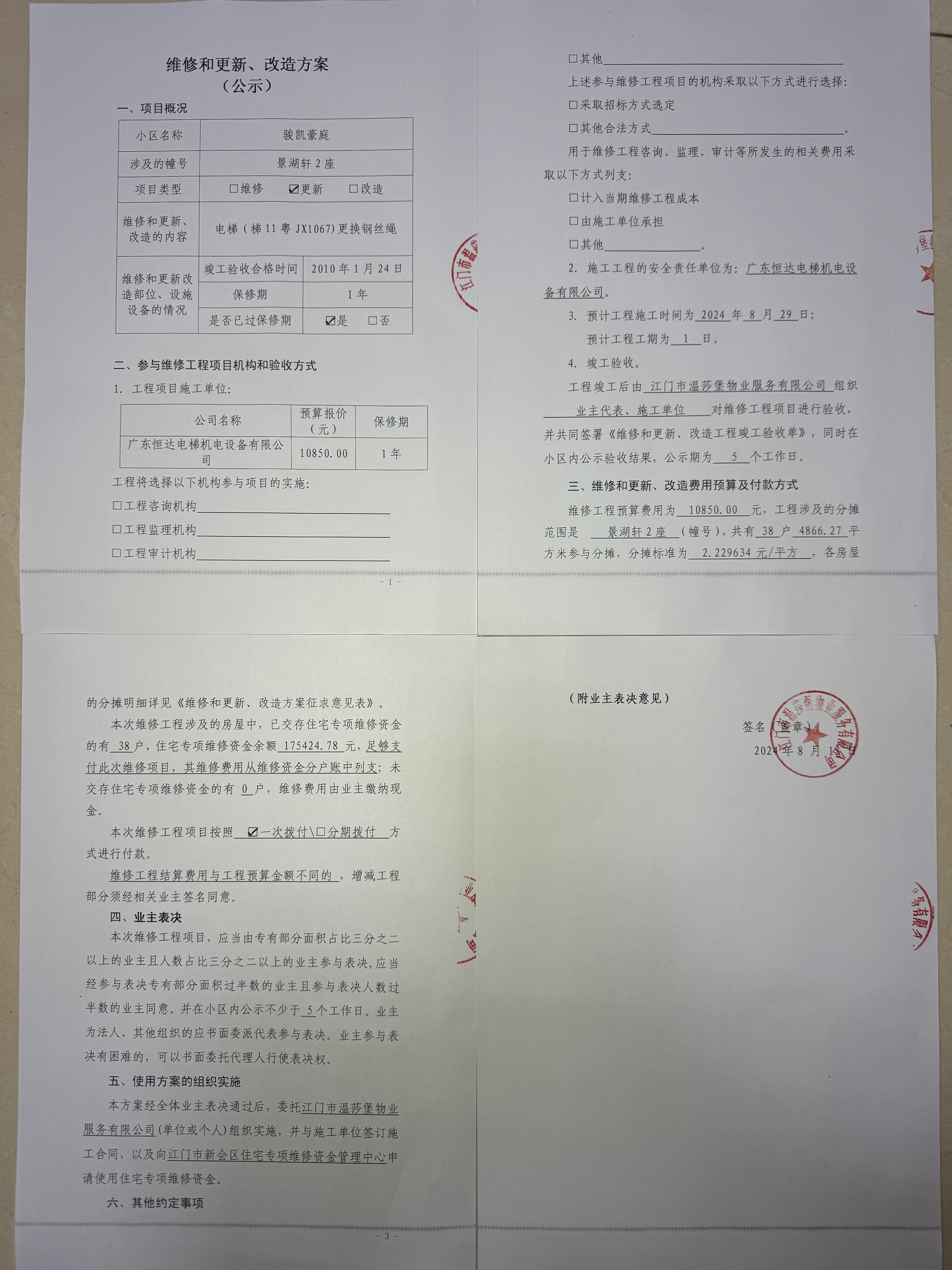 <td VALIGN="top" VALUES="" STYLE="border-width:0" BINDTYPE="0" ROWSPAN="19" COLSPAN="7" DATASOURCE="投票结果" ><font style="font-size:14pt;"><p style="white-space: normal; font-family: 宋体; line-height: 1.75em;">骏凯豪庭骏凯豪庭景湖轩2座全体业主:</p><p style="white-space: normal; font-family: 宋体; line-height: 1.75em; text-indent: 2em;">本小区关于骏凯豪庭景湖轩2座电梯(梯11粤JX1067)更换钢丝绳使用维修资金的投票的投票已表决结束,询异时间从2024年08月27日开始,投票询异公示期间,业主可通过微信查询自己的表决情况或可凭身份证件申请查询自己的表决情况;如公示的业主表决情况与查询的本人表决意见不一致的,可以以书面形式向投票组织机构申诉,投票组织机构予以纠正并重新公示表决结果。异议提出人对投票组织机构的处理仍有异议的,可以向街道办事处(镇人民政府)反映处理,涉及住宅专项维修资金的,可向属地住宅专项维修资金管理中心反映处理。</p><p style="white-space: normal;"><br/></p><p style="white-space: normal; font-family: 宋体; line-height: 1.75em;"><strong>附件:</strong></p><p style="white-space: normal; font-family: 宋体; line-height: 1.75em;"><strong>一、投票范围</strong></p><p style="white-space: normal; font-family: 宋体; line-height: 1.75em; text-indent: 2em;">骏凯豪庭骏凯豪庭景湖轩2座</p><p style="white-space: normal; font-family: 宋体; line-height: 1.75em; text-indent: 2em;">总人数(专有部分人数之和):37</p><p style="white-space: normal; font-family: 宋体; line-height: 1.75em; text-indent: 2em;"><span style="font-family: 宋体, SimSun;"><span style="font-family: 宋体; text-indent: 32px;"><span style="font-family: 宋体; text-indent: 32px;">总户数:38</span></span></span></p><p style="white-space: normal; font-family: 宋体; line-height: 1.75em; text-indent: 2em;">建筑物总面积(专有部分面积之和):4866.27㎡</p><p style="white-space: normal; font-family: 宋体; line-height: 1.75em;"><strong>二、询异公示起止时间</strong></p><p dir="ltr" style="white-space: normal; font-family: 宋体; line-height: 1.75em; text-indent: 2em;"><span style="text-indent: 36px;">2024年08月27日至2024年09月02日</span></p><p style="white-space: normal; font-family: 宋体; line-height: 1.75em;"><strong>三、投票详细描述</strong></p><p style="white-space: normal; font-family: 宋体; line-height: 1.75em; text-indent: 2em;"><p>骏凯豪庭景湖轩2座电梯(梯11粤JX1067)日常运行时出现晃动较大的现象,经检查,是由于电梯钢丝绳磨损严重导致。</p><p>现对景湖轩2座电梯(梯11粤JX1067)电梯钢丝绳进行更换,工程维修预算金额为10850.00元,项目最终费用以施工合同签订金额为准。因已过保修期,维修费用由相关业主按建筑面积分摊,每平方约2.229634元,详见公示附件。如业主手机不能正常通过微信投票,请联系物业公司进行线下纸质投票,物业电话:0750-6399789。</p></p><p style="white-space: normal; font-family: 宋体; line-height: 1.75em;"><strong>四、计票规则</strong></p><p style="white-space: normal; font-family: 宋体; line-height: 1.75em; text-indent: 2em;">表决事项:使用建筑物及其附属设施的维修资金<br /><p style='text-align: left; font-family: 宋体; font-size: 16px; line-height: 1.75em; text-indent: 2em;'>计票规则:弃权票不并入其它项 未表决票不并入其它项</p></p><p style="white-space: normal; font-family: 宋体; line-height: 1.75em;"><strong>五、通过规则</strong></p><p style="white-space: normal; font-family: 宋体; line-height: 1.75em;"><strong><strong style="white-space: normal;"><span style="font-family: 宋体, SimSun;"> 根据《中华人民共和国民法典》第二百七十八条规定:业主共同决定事项,应当由专有部分面积占比三分之二以上的业主且人数占比三分之二以上的业主参与表决。</span></strong></strong></p><p style="white-space: normal; font-family: 宋体; line-height: 1.75em; text-indent: 2em;">表决事项:使用建筑物及其附属设施的维修资金<br /><p style='text-align: left; font-family: 宋体; font-size: 16px; line-height: 1.75em; text-indent: 2em;'>通过规则:双2/3以上参与表决,参与表决双过半同意</p></p><p style="white-space: normal; font-family: 宋体; line-height: 1.75em;"><strong>六、投票结果</strong></p><p style="white-space: normal; font-family: 宋体; line-height: 1.75em; text-indent: 2em;"><div id='resultTable'><table style='table-layout: fixed; font-size:12px; margin-top:10px' width='100%' border='0' cellspacing='0' cellpadding='0'><tr><td height='28' colspan='10' align='center' style='border: 1px solid #666'><strong style='font-size: 14px;'> 使用建筑物及其附属设施的维修资金</strong></td> </tr><tr id='trfirst'><td height='28' colspan='4' style='border-left: 1px solid #666; border-bottom: 1px solid #666'><strong> 申报单位:</strong> 江门市温莎堡物业服务有限公司</td><td colspan='3' style='border-left: 1px solid #666; border-bottom: 1px solid #666'><strong> 联系方式:</strong> 07506392388 </td><td colspan='3' style='border-left: 1px solid #666; border-bottom: 1px solid #666; border-right: 1px solid #666'><strong> 申报日期:</strong> 2024年8月13日 </td></tr><tr> <td height='28' colspan='5' style='border-left: 1px solid #666; border-bottom: 1px solid #666'><strong> 总人数(专有部分人数之和):</strong>37人 </td><td colspan='5' style='border-left: 1px solid #666; border-bottom: 1px solid #666; border-right: 1px solid #666'><strong> 建筑物总面积(专有部分面积之和):</strong>4866.27㎡ </td> </tr><tr><td height='28' colspan='10' bgcolor='#F3F3F3' style='border-left: 1px solid #666;border-bottom: 1px solid #666;border-right: 1px solid #666'><strong> 参与人数及面积统计</strong></td></tr><tr><td