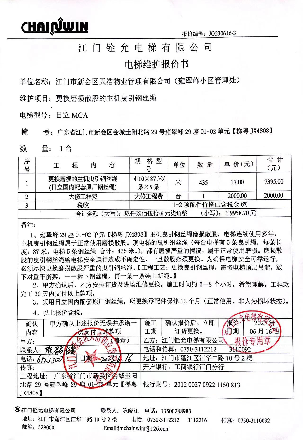 <td VALIGN="top" VALUES="" STYLE="border-width:0" BINDTYPE="0" ROWSPAN="19" COLSPAN="7" DATASOURCE="投票结果" ><font style="font-size:14pt;"><p style="white-space: normal; font-family: 宋体; line-height: 1.75em;">雍翠峰雍翠峰29座全体业主:</p><p style="white-space: normal; font-family: 宋体; line-height: 1.75em; text-indent: 2em;">本小区关于雍翠峰29座0102电梯更换磨损的主机曳引钢丝绳使用维修资金的投票的投票已表决结束,询异时间从2023年07月11日开始,投票询异公示期间,业主可通过微信查询自己的表决情况或可凭身份证件申请查询自己的表决情况;如公示的业主表决情况与查询的本人表决意见不一致的,可以以书面形式向投票组织机构申诉,投票组织机构予以纠正并重新公示表决结果。异议提出人对投票组织机构的处理仍有异议的,可以向街道办事处(镇人民政府)反映处理,涉及住宅专项维修资金的,可向属地住宅专项维修资金管理中心反映处理。</p><p style="white-space: normal;"><br/></p><p style="white-space: normal; font-family: 宋体; line-height: 1.75em;"><strong>附件:</strong></p><p style="white-space: normal; font-family: 宋体; line-height: 1.75em;"><strong>一、投票范围</strong></p><p style="white-space: normal; font-family: 宋体; line-height: 1.75em; text-indent: 2em;">雍翠峰雍翠峰29座</p><p style="white-space: normal; font-family: 宋体; line-height: 1.75em; text-indent: 2em;">总人数(专有部分人数之和):20</p><p style="white-space: normal; font-family: 宋体; line-height: 1.75em; text-indent: 2em;"><span style="font-family: 宋体, SimSun;">总户数:20</span></p><p style="white-space: normal; font-family: 宋体; line-height: 1.75em; text-indent: 2em;">建筑物总面积(专有部分面积之和):2578.44㎡</p><p style="white-space: normal; font-family: 宋体; line-height: 1.75em;"><strong>二、询异公示起止时间</strong></p><p dir="ltr" style="white-space: normal; font-family: 宋体; line-height: 1.75em; text-indent: 2em;"><span style="text-indent: 36px;">2023年07月11日至2023年07月17日</span></p><p style="white-space: normal; font-family: 宋体; line-height: 1.75em;"><strong>三、投票详细描述</strong></p><p style="white-space: normal; font-family: 宋体; line-height: 1.75em; text-indent: 2em;"><p>雍翠峰29座0102的电梯日常运行时发生故障困人,经检查发现电梯主机曳引式钢丝绳磨损散股(日常使用,自然磨损损坏)已过保修期。现需申请使用维修资金对29座0102电梯进行维修,工程维修预算金额为9958.7元,项目最终费用以施工合同签订金额为准。维修费用的分摊标准为按分户分摊,每户分摊497.94元,详见公示附件。如业主手机不能正常通过维修投票,请联系物业公司进行线下纸质投票,物业电话:0750-6125500</p></p><p style="white-space: normal; font-family: 宋体; line-height: 1.75em;"><strong>四、计票规则</strong></p><p style="white-space: normal; font-family: 宋体; line-height: 1.75em; text-indent: 2em;">表决事项:使用建筑物及其附属设施的维修资金<br /><p style='text-align: left; font-family: 宋体; font-size: 16px; line-height: 1.75em; text-indent: 2em;'>计票规则:弃权票不并入其它项 未表决票不并入其它项</p></p><p style="white-space: normal; font-family: 宋体; line-height: 1.75em;"><strong>五、通过规则</strong></p><p style="white-space: normal; font-family: 宋体; line-height: 1.75em; text-indent: 2em;">表决事项:使用建筑物及其附属设施的维修资金<br /><p style='text-align: left; font-family: 宋体; font-size: 16px; line-height: 1.75em; text-indent: 2em;'>通过规则:参与表决专有部分面积过半数的业主且参与表决人数过半数的业主同意</p></p><p style="white-space: normal; font-family: 宋体; line-height: 1.75em;"><strong>六、投票结果</strong></p><p style="white-space: normal; font-family: 宋体; line-height: 1.75em; text-indent: 2em;"><div id='resultTable'><table style='table-layout: fixed; font-size:12px; margin-top:10px' width='100%' border='0' cellspacing='0' cellpadding='0'><tr><td height='28' colspan='10' align='center' style='border: 1px solid #666'><strong style='font-size: 14px;'> 使用建筑物及其附属设施的维修资金</strong></td> </tr><tr id='trfirst'><td height='28' colspan='4' style='border-left: 1px solid #666; border-bottom: 1px solid #666'><strong> 申报单位:</strong> 江门市新会区天浩物业管理有限公司</td><td colspan='3' style='border-left: 1px solid #666; border-bottom: 1px solid #666'><strong> 联系方式:</strong> </td><td colspan='3' style='border-left: 1px solid #666; border-bottom: 1px solid #666; border-right: 1px solid #666'><strong> 申报日期:</strong> 2023年7月6日 </td></tr><tr> <td height='28' colspan='5' style='border-left: 1px solid #666; border-bottom: 1px solid #666'><strong> 总人数(专有部分人数之和):</strong>20人 </td><td colspan='5' style='border-left: 1px solid #666; border-bottom: 1px solid #666; border-right: 1px solid #666'><strong> 建筑物总面积(专有部分面积之和):</strong>2578.44㎡ </td> </tr><tr><td height='28' colspan='10' bgcolor='#F3F3F3' style='border-left: 1px solid #666;border-bottom: 1px solid #666;border-right: 1px solid #666'><strong> 参与人数及面积统计</strong></td></tr><tr><td height='28' colspan='5' style='border-left: 1px solid #666; border-bottom: 1px solid #666'><strong> 参与表决专有部分人数之和:</strong>15人</td><td colspan='5' style='border-left: 1px solid #666; border-bottom: 1px solid #666; border-right: 1px solid #666'><strong> 参与表决占有表决权总人数比例:</strong>75.00%</td></tr><tr><td height='28' colspan='5' style='border-left: 1px solid #666; border-bottom: 1px solid #666'><strong> 参与表决专有部分面积之和:</strong>1967.15㎡</td><td colspan='5' style='bor
