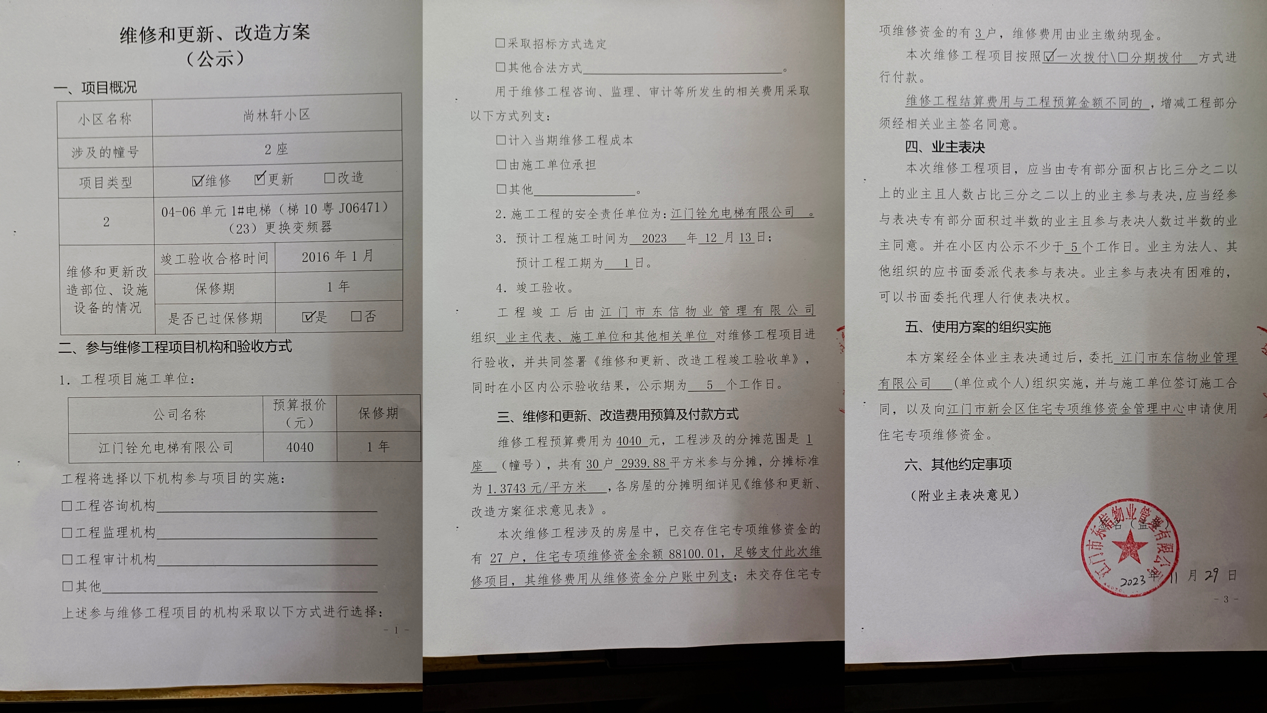 <td valign="top" values="" style="border-width:0" bindtype="0" rowspan="17" colspan="7" datasource="投票结果"><font style=" font-family:方正小标宋简体;font-size:14pt;"><p style="line-height: 1.75em;"><span style="font-family: 宋体, SimSun;">各位尊敬的业主:</span><br></p><p style="text-indent: 2em; line-height: 1.75em;"><span style="font-family: 宋体, SimSun;">根据法律法规的规定,本小区业主利用“江门市物业事项表决管理系统”已对本小区公共事务决策事项进行了表决,在经过7日的询异公示期后,未收到业主有效的异议。现将投票结果公告,并就产生的法律效力说明如下:</span></p><p style="line-height: 1.75em; text-indent: 0em;"><strong style="text-indent: 2em;"><span style="font-family: 宋体, SimSun;">一、投票范围</span></strong></p><p style="text-indent: 2em; line-height: 1.75em;"><span style="font-family: 宋体, SimSun;">尚林轩小区尚林轩2座</span></p><p style="text-indent: 2em; line-height: 1.75em;"><span style="font-family: 宋体, SimSun;">总人数(专有部分人数之和):30</span></p><p style="text-indent: 2em; line-height: 1.75em;"><span style="font-family: 宋体, SimSun;"><span style="font-family: 宋体, SimSun; text-indent: 32px;"><span style="font-family: 宋体; text-indent: 32px;">总户数:30</span></span></span></p><p style="text-indent: 2em; line-height: 1.75em;"><span style="font-family: 宋体, SimSun;">建筑物总面积(专有部分面积之和):2939.88㎡</span></p><p style="line-height: 1.75em;"><strong><span style="font-family: 宋体, SimSun;">二、投票结果公告时间</span></strong></p><p style="text-indent: 2em; line-height: 1.75em;"><span style="font-family: 宋体, SimSun;">从2023年12月08日开始</span></p><p style="line-height: 1.75em;"><strong><span style="font-family: 宋体, SimSun;">三、计票规则</span></strong></p><p style="text-indent: 2em; line-height: 1.75em;"><span style="font-family: 宋体, SimSun;">表决事项:使用建筑物及其附属设施的维修资金<br></span></p><p style="font-family: 宋体, SimSun;line-height: 1.75em; text-indent: 2em;">计票规则:弃权票不并入其它项 未表决票不并入其它项</p><p></p><p style="line-height: 1.75em;"><strong><span style="font-family: 宋体, SimSun;">四、通过规则</span></strong></p><p style="line-height: 1.75em;"><strong><span style="font-family: 宋体, SimSun;"> 根据《中华人民共和国民法典》第二百七十八条规定:业主共同决定事项,应当由专有部分面积占比三分之二以上的业主且人数占比三分之二以上的业主参与表决。</span></strong></p><p style="text-indent: 2em; line-height: 1.75em;"><span style="font-family: 宋体, SimSun;"><span style="font-family: 宋体, SimSun; text-indent: 32px;">表决事项:使用建筑物及其附属设施的维修资金<br></span></span></p><p style="font-family: 宋体, SimSun;line-height: 1.75em; text-indent: 2em;">通过规则:参与表决专有部分面积四分之三以上的业主且参与表决人数四分之三以上的业主同意</p><p></p><p style="line-height: 1.75em;"><strong><span style="font-family: 宋体, SimSun;">五、投票结果</span></strong></p><p style="line-height: 1.75em; text-indent: 2em;"><span style="font-family: 宋体, SimSun; text-indent: 2em;"></span></p><div id="resultTable"><table style="table-layout: fixed; font-size:12px; margin-top:10px" width="100%" border="0" cellspacing="0" cellpadding="0"><tbody><tr><td height="28" colspan="10" align="center" style="border: 1px solid #666"><strong style="font-size: 14px;"> 使用建筑物及其附属设施的维修资金</strong></td> </tr><tr id="trfirst"><td height="28" colspan="4" style="border-left: 1px solid #666; border-bottom: 1px solid #666"><strong> 申报单位:</strong> 江门市东信物业管理有限公司</td><td colspan="3" style="border-left: 1px solid #666; border-bottom: 1px solid #666"><strong> 联系方式:</strong> 0750-6683199 </td><td colspan="3" style="border-left: 1px solid #666; border-bottom: 1px solid #666; border-right: 1px solid #666"><strong> 申报日期:</strong> 2023年11月29日 </td></tr><tr> <td height="28" colspan="5" style="border-left: 1px solid #666; border-bottom: 1px solid #666"><strong> 总人数(专有部分人数之和):</strong>30人 </td><td colspan="5" style="border-left: 1px solid #666; border-bottom: 1px solid #666; border-right: 1px solid #666"><strong> 建筑物总面积(专有部分面积之和):</strong>2939.88㎡ </td> </tr><tr><td height="28" colspan="10" bgcolor="#F3F3F3" style="border-left: 1px solid #666;border-bottom: 1px solid #666;border-right: 1px solid #666"><strong> 参与人数及面积统计</strong></td></tr><tr><td height="28" colspan="5" style="border-left: 1px solid #666; border-bottom: 1px solid #666"><strong> 参与表决专有部分人数之和:</strong>23人</td><td colspan="5" style="border-left: 1px solid #666; border-bottom: 1px solid #666; border-right: 1px solid #666"><strong> 参与表决占有表决权总人数比例:</strong>76.67%</td></tr><tr><td height="28" colspan="5" style="border-left: 1px solid #666; border-bottom: 1px solid #666"><strong> 参与表决专有部分面积之和:</strong>2256.94㎡</td><td colspan="5" style="border-left: 1px solid #666; border-bottom: 1px solid #666; border-right: 1px solid #666"><strong> 参与表决占有表决权总面积比例:</strong>76.77%</td></tr><tr><td height="28" colspan="10" bgcolor="#F3F3F3" style="border-left: 1px solid #666; border-bottom: 1px solid #666;border-right: 1px solid #666"> <strong> 未参与人数及面积统计</strong></td> </tr><tr><td height="28" colspan="5" style="border-left: 1px solid #666; border-bottom: 1px solid #666"><strong> 未参与表决专有部分人数之和:</strong>7人 </td><td colspan="5" style="border-left: 1px solid #666; border-bottom: 1px solid #666; border-right: 1px solid #666"><strong> 未参与表决占有表决权总