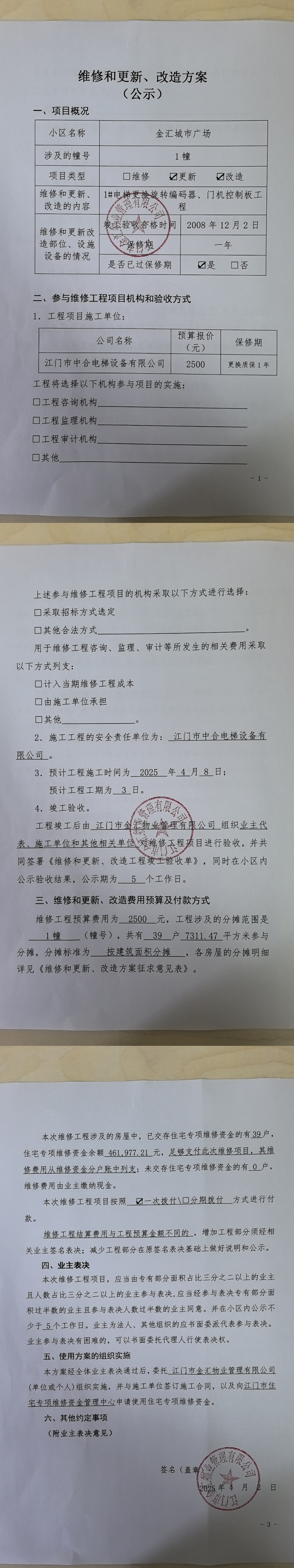 <td VALIGN="top" VALUES="" STYLE="border-width:0" BINDTYPE="0" ROWSPAN="17" COLSPAN="7" DATASOURCE="投票结果" ><font style=" font-family:方正小标宋简体;font-size:14pt;"><p style="line-height: 1.75em;"><span style="font-family: 宋体, SimSun;">各位尊敬的业主:</span><br/></p><p style="text-indent: 2em; line-height: 1.75em;"><span style="font-family: 宋体, SimSun;">根据法律法规的规定,本小区业主利用“江门市物业事项表决管理系统”已对本小区公共事务决策事项(<span style="font-family: 宋体; text-indent: 32px;">金汇城市广场关于1幢1#电梯更换旋转编码器及门机控制板工程使用维修资金的投票</span>)进行了表决,在经过7日的询异公示期后,未收到业主有效的异议。现将投票结果公告,并就产生的法律效力说明如下:</span></p><p style="line-height: 1.75em; text-indent: 0em;"><strong style="text-indent: 2em;"><span style="font-family: 宋体, SimSun;">一、投票范围</span></strong></p><p style="text-indent: 2em; line-height: 1.75em;"><span style="font-family: 宋体, SimSun;">金汇城市广场金汇城市广场1栋</span></p><p style="text-indent: 2em; line-height: 1.75em;"><span style="font-family: 宋体, SimSun;">总人数(专有部分人数之和):38</span></p><p style="text-indent: 2em; line-height: 1.75em;"><span style="font-family: 宋体, SimSun;"><span style="font-family: 宋体, SimSun; text-indent: 32px;"><span style="font-family: 宋体; text-indent: 32px;"><span style="font-family: 宋体; text-indent: 32px;">总户数:39</span></span></span></span></p><p style="text-indent: 2em; line-height: 1.75em;"><span style="font-family: 宋体, SimSun;">建筑物总面积(专有部分面积之和):7311.47㎡</span></p><p style="line-height: 1.75em;"><strong><span style="font-family: 宋体, SimSun;">二、投票结果公告时间</span></strong></p><p style="text-indent: 2em; line-height: 1.75em;"><span style="font-family: 宋体, SimSun;"><span style="font-family: 宋体, SimSun; text-indent: 32px;">从2025年05月26日开始</span></span></p><p style="line-height: 1.75em;"><strong><span style="font-family: 宋体, SimSun;">三、计票规则</span></strong></p><p style="text-indent: 2em; line-height: 1.75em;"><span style="font-family: 宋体, SimSun;">表决事项:使用建筑物及其附属设施的维修资金<br /><p style='font-family: 宋体, SimSun;line-height: 1.75em; text-indent: 2em;'>计票规则:弃权票不并入其它项&nbsp;&nbsp;&nbsp;&nbsp;未表决票不并入其它项</p></span></p><p style="line-height: 1.75em;"><strong><span style="font-family: 宋体, SimSun;">四、通过规则</span></strong></p><p style="line-height: 1.75em;"><strong><span style="font-family: 宋体, SimSun;">&nbsp; 根据《中华人民共和国民法典》第二百七十八条规定:业主共同决定事项,应当由专有部分面积占比三分之二以上的业主且人数占比三分之二以上的业主参与表决。</span></strong></p><p style="text-indent: 2em; line-height: 1.75em;"><span style="font-family: 宋体, SimSun;"><span style="font-family: 宋体, SimSun; text-indent: 32px;">表决事项:使用建筑物及其附属设施的维修资金<br /><p style='font-family: 宋体, SimSun;line-height: 1.75em; text-indent: 2em;'>通过规则:双2/3以上参与表决,参与表决双过半同意</p></span></span></p><p style="line-height: 1.75em;"><strong><span style="font-family: 宋体, SimSun;">五、投票结果</span></strong></p><p style="line-height: 1.75em; text-indent: 2em;"><span style="font-family: 宋体, SimSun; text-indent: 2em;"><div id='resultTable'><table style='table-layout: fixed; font-size:12px; margin-top:10px' width='100%' border='0' cellspacing='0' cellpadding='0'><tr><td height='28' colspan='10' align='center' style='border: 1px solid #666'><strong style='font-size: 14px;'> 使用建筑物及其附属设施的维修资金</strong></td> </tr><tr id='trfirst'><td height='28' colspan='4' style='border-left: 1px solid #666; border-bottom: 1px solid #666'><strong>&nbsp;申报单位:</strong> 江门市金汇物业管理有限公司</td><td colspan='3' style='border-left: 1px solid #666; border-bottom: 1px solid #666'><strong>&nbsp;联系方式:</strong> 3929003 </td><td colspan='3' style='border-left: 1px solid #666; border-bottom: 1px solid #666; border-right: 1px solid #666'><strong>&nbsp;申报日期:</strong> 2025年4月2日 </td></tr><tr> <td height='28' colspan='5' style='border-left: 1px solid #666; border-bottom: 1px solid #666'><strong>&nbsp;列支总人数(专有部分人数之和):</strong>38人 </td><td colspan='5' style='border-left: 1px solid #666; border-bottom: 1px solid #666; border-right: 1px solid #666'><strong>&nbsp;列支建筑物总面积(专有部分面积之和):</strong>7311.47㎡ </td> </tr><tr><td height='28' colspan='10' bgcolor='#F3F3F3' style='border-left: 1px solid #666;border-bottom: 1px solid #666;border-right: 1px solid #666'><strong>&nbsp;参与表决人数及面积统计</strong></td></tr><tr><td height='28' colspan='5' style='border-left: 1px solid #666; border-bottom: 1px solid #666'><strong>&nbsp;参与表决人数:</strong>27人</td><td colspan='5' style='border-left: 1px solid #666; border-bottom: 1px solid #666; border-right: 1px solid #666'><strong>&nbsp;参与表决人数占总人数比例:</strong>71.05%</td></tr><tr><td height='28' colspan='5' style='border-left: 1px solid #666; border-bottom: 1px solid #666'><strong>&nbsp;参与表决面积:</strong>5352.71㎡</td><td colspan='5' style='border-left: 1px solid #666; border-bottom: 1px solid #666; border-right: 1px solid #666'><strong>&nbsp;参与表决面积占总面积比例:</strong>73.21%</td></tr><tr><td height='28' colspan='10' bgcolor='#F3F3F3' style='border-left: 1px solid #666; border-bottom: 1px solid #666;border-right: 1px solid #666'> <strong>&nbsp;参与表决同意人数及面积统计</strong></td> </tr><tr><td height='28' colspan='5' style='