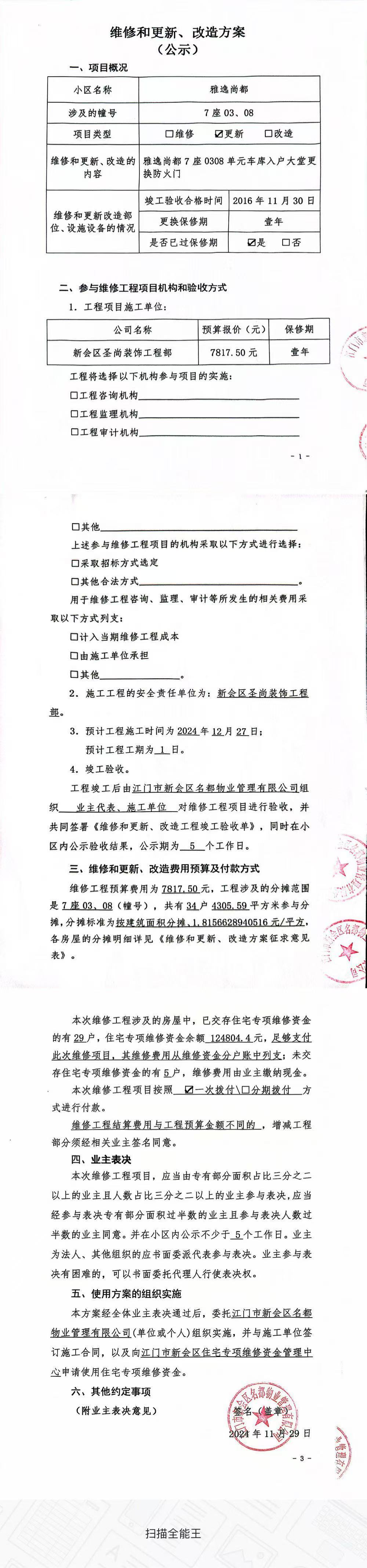 <td VALIGN="top" VALUES="" STYLE="border-width:0" BINDTYPE="0" ROWSPAN="19" COLSPAN="7" DATASOURCE="投票结果" ><font style="font-size:14pt;"><p style="white-space: normal; font-family: 宋体; line-height: 1.75em;">雅逸尚都雅逸尚都7座全体业主:</p><p style="white-space: normal; font-family: 宋体; line-height: 1.75em; text-indent: 2em;">本小区关于雅逸尚都7座0308单元车库入户大堂更换防火门使用维修资金的投票的投票已表决结束,询异时间从2025年01月10日开始,投票询异公示期间,业主可通过微信查询自己的表决情况或可凭身份证件申请查询自己的表决情况;如公示的业主表决情况与查询的本人表决意见不一致的,可以以书面形式向投票组织机构申诉,投票组织机构予以纠正并重新公示表决结果。异议提出人对投票组织机构的处理仍有异议的,可以向街道办事处(镇人民政府)反映处理,涉及住宅专项维修资金的,可向属地住宅专项维修资金管理中心反映处理。</p><p style="white-space: normal;"><br/></p><p style="white-space: normal; font-family: 宋体; line-height: 1.75em;"><strong>附件:</strong></p><p style="white-space: normal; font-family: 宋体; line-height: 1.75em;"><strong>一、投票范围</strong></p><p style="white-space: normal; font-family: 宋体; line-height: 1.75em; text-indent: 2em;">雅逸尚都雅逸尚都7座</p><p style="white-space: normal; font-family: 宋体; line-height: 1.75em; text-indent: 2em;">总人数(专有部分人数之和):34</p><p style="white-space: normal; font-family: 宋体; line-height: 1.75em; text-indent: 2em;"><span style="font-family: 宋体, SimSun;"><span style="font-family: 宋体; text-indent: 32px;"><span style="font-family: 宋体; text-indent: 32px;">总户数:34</span></span></span></p><p style="white-space: normal; font-family: 宋体; line-height: 1.75em; text-indent: 2em;">建筑物总面积(专有部分面积之和):4305.59㎡</p><p style="white-space: normal; font-family: 宋体; line-height: 1.75em;"><strong>二、询异公示起止时间</strong></p><p dir="ltr" style="white-space: normal; font-family: 宋体; line-height: 1.75em; text-indent: 2em;"><span style="text-indent: 36px;">2025年01月10日至2025年01月20日</span></p><p style="white-space: normal; font-family: 宋体; line-height: 1.75em;"><strong>三、投票详细描述</strong></p><p style="white-space: normal; font-family: 宋体; line-height: 1.75em; text-indent: 2em;"><p><span style="font-family: "Helvetica Neue", Helvetica, Arial, sans-serif; font-size: 14px; text-wrap: wrap; background-color: rgb(255, 255, 255);">本小区7座0308单元车库入户大堂防火门经常坏,经师傅多次维修仍会坏,因使用时间较<span style="font-family: "Helvetica Neue", Helvetica, Arial, sans-serif; font-size: 14px; text-wrap-mode: wrap; background-color: rgb(255, 255, 255);">长和使用的人较多,经常出现门坏和严重变型导致锁不了门</span>。现对7座0308单元车库入户大堂防火门进行更换,</span><span style="font-family: "Helvetica Neue", Helvetica, Arial, sans-serif; font-size: 14px; text-wrap: wrap; background-color: rgb(255, 255, 255);">工程维修预算金额为7817.50元,项目最终费用以施工合同签订金额为准。因已过保修期,维修费用的分摊标准为按建筑面积分摊,<span style="text-wrap-style: initial;">每平方约1.8156628940516元,详见公示附件</span>。如业主手机不能正常通过微信投票,请联系物业公司进行线下纸质投票,物业电话:0750-6609908。</span></p></p><p style="white-space: normal; font-family: 宋体; line-height: 1.75em;"><strong>四、计票规则</strong></p><p style="white-space: normal; font-family: 宋体; line-height: 1.75em; text-indent: 2em;">表决事项:使用建筑物及其附属设施的维修资金<br /><p style='text-align: left; font-family: 宋体; font-size: 16px; line-height: 1.75em; text-indent: 2em;'>计票规则:弃权票不并入其它项 未表决票不并入其它项</p></p><p style="white-space: normal; font-family: 宋体; line-height: 1.75em;"><strong>五、通过规则</strong></p><p style="white-space: normal; font-family: 宋体; line-height: 1.75em;"><strong><strong style="white-space: normal;"><span style="font-family: 宋体, SimSun;"> 根据《中华人民共和国民法典》第二百七十八条规定:业主共同决定事项,应当由专有部分面积占比三分之二以上的业主且人数占比三分之二以上的业主参与表决。</span></strong></strong></p><p style="white-space: normal; font-family: 宋体; line-height: 1.75em; text-indent: 2em;">表决事项:使用建筑物及其附属设施的维修资金<br /><p style='text-align: left; font-family: 宋体; font-size: 16px; line-height: 1.75em; text-indent: 2em;'>通过规则:双2/3以上参与表决,参与表决双过半同意</p></p><p style="white-space: normal; font-family: 宋体; line-height: 1.75em;"><strong>六、投票结果</strong></p><p style="white-space: normal; font-family: 宋体; line-height: 1.75em; text-indent: 2em;"><div id='resultTable'><table style='table-layout: fixed; font-size:12px; margin-top:10px' width='100%' border='0' cellspacing='0' cellpadding='0'><tr><td height='28' colspan='10' align='center' style='border: 1px solid #666'><strong style='font-size: 14px;'> 使用建筑物及其附属设施的维修资金</strong></td> </tr><tr id='trfirst'><td height='28' colspan='4' style='border-left: 1px solid #666; border-bottom: 1px solid #666'><strong> 申报单位:</strong> 江门市新会区名都物业管理有限公司</td><td colspan='3' style='border-left: 1px solid #666; border-bottom: 1px solid #666'><strong> 联系方式:</strong> 6609908 </td><td colspan='3' style='border-left: 1px solid #666; border-bottom: 1px solid #666; border-right: 1px solid #666'><strong> 申报日期:</strong> 2024年12月3日 </td></tr><tr> <td height='28' colspan='5' style='