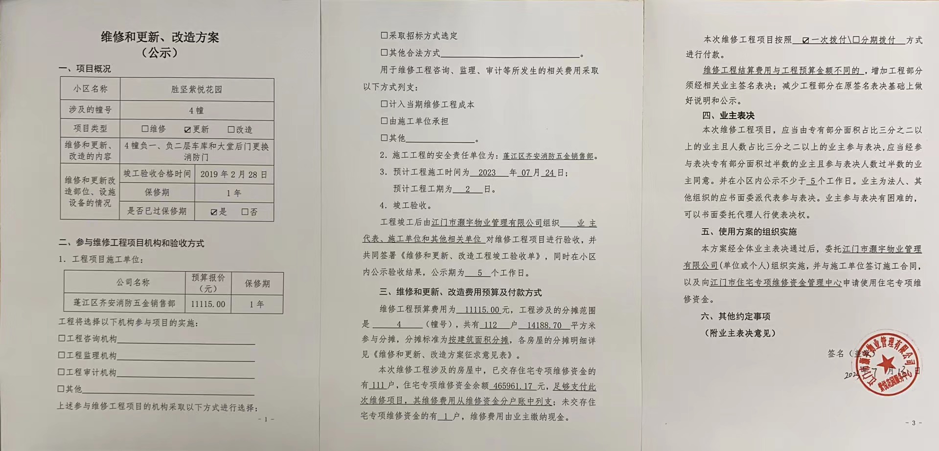 <td valign="top" values="" style="border-width:0" bindtype="0" rowspan="19" colspan="7" datasource="投票结果"><font style="font-size:14pt;"><p style="white-space: normal; font-family: 宋体; line-height: 1.75em;">蓬江区胜坚紫悦花园蓬江区胜坚紫悦花园4幢全体业主:</p><p style="white-space: normal; font-family: 宋体; line-height: 1.75em; text-indent: 2em;">本小区关于胜坚紫悦花园4幢负一、负二层车库和大堂后门更换消防门的投票已表决结束,询异时间从2023年07月25日开始,投票询异公示期间,业主可通过微信查询自己的表决情况或可凭身份证件申请查询自己的表决情况;如公示的业主表决情况与查询的本人表决意见不一致的,可以以书面形式向投票组织机构申诉,投票组织机构予以纠正并重新公示表决结果。异议提出人对投票组织机构的处理仍有异议的,可以向街道办事处(镇人民政府)反映处理,涉及住宅专项维修资金的,可向属地住宅专项维修资金管理中心反映处理。</p><p style="white-space: normal;"><br></p><p style="white-space: normal; font-family: 宋体; line-height: 1.75em;"><strong>附件:</strong></p><p style="white-space: normal; font-family: 宋体; line-height: 1.75em;"><strong>一、投票范围</strong></p><p style="white-space: normal; font-family: 宋体; line-height: 1.75em; text-indent: 2em;">蓬江区胜坚紫悦花园蓬江区胜坚紫悦花园4幢</p><p style="white-space: normal; font-family: 宋体; line-height: 1.75em; text-indent: 2em;">总人数(专有部分人数之和):110</p><p style="white-space: normal; font-family: 宋体; line-height: 1.75em; text-indent: 2em;"><span style="font-family: 宋体, SimSun;">总户数:112</span></p><p style="white-space: normal; font-family: 宋体; line-height: 1.75em; text-indent: 2em;">建筑物总面积(专有部分面积之和):14188.70㎡</p><p style="white-space: normal; font-family: 宋体; line-height: 1.75em;"><strong>二、询异公示起止时间</strong></p><p dir="ltr" style="white-space: normal; font-family: 宋体; line-height: 1.75em; text-indent: 2em;"><span style="text-indent: 36px;">2023年07月25日至2023年07月31日</span></p><p style="white-space: normal; font-family: 宋体; line-height: 1.75em;"><strong>三、投票详细描述</strong></p><p style="white-space: normal; font-family: 宋体; line-height: 1.75em; text-indent: 2em;"></p><p><span style="font-family: 楷体, 楷体_GB2312, SimKai; font-size: 18px;"><span style="font-family: 楷体, 楷体_GB2312, SimKai; background-color: rgb(255, 255, 255);">本小区</span>4<span style="font-family: 楷体, 楷体_GB2312, SimKai; color: rgb(0, 0, 8);">幢负一、负二层</span>车库及大堂后门的三套消防门严重变形,<span style="font-family: 楷体, 楷体_GB2312, SimKai; background-color: rgb(255, 255, 255);">门锁损坏不能正常关闭,物业服务中心一直在反复维修和整改,再无法维修使用,为了尽早排除安全隐患,现需要更换消防门。由于<span style="font-family: 楷体, 楷体_GB2312, SimKai; font-size: 18px;">4</span><span style="font-family: 楷体, 楷体_GB2312, SimKai; font-size: 18px; color: rgb(0, 0, 8);">幢负一、负二层</span><span style="font-family: 楷体, 楷体_GB2312, SimKai; font-size: 18px;">车库及大堂后门</span>的消防门已过保修期。现需申请使用维修资<span style="font-family: 楷体, 楷体_GB2312, SimKai; background-color: rgb(255, 255, 255);"></span>金对4幢消防门进行更换,更换金额为:11115.00元,项目最终费用以消防设备报价合同签订金额为准。更换消防门费用的分摊标准为按建筑面积分摊,每平方约:0.7833元,详见公示附件。如业主手机不能正常通过微信投票,请联系物业公司进行线下纸质投票,物业电话:0750-3339221。</span></span></p><p><span style="font-family: " helvetica="" neue",="" helvetica,="" arial,="" sans-serif;="" font-size:="" 14px;="" background-color:="" rgb(255,="" 255,="" 255);"=""></span></p><p></p><p style="white-space: normal; font-family: 宋体; line-height: 1.75em;"><strong>四、计票规则</strong></p><p style="white-space: normal; font-family: 宋体; line-height: 1.75em; text-indent: 2em;">表决事项:使用建筑物及其附属设施的维修资金<br></p><p style="text-align: left; font-family: 宋体; font-size: 16px; line-height: 1.75em; text-indent: 2em;">计票规则:弃权票不并入其它项 未表决票不并入其它项</p><p></p><p style="white-space: normal; font-family: 宋体; line-height: 1.75em;"><strong>五、通过规则</strong></p><p style="white-space: normal; font-family: 宋体; line-height: 1.75em; text-indent: 2em;">表决事项:使用建筑物及其附属设施的维修资金<br></p><p style="text-align: left; font-family: 宋体; font-size: 16px; line-height: 1.75em; text-indent: 2em;">通过规则:参与表决专有部分面积过半数的业主且参与表决人数过半数的业主同意</p><p></p><p style="white-space: normal; font-family: 宋体; line-height: 1.75em;"><strong>六、投票结果</strong></p><p style="white-space: normal; font-family: 宋体; line-height: 1.75em; text-indent: 2em;"></p><div id="resultTable"><table style="table-layout: fixed; font-size:12px; margin-top:10px" width="100%" border="0" cellspacing="0" cellpadding="0"><tbody><tr><td height="28" colspan="10" align="center" style="border: 1px solid #666"><strong style="font-size: 14px;"> 使用建筑物及其附属设施的维修资金</strong></td> </tr><tr id="trfirst"><td height="28" colspan="4" style="border-left: 1px solid #666; border-bottom: 1px solid #666"><strong> 申报单位:</strong> 江门市灏宇物业管理有限公司</td><td colspan="3" style="border-left: 1px solid #666; border-bottom: 1px solid #666"><strong> 联系方式:</strong> </td><td colspan="3" style="border-left: 1px solid #666; border-bottom: 1px solid #666; border-right: 1px solid #66