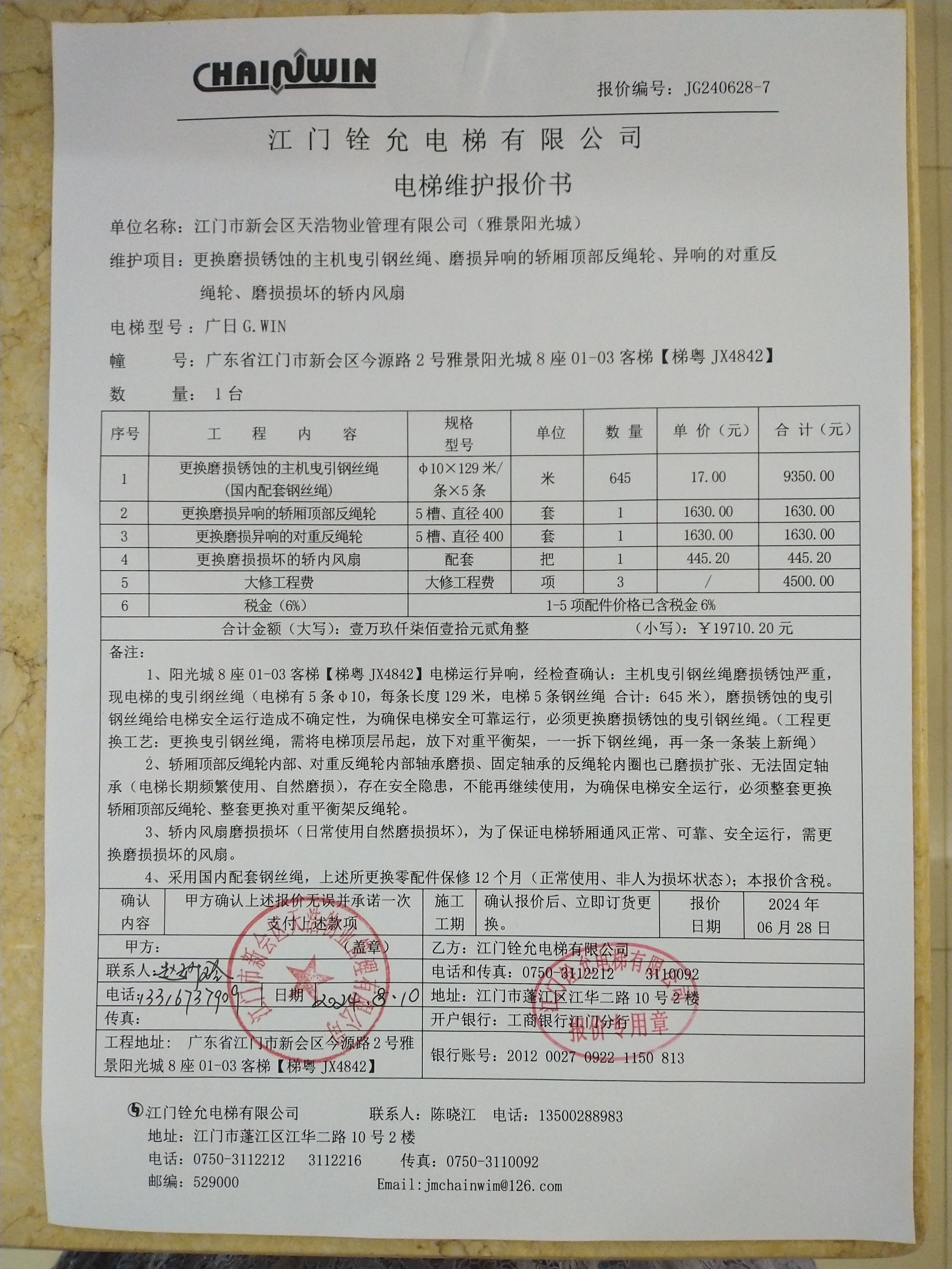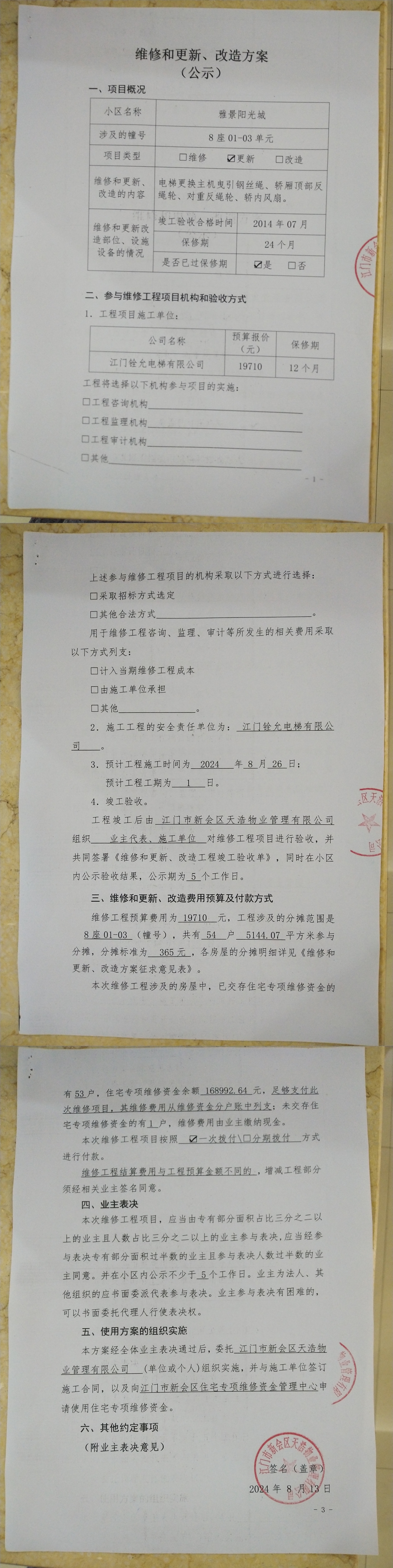 <td VALIGN="top" VALUES="" STYLE="border-width:0" BINDTYPE="0" ROWSPAN="19" COLSPAN="7" DATASOURCE="投票结果" ><font style="font-size:14pt;"><p style="white-space: normal; font-family: 宋体; line-height: 1.75em;">雅景阳光城8座全体业主:</p><p style="white-space: normal; font-family: 宋体; line-height: 1.75em; text-indent: 2em;">本小区关于雅景阳光城8座01-03电梯【梯粤JX4842】更换主机曳引钢丝绳、顶部反绳轮、对重反绳轮、轿内风扇使用维修资金的投票的投票已表决结束,询异时间从2024年08月27日开始,投票询异公示期间,业主可通过微信查询自己的表决情况或可凭身份证件申请查询自己的表决情况;如公示的业主表决情况与查询的本人表决意见不一致的,可以以书面形式向投票组织机构申诉,投票组织机构予以纠正并重新公示表决结果。异议提出人对投票组织机构的处理仍有异议的,可以向街道办事处(镇人民政府)反映处理,涉及住宅专项维修资金的,可向属地住宅专项维修资金管理中心反映处理。</p><p style="white-space: normal;"><br/></p><p style="white-space: normal; font-family: 宋体; line-height: 1.75em;"><strong>附件:</strong></p><p style="white-space: normal; font-family: 宋体; line-height: 1.75em;"><strong>一、投票范围</strong></p><p style="white-space: normal; font-family: 宋体; line-height: 1.75em; text-indent: 2em;">雅景阳光城8座</p><p style="white-space: normal; font-family: 宋体; line-height: 1.75em; text-indent: 2em;">总人数(专有部分人数之和):54</p><p style="white-space: normal; font-family: 宋体; line-height: 1.75em; text-indent: 2em;"><span style="font-family: 宋体, SimSun;"><span style="font-family: 宋体; text-indent: 32px;"><span style="font-family: 宋体; text-indent: 32px;">总户数:54</span></span></span></p><p style="white-space: normal; font-family: 宋体; line-height: 1.75em; text-indent: 2em;">建筑物总面积(专有部分面积之和):5144.07㎡</p><p style="white-space: normal; font-family: 宋体; line-height: 1.75em;"><strong>二、询异公示起止时间</strong></p><p dir="ltr" style="white-space: normal; font-family: 宋体; line-height: 1.75em; text-indent: 2em;"><span style="text-indent: 36px;">2024年08月27日至2024年09月02日</span></p><p style="white-space: normal; font-family: 宋体; line-height: 1.75em;"><strong>三、投票详细描述</strong></p><p style="white-space: normal; font-family: 宋体; line-height: 1.75em; text-indent: 2em;"><p><span style="text-wrap: wrap;">小区8座01-03电梯【梯粤JX4842】发生异响,经检查确认,主机曳引钢丝绳、轿厢顶部反绳轮、对重反绳轮磨损扩张无法固定轴承和轿内风扇损坏,以上零件为日常使用时间较长,自然磨损损坏导致。 现对8座01-03电梯【梯粤JX4842】进行维修,工程维修预算金额为19710.20元,项目最终费用以施工合同签订金额为准。因已过保修期,维修费用由相关业主按分户分摊,每户365元,详见公示附件。如业主手机不能正常通过微信投票,请联系物业公司进行线下纸质投票,物业电话:0750-6303009。</span></p></p><p style="white-space: normal; font-family: 宋体; line-height: 1.75em;"><strong>四、计票规则</strong></p><p style="white-space: normal; font-family: 宋体; line-height: 1.75em; text-indent: 2em;">表决事项:使用建筑物及其附属设施的维修资金<br /><p style='text-align: left; font-family: 宋体; font-size: 16px; line-height: 1.75em; text-indent: 2em;'>计票规则:弃权票不并入其它项 未表决票不并入其它项</p></p><p style="white-space: normal; font-family: 宋体; line-height: 1.75em;"><strong>五、通过规则</strong></p><p style="white-space: normal; font-family: 宋体; line-height: 1.75em;"><strong><strong style="white-space: normal;"><span style="font-family: 宋体, SimSun;"> 根据《中华人民共和国民法典》第二百七十八条规定:业主共同决定事项,应当由专有部分面积占比三分之二以上的业主且人数占比三分之二以上的业主参与表决。</span></strong></strong></p><p style="white-space: normal; font-family: 宋体; line-height: 1.75em; text-indent: 2em;">表决事项:使用建筑物及其附属设施的维修资金<br /><p style='text-align: left; font-family: 宋体; font-size: 16px; line-height: 1.75em; text-indent: 2em;'>通过规则:双2/3以上参与表决,参与表决双过半同意</p></p><p style="white-space: normal; font-family: 宋体; line-height: 1.75em;"><strong>六、投票结果</strong></p><p style="white-space: normal; font-family: 宋体; line-height: 1.75em; text-indent: 2em;"><div id='resultTable'><table style='table-layout: fixed; font-size:12px; margin-top:10px' width='100%' border='0' cellspacing='0' cellpadding='0'><tr><td height='28' colspan='10' align='center' style='border: 1px solid #666'><strong style='font-size: 14px;'> 使用建筑物及其附属设施的维修资金</strong></td> </tr><tr id='trfirst'><td height='28' colspan='4' style='border-left: 1px solid #666; border-bottom: 1px solid #666'><strong> 申报单位:</strong> 江门市新会区天浩物业管理有限公司</td><td colspan='3' style='border-left: 1px solid #666; border-bottom: 1px solid #666'><strong> 联系方式:</strong> </td><td colspan='3' style='border-left: 1px solid #666; border-bottom: 1px solid #666; border-right: 1px solid #666'><strong> 申报日期:</strong> 2024年8月16日 </td></tr><tr> <td height='28' colspan='5' style='border-left: 1px solid #666; border-bottom: 1px solid #666'><strong> 总人数(专有部分人数之和):</strong>54人 </td><td colspan='5' style='border-left: 1px solid #666; border-bottom: 1px solid #666; border-right: 1px solid #666'><strong> 建筑物总面积(专有部分面积之和):</strong>5144.07㎡ </td> </tr><tr><td height='28' colspan='10' bgcolor='#F3F3F3' style='border-left: 1px solid #6
