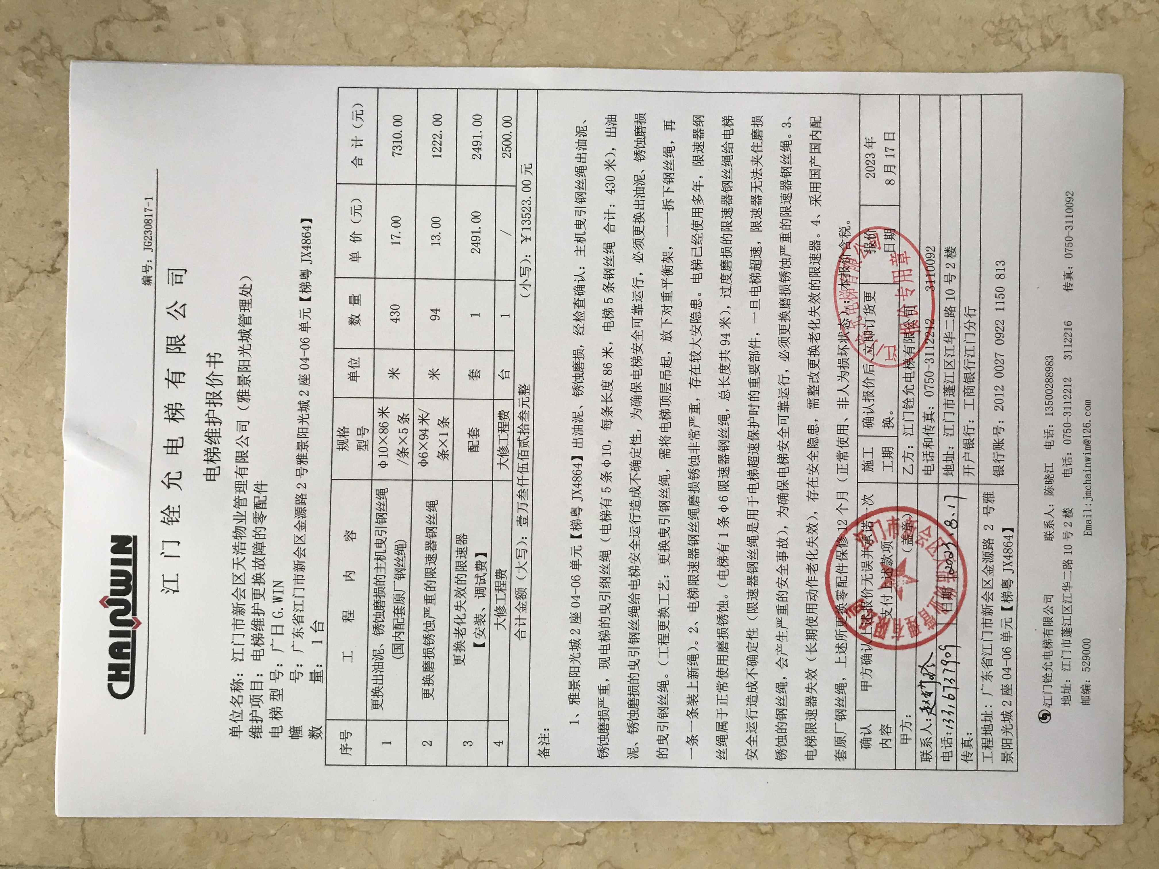 <td VALIGN="top" VALUES="" STYLE="border-width:0" BINDTYPE="0" ROWSPAN="19" COLSPAN="7" DATASOURCE="投票结果" ><font style="font-size:14pt;"><p style="white-space: normal; font-family: 宋体; line-height: 1.75em;">雅景阳光城2座全体业主:</p><p style="white-space: normal; font-family: 宋体; line-height: 1.75em; text-indent: 2em;">本小区关于雅景阳光城2座04-06电梯(梯粤JX4864)更换主机钢丝绳、限速器、限速器钢丝绳使用维修资金的投票的投票已表决结束,询异时间从2023年08月23日开始,投票询异公示期间,业主可通过微信查询自己的表决情况或可凭身份证件申请查询自己的表决情况;如公示的业主表决情况与查询的本人表决意见不一致的,可以以书面形式向投票组织机构申诉,投票组织机构予以纠正并重新公示表决结果。异议提出人对投票组织机构的处理仍有异议的,可以向街道办事处(镇人民政府)反映处理,涉及住宅专项维修资金的,可向属地住宅专项维修资金管理中心反映处理。</p><p style="white-space: normal;"><br/></p><p style="white-space: normal; font-family: 宋体; line-height: 1.75em;"><strong>附件:</strong></p><p style="white-space: normal; font-family: 宋体; line-height: 1.75em;"><strong>一、投票范围</strong></p><p style="white-space: normal; font-family: 宋体; line-height: 1.75em; text-indent: 2em;">雅景阳光城2座</p><p style="white-space: normal; font-family: 宋体; line-height: 1.75em; text-indent: 2em;">总人数(专有部分人数之和):33</p><p style="white-space: normal; font-family: 宋体; line-height: 1.75em; text-indent: 2em;"><span style="font-family: 宋体, SimSun;">总户数:33</span></p><p style="white-space: normal; font-family: 宋体; line-height: 1.75em; text-indent: 2em;">建筑物总面积(专有部分面积之和):2876.87㎡</p><p style="white-space: normal; font-family: 宋体; line-height: 1.75em;"><strong>二、询异公示起止时间</strong></p><p dir="ltr" style="white-space: normal; font-family: 宋体; line-height: 1.75em; text-indent: 2em;"><span style="text-indent: 36px;">2023年08月23日至2023年08月29日</span></p><p style="white-space: normal; font-family: 宋体; line-height: 1.75em;"><strong>三、投票详细描述</strong></p><p style="white-space: normal; font-family: 宋体; line-height: 1.75em; text-indent: 2em;"><p><span style="font-family: "Helvetica Neue", Helvetica, Arial, sans-serif; font-size: 14px; background-color: rgb(255, 255, 255);">雅景阳光城2座04-06电梯检查时发现钢丝绳出油泥,电梯主机曳引式钢丝绳锈蚀磨损严重、限速器钢丝绳锈蚀非常严重,电梯限速器失效,(日常使用,自然磨损损坏)已过保修期。现需申请使用维修资金对2座04-06电梯进行维修,工程维修预算金额为13523元,项目最终费用以施工合同签订金额为准。维修费用的分摊标准为按分户分摊,每户分摊409.79元,详见公示附件。如业主手机不能正常通过维修投票,请联系物业公司进行线下纸质投票,物业电话:0750-6303009</span></p></p><p style="white-space: normal; font-family: 宋体; line-height: 1.75em;"><strong>四、计票规则</strong></p><p style="white-space: normal; font-family: 宋体; line-height: 1.75em; text-indent: 2em;">表决事项:使用建筑物及其附属设施的维修资金<br /><p style='text-align: left; font-family: 宋体; font-size: 16px; line-height: 1.75em; text-indent: 2em;'>计票规则:弃权票不并入其它项 未表决票不并入其它项</p></p><p style="white-space: normal; font-family: 宋体; line-height: 1.75em;"><strong>五、通过规则</strong></p><p style="white-space: normal; font-family: 宋体; line-height: 1.75em; text-indent: 2em;">表决事项:使用建筑物及其附属设施的维修资金<br /><p style='text-align: left; font-family: 宋体; font-size: 16px; line-height: 1.75em; text-indent: 2em;'>通过规则:参与表决专有部分面积过半数的业主且参与表决人数过半数的业主同意</p></p><p style="white-space: normal; font-family: 宋体; line-height: 1.75em;"><strong>六、投票结果</strong></p><p style="white-space: normal; font-family: 宋体; line-height: 1.75em; text-indent: 2em;"><div id='resultTable'><table style='table-layout: fixed; font-size:12px; margin-top:10px' width='100%' border='0' cellspacing='0' cellpadding='0'><tr><td height='28' colspan='10' align='center' style='border: 1px solid #666'><strong style='font-size: 14px;'> 使用建筑物及其附属设施的维修资金</strong></td> </tr><tr id='trfirst'><td height='28' colspan='4' style='border-left: 1px solid #666; border-bottom: 1px solid #666'><strong> 申报单位:</strong> 江门市新会区天浩物业管理有限公司</td><td colspan='3' style='border-left: 1px solid #666; border-bottom: 1px solid #666'><strong> 联系方式:</strong> </td><td colspan='3' style='border-left: 1px solid #666; border-bottom: 1px solid #666; border-right: 1px solid #666'><strong> 申报日期:</strong> 2023年8月19日 </td></tr><tr> <td height='28' colspan='5' style='border-left: 1px solid #666; border-bottom: 1px solid #666'><strong> 总人数(专有部分人数之和):</strong>33人 </td><td colspan='5' style='border-left: 1px solid #666; border-bottom: 1px solid #666; border-right: 1px solid #666'><strong> 建筑物总面积(专有部分面积之和):</strong>2876.87㎡ </td> </tr><tr><td height='28' colspan='10' bgcolor='#F3F3F3' style='border-left: 1px solid #666;border-bottom: 1px solid #666;border-right: 1px solid #666'><strong> 参与人数及面积统计</strong></td></tr><tr><td height='28' colspan='5' style='border-left: 1px solid #666; border-bottom: 1px solid #666'><strong> 参与表决专有部分人数之和:</strong>23人</td><td colspan='5' style='border-left: 1px solid #666; border-bottom: 1px solid #666; border-right: 1px solid #666'><strong> 参与表决占有表决权总人数比