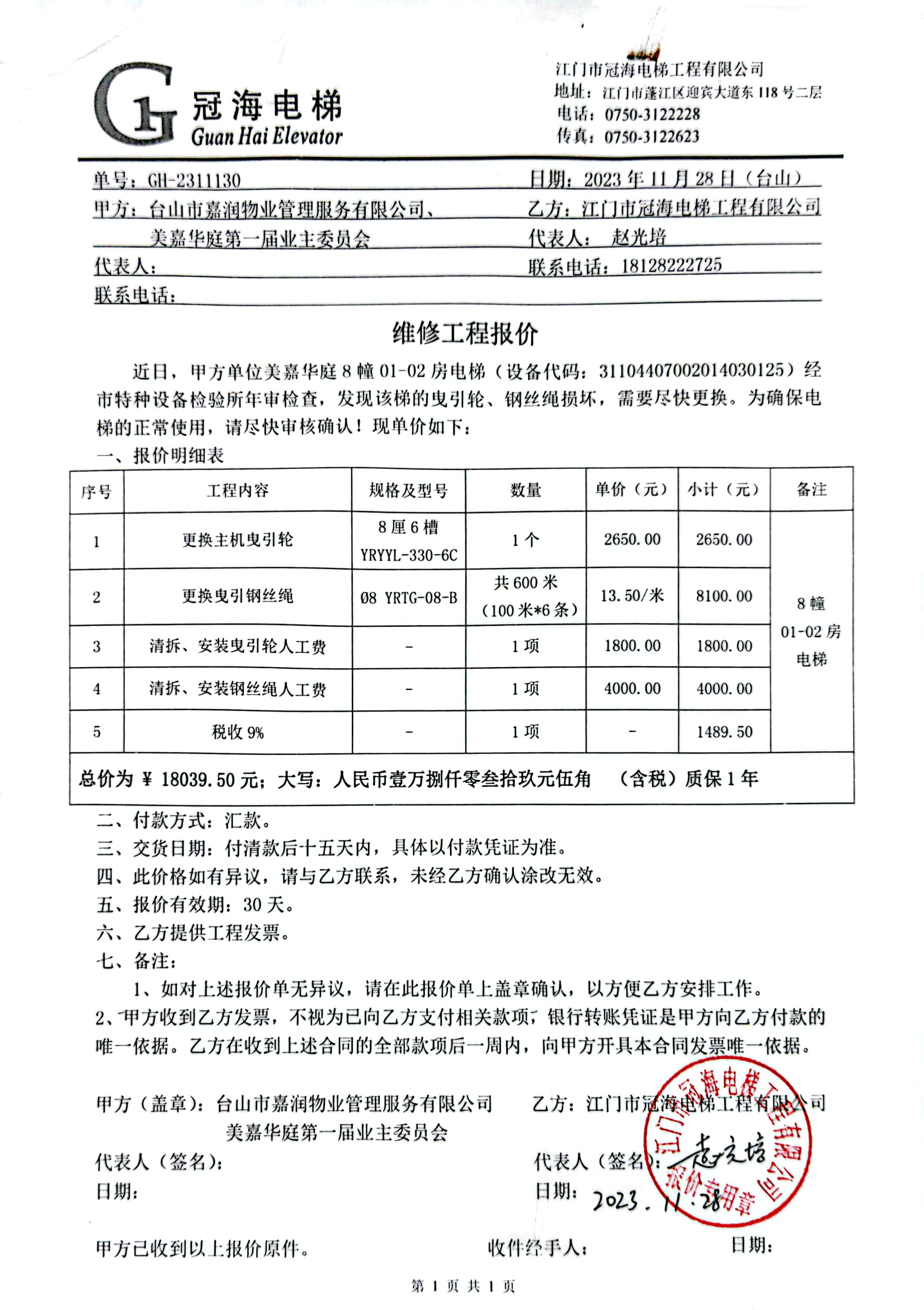 <td VALIGN="top" VALUES="" STYLE="border-width:0" BINDTYPE="0" ROWSPAN="19" COLSPAN="7" DATASOURCE="投票结果" ><font style="font-size:14pt;"><p style="white-space: normal; font-family: 宋体; line-height: 1.75em;">台城陈宜禧路美嘉华庭台城陈宜禧路美嘉华庭8号全体业主:</p><p style="white-space: normal; font-family: 宋体; line-height: 1.75em; text-indent: 2em;">本小区关于美嘉华庭8号楼1梯电梯更换主机曳引轮及钢丝绳使用维修资金投票的投票已表决结束,询异时间从2025年06月02日开始,投票询异公示期间,业主可通过微信查询自己的表决情况或可凭身份证件申请查询自己的表决情况;如公示的业主表决情况与查询的本人表决意见不一致的,可以以书面形式向投票组织机构申诉,投票组织机构予以纠正并重新公示表决结果。异议提出人对投票组织机构的处理仍有异议的,可以向街道办事处(镇人民政府)反映处理,涉及住宅专项维修资金的,可向属地住宅专项维修资金管理中心反映处理。</p><p style="white-space: normal;"><br/></p><p style="white-space: normal; font-family: 宋体; line-height: 1.75em;"><strong>附件:</strong></p><p style="white-space: normal; font-family: 宋体; line-height: 1.75em;"><strong>一、投票范围</strong></p><p style="white-space: normal; font-family: 宋体; line-height: 1.75em; text-indent: 2em;">台城陈宜禧路美嘉华庭台城陈宜禧路美嘉华庭8号</p><p style="white-space: normal; font-family: 宋体; line-height: 1.75em; text-indent: 2em;">总人数(专有部分人数之和):18</p><p style="white-space: normal; font-family: 宋体; line-height: 1.75em; text-indent: 2em;"><span style="font-family: 宋体, SimSun;"><span style="font-family: 宋体; text-indent: 32px;"><span style="font-family: 宋体; text-indent: 32px;">总户数:18</span></span></span></p><p style="white-space: normal; font-family: 宋体; line-height: 1.75em; text-indent: 2em;">建筑物总面积(专有部分面积之和):1912.24㎡</p><p style="white-space: normal; font-family: 宋体; line-height: 1.75em;"><strong>二、询异公示起止时间</strong></p><p dir="ltr" style="white-space: normal; font-family: 宋体; line-height: 1.75em; text-indent: 2em;"><span style="text-indent: 36px;">2025年06月02日至2025年06月12日</span></p><p style="white-space: normal; font-family: 宋体; line-height: 1.75em;"><strong>三、投票详细描述</strong></p><p style="white-space: normal; font-family: 宋体; line-height: 1.75em; text-indent: 2em;"><p style="font-family: "Helvetica Neue", Helvetica, Arial, sans-serif; font-size: 14px; text-wrap: wrap; background-color: rgb(255, 255, 255); text-indent: 34px; line-height: 36px;"><span style="letter-spacing: -1px; font-family: 宋体, SimSun; font-size: 16px;">于2024年11月5日,8号楼1梯在电梯年度检测中发现编号为:<span style="font-size: 19px; font-family: 宋体;">GA110710-280</span>电梯钢丝绳磨损,曳引轮绳槽磨损,空载上行曳引试验不符合要求建议立即整改。</span></p><p style="font-family: "Helvetica Neue", Helvetica, Arial, sans-serif; font-size: 14px; text-wrap: wrap; background-color: rgb(255, 255, 255); text-indent: 34px; line-height: 36px;"><span style="font-size: 16px;"><span style="letter-spacing: -1px; font-family: 宋体;">现对</span><span style="letter-spacing: -1px; font-family: Calibri;">8号1梯</span><span style="letter-spacing: -1px; font-family: 宋体, SimSun;"><span style="font-family: 宋体; background-image: initial; background-position: initial; background-size: initial; background-repeat: initial; background-attachment: initial; background-origin: initial; background-clip: initial;">进行更新</span><span style="font-family: 宋体;">,工程维修预算金额为</span><span style="font-family: 宋体; background-image: initial; background-position: initial; background-size: initial; background-repeat: initial; background-attachment: initial; background-origin: initial; background-clip: initial;"><span style="font-family: Calibri;">18039.5</span>元</span><span style="font-family: 宋体;">,</span></span></span><span style="letter-spacing: -1px; font-family: 宋体, SimSun; font-size: 16px;"><span style="font-family: 宋体; font-size: 14px;">项目最终费用以施工合同签订金额为准。因已过保修期,维修费用由相关业主</span><span style="font-family: 宋体; font-size: 14px; background-image: initial; background-position: initial; background-size: initial; background-repeat: initial; background-attachment: initial; background-origin: initial; background-clip: initial;">按建筑面积</span><span style="font-family: 宋体; font-size: 14px;">分摊,</span><span style="font-family: 宋体; font-size: 14px; background-image: initial; background-position: initial; background-size: initial; background-repeat: initial; background-attachment: initial; background-origin: initial; background-clip: initial;">每平方约<span style="font-size: 19px; font-family: Calibri;">9.43</span>元</span><span style="font-family: 宋体; font-size: 14px;">,详见公示附件。如业主手机不能正常通过微信投票,请联系物业公司进行线下纸质投票,物业电话</span><span style="font-family: 宋体; font-size: 14px; background-image: initial; background-position: initial; background-size: initial; background-repeat: initial; background-attachment: initial; background-origin: initial; background-clip: initial;">:<span style="font-size: 19px; font-family: Calibri;">0750-5663332</span></span><span style="font-family: 宋体; font-size: 14px;">。</span></span></p><p><br/></p></p><p style="white-space: normal; font-family: 宋体; line-height: 1.75em;"><strong>四、计票规则</strong></p><p style="white-space: normal; font-family: 宋体; line-height: 1.75em; text-indent: 2em;">表决事项:使用建筑物及其附属设施的维修资金<br /><p style='text-al