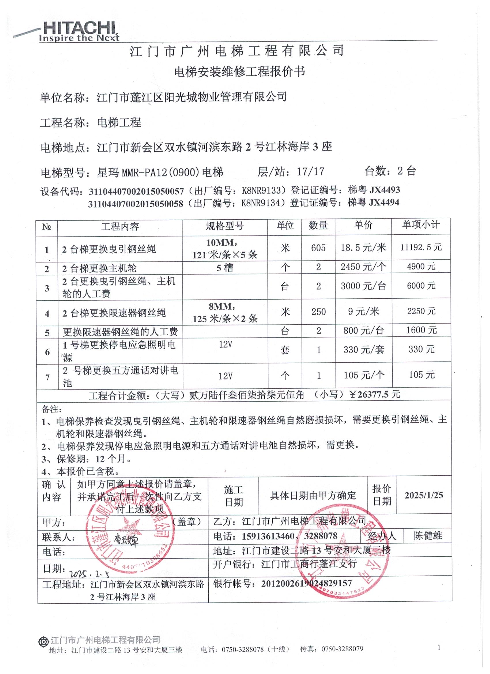 <td VALIGN="top" VALUES="" STYLE="border-width:0" BINDTYPE="0" ROWSPAN="19" COLSPAN="7" DATASOURCE="投票结果" ><font style="font-size:14pt;"><p style="white-space: normal; font-family: 宋体; line-height: 1.75em;">江林海岸江林海岸3座全体业主:</p><p style="white-space: normal; font-family: 宋体; line-height: 1.75em; text-indent: 2em;">本小区关于江林海岸3座1号电梯(梯粤JX4493)、2号电梯(梯粤JX4494)更换曳引钢丝绳、限速器钢丝绳、主机轮、应急照明电源、对讲电池使用维修资金的投票的投票已表决结束,询异时间从2025年03月05日开始,投票询异公示期间,业主可通过微信查询自己的表决情况或可凭身份证件申请查询自己的表决情况;如公示的业主表决情况与查询的本人表决意见不一致的,可以以书面形式向投票组织机构申诉,投票组织机构予以纠正并重新公示表决结果。异议提出人对投票组织机构的处理仍有异议的,可以向街道办事处(镇人民政府)反映处理,涉及住宅专项维修资金的,可向属地住宅专项维修资金管理中心反映处理。</p><p style="white-space: normal;"><br/></p><p style="white-space: normal; font-family: 宋体; line-height: 1.75em;"><strong>附件:</strong></p><p style="white-space: normal; font-family: 宋体; line-height: 1.75em;"><strong>一、投票范围</strong></p><p style="white-space: normal; font-family: 宋体; line-height: 1.75em; text-indent: 2em;">江林海岸江林海岸3座</p><p style="white-space: normal; font-family: 宋体; line-height: 1.75em; text-indent: 2em;">总人数(专有部分人数之和):62</p><p style="white-space: normal; font-family: 宋体; line-height: 1.75em; text-indent: 2em;"><span style="font-family: 宋体, SimSun;"><span style="font-family: 宋体; text-indent: 32px;"><span style="font-family: 宋体; text-indent: 32px;">总户数:66</span></span></span></p><p style="white-space: normal; font-family: 宋体; line-height: 1.75em; text-indent: 2em;">建筑物总面积(专有部分面积之和):6936.90㎡</p><p style="white-space: normal; font-family: 宋体; line-height: 1.75em;"><strong>二、询异公示起止时间</strong></p><p dir="ltr" style="white-space: normal; font-family: 宋体; line-height: 1.75em; text-indent: 2em;"><span style="text-indent: 36px;">2025年03月05日至2025年03月15日</span></p><p style="white-space: normal; font-family: 宋体; line-height: 1.75em;"><strong>三、投票详细描述</strong></p><p style="white-space: normal; font-family: 宋体; line-height: 1.75em; text-indent: 2em;"><p> 小区3座1号电梯(梯粤JX4493)、2号电梯(梯粤JX4494)在保养检查发现曳引钢丝绳、<span style="text-wrap: wrap;">限速器钢丝绳和</span>主机轮在日常使用中出现自然磨损损坏,钢丝绳拉伸过长直径小于使用标准直径范围,钢丝绳拉伸过长会使电梯在运行时对重缓冲距离越来越小,压住液压缓冲器,造成开关失效引起电梯故障;检查同时发现1号电梯的停电应急照明电源损坏,2号电梯的通话对讲电池损坏不能使用。<br/></p><p> 现对3座1号电梯、2号电梯进行更换<span style="text-wrap: wrap;">曳引钢丝绳、主机轮和限速器钢丝绳、应急照明电源、通话对讲电池,工程维修预算金额为26377.5元,项目最终费用以施工合同签订金额为准。因已过保修期,维修费用由相关业主按建筑面积分摊,每平方约3.802元,详见公示附件。如业主手机不能正常通过微信投票,请联系物业公司进行线下纸质投票,物业电话:0750-6412233。</span></p></p><p style="white-space: normal; font-family: 宋体; line-height: 1.75em;"><strong>四、计票规则</strong></p><p style="white-space: normal; font-family: 宋体; line-height: 1.75em; text-indent: 2em;">表决事项:使用建筑物及其附属设施的维修资金<br /><p style='text-align: left; font-family: 宋体; font-size: 16px; line-height: 1.75em; text-indent: 2em;'>计票规则:弃权票不并入其它项 未表决票不并入其它项</p></p><p style="white-space: normal; font-family: 宋体; line-height: 1.75em;"><strong>五、通过规则</strong></p><p style="white-space: normal; font-family: 宋体; line-height: 1.75em;"><strong><strong style="white-space: normal;"><span style="font-family: 宋体, SimSun;"> 根据《中华人民共和国民法典》第二百七十八条规定:业主共同决定事项,应当由专有部分面积占比三分之二以上的业主且人数占比三分之二以上的业主参与表决。</span></strong></strong></p><p style="white-space: normal; font-family: 宋体; line-height: 1.75em; text-indent: 2em;">表决事项:使用建筑物及其附属设施的维修资金<br /><p style='text-align: left; font-family: 宋体; font-size: 16px; line-height: 1.75em; text-indent: 2em;'>通过规则:双2/3以上参与表决,参与表决双过半同意</p></p><p style="white-space: normal; font-family: 宋体; line-height: 1.75em;"><strong>六、投票结果</strong></p><p style="white-space: normal; font-family: 宋体; line-height: 1.75em; text-indent: 2em;"><div id='resultTable'><table style='table-layout: fixed; font-size:12px; margin-top:10px' width='100%' border='0' cellspacing='0' cellpadding='0'><tr><td height='28' colspan='10' align='center' style='border: 1px solid #666'><strong style='font-size: 14px;'> 使用建筑物及其附属设施的维修资金</strong></td> </tr><tr id='trfirst'><td height='28' colspan='4' style='border-left: 1px solid #666; border-bottom: 1px solid #666'><strong> 申报单位:</strong> 江门市蓬江区阳光城物业管理有限公司</td><td colspan='3' style='border-left: 1px solid #666; border-bottom: 1px solid #666'><strong> 联系方式:</strong> 3332898 </td><td colspan='3' style='border-left: 1px solid #666; border-bottom: 1px solid #666; border-right: 1px solid #666'><strong> 申报日期:</strong> 2025年2月13日 </td></tr><tr> <td