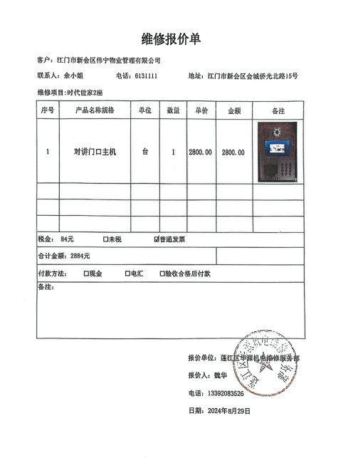 <td valign="top" values="" style="border-width:0" bindtype="0" rowspan="19" colspan="7" datasource="投票结果"><font style="font-size:14pt;"><p style="white-space: normal; font-family: 宋体; line-height: 1.75em;">时代世家1座、2座全体业主:</p><p style="white-space: normal; font-family: 宋体; line-height: 1.75em; text-indent: 2em;">本小区关于时代世家正门口对讲机主机更换使用维修资金的投票的投票已表决结束,询异时间从2024年10月16日开始,投票询异公示期间,业主可通过微信查询自己的表决情况或可凭身份证件申请查询自己的表决情况;如公示的业主表决情况与查询的本人表决意见不一致的,可以以书面形式向投票组织机构申诉,投票组织机构予以纠正并重新公示表决结果。异议提出人对投票组织机构的处理仍有异议的,可以向街道办事处(镇人民政府)反映处理,涉及住宅专项维修资金的,可向属地住宅专项维修资金管理中心反映处理。</p><p style="white-space: normal;"><br></p><p style="white-space: normal; font-family: 宋体; line-height: 1.75em;"><strong>附件:</strong></p><p style="white-space: normal; font-family: 宋体; line-height: 1.75em;"><strong>一、投票范围</strong></p><p style="white-space: normal; font-family: 宋体; line-height: 1.75em; text-indent: 2em;">时代世家1座、2座</p><p style="white-space: normal; font-family: 宋体; line-height: 1.75em; text-indent: 2em;">总人数(专有部分人数之和):258</p><p style="white-space: normal; font-family: 宋体; line-height: 1.75em; text-indent: 2em;"><span style="font-family: 宋体, SimSun;"><span style="font-family: 宋体; text-indent: 32px;"><span style="font-family: 宋体; text-indent: 32px;">总户数:260</span></span></span></p><p style="white-space: normal; font-family: 宋体; line-height: 1.75em; text-indent: 2em;">建筑物总面积(专有部分面积之和):26802.59㎡</p><p style="white-space: normal; font-family: 宋体; line-height: 1.75em;"><strong>二、询异公示起止时间</strong></p><p dir="ltr" style="white-space: normal; font-family: 宋体; line-height: 1.75em; text-indent: 2em;"><span style="text-indent: 36px;">2024年10月16日至2024年11月04日</span></p><p style="white-space: normal; font-family: 宋体; line-height: 1.75em;"><strong>三、投票详细描述</strong></p><p style="white-space: normal; font-family: 宋体; line-height: 1.75em; text-indent: 2em;"></p><p>小区正门对讲机主机出现故障,不能正常使用。经检查,是由于主机内部硬件出现故障导致对讲机不能正常运行。</p><p>现对正门口对讲机主机进行维修更换,工程维修预算金额为:2884元,项目最终费用以施工合同签订金额为准。因已过保修期,维修费用由相关业主按建筑面积分摊,每平方约0.11元,详见公示附件。如业主手机不能正常通过微信投票,请联系物业公司进行线下纸质投票,物业电话:0750-6131111。</p><p><br></p><p></p><p style="white-space: normal; font-family: 宋体; line-height: 1.75em;"><strong>四、计票规则</strong></p><p style="white-space: normal; font-family: 宋体; line-height: 1.75em; text-indent: 2em;">表决事项:使用建筑物及其附属设施的维修资金<br></p><p style="text-align: left; font-family: 宋体; font-size: 16px; line-height: 1.75em; text-indent: 2em;">计票规则:弃权票不并入其它项 未表决票不并入其它项</p><p></p><p style="white-space: normal; font-family: 宋体; line-height: 1.75em;"><strong>五、通过规则</strong></p><p style="white-space: normal; font-family: 宋体; line-height: 1.75em;"><strong><strong style="white-space: normal;"><span style="font-family: 宋体, SimSun;"> 根据《中华人民共和国民法典》第二百七十八条规定:业主共同决定事项,应当由专有部分面积占比三分之二以上的业主且人数占比三分之二以上的业主参与表决。</span></strong></strong></p><p style="white-space: normal; font-family: 宋体; line-height: 1.75em; text-indent: 2em;">表决事项:使用建筑物及其附属设施的维修资金<br></p><p style="text-align: left; font-family: 宋体; font-size: 16px; line-height: 1.75em; text-indent: 2em;">通过规则:双2/3以上参与表决,参与表决双过半同意</p><p></p><p style="white-space: normal; font-family: 宋体; line-height: 1.75em;"><strong>六、投票结果</strong></p><p style="white-space: normal; font-family: 宋体; line-height: 1.75em; text-indent: 2em;"></p><div id="resultTable"><table style="table-layout: fixed; font-size:12px; margin-top:10px" width="100%" border="0" cellspacing="0" cellpadding="0"><tbody><tr><td height="28" colspan="10" align="center" style="border: 1px solid #666"><strong style="font-size: 14px;"> 使用建筑物及其附属设施的维修资金</strong></td> </tr><tr id="trfirst"><td height="28" colspan="4" style="border-left: 1px solid #666; border-bottom: 1px solid #666"><strong> 申报单位:</strong> 江门市新会区伟宁物业管理有限公司</td><td colspan="3" style="border-left: 1px solid #666; border-bottom: 1px solid #666"><strong> 联系方式:</strong> 6109605 </td><td colspan="3" style="border-left: 1px solid #666; border-bottom: 1px solid #666; border-right: 1px solid #666"><strong> 申报日期:</strong> 2024年9月23日 </td></tr><tr> <td height="28" colspan="5" style="border-left: 1px solid #666; border-bottom: 1px solid #666"><strong> 总人数(专有部分人数之和):</strong>258人 </td><td colspan="5" style="border-left: 1px solid #666; border-bottom: 1px solid #666; border-right: 1px solid #666"><strong> 建筑物总面积(专有部分面积之和):</strong>26802.59㎡ </td> </tr><tr><td height="28" colspan="10" bgcolor="#F3F3F3" style="border-left: 1px solid #666;border-bottom: 1px solid #666;border-right: 1px solid #666"><strong> 参与人数及面积统计</strong></td></tr><tr><td height="28" colspan="5" style