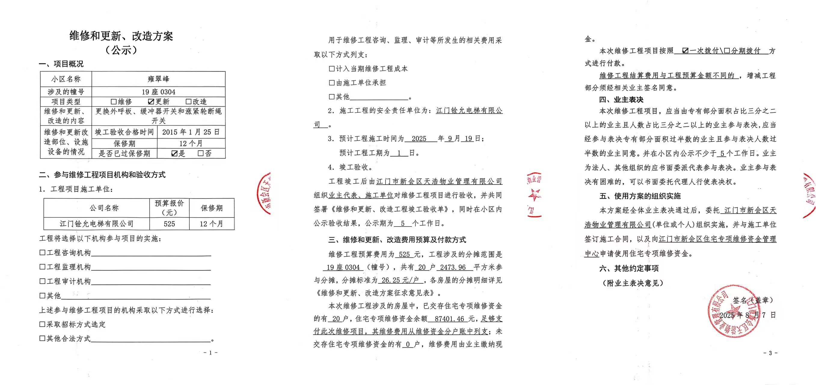 <td VALIGN="top" VALUES="" STYLE="border-width:0" BINDTYPE="0" ROWSPAN="17" COLSPAN="7" DATASOURCE="投票结果" ><font style=" font-family:方正小标宋简体;font-size:14pt;"><p style="line-height: 1.75em;"><span style="font-family: 宋体, SimSun;">各位尊敬的业主:</span><br/></p><p style="text-indent: 2em; line-height: 1.75em;"><span style="font-family: 宋体, SimSun;">根据法律法规的规定,本小区业主利用“江门市物业事项表决管理系统”已对本小区公共事务决策事项(<span style="font-family: 宋体; text-indent: 32px;">雍翠峰19座0304单元电梯【梯粤JX4630】更换外呼板和开关使用维修资金的投票</span>)进行了表决,在经过7日的询异公示期后,未收到业主有效的异议。现将投票结果公告,并就产生的法律效力说明如下:</span></p><p style="line-height: 1.75em; text-indent: 0em;"><strong style="text-indent: 2em;"><span style="font-family: 宋体, SimSun;">一、投票范围</span></strong></p><p style="text-indent: 2em; line-height: 1.75em;"><span style="font-family: 宋体, SimSun;">雍翠峰雍翠峰19座</span></p><p style="text-indent: 2em; line-height: 1.75em;"><span style="font-family: 宋体, SimSun;">总人数(专有部分人数之和):20</span></p><p style="text-indent: 2em; line-height: 1.75em;"><span style="font-family: 宋体, SimSun;"><span style="font-family: 宋体, SimSun; text-indent: 32px;"><span style="font-family: 宋体; text-indent: 32px;"><span style="font-family: 宋体; text-indent: 32px;">总户数:20</span></span></span></span></p><p style="text-indent: 2em; line-height: 1.75em;"><span style="font-family: 宋体, SimSun;">建筑物总面积(专有部分面积之和):2473.96㎡</span></p><p style="line-height: 1.75em;"><strong><span style="font-family: 宋体, SimSun;">二、投票结果公告时间</span></strong></p><p style="text-indent: 2em; line-height: 1.75em;"><span style="font-family: 宋体, SimSun;"><span style="font-family: 宋体, SimSun; text-indent: 32px;">从2025年08月22日开始</span></span></p><p style="line-height: 1.75em;"><strong><span style="font-family: 宋体, SimSun;">三、计票规则</span></strong></p><p style="text-indent: 2em; line-height: 1.75em;"><span style="font-family: 宋体, SimSun;">表决事项:使用建筑物及其附属设施的维修资金<br /><p style='font-family: 宋体, SimSun;line-height: 1.75em; text-indent: 2em;'>计票规则:弃权票不并入其它项&nbsp;&nbsp;&nbsp;&nbsp;未表决票不并入其它项</p></span></p><p style="line-height: 1.75em;"><strong><span style="font-family: 宋体, SimSun;">四、通过规则</span></strong></p><p style="line-height: 1.75em;"><strong><span style="font-family: 宋体, SimSun;">&nbsp; 根据《中华人民共和国民法典》第二百七十八条规定:业主共同决定事项,应当由专有部分面积占比三分之二以上的业主且人数占比三分之二以上的业主参与表决。</span></strong></p><p style="text-indent: 2em; line-height: 1.75em;"><span style="font-family: 宋体, SimSun;"><span style="font-family: 宋体, SimSun; text-indent: 32px;">表决事项:使用建筑物及其附属设施的维修资金<br /><p style='font-family: 宋体, SimSun;line-height: 1.75em; text-indent: 2em;'>通过规则:双2/3以上参与表决,参与表决双过半同意</p></span></span></p><p style="line-height: 1.75em;"><strong><span style="font-family: 宋体, SimSun;">五、投票结果</span></strong></p><p style="line-height: 1.75em; text-indent: 2em;"><span style="font-family: 宋体, SimSun; text-indent: 2em;"><div id='resultTable'><table style='table-layout: fixed; font-size:12px; margin-top:10px' width='100%' border='0' cellspacing='0' cellpadding='0'><tr><td height='28' colspan='10' align='center' style='border: 1px solid #666'><strong style='font-size: 14px;'> 使用建筑物及其附属设施的维修资金</strong></td> </tr><tr id='trfirst'><td height='28' colspan='4' style='border-left: 1px solid #666; border-bottom: 1px solid #666'><strong>&nbsp;申报单位:</strong> 江门市新会区天浩物业管理有限公司</td><td colspan='3' style='border-left: 1px solid #666; border-bottom: 1px solid #666'><strong>&nbsp;联系方式:</strong> </td><td colspan='3' style='border-left: 1px solid #666; border-bottom: 1px solid #666; border-right: 1px solid #666'><strong>&nbsp;申报日期:</strong> 2025年8月7日 </td></tr><tr> <td height='28' colspan='5' style='border-left: 1px solid #666; border-bottom: 1px solid #666'><strong>&nbsp;列支总人数(专有部分人数之和):</strong>20人 </td><td colspan='5' style='border-left: 1px solid #666; border-bottom: 1px solid #666; border-right: 1px solid #666'><strong>&nbsp;列支建筑物总面积(专有部分面积之和):</strong>2473.96㎡ </td> </tr><tr><td height='28' colspan='10' bgcolor='#F3F3F3' style='border-left: 1px solid #666;border-bottom: 1px solid #666;border-right: 1px solid #666'><strong>&nbsp;参与表决人数及面积统计</strong></td></tr><tr><td height='28' colspan='5' style='border-left: 1px solid #666; border-bottom: 1px solid #666'><strong>&nbsp;参与表决人数:</strong>16人</td><td colspan='5' style='border-left: 1px solid #666; border-bottom: 1px solid #666; border-right: 1px solid #666'><strong>&nbsp;参与表决人数占总人数比例:</strong>80.00%</td></tr><tr><td height='28' colspan='5' style='border-left: 1px solid #666; border-bottom: 1px solid #666'><strong>&nbsp;参与表决面积:</strong>2020.88㎡</td><td colspan='5' style='border-left: 1px solid #666; border-bottom: 1px solid #666; border-right: 1px solid #666'><strong>&nbsp;参与表决面积占总面积比例:</strong>81.69%</td></tr><tr><td height='28' colspan='10' bgcolor='#F3F3F3' style='border-left: 1px solid #666; border-bottom: 1px solid #666;border-right: 1px solid #666'> <strong>&nbsp;参与表决同意人数及面积统计</strong></td> </tr><tr><td height='28' colspan='5' style='border-left: 1px solid #6