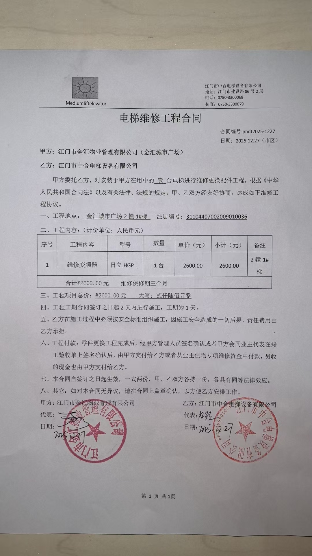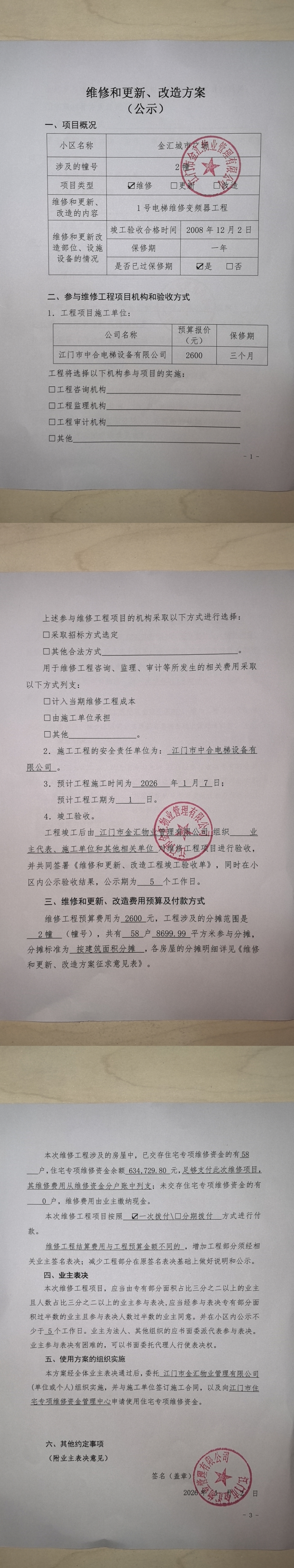 <td VALIGN="top" VALUES="" STYLE="border-width:0" BINDTYPE="0" ROWSPAN="19" COLSPAN="7" DATASOURCE="投票结果" ><font style="font-size:14pt;"><p style="white-space: normal; font-family: 宋体; line-height: 1.75em;">金汇城市广场金汇城市广场2栋全体业主:</p><p style="white-space: normal; font-family: 宋体; line-height: 1.75em; text-indent: 2em;">本小区关于金汇城市广场关于2幢1#电梯维修变频器工程使用维修资金的投票的投票已表决结束,询异时间从2026年03月05日开始,投票询异公示期间,业主可通过微信查询自己的表决情况或可凭身份证件申请查询自己的表决情况;如公示的业主表决情况与查询的本人表决意见不一致的,可以以书面形式向投票组织机构申诉,投票组织机构予以纠正并重新公示表决结果。异议提出人对投票组织机构的处理仍有异议的,可以向街道办事处(镇人民政府)反映处理,涉及住宅专项维修资金的,可向属地住宅专项维修资金管理中心反映处理。</p><p style="white-space: normal;"><br/></p><p style="white-space: normal; font-family: 宋体; line-height: 1.75em;"><strong>附件:</strong></p><p style="white-space: normal; font-family: 宋体; line-height: 1.75em;"><strong>一、投票范围</strong></p><p style="white-space: normal; font-family: 宋体; line-height: 1.75em; text-indent: 2em;">金汇城市广场金汇城市广场2栋</p><p style="white-space: normal; font-family: 宋体; line-height: 1.75em; text-indent: 2em;">总人数(专有部分人数之和):56</p><p style="white-space: normal; font-family: 宋体; line-height: 1.75em; text-indent: 2em;"><span style="font-family: 宋体, SimSun;"><span style="font-family: 宋体; text-indent: 32px;"><span style="font-family: 宋体; text-indent: 32px;">总户数:58</span></span></span></p><p style="white-space: normal; font-family: 宋体; line-height: 1.75em; text-indent: 2em;">建筑物总面积(专有部分面积之和):8699.99㎡</p><p style="white-space: normal; font-family: 宋体; line-height: 1.75em;"><strong>二、询异公示起止时间</strong></p><p dir="ltr" style="white-space: normal; font-family: 宋体; line-height: 1.75em; text-indent: 2em;"><span style="text-indent: 36px;">2026年03月05日至2026年03月12日</span></p><p style="white-space: normal; font-family: 宋体; line-height: 1.75em;"><strong>三、投票详细描述</strong></p><p style="white-space: normal; font-family: 宋体; line-height: 1.75em; text-indent: 2em;"><p style="font-family: "Helvetica Neue", Helvetica, Arial, sans-serif; font-size: 14px; white-space: normal; background-color: rgb(255, 255, 255);"><span style="font-family: 宋体, SimSun;">金汇城市广场2幢1</span><span style="font-family: 宋体, SimSun;">#</span><span style="font-family: 宋体, SimSun;">电梯突然出现故障,经检查,</span><span style="font-family: 宋体, SimSun;">由</span><span style="font-family: 宋体, SimSun;">于1#电梯变频器原件出现老化而不能正常运行,需拆下维修。</span></p><p style="font-family: "Helvetica Neue", Helvetica, Arial, sans-serif; font-size: 14px; white-space: normal; background-color: rgb(255, 255, 255);"><span style="font-family: 宋体;"> 现对<span style="background-image: initial; background-position: initial; background-size: initial; background-repeat: initial; background-attachment: initial; background-origin: initial; background-clip: initial;"><span style="font-family: Calibri;"></span><span style="font-family: 宋体, SimSun;">2幢1#电梯的变频器</span>进行拆下维修处理</span>,工程维修预算金额为<span style="background-image: initial; background-position: initial; background-size: initial; background-repeat: initial; background-attachment: initial; background-origin: initial; background-clip: initial;"><span style="font-family: Calibri;">2600</span>元</span>,项目最终费用以施工合同签订金额为准。因已过保修期,维修费用由相关业主<span style="background-image: initial; background-position: initial; background-size: initial; background-repeat: initial; background-attachment: initial; background-origin: initial; background-clip: initial;">按建筑面积</span>分摊,<span style="background-image: initial; background-position: initial; background-size: initial; background-repeat: initial; background-attachment: initial; background-origin: initial; background-clip: initial;">每平方约<span style="font-family: Calibri;">0.29</span>元</span>,详见公示附件。如业主手机不能正常通过微信投票,请联系物业公司进行线下纸质投票,物业电话<span style="background-image: initial; background-position: initial; background-size: initial; background-repeat: initial; background-attachment: initial; background-origin: initial; background-clip: initial;">:<span style="font-family: Calibri;">0750-3909003</span></span>。</span></p></p><p style="white-space: normal; font-family: 宋体; line-height: 1.75em;"><strong>四、计票规则</strong></p><p style="white-space: normal; font-family: 宋体; line-height: 1.75em; text-indent: 2em;">表决事项:使用建筑物及其附属设施的维修资金<br /><p style='text-align: left; font-family: 宋体; font-size: 16px; line-height: 1.75em; text-indent: 2em;'>计票规则:弃权票不并入其它项 未表决票不并入其它项</p></p><p style="white-space: normal; font-family: 宋体; line-height: 1.75em;"><strong>五、通过规则</strong></p><p style="white-space: normal; font-family: 宋体; line-height: 1.75em;"><strong><strong style="white-space: normal;"><span style="font-family: 宋体, SimSun;"> 根据《中华人民共和国民法典》第二百七十八条规定:业主共同决定事项,应当由专有部分面积占比三分之二以上的业主且人数占比三分之二以上的业主参与表决。</span></strong></strong></p><p style="white-space: normal; font-family: 宋体; line-height: 1.