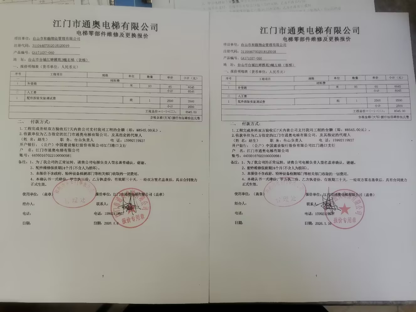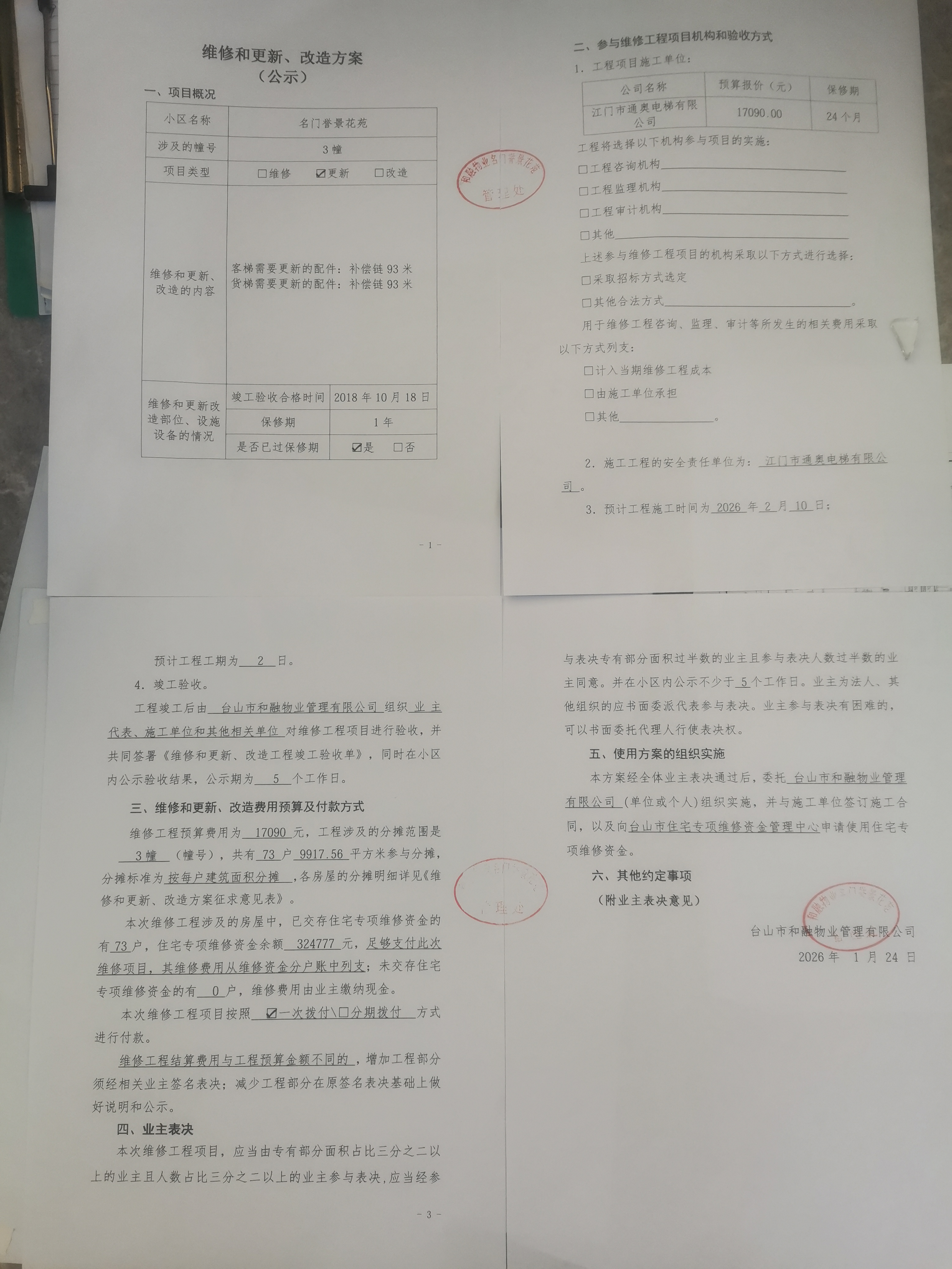 <td VALIGN="top" VALUES="" STYLE="border-width:0" BINDTYPE="0" ROWSPAN="19" COLSPAN="7" DATASOURCE="投票结果" ><font style="font-size:14pt;"><p style="white-space: normal; font-family: 宋体; line-height: 1.75em;">台山市名门誉景花苑名门誉景花苑3幢全体业主:</p><p style="white-space: normal; font-family: 宋体; line-height: 1.75em; text-indent: 2em;">本小区关于名门誉景花苑3幢客梯和货梯更换补偿链的使用维修资金投票的投票已表决结束,询异时间从2026年02月04日开始,投票询异公示期间,业主可通过微信查询自己的表决情况或可凭身份证件申请查询自己的表决情况;如公示的业主表决情况与查询的本人表决意见不一致的,可以以书面形式向投票组织机构申诉,投票组织机构予以纠正并重新公示表决结果。异议提出人对投票组织机构的处理仍有异议的,可以向街道办事处(镇人民政府)反映处理,涉及住宅专项维修资金的,可向属地住宅专项维修资金管理中心反映处理。</p><p style="white-space: normal;"><br/></p><p style="white-space: normal; font-family: 宋体; line-height: 1.75em;"><strong>附件:</strong></p><p style="white-space: normal; font-family: 宋体; line-height: 1.75em;"><strong>一、投票范围</strong></p><p style="white-space: normal; font-family: 宋体; line-height: 1.75em; text-indent: 2em;">台山市名门誉景花苑名门誉景花苑3幢</p><p style="white-space: normal; font-family: 宋体; line-height: 1.75em; text-indent: 2em;">总人数(专有部分人数之和):71</p><p style="white-space: normal; font-family: 宋体; line-height: 1.75em; text-indent: 2em;"><span style="font-family: 宋体, SimSun;"><span style="font-family: 宋体; text-indent: 32px;"><span style="font-family: 宋体; text-indent: 32px;">总户数:73</span></span></span></p><p style="white-space: normal; font-family: 宋体; line-height: 1.75em; text-indent: 2em;">建筑物总面积(专有部分面积之和):9917.56㎡</p><p style="white-space: normal; font-family: 宋体; line-height: 1.75em;"><strong>二、询异公示起止时间</strong></p><p dir="ltr" style="white-space: normal; font-family: 宋体; line-height: 1.75em; text-indent: 2em;"><span style="text-indent: 36px;">2026年02月04日至2026年02月14日</span></p><p style="white-space: normal; font-family: 宋体; line-height: 1.75em;"><strong>三、投票详细描述</strong></p><p style="white-space: normal; font-family: 宋体; line-height: 1.75em; text-indent: 2em;"><p>小区3幢的客梯和货梯日常运行时出现异响,是由于补偿链外层包裹皮出现开裂,内部金属链磨损。<br/>现对3幢客梯、货梯进行维修,工程维修预算金额为17090元,项目最终费用以施工合同签订金额为准。因已过保修期,维修费用由相关业主按建筑面积分摊,详见公示附件。如业主手机不能正常通过微信投票,请联系物业公司进行线下纸质投票,物业电话:0750-5602832.</p></p><p style="white-space: normal; font-family: 宋体; line-height: 1.75em;"><strong>四、计票规则</strong></p><p style="white-space: normal; font-family: 宋体; line-height: 1.75em; text-indent: 2em;">表决事项:使用建筑物及其附属设施的维修资金<br /><p style='text-align: left; font-family: 宋体; font-size: 16px; line-height: 1.75em; text-indent: 2em;'>计票规则:弃权票不并入其它项 未表决票不并入其它项</p></p><p style="white-space: normal; font-family: 宋体; line-height: 1.75em;"><strong>五、通过规则</strong></p><p style="white-space: normal; font-family: 宋体; line-height: 1.75em;"><strong><strong style="white-space: normal;"><span style="font-family: 宋体, SimSun;"> 根据《中华人民共和国民法典》第二百七十八条规定:业主共同决定事项,应当由专有部分面积占比三分之二以上的业主且人数占比三分之二以上的业主参与表决。</span></strong></strong></p><p style="white-space: normal; font-family: 宋体; line-height: 1.75em; text-indent: 2em;">表决事项:使用建筑物及其附属设施的维修资金<br /><p style='text-align: left; font-family: 宋体; font-size: 16px; line-height: 1.75em; text-indent: 2em;'>通过规则:双2/3以上参与表决,参与表决双过半同意</p></p><p style="white-space: normal; font-family: 宋体; line-height: 1.75em;"><strong>六、投票结果</strong></p><p style="white-space: normal; font-family: 宋体; line-height: 1.75em; text-indent: 2em;"><div id='resultTable'><table style='table-layout: fixed; font-size:12px; margin-top:10px' width='100%' border='0' cellspacing='0' cellpadding='0'><tr><td height='28' colspan='10' align='center' style='border: 1px solid #666'><strong style='font-size: 14px;'> 使用建筑物及其附属设施的维修资金</strong></td> </tr><tr id='trfirst'><td height='28' colspan='4' style='border-left: 1px solid #666; border-bottom: 1px solid #666'><strong> 申报单位:</strong> 台山市和融物业管理有限公司</td><td colspan='3' style='border-left: 1px solid #666; border-bottom: 1px solid #666'><strong> 联系方式:</strong> 07505602830 </td><td colspan='3' style='border-left: 1px solid #666; border-bottom: 1px solid #666; border-right: 1px solid #666'><strong> 申报日期:</strong> 2026年1月24日 </td></tr><tr> <td height='28' colspan='5' style='border-left: 1px solid #666; border-bottom: 1px solid #666'><strong> 总人数(专有部分人数之和):</strong>71人 </td><td colspan='5' style='border-left: 1px solid #666; border-bottom: 1px solid #666; border-right: 1px solid #666'><strong> 建筑物总面积(专有部分面积之和):</strong>9917.56㎡ </td> </tr><tr><td height='28' colspan='10' bgcolor='#F3F3F3' style='border-left: 1px solid #666;border-bottom: 1px solid #666;border-right: 1px solid #666'><strong> 参与人数及面积统计</strong></td></tr><tr><td height='28' colspan='5' style='border-left: 1px solid #666; border-bo