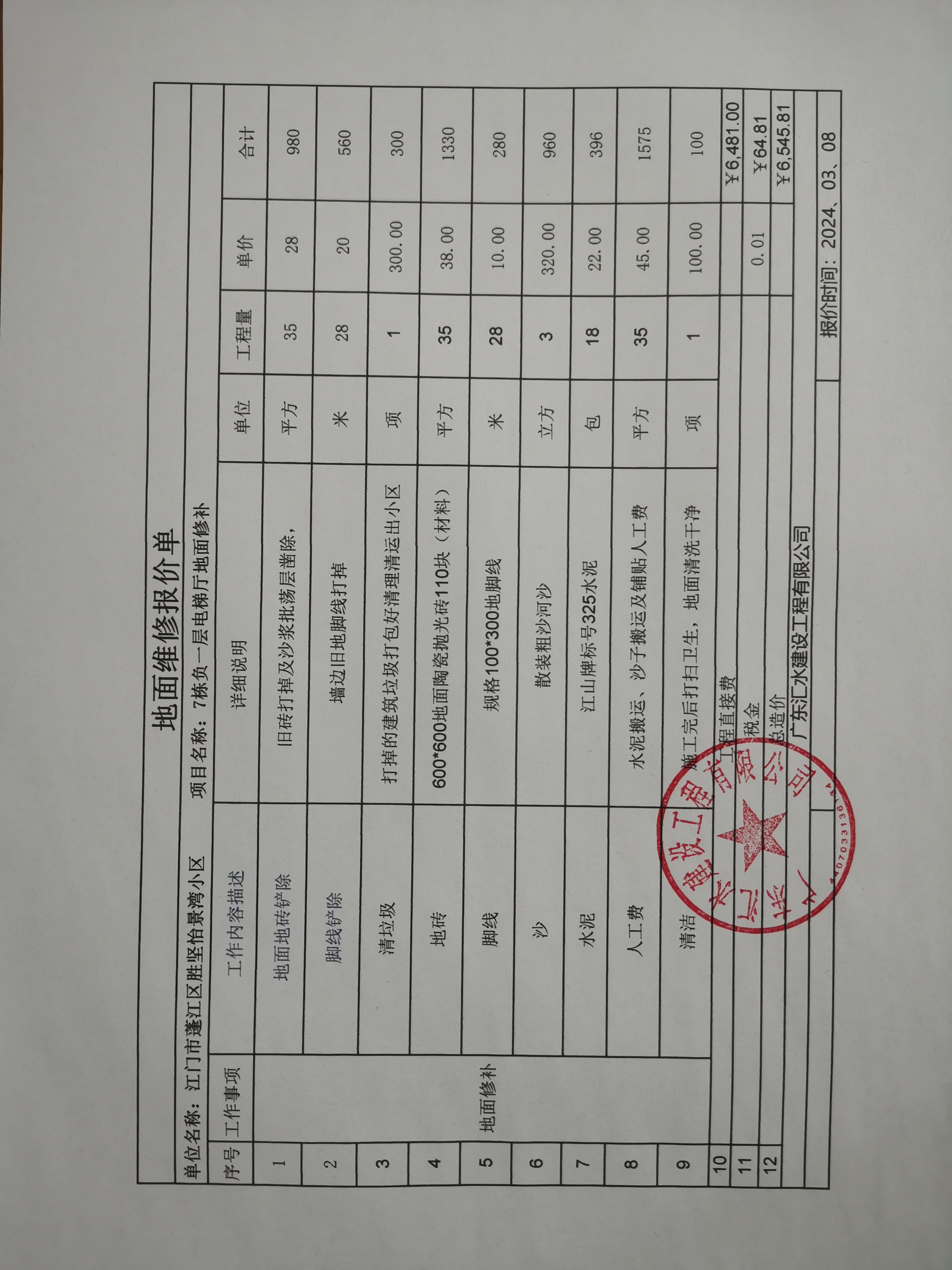 <td VALIGN="top" VALUES="" STYLE="border-width:0" BINDTYPE="0" ROWSPAN="19" COLSPAN="7" DATASOURCE="投票结果" ><font style="font-size:14pt;"><p style="white-space: normal; font-family: 宋体; line-height: 1.75em;">蓬江区怡景湾蓬江区怡景湾花园7幢全体业主:</p><p style="white-space: normal; font-family: 宋体; line-height: 1.75em; text-indent: 2em;">本小区关于蓬江区怡景湾7幢负一层电梯厅地面修补使用维修资金的投票的投票已表决结束,询异时间从2024年05月01日开始,投票询异公示期间,业主可通过微信查询自己的表决情况或可凭身份证件申请查询自己的表决情况;如公示的业主表决情况与查询的本人表决意见不一致的,可以以书面形式向投票组织机构申诉,投票组织机构予以纠正并重新公示表决结果。异议提出人对投票组织机构的处理仍有异议的,可以向街道办事处(镇人民政府)反映处理,涉及住宅专项维修资金的,可向属地住宅专项维修资金管理中心反映处理。</p><p style="white-space: normal;"><br/></p><p style="white-space: normal; font-family: 宋体; line-height: 1.75em;"><strong>附件:</strong></p><p style="white-space: normal; font-family: 宋体; line-height: 1.75em;"><strong>一、投票范围</strong></p><p style="white-space: normal; font-family: 宋体; line-height: 1.75em; text-indent: 2em;">蓬江区怡景湾蓬江区怡景湾花园7幢</p><p style="white-space: normal; font-family: 宋体; line-height: 1.75em; text-indent: 2em;">总人数(专有部分人数之和):67</p><p style="white-space: normal; font-family: 宋体; line-height: 1.75em; text-indent: 2em;"><span style="font-family: 宋体, SimSun;"><span style="font-family: 宋体; text-indent: 32px;"><span style="font-family: 宋体; text-indent: 32px;">总户数:67</span></span></span></p><p style="white-space: normal; font-family: 宋体; line-height: 1.75em; text-indent: 2em;">建筑物总面积(专有部分面积之和):8028.61㎡</p><p style="white-space: normal; font-family: 宋体; line-height: 1.75em;"><strong>二、询异公示起止时间</strong></p><p dir="ltr" style="white-space: normal; font-family: 宋体; line-height: 1.75em; text-indent: 2em;"><span style="text-indent: 36px;">2024年05月01日至2024年05月07日</span></p><p style="white-space: normal; font-family: 宋体; line-height: 1.75em;"><strong>三、投票详细描述</strong></p><p style="white-space: normal; font-family: 宋体; line-height: 1.75em; text-indent: 2em;"><p><span style="font-size: 14px; text-wrap: wrap; background-color: rgb(255, 255, 255); font-family: 宋体;">小区</span><span style="font-size: 14px; text-wrap: wrap; background-color: rgb(255, 255, 255);"><span style="font-family:Calibri">7幢</span></span><span style="font-size: 14px; text-wrap: wrap; background-color: rgb(255, 255, 255); font-family: 宋体;">的负一层电梯厅地面地砖松动、鼓起,</span><span style="font-size: 14px; text-wrap: wrap; background-color: rgb(255, 255, 255); font-family: 宋体;">经检查,是由于地面地砖空鼓</span></p><p><span style="font-size: 14px; text-wrap: wrap; background-color: rgb(255, 255, 255); font-family: 宋体;"> 现对7幢</span><span style="font-size: 14px; text-wrap: wrap; font-family: 宋体; background: rgb(255, 255, 0);"><span style="text-wrap: wrap; font-size: 14px; background-color: rgb(255, 255, 255); font-family: 宋体;">的负一层电梯厅地面地砖维修</span></span><span style="font-size: 14px; text-wrap: wrap; background-color: rgb(255, 255, 255); font-family: 宋体;">,工程维修预算金额为</span><span style="font-size: 14px; text-wrap: wrap;"><span style="font-family:Calibri;"><span style="background-color: rgb(255, 255, 255);">6545.81元</span></span></span><span style="font-size: 14px; text-wrap: wrap; background-color: rgb(255, 255, 255); font-family: 宋体;">,项目最终费用以施工合同签订金额为准。因已过保修期,维修费用由相关业主按建筑面积</span><span style="font-size: 14px; text-wrap: wrap; background-color: rgb(255, 255, 255); font-family: 宋体;">分摊,每平方约0.82元</span><span style="font-size: 14px; text-wrap: wrap; background-color: rgb(255, 255, 255); font-family: 宋体;">,详见公示附件。如业主手机不能正常通过微信投票,请联系物业公司进行线下纸质投票,物业电话:0750-3692722</span><span style="font-size: 14px; text-wrap: wrap; background-color: rgb(255, 255, 255); font-family: 宋体;">。</span></p></p><p style="white-space: normal; font-family: 宋体; line-height: 1.75em;"><strong>四、计票规则</strong></p><p style="white-space: normal; font-family: 宋体; line-height: 1.75em; text-indent: 2em;">表决事项:蓬江区怡景湾7幢负一层电梯厅地面修补使用维修资金的投票<br /><p style='text-align: left; font-family: 宋体; font-size: 16px; line-height: 1.75em; text-indent: 2em;'>计票规则:弃权票不并入其它项 未表决票不并入其它项</p></p><p style="white-space: normal; font-family: 宋体; line-height: 1.75em;"><strong>五、通过规则</strong></p><p style="white-space: normal; font-family: 宋体; line-height: 1.75em;"><strong><strong style="white-space: normal;"><span style="font-family: 宋体, SimSun;"> 根据《中华人民共和国民法典》第二百七十八条规定:业主共同决定事项,应当由专有部分面积占比三分之二以上的业主且人数占比三分之二以上的业主参与表决。</span></strong></strong></p><p style="white-space: normal; font-family: 宋体; line-height: 1.75em; text-indent: 2em;">表决事项:蓬江区怡景湾7幢负一层电梯厅地面修补使用维修资金的投票<br /><p style='text-align: left; font-family: 宋体; font-size: 16px; line-height: 1.75em; text-indent: 2em;'>通过规则:双2/3以上参与表决,参与表决双过半同意</p></p><p style="white-space: normal; font-family: 宋体; line-height: