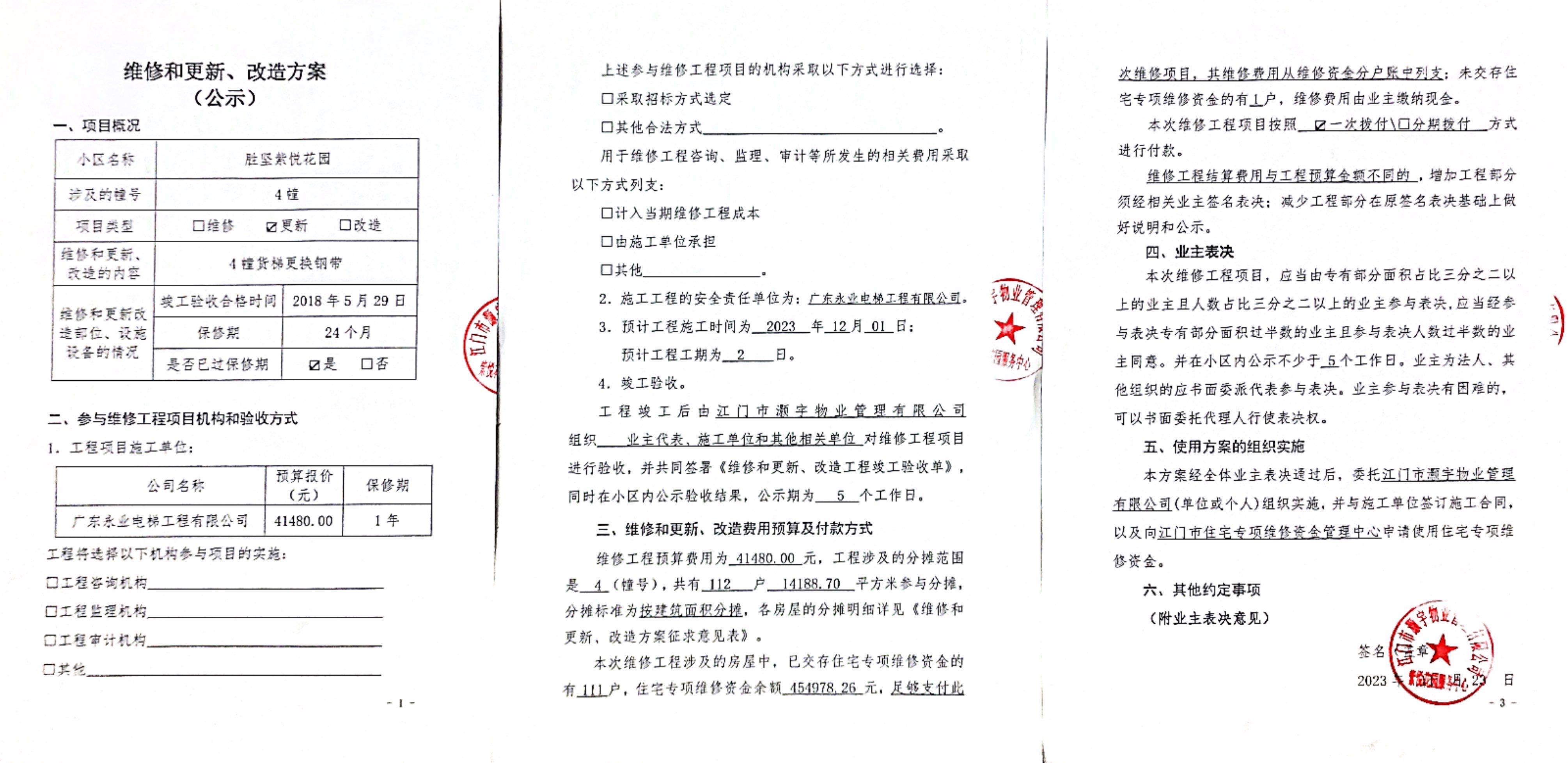<td valign="top" values="" style="border-width:0" bindtype="0" rowspan="17" colspan="7" datasource="投票结果"><font style=" font-family:方正小标宋简体;font-size:14pt;"><p style="line-height: 1.75em;"><span style="font-family: 宋体, SimSun;">各位尊敬的业主:</span><br></p><p style="text-indent: 2em; line-height: 1.75em;"><span style="font-family: 宋体, SimSun;">根据法律法规的规定,本小区业主利用“江门市物业事项表决管理系统”已对本小区公共事务决策事项进行了表决,在经过7日的询异公示期后,未收到业主有效的异议。现将投票结果公告,并就产生的法律效力说明如下:</span></p><p style="line-height: 1.75em; text-indent: 0em;"><strong style="text-indent: 2em;"><span style="font-family: 宋体, SimSun;">一、投票范围</span></strong></p><p style="text-indent: 2em; line-height: 1.75em;"><span style="font-family: 宋体, SimSun;">蓬江区胜坚紫悦花园蓬江区胜坚紫悦花园4幢</span></p><p style="text-indent: 2em; line-height: 1.75em;"><span style="font-family: 宋体, SimSun;">总人数(专有部分人数之和):111</span></p><p style="text-indent: 2em; line-height: 1.75em;"><span style="font-family: 宋体, SimSun;"><span style="font-family: 宋体, SimSun; text-indent: 32px;"><span style="font-family: 宋体; text-indent: 32px;">总户数:112</span></span></span></p><p style="text-indent: 2em; line-height: 1.75em;"><span style="font-family: 宋体, SimSun;">建筑物总面积(专有部分面积之和):14188.70㎡</span></p><p style="line-height: 1.75em;"><strong><span style="font-family: 宋体, SimSun;">二、投票结果公告时间</span></strong></p><p style="text-indent: 2em; line-height: 1.75em;"><span style="font-family: 宋体, SimSun;">从2023年12月08日开始</span></p><p style="line-height: 1.75em;"><strong><span style="font-family: 宋体, SimSun;">三、计票规则</span></strong></p><p style="text-indent: 2em; line-height: 1.75em;"><span style="font-family: 宋体, SimSun;">表决事项:使用建筑物及其附属设施的维修资金<br></span></p><p style="font-family: 宋体, SimSun;line-height: 1.75em; text-indent: 2em;">计票规则:弃权票不并入其它项 未表决票不并入其它项</p><p></p><p style="line-height: 1.75em;"><strong><span style="font-family: 宋体, SimSun;">四、通过规则</span></strong></p><p style="line-height: 1.75em;"><strong><span style="font-family: 宋体, SimSun;"> 根据《中华人民共和国民法典》第二百七十八条规定:业主共同决定事项,应当由专有部分面积占比三分之二以上的业主且人数占比三分之二以上的业主参与表决。</span></strong></p><p style="text-indent: 2em; line-height: 1.75em;"><span style="font-family: 宋体, SimSun;"><span style="font-family: 宋体, SimSun; text-indent: 32px;">表决事项:使用建筑物及其附属设施的维修资金<br></span></span></p><p style="font-family: 宋体, SimSun;line-height: 1.75em; text-indent: 2em;">通过规则:参与表决专有部分面积过半数的业主且参与表决人数过半数的业主同意</p><p></p><p style="line-height: 1.75em;"><strong><span style="font-family: 宋体, SimSun;">五、投票结果</span></strong></p><p style="line-height: 1.75em; text-indent: 2em;"><span style="font-family: 宋体, SimSun; text-indent: 2em;"></span></p><div id="resultTable"><table style="table-layout: fixed; font-size:12px; margin-top:10px" width="100%" border="0" cellspacing="0" cellpadding="0"><tbody><tr><td height="28" colspan="10" align="center" style="border: 1px solid #666"><strong style="font-size: 14px;"> 使用建筑物及其附属设施的维修资金</strong></td> </tr><tr id="trfirst"><td height="28" colspan="4" style="border-left: 1px solid #666; border-bottom: 1px solid #666"><strong> 申报单位:</strong> 江门市灏宇物业管理有限公司</td><td colspan="3" style="border-left: 1px solid #666; border-bottom: 1px solid #666"><strong> 联系方式:</strong> </td><td colspan="3" style="border-left: 1px solid #666; border-bottom: 1px solid #666; border-right: 1px solid #666"><strong> 申报日期:</strong> 2023年11月23日 </td></tr><tr> <td height="28" colspan="5" style="border-left: 1px solid #666; border-bottom: 1px solid #666"><strong> 总人数(专有部分人数之和):</strong>111人 </td><td colspan="5" style="border-left: 1px solid #666; border-bottom: 1px solid #666; border-right: 1px solid #666"><strong> 建筑物总面积(专有部分面积之和):</strong>14188.70㎡ </td> </tr><tr><td height="28" colspan="10" bgcolor="#F3F3F3" style="border-left: 1px solid #666;border-bottom: 1px solid #666;border-right: 1px solid #666"><strong> 参与人数及面积统计</strong></td></tr><tr><td height="28" colspan="5" style="border-left: 1px solid #666; border-bottom: 1px solid #666"><strong> 参与表决专有部分人数之和:</strong>80人</td><td colspan="5" style="border-left: 1px solid #666; border-bottom: 1px solid #666; border-right: 1px solid #666"><strong> 参与表决占有表决权总人数比例:</strong>72.07%</td></tr><tr><td height="28" colspan="5" style="border-left: 1px solid #666; border-bottom: 1px solid #666"><strong> 参与表决专有部分面积之和:</strong>10041.72㎡</td><td colspan="5" style="border-left: 1px solid #666; border-bottom: 1px solid #666; border-right: 1px solid #666"><strong> 参与表决占有表决权总面积比例:</strong>70.77%</td></tr><tr><td height="28" colspan="10" bgcolor="#F3F3F3" style="border-left: 1px solid #666; border-bottom: 1px solid #666;border-right: 1px solid #666"> <strong> 未参与人数及面积统计</strong></td> </tr><tr><td height="28" colspan="5" style="border-left: 1px solid #666; border-bottom: 1px solid #666"><strong> 未参与表决专有部分人数之和:</strong>31人 </td><td colspan="5" style="border-left: 1px solid #666; border-bottom: 1px solid #666; border-right: 1px solid #666"><strong> 未参与表决占有表决