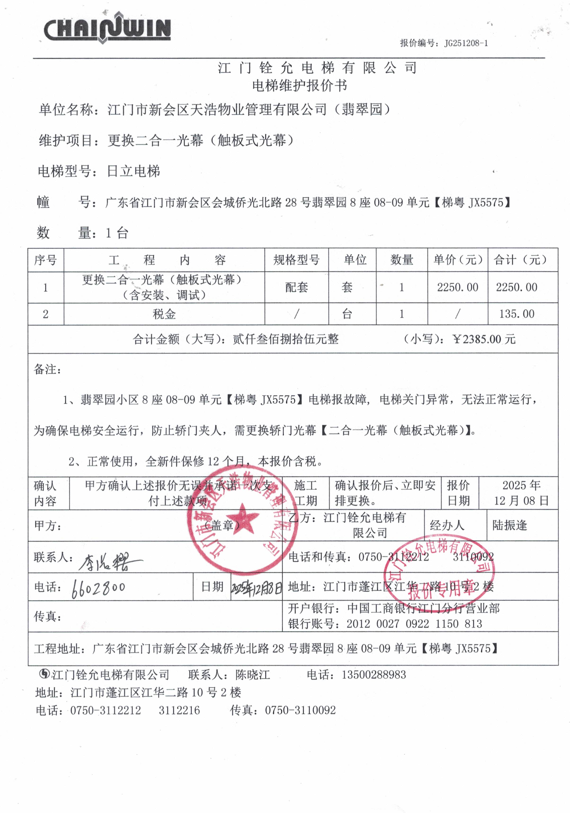 <td VALIGN="top" VALUES="" STYLE="border-width:0" BINDTYPE="0" ROWSPAN="17" COLSPAN="7" DATASOURCE="投票结果" ><font style=" font-family:方正小标宋简体;font-size:14pt;"><p style="line-height: 1.75em;"><span style="font-family: 宋体, SimSun;">各位尊敬的业主:</span><br/></p><p style="text-indent: 2em; line-height: 1.75em;"><span style="font-family: 宋体, SimSun;">根据法律法规的规定,本小区业主利用“江门市物业事项表决管理系统”已对本小区公共事务决策事项(<span style="font-family: 宋体; text-indent: 32px;">翡翠园8座08-09单元电梯【梯粤JX5575】更换二合一光幕使用维修资金的投票</span>)进行了表决,在经过7日的询异公示期后,未收到业主有效的异议。现将投票结果公告,并就产生的法律效力说明如下:</span></p><p style="line-height: 1.75em; text-indent: 0em;"><strong style="text-indent: 2em;"><span style="font-family: 宋体, SimSun;">一、投票范围</span></strong></p><p style="text-indent: 2em; line-height: 1.75em;"><span style="font-family: 宋体, SimSun;">翡翠园翡翠园8座</span></p><p style="text-indent: 2em; line-height: 1.75em;"><span style="font-family: 宋体, SimSun;">总人数(专有部分人数之和):20</span></p><p style="text-indent: 2em; line-height: 1.75em;"><span style="font-family: 宋体, SimSun;"><span style="font-family: 宋体, SimSun; text-indent: 32px;"><span style="font-family: 宋体; text-indent: 32px;"><span style="font-family: 宋体; text-indent: 32px;">总户数:27</span></span></span></span></p><p style="text-indent: 2em; line-height: 1.75em;"><span style="font-family: 宋体, SimSun;">建筑物总面积(专有部分面积之和):2753.46㎡</span></p><p style="line-height: 1.75em;"><strong><span style="font-family: 宋体, SimSun;">二、投票结果公告时间</span></strong></p><p style="text-indent: 2em; line-height: 1.75em;"><span style="font-family: 宋体, SimSun;"><span style="font-family: 宋体, SimSun; text-indent: 32px;">从2025年12月29日开始</span></span></p><p style="line-height: 1.75em;"><strong><span style="font-family: 宋体, SimSun;">三、计票规则</span></strong></p><p style="text-indent: 2em; line-height: 1.75em;"><span style="font-family: 宋体, SimSun;">表决事项:使用建筑物及其附属设施的维修资金<br /><p style='font-family: 宋体, SimSun;line-height: 1.75em; text-indent: 2em;'>计票规则:弃权票不并入其它项&nbsp;&nbsp;&nbsp;&nbsp;未表决票不并入其它项</p></span></p><p style="line-height: 1.75em;"><strong><span style="font-family: 宋体, SimSun;">四、通过规则</span></strong></p><p style="line-height: 1.75em;"><strong><span style="font-family: 宋体, SimSun;">&nbsp; 根据《中华人民共和国民法典》第二百七十八条规定:业主共同决定事项,应当由专有部分面积占比三分之二以上的业主且人数占比三分之二以上的业主参与表决。</span></strong></p><p style="text-indent: 2em; line-height: 1.75em;"><span style="font-family: 宋体, SimSun;"><span style="font-family: 宋体, SimSun; text-indent: 32px;">表决事项:使用建筑物及其附属设施的维修资金<br /><p style='font-family: 宋体, SimSun;line-height: 1.75em; text-indent: 2em;'>通过规则:双2/3以上参与表决,参与表决双过半同意</p></span></span></p><p style="line-height: 1.75em;"><strong><span style="font-family: 宋体, SimSun;">五、投票结果</span></strong></p><p style="line-height: 1.75em; text-indent: 2em;"><span style="font-family: 宋体, SimSun; text-indent: 2em;"><div id='resultTable'><table style='table-layout: fixed; font-size:12px; margin-top:10px' width='100%' border='0' cellspacing='0' cellpadding='0'><tr><td height='28' colspan='10' align='center' style='border: 1px solid #666'><strong style='font-size: 14px;'> 使用建筑物及其附属设施的维修资金</strong></td> </tr><tr id='trfirst'><td height='28' colspan='4' style='border-left: 1px solid #666; border-bottom: 1px solid #666'><strong>&nbsp;申报单位:</strong> 江门市新会区天浩物业管理有限公司</td><td colspan='3' style='border-left: 1px solid #666; border-bottom: 1px solid #666'><strong>&nbsp;联系方式:</strong> </td><td colspan='3' style='border-left: 1px solid #666; border-bottom: 1px solid #666; border-right: 1px solid #666'><strong>&nbsp;申报日期:</strong> 2025年12月10日 </td></tr><tr> <td height='28' colspan='5' style='border-left: 1px solid #666; border-bottom: 1px solid #666'><strong>&nbsp;列支总人数(专有部分人数之和):</strong>20人 </td><td colspan='5' style='border-left: 1px solid #666; border-bottom: 1px solid #666; border-right: 1px solid #666'><strong>&nbsp;列支建筑物总面积(专有部分面积之和):</strong>2753.46㎡ </td> </tr><tr><td height='28' colspan='10' bgcolor='#F3F3F3' style='border-left: 1px solid #666;border-bottom: 1px solid #666;border-right: 1px solid #666'><strong>&nbsp;参与表决人数及面积统计</strong></td></tr><tr><td height='28' colspan='5' style='border-left: 1px solid #666; border-bottom: 1px solid #666'><strong>&nbsp;参与表决人数:</strong>14人</td><td colspan='5' style='border-left: 1px solid #666; border-bottom: 1px solid #666; border-right: 1px solid #666'><strong>&nbsp;参与表决人数占总人数比例:</strong>70.00%</td></tr><tr><td height='28' colspan='5' style='border-left: 1px solid #666; border-bottom: 1px solid #666'><strong>&nbsp;参与表决面积:</strong>1920.68㎡</td><td colspan='5' style='border-left: 1px solid #666; border-bottom: 1px solid #666; border-right: 1px solid #666'><strong>&nbsp;参与表决面积占总面积比例:</strong>69.76%</td></tr><tr><td height='28' colspan='10' bgcolor='#F3F3F3' style='border-left: 1px solid #666; border-bottom: 1px solid #666;border-right: 1px solid #666'> <strong>&nbsp;参与表决同意人数及面积统计</strong></td> </tr><tr><td height='28' colspan='5' style='border-left: 1px solid #666