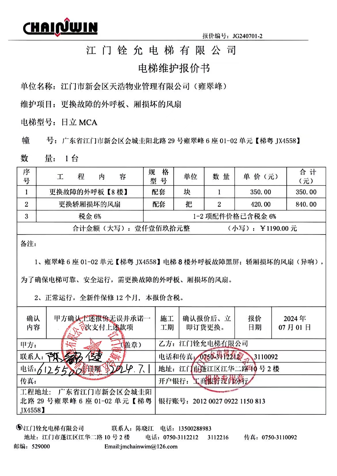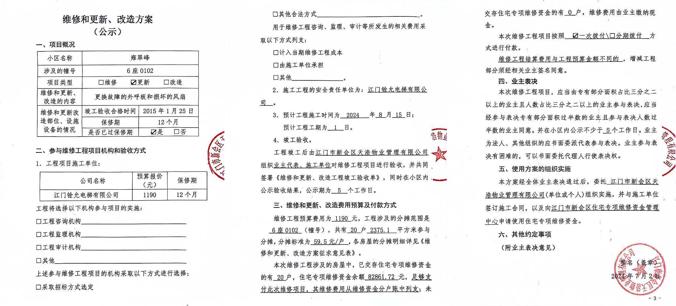 <td VALIGN="top" VALUES="" STYLE="border-width:0" BINDTYPE="0" ROWSPAN="19" COLSPAN="7" DATASOURCE="投票结果" ><font style="font-size:14pt;"><p style="white-space: normal; font-family: 宋体; line-height: 1.75em;">雍翠峰雍翠峰6座全体业主:</p><p style="white-space: normal; font-family: 宋体; line-height: 1.75em; text-indent: 2em;">本小区关于雍翠峰6座0102电梯【梯粤JX4558】更换故障的外呼板和损坏的风扇使用维修资金的投票的投票已表决结束,询异时间从2024年07月06日开始,投票询异公示期间,业主可通过微信查询自己的表决情况或可凭身份证件申请查询自己的表决情况;如公示的业主表决情况与查询的本人表决意见不一致的,可以以书面形式向投票组织机构申诉,投票组织机构予以纠正并重新公示表决结果。异议提出人对投票组织机构的处理仍有异议的,可以向街道办事处(镇人民政府)反映处理,涉及住宅专项维修资金的,可向属地住宅专项维修资金管理中心反映处理。</p><p style="white-space: normal;"><br/></p><p style="white-space: normal; font-family: 宋体; line-height: 1.75em;"><strong>附件:</strong></p><p style="white-space: normal; font-family: 宋体; line-height: 1.75em;"><strong>一、投票范围</strong></p><p style="white-space: normal; font-family: 宋体; line-height: 1.75em; text-indent: 2em;">雍翠峰雍翠峰6座</p><p style="white-space: normal; font-family: 宋体; line-height: 1.75em; text-indent: 2em;">总人数(专有部分人数之和):20</p><p style="white-space: normal; font-family: 宋体; line-height: 1.75em; text-indent: 2em;"><span style="font-family: 宋体, SimSun;"><span style="font-family: 宋体; text-indent: 32px;"><span style="font-family: 宋体; text-indent: 32px;">总户数:20</span></span></span></p><p style="white-space: normal; font-family: 宋体; line-height: 1.75em; text-indent: 2em;">建筑物总面积(专有部分面积之和):2375.10㎡</p><p style="white-space: normal; font-family: 宋体; line-height: 1.75em;"><strong>二、询异公示起止时间</strong></p><p dir="ltr" style="white-space: normal; font-family: 宋体; line-height: 1.75em; text-indent: 2em;"><span style="text-indent: 36px;">2024年07月06日至2024年07月12日</span></p><p style="white-space: normal; font-family: 宋体; line-height: 1.75em;"><strong>三、投票详细描述</strong></p><p style="white-space: normal; font-family: 宋体; line-height: 1.75em; text-indent: 2em;"><p> 雍翠峰6座0102电梯【梯粤JX4558】8楼外呼板黑屏和轿厢风扇损坏,经检查确认为外呼板故障和风扇日常使用自然磨损损坏,已过保修期。现需申请使用维修资金对6座0102电梯【梯粤JX4558】进行维修,工程维修预算金额为1190元,项目最终费用以施工合同签订金额为准。维修费用的分摊标准为按分户分摊,每户分摊59.5元,详见公示附件。如业主不能正常通过微信投票,请联系物业公司进行线下纸质投票,物业电话:0750-6125500</p></p><p style="white-space: normal; font-family: 宋体; line-height: 1.75em;"><strong>四、计票规则</strong></p><p style="white-space: normal; font-family: 宋体; line-height: 1.75em; text-indent: 2em;">表决事项:使用建筑物及其附属设施的维修资金<br /><p style='text-align: left; font-family: 宋体; font-size: 16px; line-height: 1.75em; text-indent: 2em;'>计票规则:弃权票不并入其它项 未表决票不并入其它项</p></p><p style="white-space: normal; font-family: 宋体; line-height: 1.75em;"><strong>五、通过规则</strong></p><p style="white-space: normal; font-family: 宋体; line-height: 1.75em;"><strong><strong style="white-space: normal;"><span style="font-family: 宋体, SimSun;"> 根据《中华人民共和国民法典》第二百七十八条规定:业主共同决定事项,应当由专有部分面积占比三分之二以上的业主且人数占比三分之二以上的业主参与表决。</span></strong></strong></p><p style="white-space: normal; font-family: 宋体; line-height: 1.75em; text-indent: 2em;">表决事项:使用建筑物及其附属设施的维修资金<br /><p style='text-align: left; font-family: 宋体; font-size: 16px; line-height: 1.75em; text-indent: 2em;'>通过规则:双2/3以上参与表决,参与表决双过半同意</p></p><p style="white-space: normal; font-family: 宋体; line-height: 1.75em;"><strong>六、投票结果</strong></p><p style="white-space: normal; font-family: 宋体; line-height: 1.75em; text-indent: 2em;"><div id='resultTable'><table style='table-layout: fixed; font-size:12px; margin-top:10px' width='100%' border='0' cellspacing='0' cellpadding='0'><tr><td height='28' colspan='10' align='center' style='border: 1px solid #666'><strong style='font-size: 14px;'> 使用建筑物及其附属设施的维修资金</strong></td> </tr><tr id='trfirst'><td height='28' colspan='4' style='border-left: 1px solid #666; border-bottom: 1px solid #666'><strong> 申报单位:</strong> 江门市新会区天浩物业管理有限公司</td><td colspan='3' style='border-left: 1px solid #666; border-bottom: 1px solid #666'><strong> 联系方式:</strong> </td><td colspan='3' style='border-left: 1px solid #666; border-bottom: 1px solid #666; border-right: 1px solid #666'><strong> 申报日期:</strong> 2024年7月2日 </td></tr><tr> <td height='28' colspan='5' style='border-left: 1px solid #666; border-bottom: 1px solid #666'><strong> 总人数(专有部分人数之和):</strong>20人 </td><td colspan='5' style='border-left: 1px solid #666; border-bottom: 1px solid #666; border-right: 1px solid #666'><strong> 建筑物总面积(专有部分面积之和):</strong>2375.10㎡ </td> </tr><tr><td height='28' colspan='10' bgcolor='#F3F3F3' style='border-left: 1px solid #666;border-bottom: 1px solid #666;border-right: 1px solid #666'><strong> 参与人数及面积统计</strong></td></tr><tr><td height='28' colspan='5'
