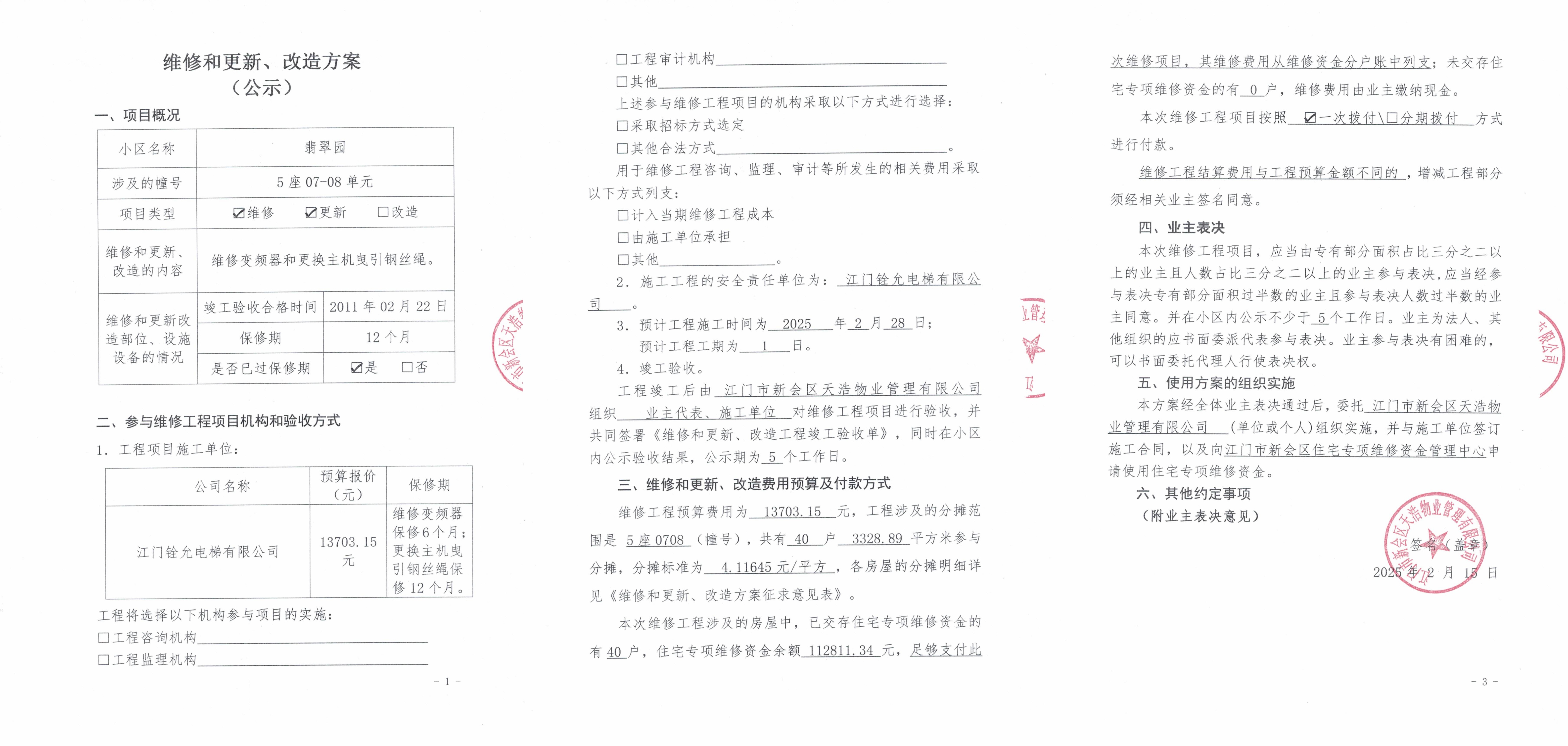 <td VALIGN="top" VALUES="" STYLE="border-width:0" BINDTYPE="0" ROWSPAN="17" COLSPAN="7" DATASOURCE="投票结果" ><font style=" font-family:方正小标宋简体;font-size:14pt;"><p style="line-height: 1.75em;"><span style="font-family: 宋体, SimSun;">各位尊敬的业主:</span><br/></p><p style="text-indent: 2em; line-height: 1.75em;"><span style="font-family: 宋体, SimSun;">根据法律法规的规定,本小区业主利用“江门市物业事项表决管理系统”已对本小区公共事务决策事项进行了表决,在经过7日的询异公示期后,未收到业主有效的异议。现将投票结果公告,并就产生的法律效力说明如下:</span></p><p style="line-height: 1.75em; text-indent: 0em;"><strong style="text-indent: 2em;"><span style="font-family: 宋体, SimSun;">一、投票范围</span></strong></p><p style="text-indent: 2em; line-height: 1.75em;"><span style="font-family: 宋体, SimSun;">翡翠园翡翠园5座</span></p><p style="text-indent: 2em; line-height: 1.75em;"><span style="font-family: 宋体, SimSun;">总人数(专有部分人数之和):20</span></p><p style="text-indent: 2em; line-height: 1.75em;"><span style="font-family: 宋体, SimSun;"><span style="font-family: 宋体, SimSun; text-indent: 32px;"><span style="font-family: 宋体; text-indent: 32px;"><span style="font-family: 宋体; text-indent: 32px;">总户数:40</span></span></span></span></p><p style="text-indent: 2em; line-height: 1.75em;"><span style="font-family: 宋体, SimSun;">建筑物总面积(专有部分面积之和):3328.89㎡</span></p><p style="line-height: 1.75em;"><strong><span style="font-family: 宋体, SimSun;">二、投票结果公告时间</span></strong></p><p style="text-indent: 2em; line-height: 1.75em;"><span style="font-family: 宋体, SimSun;"><span style="font-family: 宋体, SimSun; text-indent: 32px;">从2025年03月11日开始</span></span></p><p style="line-height: 1.75em;"><strong><span style="font-family: 宋体, SimSun;">三、计票规则</span></strong></p><p style="text-indent: 2em; line-height: 1.75em;"><span style="font-family: 宋体, SimSun;">表决事项:使用建筑物及其附属设施的维修资金<br /><p style='font-family: 宋体, SimSun;line-height: 1.75em; text-indent: 2em;'>计票规则:弃权票不并入其它项&nbsp;&nbsp;&nbsp;&nbsp;未表决票不并入其它项</p></span></p><p style="line-height: 1.75em;"><strong><span style="font-family: 宋体, SimSun;">四、通过规则</span></strong></p><p style="line-height: 1.75em;"><strong><span style="font-family: 宋体, SimSun;">&nbsp; 根据《中华人民共和国民法典》第二百七十八条规定:业主共同决定事项,应当由专有部分面积占比三分之二以上的业主且人数占比三分之二以上的业主参与表决。</span></strong></p><p style="text-indent: 2em; line-height: 1.75em;"><span style="font-family: 宋体, SimSun;"><span style="font-family: 宋体, SimSun; text-indent: 32px;">表决事项:使用建筑物及其附属设施的维修资金<br /><p style='font-family: 宋体, SimSun;line-height: 1.75em; text-indent: 2em;'>通过规则:双2/3以上参与表决,参与表决双过半同意</p></span></span></p><p style="line-height: 1.75em;"><strong><span style="font-family: 宋体, SimSun;">五、投票结果</span></strong></p><p style="line-height: 1.75em; text-indent: 2em;"><span style="font-family: 宋体, SimSun; text-indent: 2em;"><div id='resultTable'><table style='table-layout: fixed; font-size:12px; margin-top:10px' width='100%' border='0' cellspacing='0' cellpadding='0'><tr><td height='28' colspan='10' align='center' style='border: 1px solid #666'><strong style='font-size: 14px;'> 使用建筑物及其附属设施的维修资金</strong></td> </tr><tr id='trfirst'><td height='28' colspan='4' style='border-left: 1px solid #666; border-bottom: 1px solid #666'><strong>&nbsp;申报单位:</strong> 江门市新会区天浩物业管理有限公司</td><td colspan='3' style='border-left: 1px solid #666; border-bottom: 1px solid #666'><strong>&nbsp;联系方式:</strong> </td><td colspan='3' style='border-left: 1px solid #666; border-bottom: 1px solid #666; border-right: 1px solid #666'><strong>&nbsp;申报日期:</strong> 2025年2月17日 </td></tr><tr> <td height='28' colspan='5' style='border-left: 1px solid #666; border-bottom: 1px solid #666'><strong>&nbsp;列支总人数(专有部分人数之和):</strong>20人 </td><td colspan='5' style='border-left: 1px solid #666; border-bottom: 1px solid #666; border-right: 1px solid #666'><strong>&nbsp;列支建筑物总面积(专有部分面积之和):</strong>3328.89㎡ </td> </tr><tr><td height='28' colspan='10' bgcolor='#F3F3F3' style='border-left: 1px solid #666;border-bottom: 1px solid #666;border-right: 1px solid #666'><strong>&nbsp;参与表决人数及面积统计</strong></td></tr><tr><td height='28' colspan='5' style='border-left: 1px solid #666; border-bottom: 1px solid #666'><strong>&nbsp;参与表决人数:</strong>14人</td><td colspan='5' style='border-left: 1px solid #666; border-bottom: 1px solid #666; border-right: 1px solid #666'><strong>&nbsp;参与表决人数占总人数比例:</strong>70.00%</td></tr><tr><td height='28' colspan='5' style='border-left: 1px solid #666; border-bottom: 1px solid #666'><strong>&nbsp;参与表决面积:</strong>2383.98㎡</td><td colspan='5' style='border-left: 1px solid #666; border-bottom: 1px solid #666; border-right: 1px solid #666'><strong>&nbsp;参与表决面积占总面积比例:</strong>71.61%</td></tr><tr><td height='28' colspan='10' bgcolor='#F3F3F3' style='border-left: 1px solid #666; border-bottom: 1px solid #666;border-right: 1px solid #666'> <strong>&nbsp;参与表决同意人数及面积统计</strong></td> </tr><tr><td height='28' colspan='5' style='border-left: 1px solid #666; border-bottom: 1px solid #666'><strong>&nbsp;参与表决同意人数:</strong>14人 </td><td colspan='5' style='border-left: 1px solid #666; border-bottom: 1