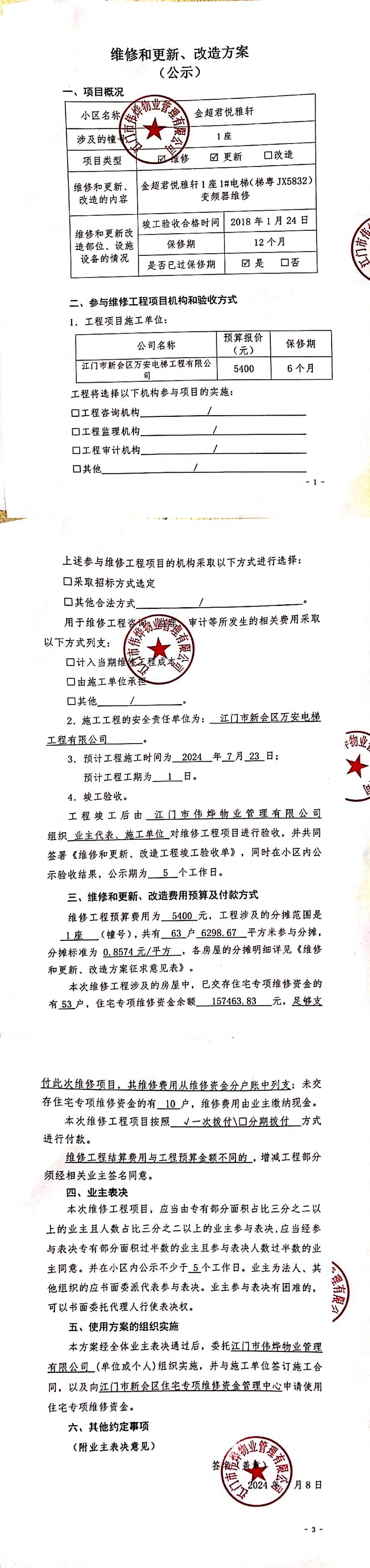 <td VALIGN="top" VALUES="" STYLE="border-width:0" BINDTYPE="0" ROWSPAN="17" COLSPAN="7" DATASOURCE="投票结果" ><font style=" font-family:方正小标宋简体;font-size:14pt;"><p style="line-height: 1.75em;"><span style="font-family: 宋体, SimSun;">各位尊敬的业主:</span><br/></p><p style="text-indent: 2em; line-height: 1.75em;"><span style="font-family: 宋体, SimSun;">根据法律法规的规定,本小区业主利用“江门市物业事项表决管理系统”已对本小区公共事务决策事项进行了表决,在经过7日的询异公示期后,未收到业主有效的异议。现将投票结果公告,并就产生的法律效力说明如下:</span></p><p style="line-height: 1.75em; text-indent: 0em;"><strong style="text-indent: 2em;"><span style="font-family: 宋体, SimSun;">一、投票范围</span></strong></p><p style="text-indent: 2em; line-height: 1.75em;"><span style="font-family: 宋体, SimSun;">金超君悦雅轩1座</span></p><p style="text-indent: 2em; line-height: 1.75em;"><span style="font-family: 宋体, SimSun;">总人数(专有部分人数之和):62</span></p><p style="text-indent: 2em; line-height: 1.75em;"><span style="font-family: 宋体, SimSun;"><span style="font-family: 宋体, SimSun; text-indent: 32px;"><span style="font-family: 宋体; text-indent: 32px;"><span style="font-family: 宋体; text-indent: 32px;">总户数:63</span></span></span></span></p><p style="text-indent: 2em; line-height: 1.75em;"><span style="font-family: 宋体, SimSun;">建筑物总面积(专有部分面积之和):6298.67㎡</span></p><p style="line-height: 1.75em;"><strong><span style="font-family: 宋体, SimSun;">二、投票结果公告时间</span></strong></p><p style="text-indent: 2em; line-height: 1.75em;"><span style="font-family: 宋体, SimSun;"><span style="font-family: 宋体, SimSun; text-indent: 32px;">从2024年07月23日开始</span></span></p><p style="line-height: 1.75em;"><strong><span style="font-family: 宋体, SimSun;">三、计票规则</span></strong></p><p style="text-indent: 2em; line-height: 1.75em;"><span style="font-family: 宋体, SimSun;">表决事项:金超君悦雅轩1座1#电梯(梯粤JX5832)变频器维修使用维修资金的投票<br /><p style='font-family: 宋体, SimSun;line-height: 1.75em; text-indent: 2em;'>计票规则:弃权票不并入其它项&nbsp;&nbsp;&nbsp;&nbsp;未表决票不并入其它项</p></span></p><p style="line-height: 1.75em;"><strong><span style="font-family: 宋体, SimSun;">四、通过规则</span></strong></p><p style="line-height: 1.75em;"><strong><span style="font-family: 宋体, SimSun;">&nbsp; 根据《中华人民共和国民法典》第二百七十八条规定:业主共同决定事项,应当由专有部分面积占比三分之二以上的业主且人数占比三分之二以上的业主参与表决。</span></strong></p><p style="text-indent: 2em; line-height: 1.75em;"><span style="font-family: 宋体, SimSun;"><span style="font-family: 宋体, SimSun; text-indent: 32px;">表决事项:金超君悦雅轩1座1#电梯(梯粤JX5832)变频器维修使用维修资金的投票<br /><p style='font-family: 宋体, SimSun;line-height: 1.75em; text-indent: 2em;'>通过规则:双2/3以上参与表决,参与表决双过半同意</p></span></span></p><p style="line-height: 1.75em;"><strong><span style="font-family: 宋体, SimSun;">五、投票结果</span></strong></p><p style="line-height: 1.75em; text-indent: 2em;"><span style="font-family: 宋体, SimSun; text-indent: 2em;"><div id='resultTable'><table style='table-layout: fixed; font-size:12px; margin-top:10px' width='100%' border='0' cellspacing='0' cellpadding='0'><tr><td height='28' colspan='10' align='center' style='border: 1px solid #666'><strong style='font-size: 14px;'> 金超君悦雅轩1座1#电梯(梯粤JX5832)变频器维修使用维修资金的投票</strong></td> </tr><tr id='trfirst'><td height='28' colspan='4' style='border-left: 1px solid #666; border-bottom: 1px solid #666'><strong>&nbsp;申报单位:</strong> 江门市伟烨物业管理有限公司</td><td colspan='3' style='border-left: 1px solid #666; border-bottom: 1px solid #666'><strong>&nbsp;联系方式:</strong> 0750-6123828 </td><td colspan='3' style='border-left: 1px solid #666; border-bottom: 1px solid #666; border-right: 1px solid #666'><strong>&nbsp;申报日期:</strong> 2024年7月8日 </td></tr><tr> <td height='28' colspan='5' style='border-left: 1px solid #666; border-bottom: 1px solid #666'><strong>&nbsp;总人数(专有部分人数之和):</strong>62人 </td><td colspan='5' style='border-left: 1px solid #666; border-bottom: 1px solid #666; border-right: 1px solid #666'><strong>&nbsp;建筑物总面积(专有部分面积之和):</strong>6298.67㎡ </td> </tr><tr><td height='28' colspan='10' bgcolor='#F3F3F3' style='border-left: 1px solid #666;border-bottom: 1px solid #666;border-right: 1px solid #666'><strong>&nbsp;参与表决人数及面积统计</strong></td></tr><tr><td height='28' colspan='5' style='border-left: 1px solid #666; border-bottom: 1px solid #666'><strong>&nbsp;参与表决人数:</strong>44人</td><td colspan='5' style='border-left: 1px solid #666; border-bottom: 1px solid #666; border-right: 1px solid #666'><strong>&nbsp;参与表决人数占总人数比例:</strong>70.97%</td></tr><tr><td height='28' colspan='5' style='border-left: 1px solid #666; border-bottom: 1px solid #666'><strong>&nbsp;参与表决面积:</strong>4403.76㎡</td><td colspan='5' style='border-left: 1px solid #666; border-bottom: 1px solid #666; border-right: 1px solid #666'><strong>&nbsp;参与表决面积占总面积比例:</strong>69.92%</td></tr><tr><td height='28' colspan='10' bgcolor='#F3F3F3' style='border-left: 1px solid #666; border-bottom: 1px solid #666;border-right: 1px solid #666'> <strong>&nbsp;参与表决同意人数及面积统计</strong></td> </tr><tr><td height='28' colspan='5' style='border-left: 1px solid #666; border-bottom: 1px solid #666'><strong>&nbsp;参与