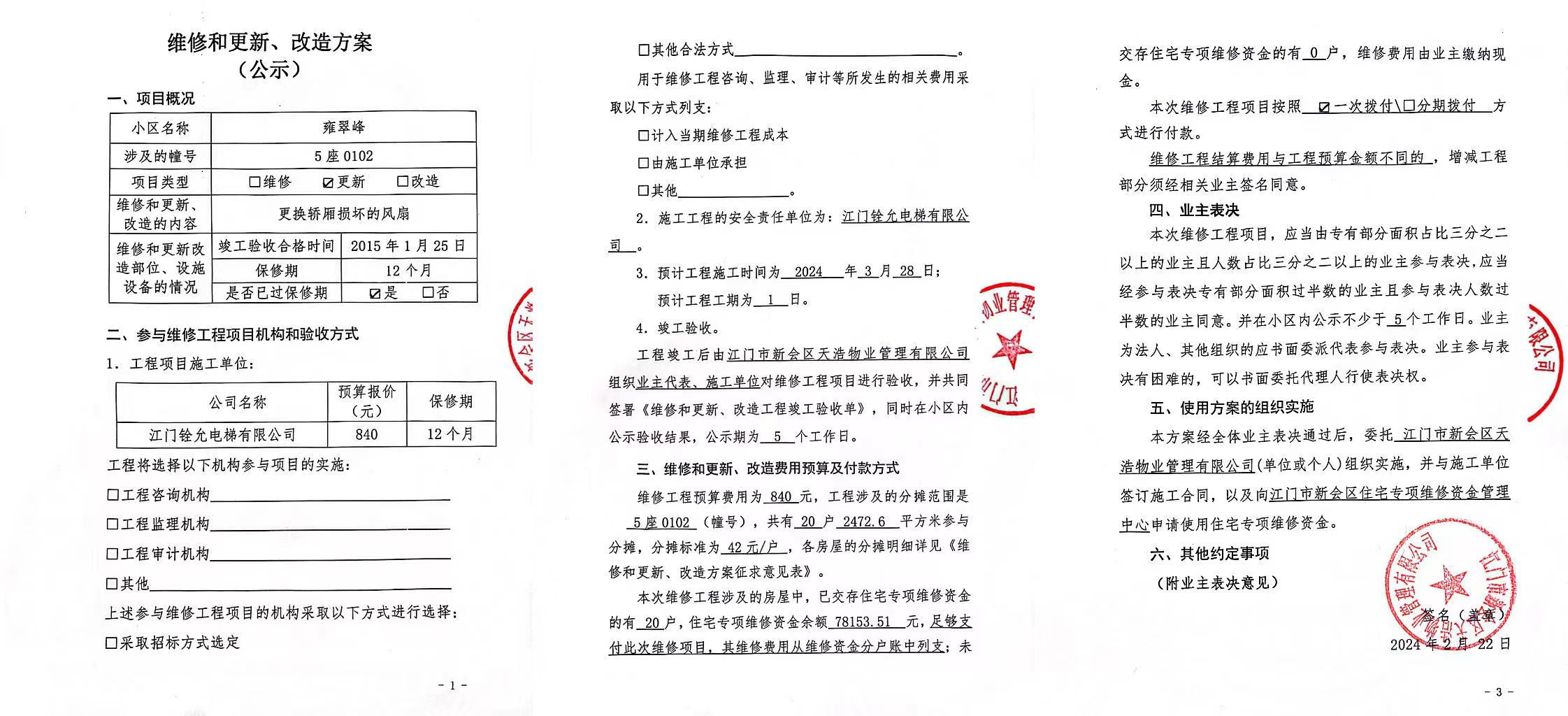 <td VALIGN="top" VALUES="" STYLE="border-width:0" BINDTYPE="0" ROWSPAN="17" COLSPAN="7" DATASOURCE="投票结果" ><font style=" font-family:方正小标宋简体;font-size:14pt;"><p style="line-height: 1.75em;"><span style="font-family: 宋体, SimSun;">各位尊敬的业主:</span><br/></p><p style="text-indent: 2em; line-height: 1.75em;"><span style="font-family: 宋体, SimSun;">根据法律法规的规定,本小区业主利用“江门市物业事项表决管理系统”已对本小区公共事务决策事项进行了表决,在经过7日的询异公示期后,未收到业主有效的异议。现将投票结果公告,并就产生的法律效力说明如下:</span></p><p style="line-height: 1.75em; text-indent: 0em;"><strong style="text-indent: 2em;"><span style="font-family: 宋体, SimSun;">一、投票范围</span></strong></p><p style="text-indent: 2em; line-height: 1.75em;"><span style="font-family: 宋体, SimSun;">雍翠峰雍翠峰5座</span></p><p style="text-indent: 2em; line-height: 1.75em;"><span style="font-family: 宋体, SimSun;">总人数(专有部分人数之和):20</span></p><p style="text-indent: 2em; line-height: 1.75em;"><span style="font-family: 宋体, SimSun;"><span style="font-family: 宋体, SimSun; text-indent: 32px;"><span style="font-family: 宋体; text-indent: 32px;"><span style="font-family: 宋体; text-indent: 32px;">总户数:20</span></span></span></span></p><p style="text-indent: 2em; line-height: 1.75em;"><span style="font-family: 宋体, SimSun;">建筑物总面积(专有部分面积之和):2472.60㎡</span></p><p style="line-height: 1.75em;"><strong><span style="font-family: 宋体, SimSun;">二、投票结果公告时间</span></strong></p><p style="text-indent: 2em; line-height: 1.75em;"><span style="font-family: 宋体, SimSun;">从2024年03月21日开始</span></p><p style="line-height: 1.75em;"><strong><span style="font-family: 宋体, SimSun;">三、计票规则</span></strong></p><p style="text-indent: 2em; line-height: 1.75em;"><span style="font-family: 宋体, SimSun;">表决事项:使用建筑物及其附属设施的维修资金<br /><p style='font-family: 宋体, SimSun;line-height: 1.75em; text-indent: 2em;'>计票规则:弃权票不并入其它项&nbsp;&nbsp;&nbsp;&nbsp;未表决票不并入其它项</p></span></p><p style="line-height: 1.75em;"><strong><span style="font-family: 宋体, SimSun;">四、通过规则</span></strong></p><p style="line-height: 1.75em;"><strong><span style="font-family: 宋体, SimSun;">&nbsp; 根据《中华人民共和国民法典》第二百七十八条规定:业主共同决定事项,应当由专有部分面积占比三分之二以上的业主且人数占比三分之二以上的业主参与表决。</span></strong></p><p style="text-indent: 2em; line-height: 1.75em;"><span style="font-family: 宋体, SimSun;"><span style="font-family: 宋体, SimSun; text-indent: 32px;">表决事项:使用建筑物及其附属设施的维修资金<br /><p style='font-family: 宋体, SimSun;line-height: 1.75em; text-indent: 2em;'>通过规则:双2/3以上参与表决,参与表决双过半同意</p></span></span></p><p style="line-height: 1.75em;"><strong><span style="font-family: 宋体, SimSun;">五、投票结果</span></strong></p><p style="line-height: 1.75em; text-indent: 2em;"><span style="font-family: 宋体, SimSun; text-indent: 2em;"><div id='resultTable'><table style='table-layout: fixed; font-size:12px; margin-top:10px' width='100%' border='0' cellspacing='0' cellpadding='0'><tr><td height='28' colspan='10' align='center' style='border: 1px solid #666'><strong style='font-size: 14px;'> 使用建筑物及其附属设施的维修资金</strong></td> </tr><tr id='trfirst'><td height='28' colspan='4' style='border-left: 1px solid #666; border-bottom: 1px solid #666'><strong>&nbsp;申报单位:</strong> 江门市新会区天浩物业管理有限公司</td><td colspan='3' style='border-left: 1px solid #666; border-bottom: 1px solid #666'><strong>&nbsp;联系方式:</strong> </td><td colspan='3' style='border-left: 1px solid #666; border-bottom: 1px solid #666; border-right: 1px solid #666'><strong>&nbsp;申报日期:</strong> 2024年2月21日 </td></tr><tr> <td height='28' colspan='5' style='border-left: 1px solid #666; border-bottom: 1px solid #666'><strong>&nbsp;列支总人数(专有部分人数之和):</strong>20人 </td><td colspan='5' style='border-left: 1px solid #666; border-bottom: 1px solid #666; border-right: 1px solid #666'><strong>&nbsp;列支建筑物总面积(专有部分面积之和):</strong>2472.60㎡ </td> </tr><tr><td height='28' colspan='10' bgcolor='#F3F3F3' style='border-left: 1px solid #666;border-bottom: 1px solid #666;border-right: 1px solid #666'><strong>&nbsp;参与表决人数及面积统计</strong></td></tr><tr><td height='28' colspan='5' style='border-left: 1px solid #666; border-bottom: 1px solid #666'><strong>&nbsp;参与表决人数:</strong>14人</td><td colspan='5' style='border-left: 1px solid #666; border-bottom: 1px solid #666; border-right: 1px solid #666'><strong>&nbsp;参与表决人数占总人数比例:</strong>70.00%</td></tr><tr><td height='28' colspan='5' style='border-left: 1px solid #666; border-bottom: 1px solid #666'><strong>&nbsp;参与表决面积:</strong>1786.55㎡</td><td colspan='5' style='border-left: 1px solid #666; border-bottom: 1px solid #666; border-right: 1px solid #666'><strong>&nbsp;参与表决面积占总面积比例:</strong>72.25%</td></tr><tr><td height='28' colspan='10' bgcolor='#F3F3F3' style='border-left: 1px solid #666; border-bottom: 1px solid #666;border-right: 1px solid #666'> <strong>&nbsp;参与表决同意人数及面积统计</strong></td> </tr><tr><td height='28' colspan='5' style='border-left: 1px solid #666; border-bottom: 1px solid #666'><strong>&nbsp;参与表决同意人数:</strong>14人 </td><td colspan='5' style='border-left: 1px solid #666; border-bottom: 1px solid #666; border-right: 1px solid #666'><strong>&nbsp;参与表